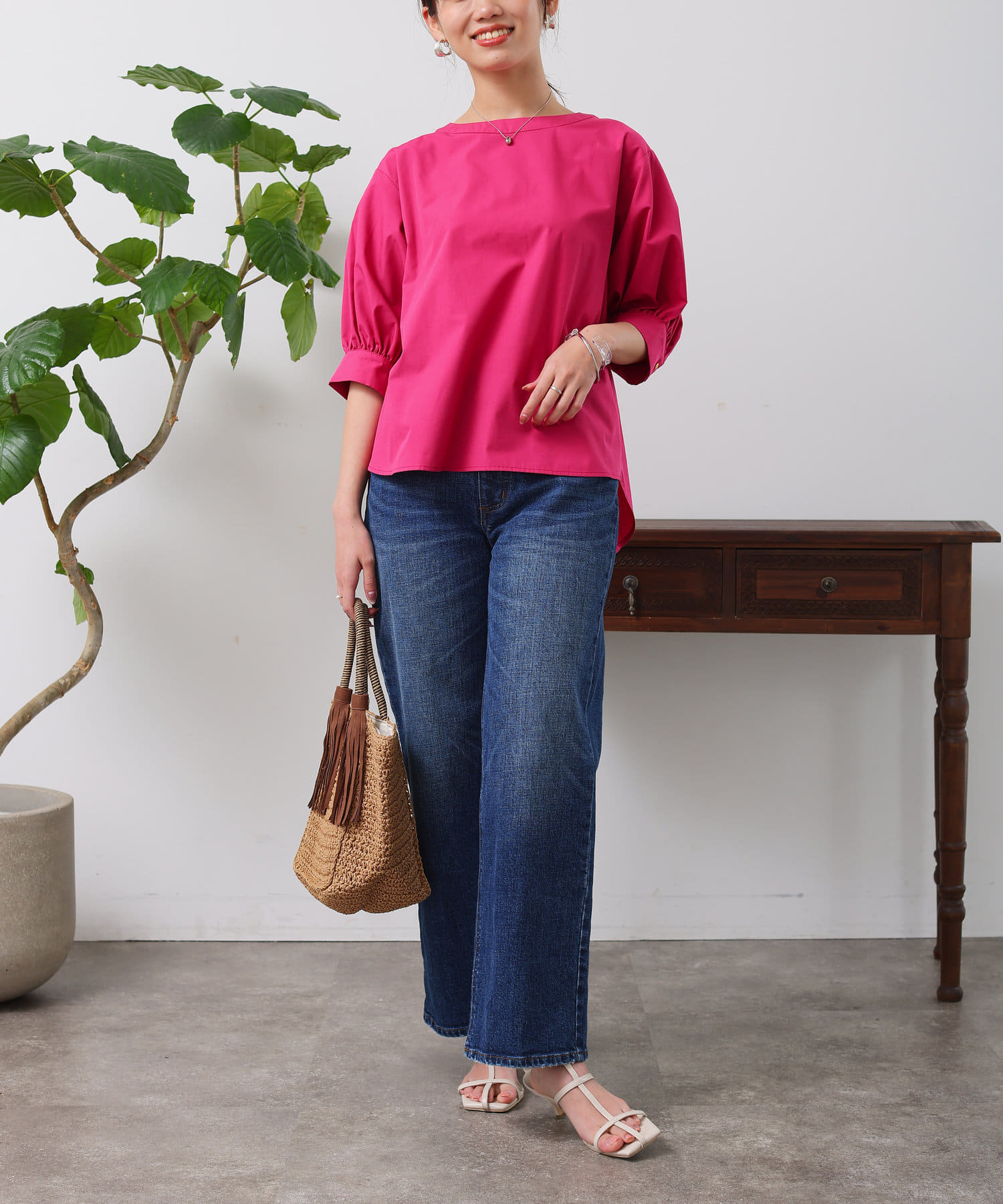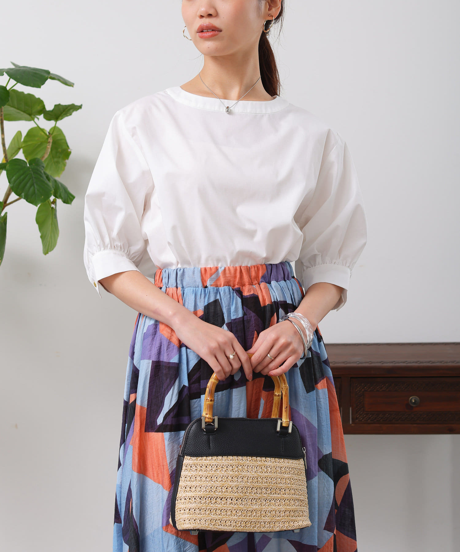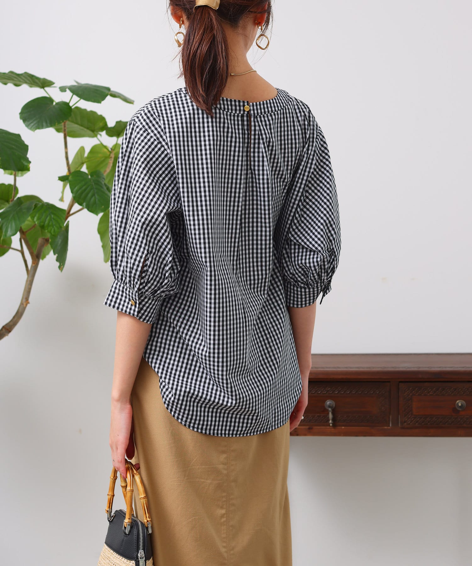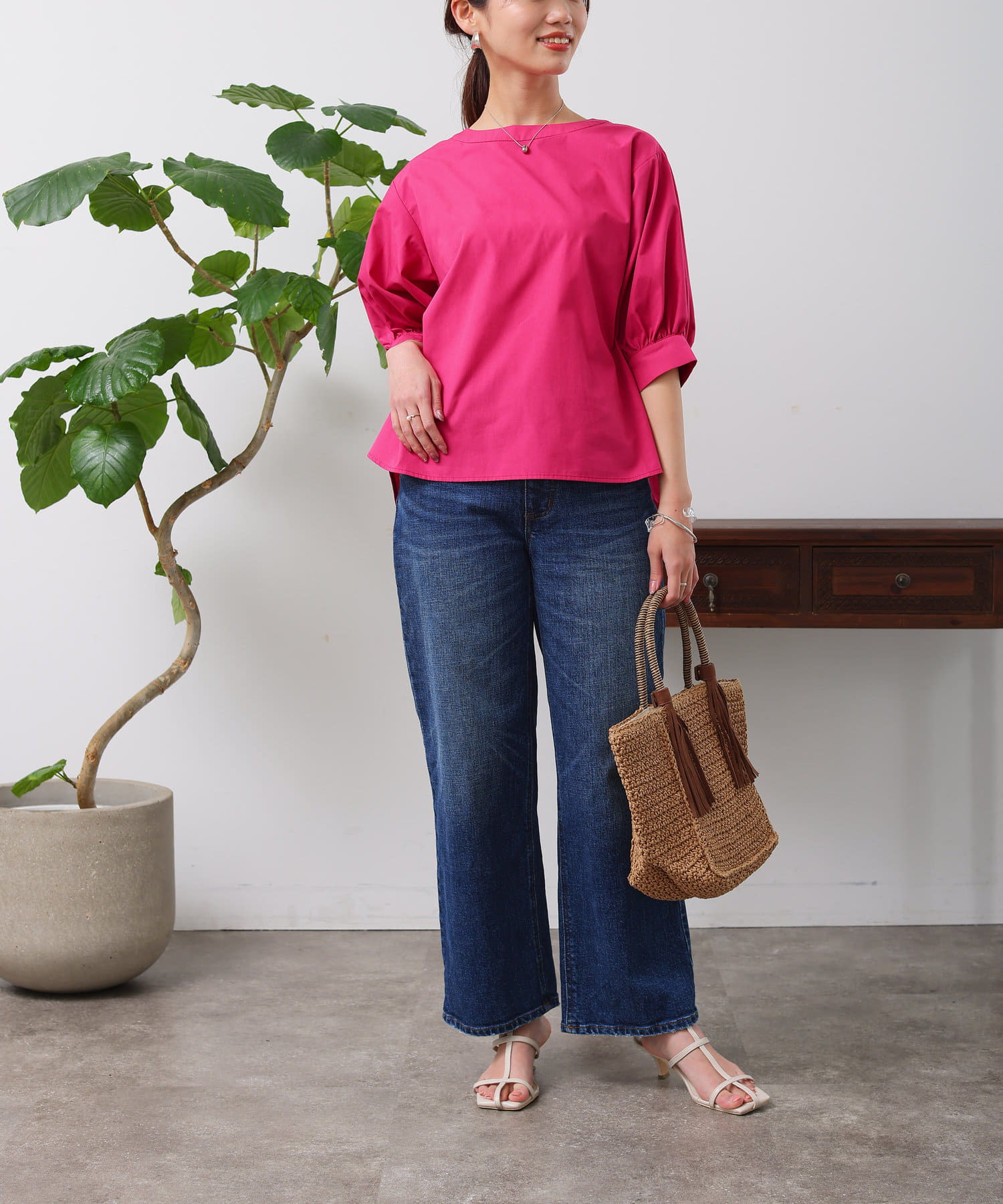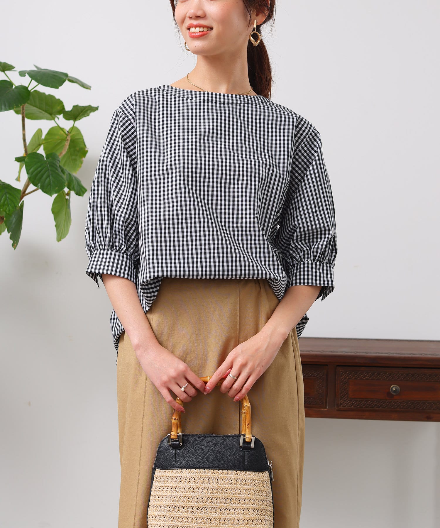 清涼感のある綿素材と5分袖のボリューム感がトレンドライクな1枚
