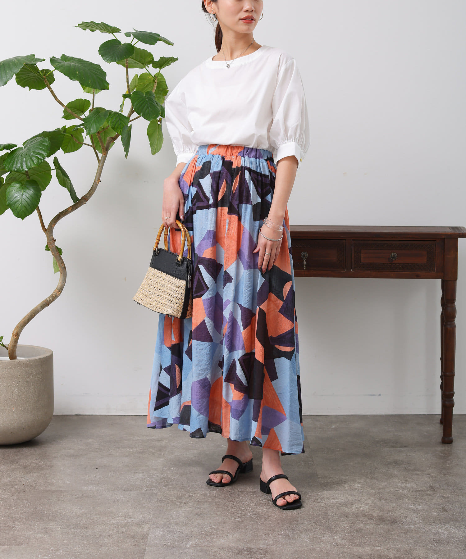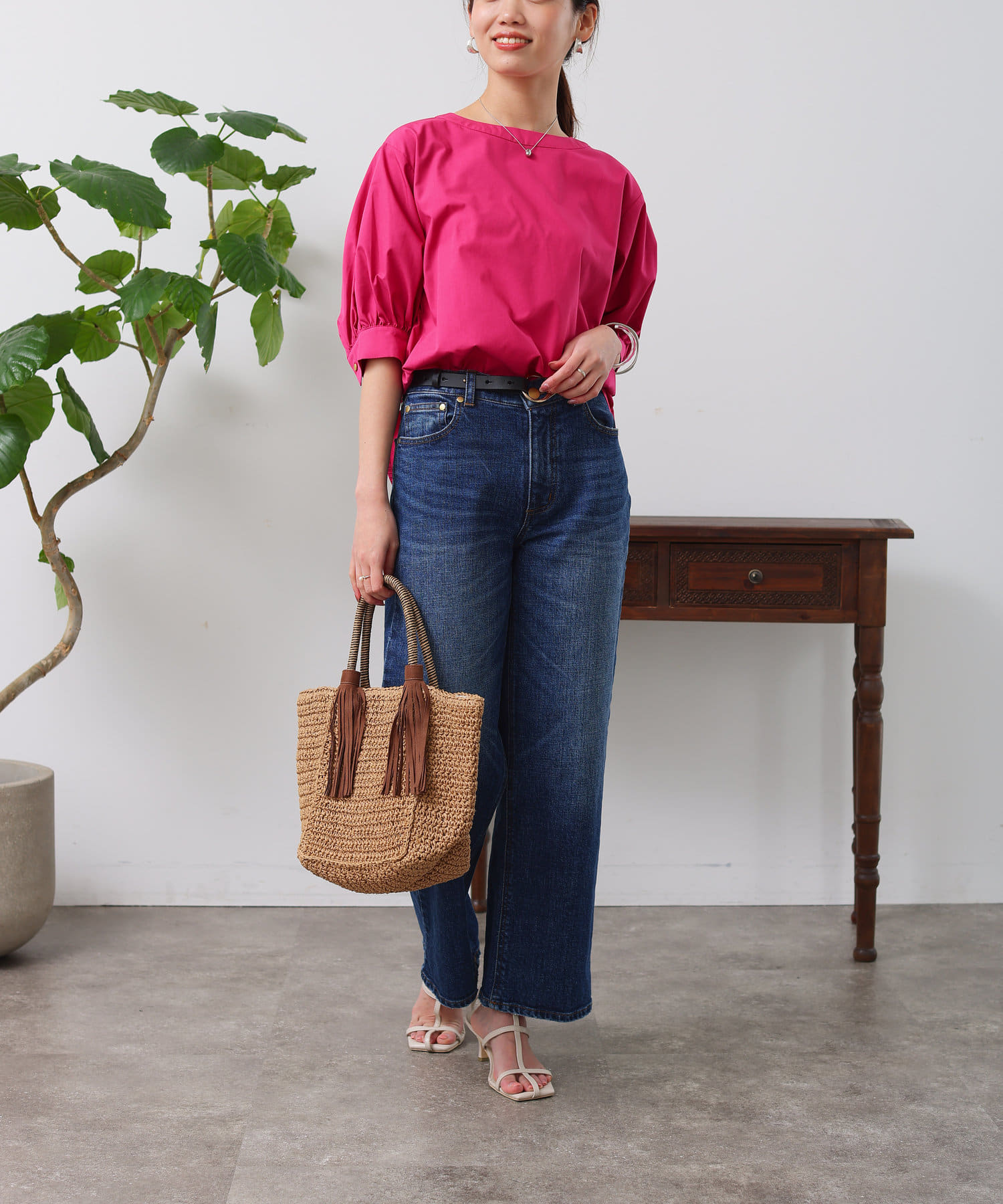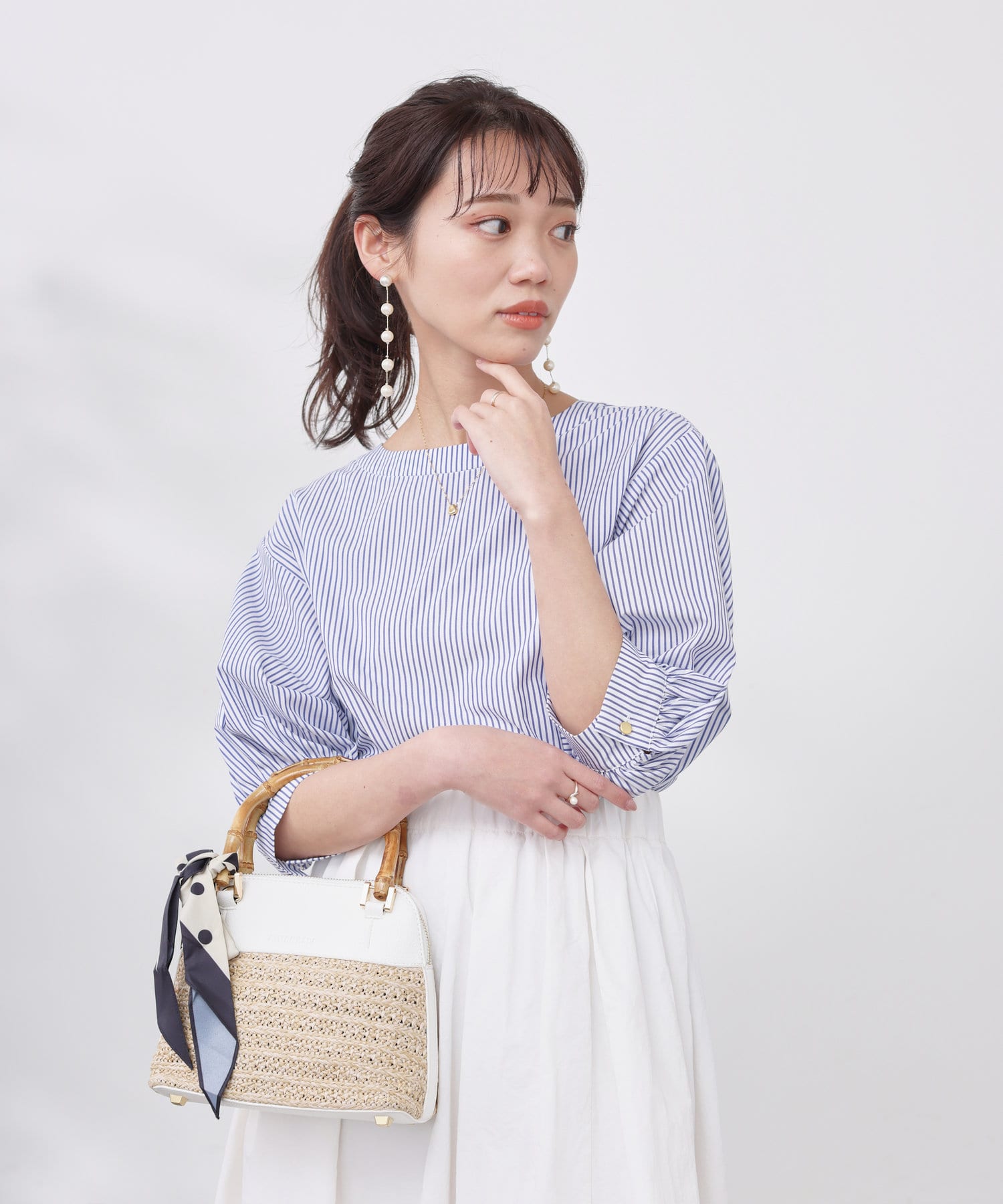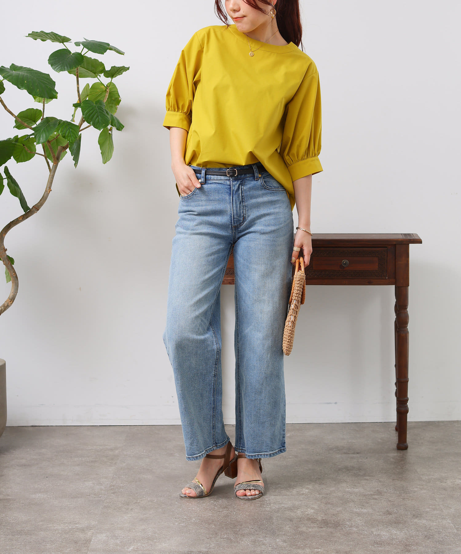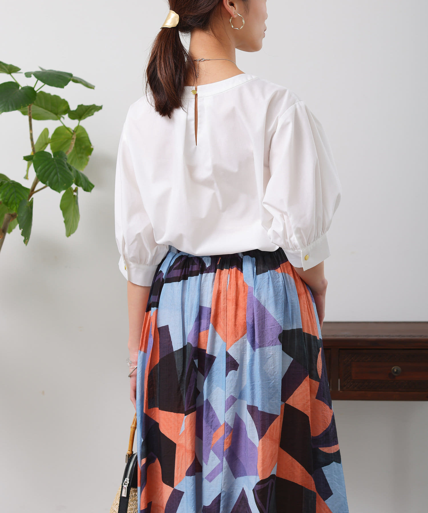 清涼感のある綿素材と5分袖のボリューム感がトレンドライクな1枚