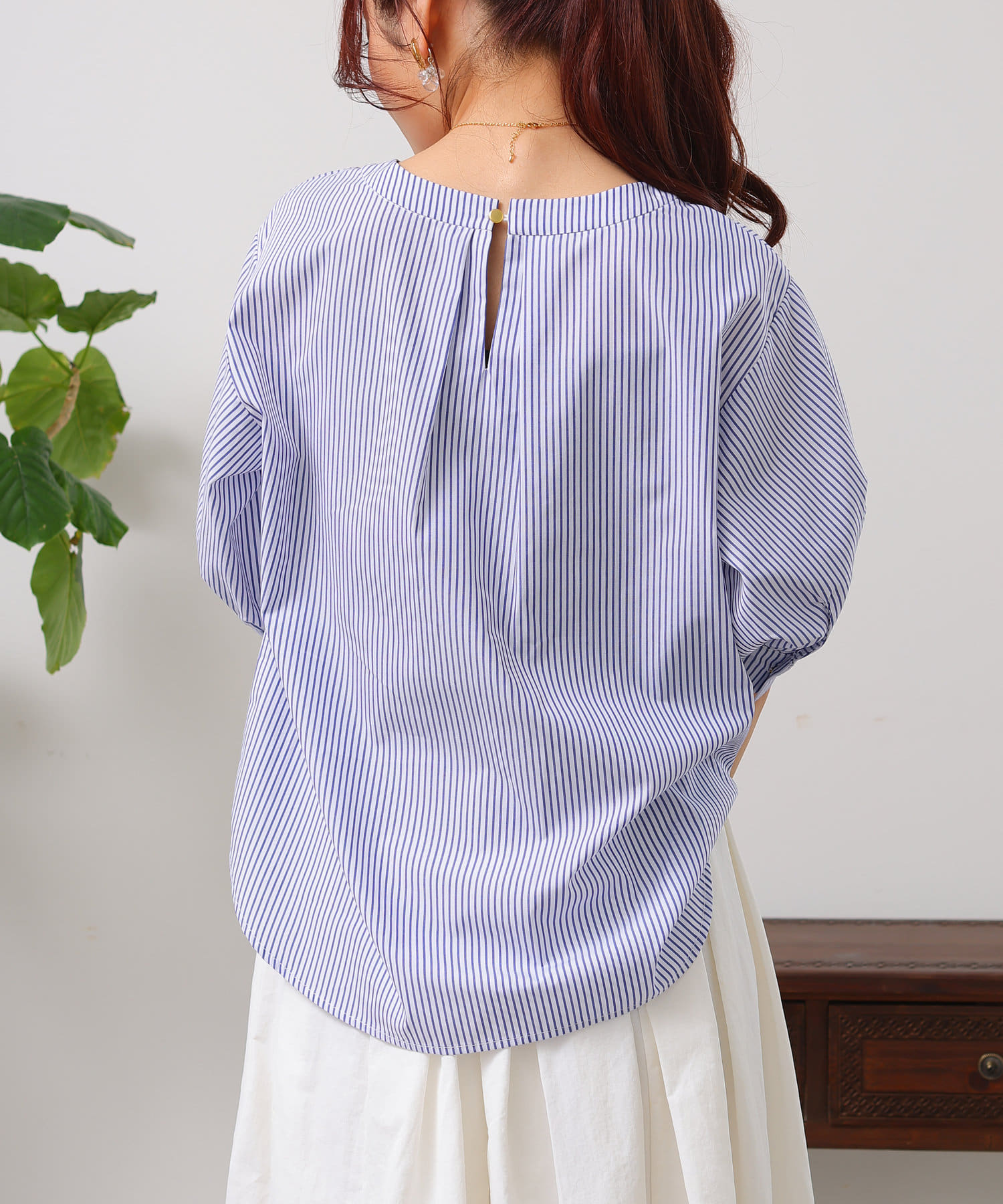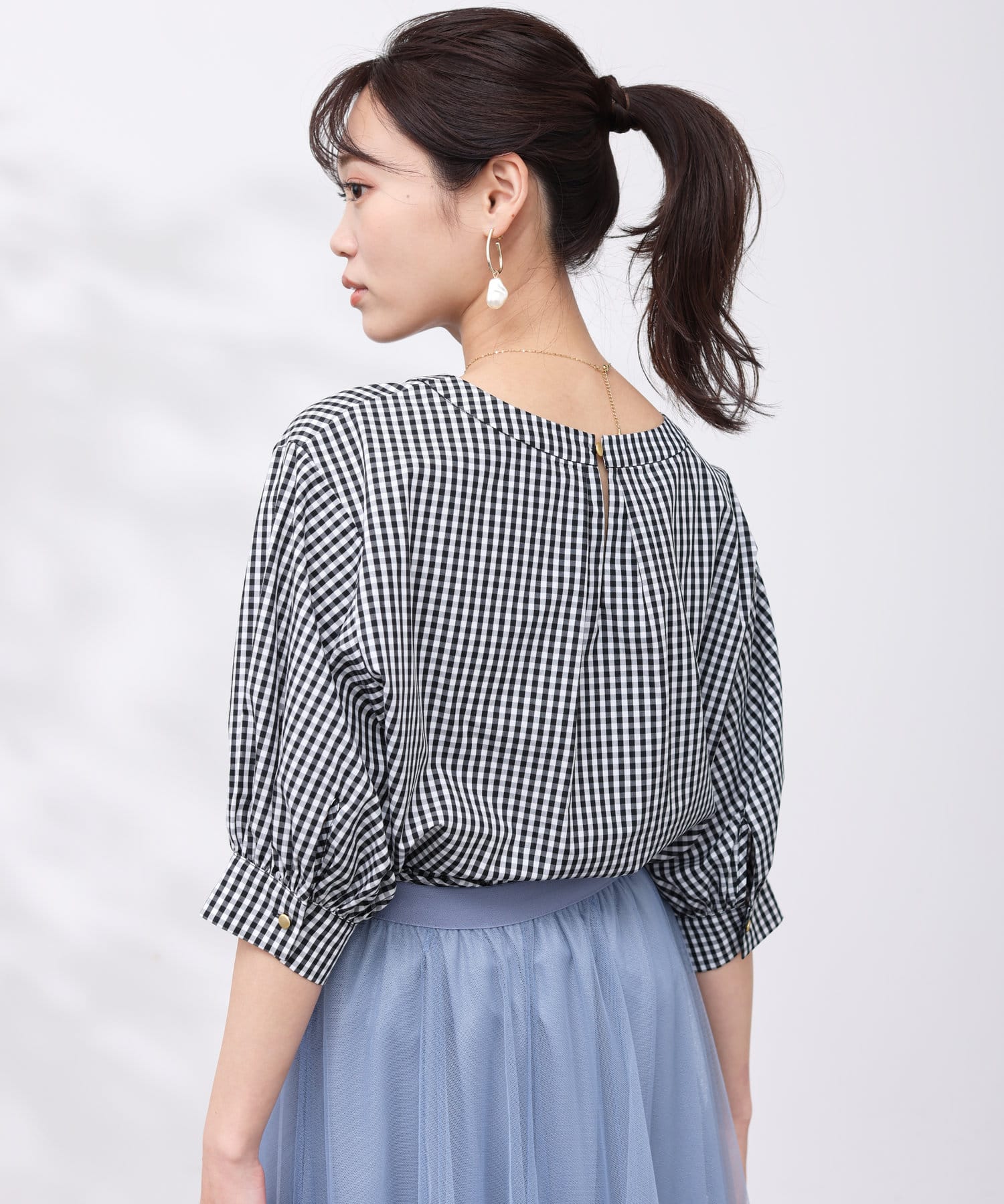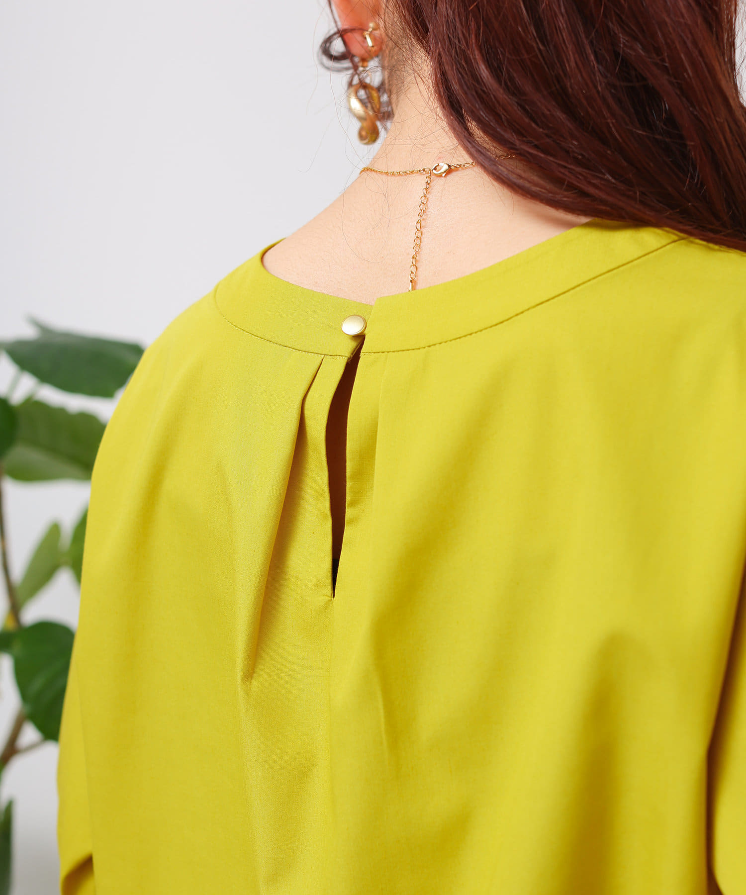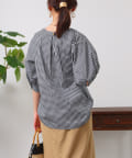 衿はクルーネックの仕様。後ろ衿ぐりはギャザーとタックを組み合わせて立体的なシルエットになっています。
