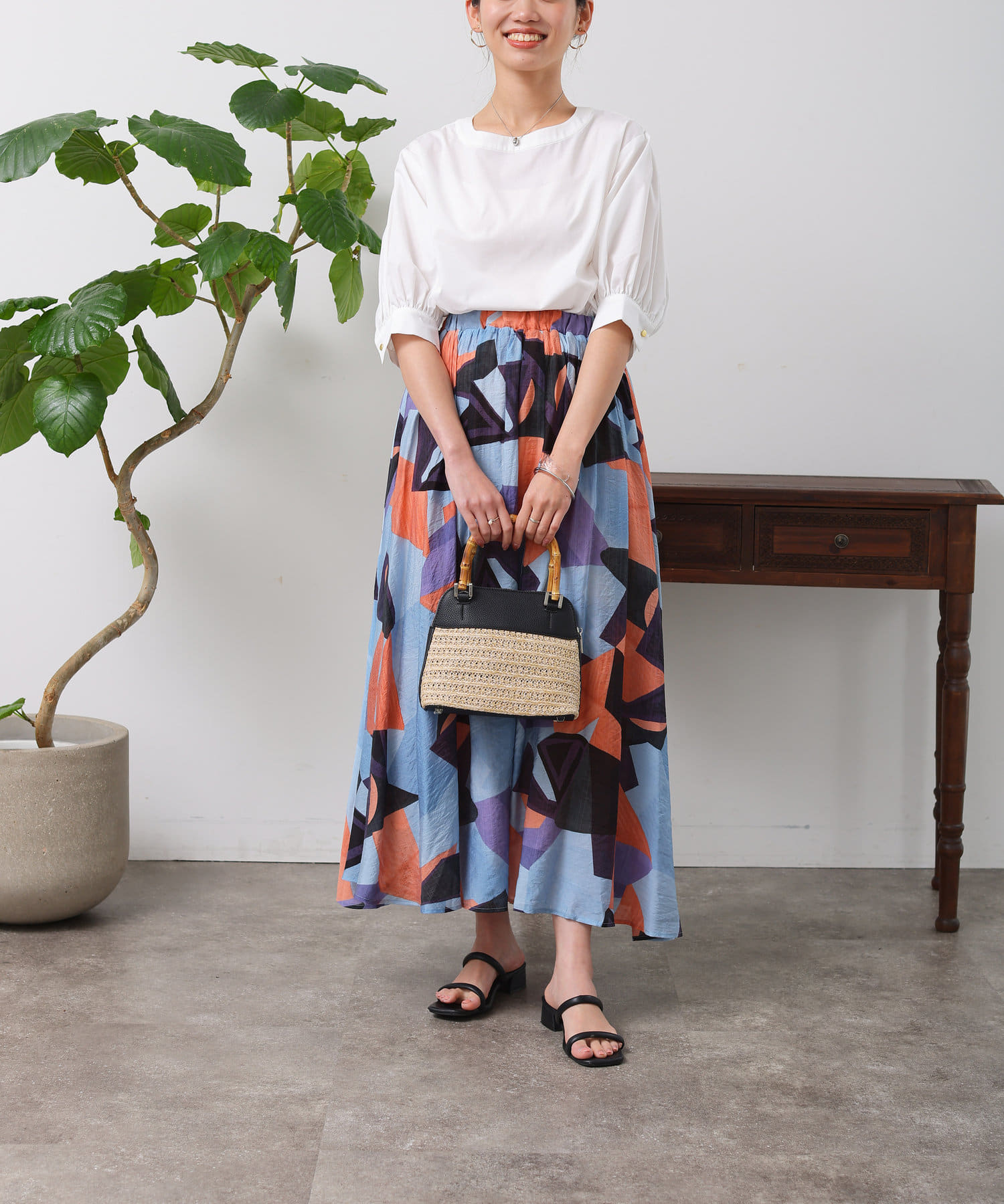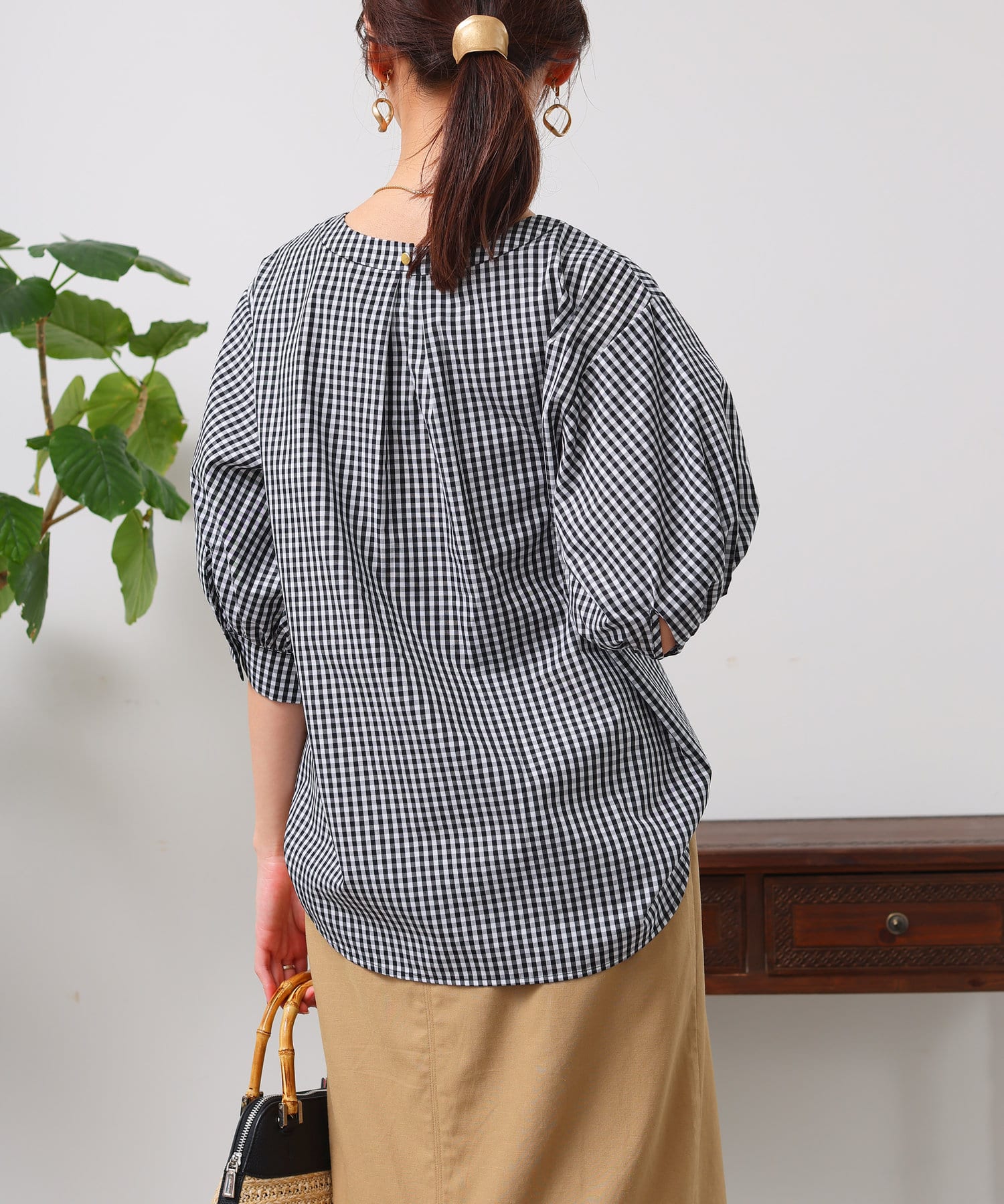チュニック丈で腰回りをさり気なくカバー。気になる二の腕もボリューム袖でしっかりカバーしてくれるのが嬉しいですよね!