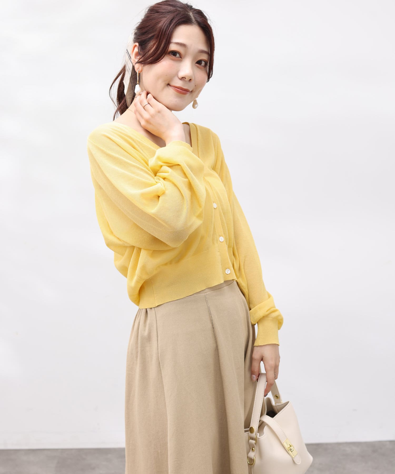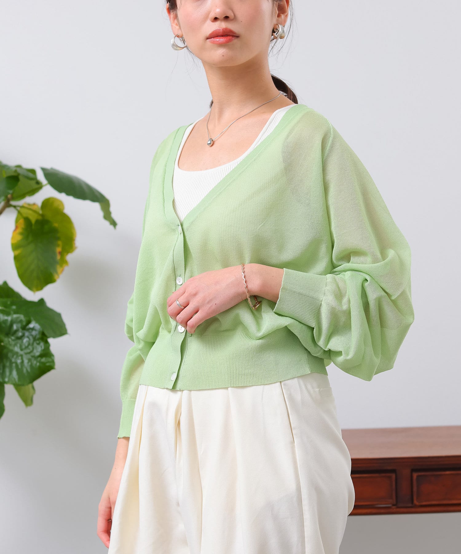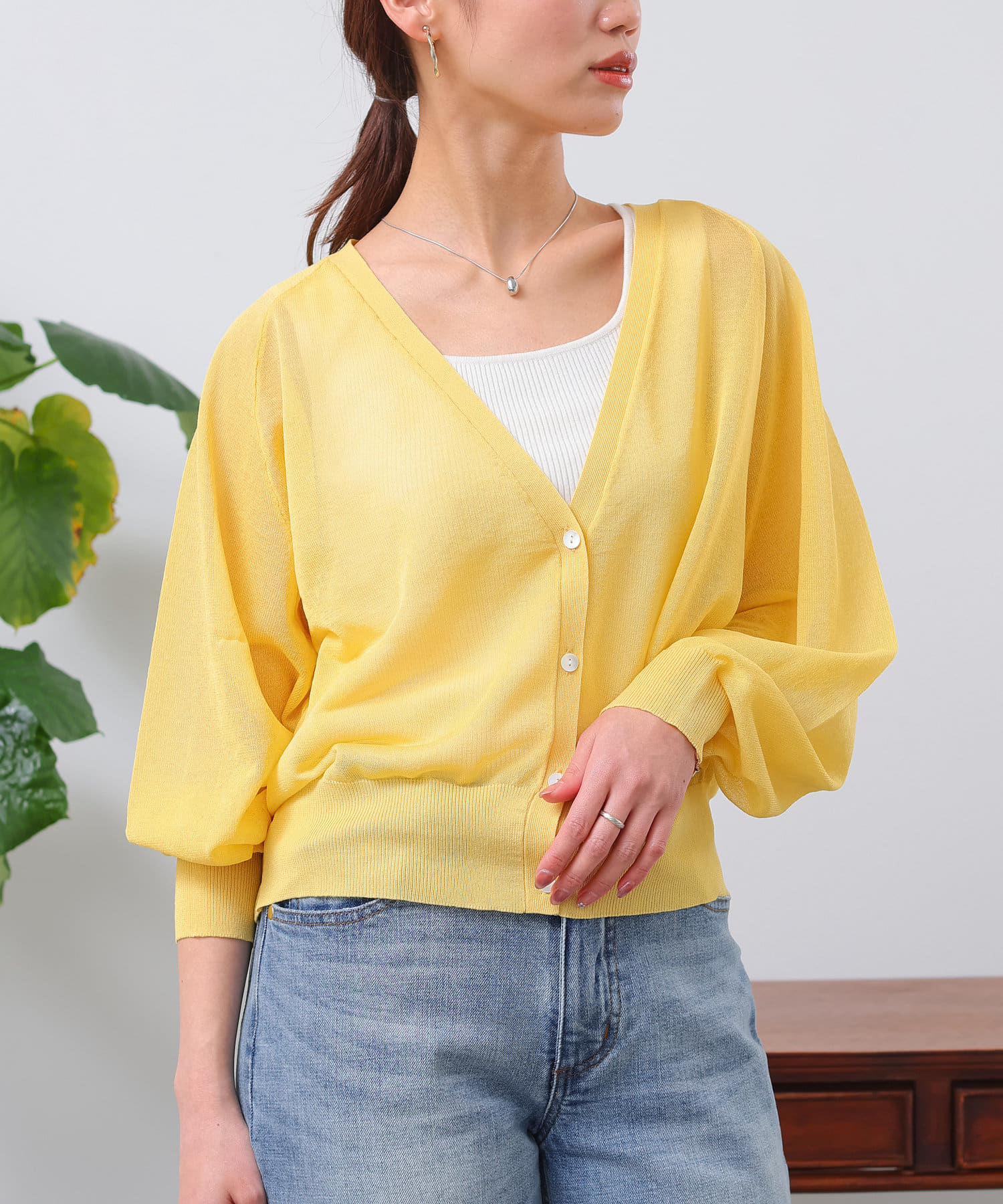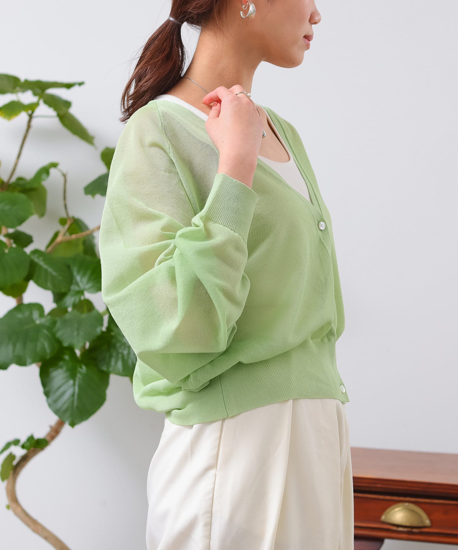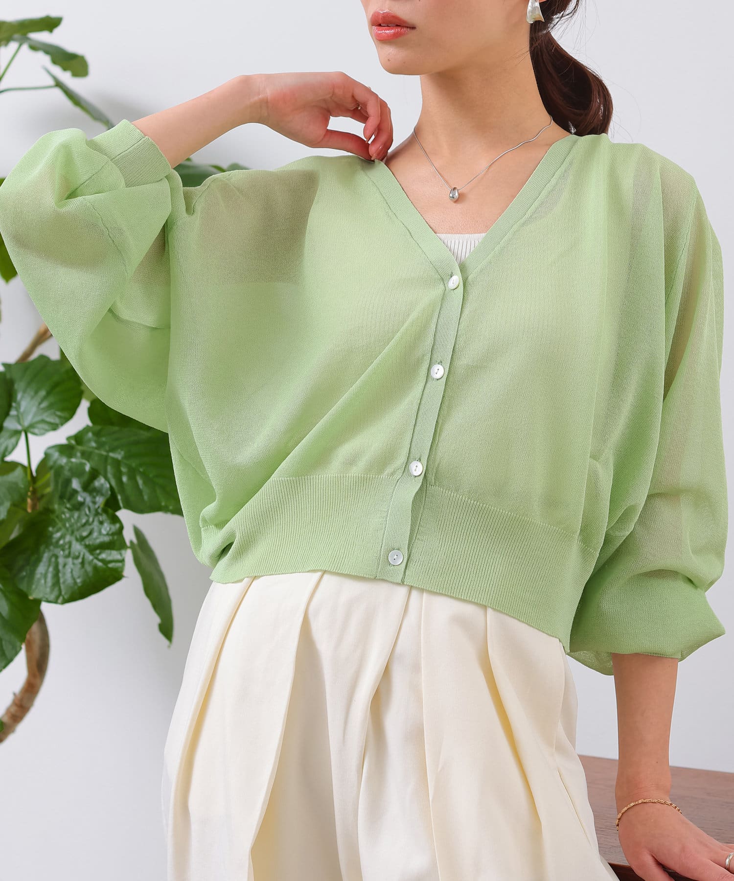 ゆったりとしたサイズ感と鮮やかなカラーが目を惹くシアーカーディガン。