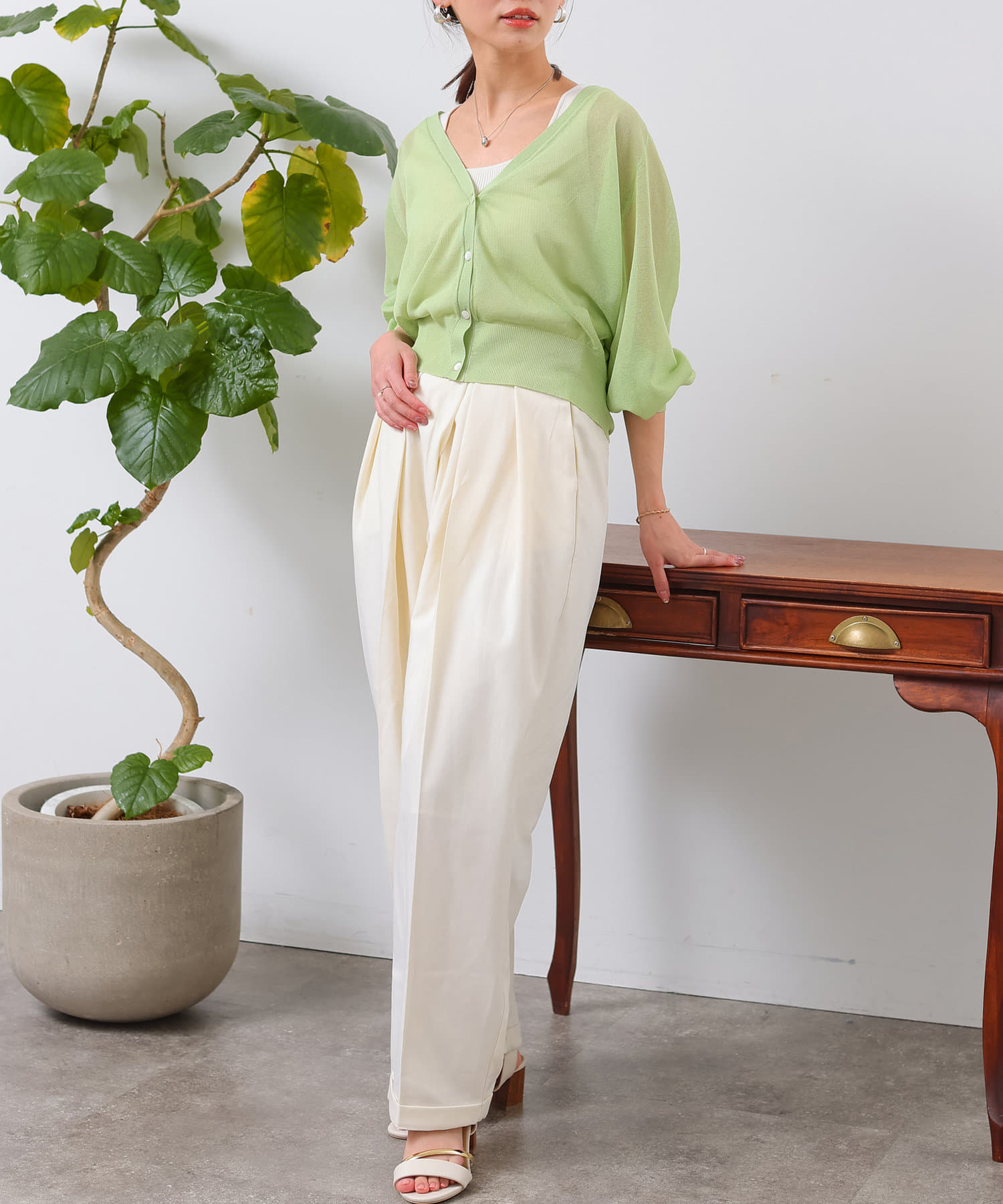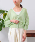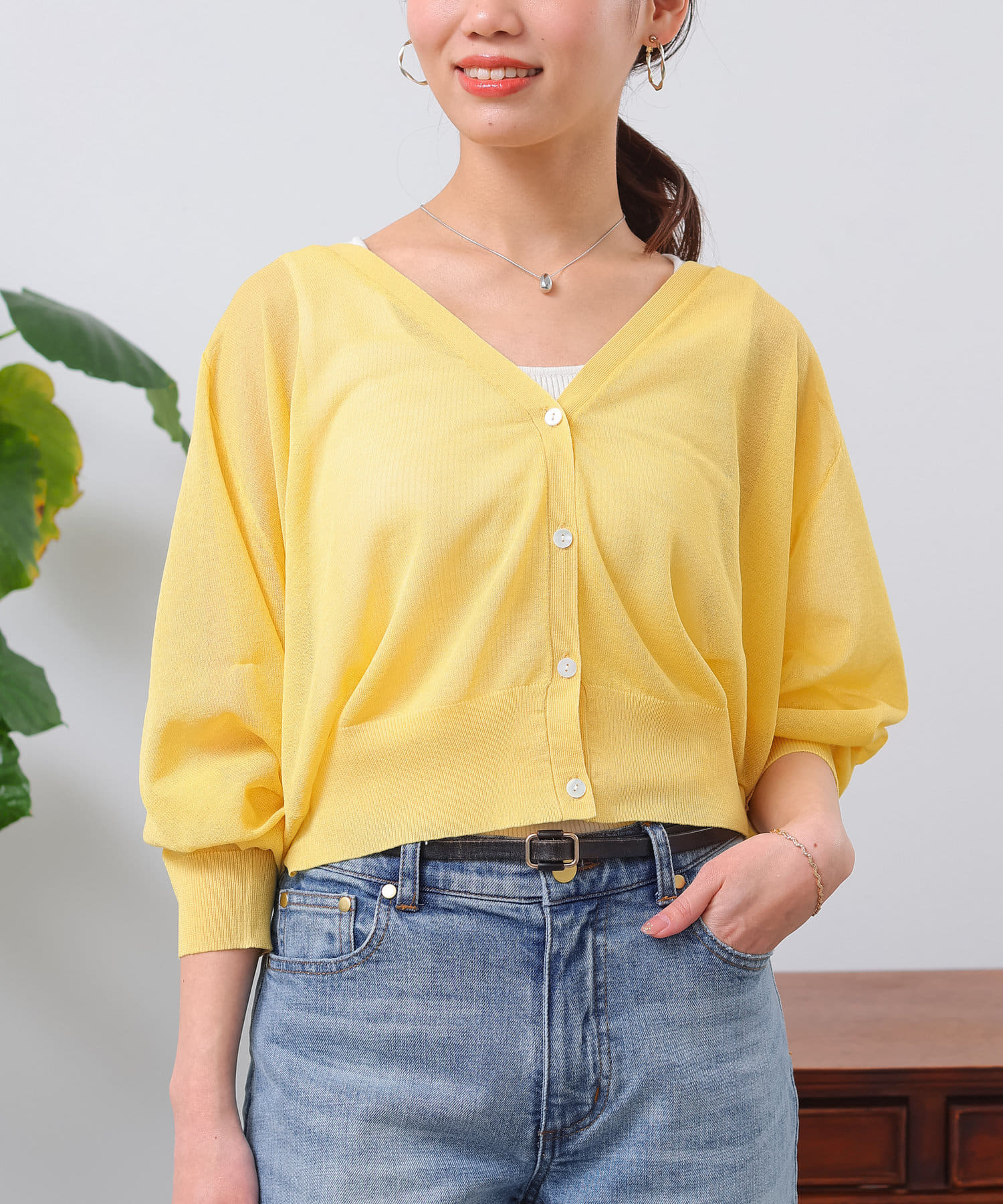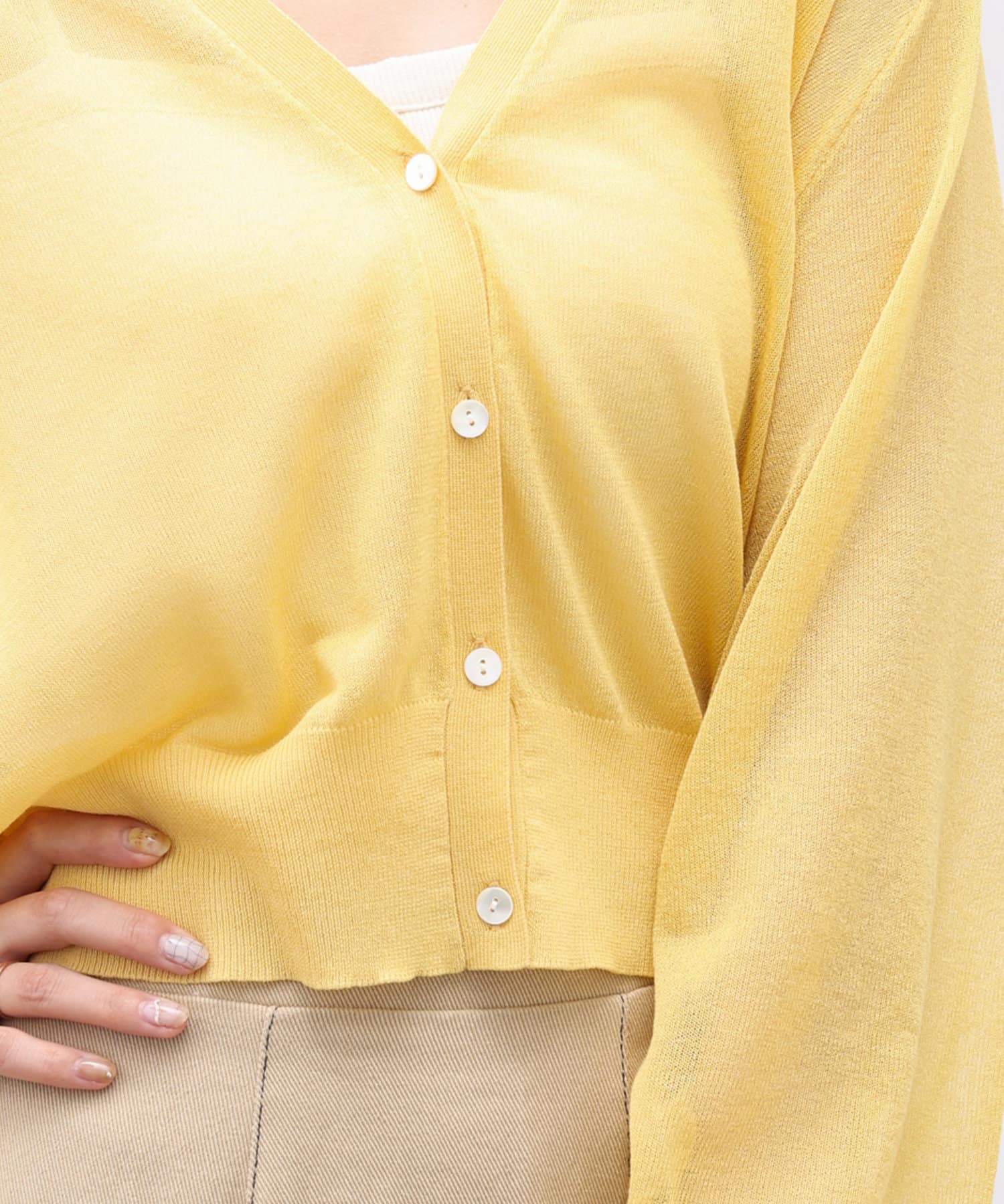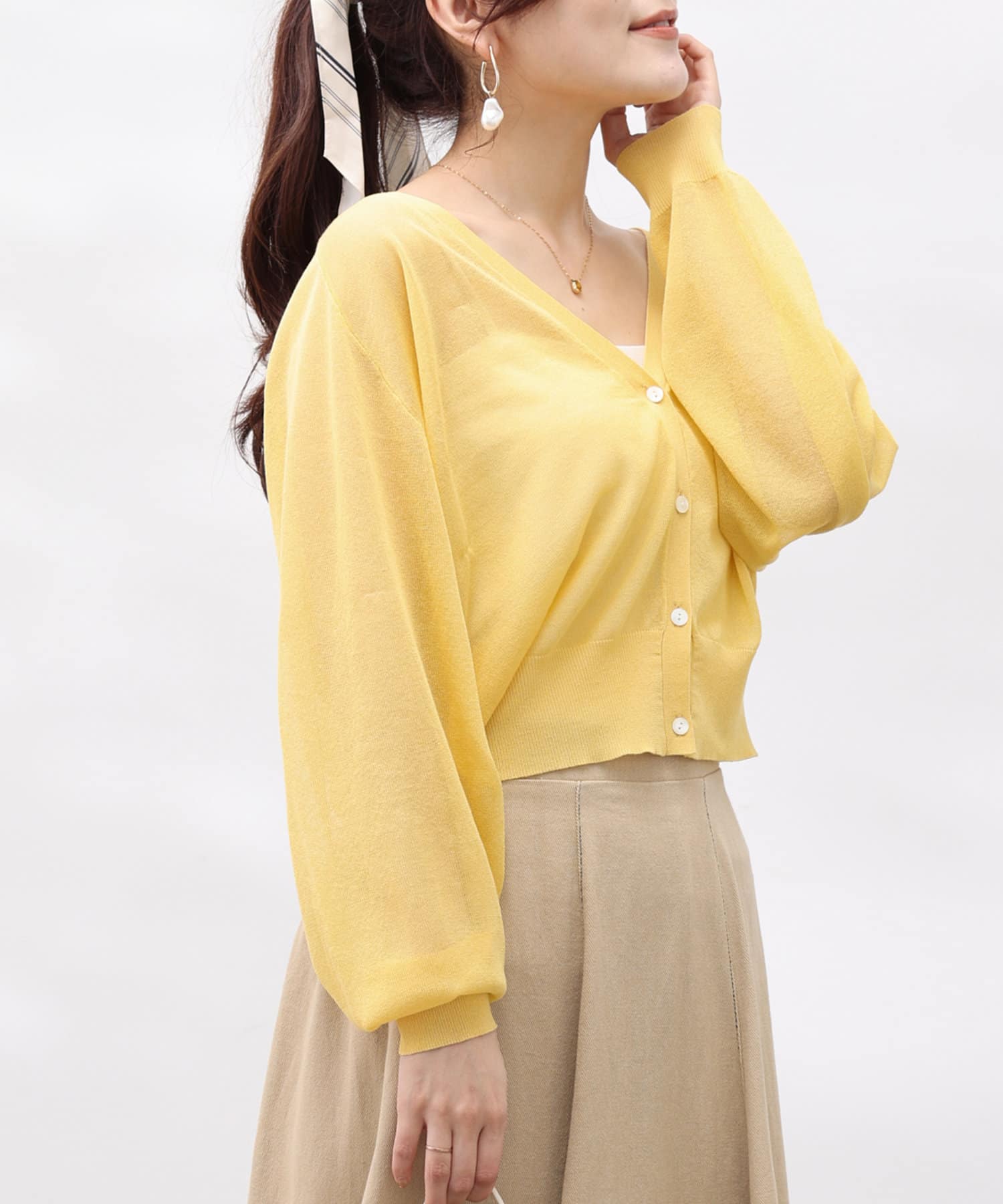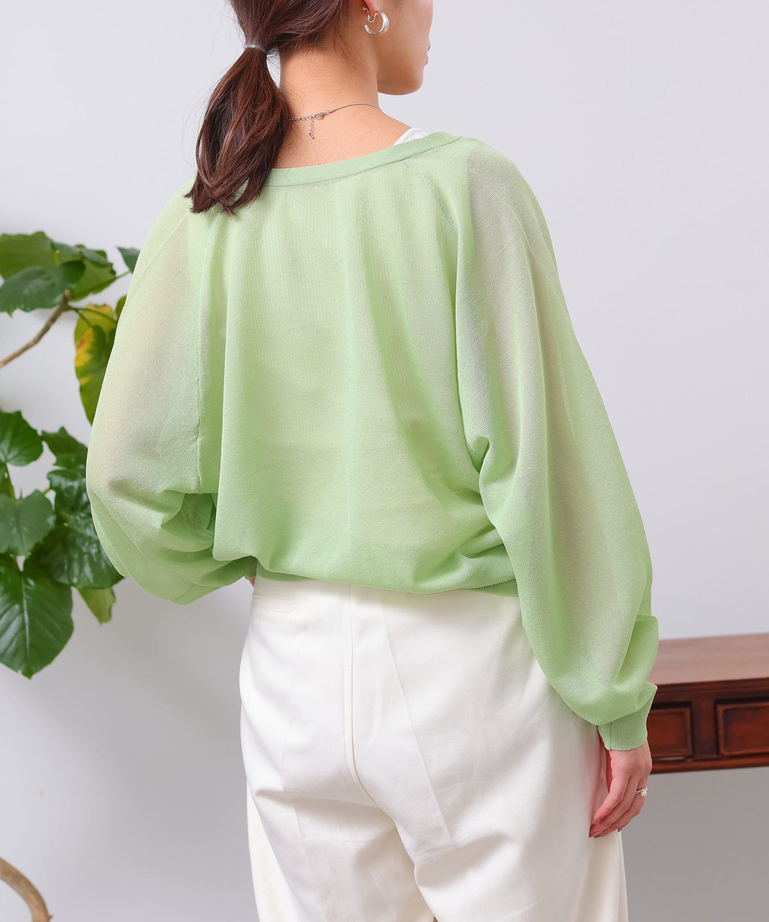 ゆったりとしたサイズ感と鮮やかなカラーが目を惹くシアーカーディガン。