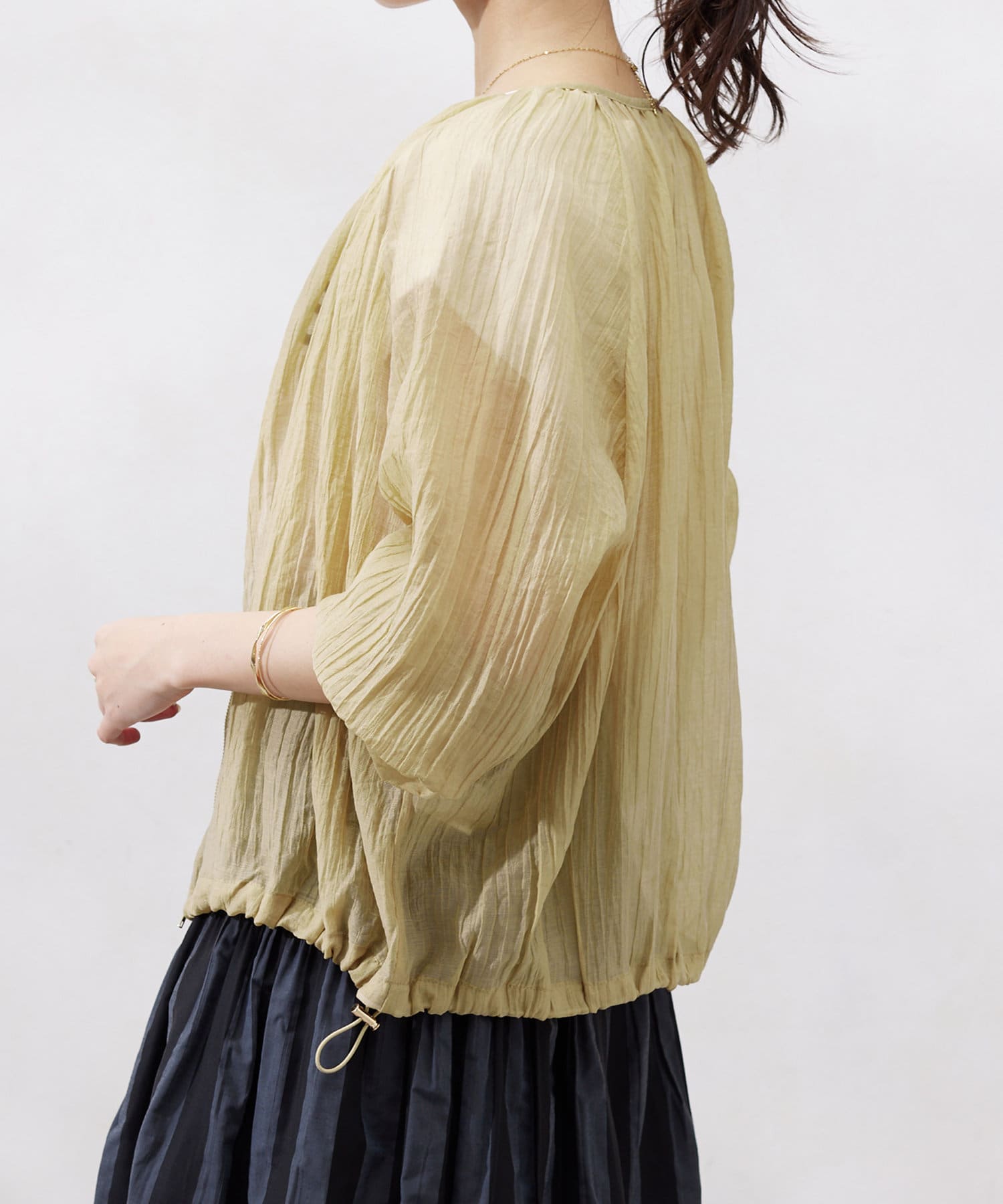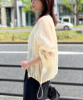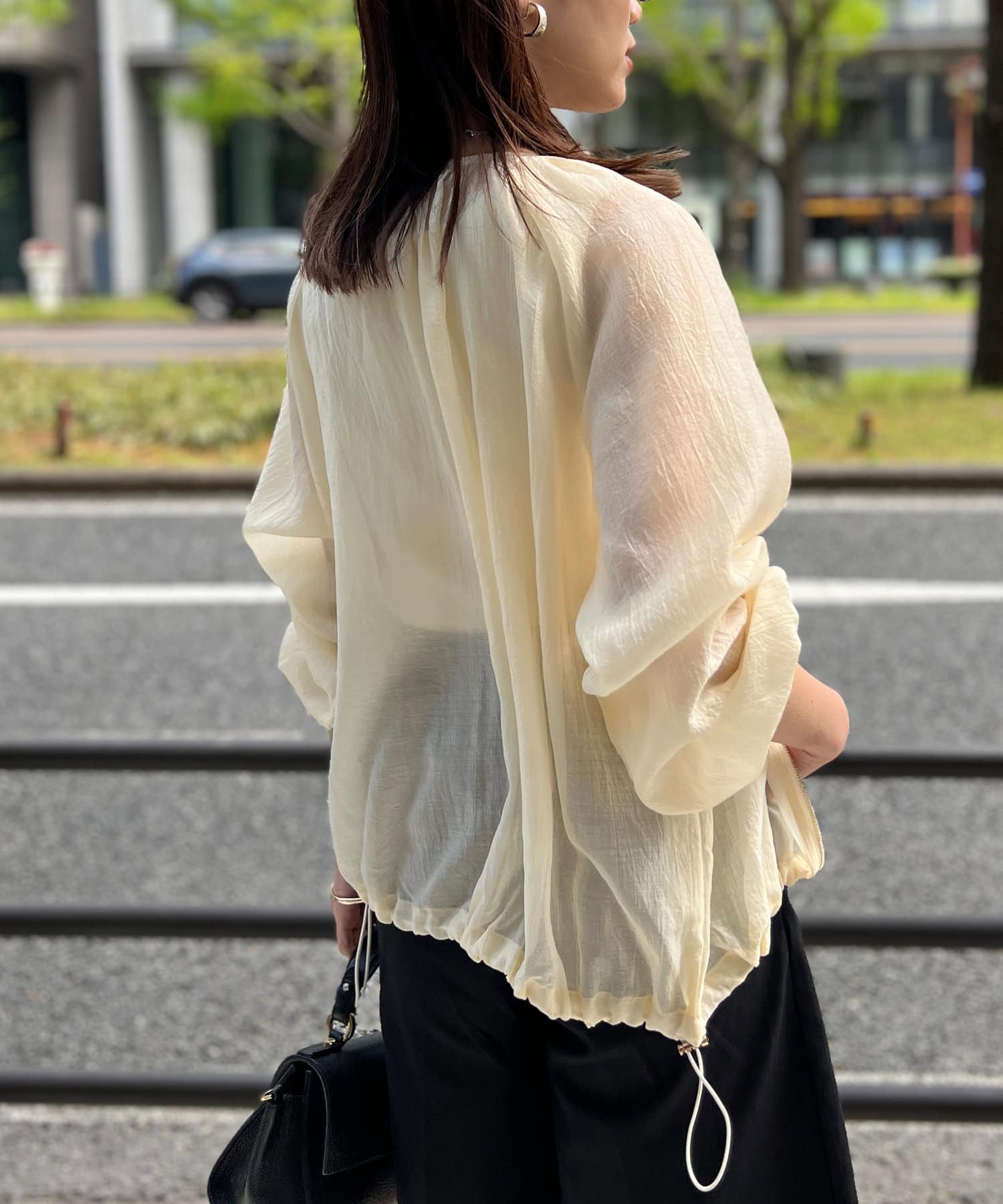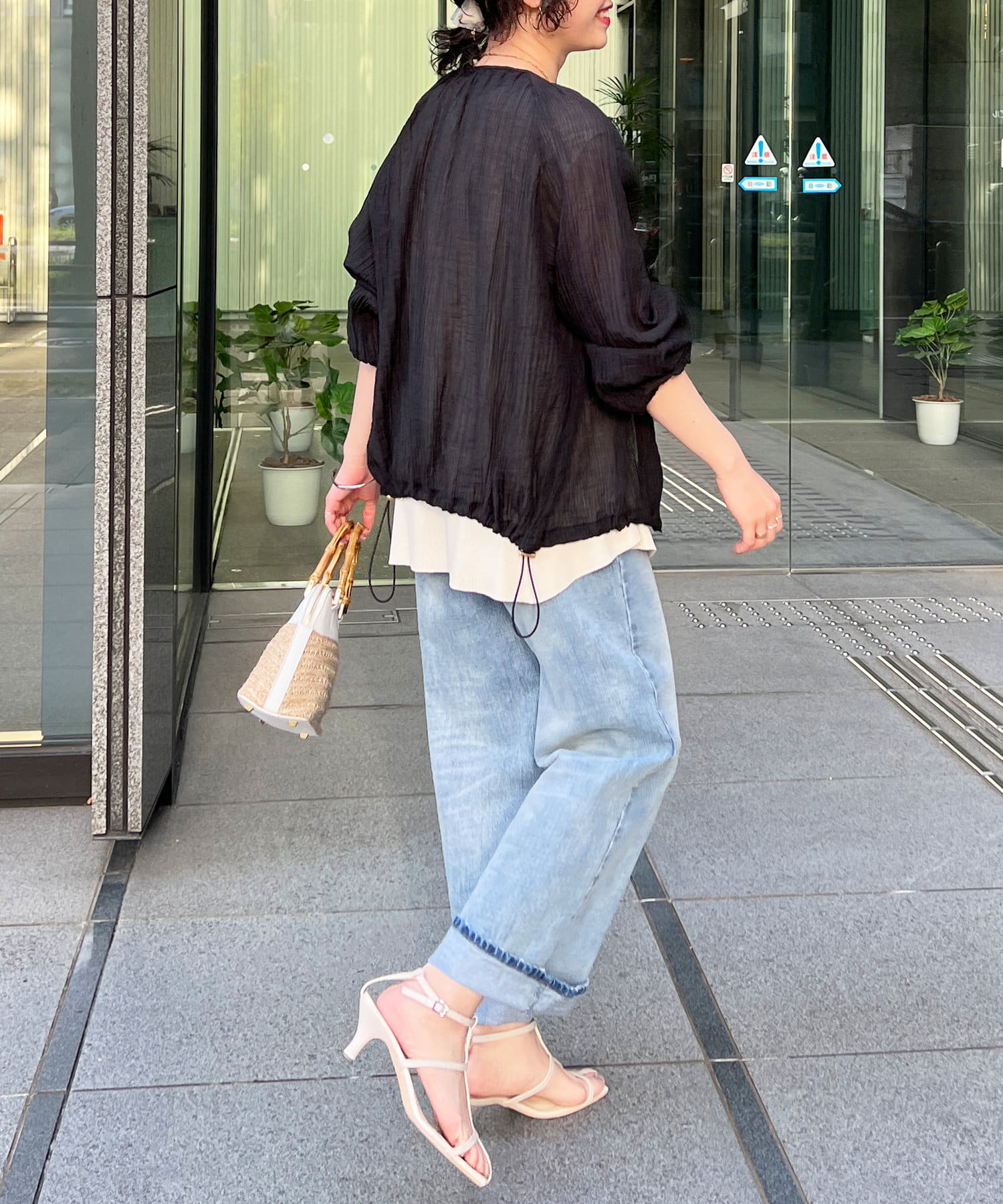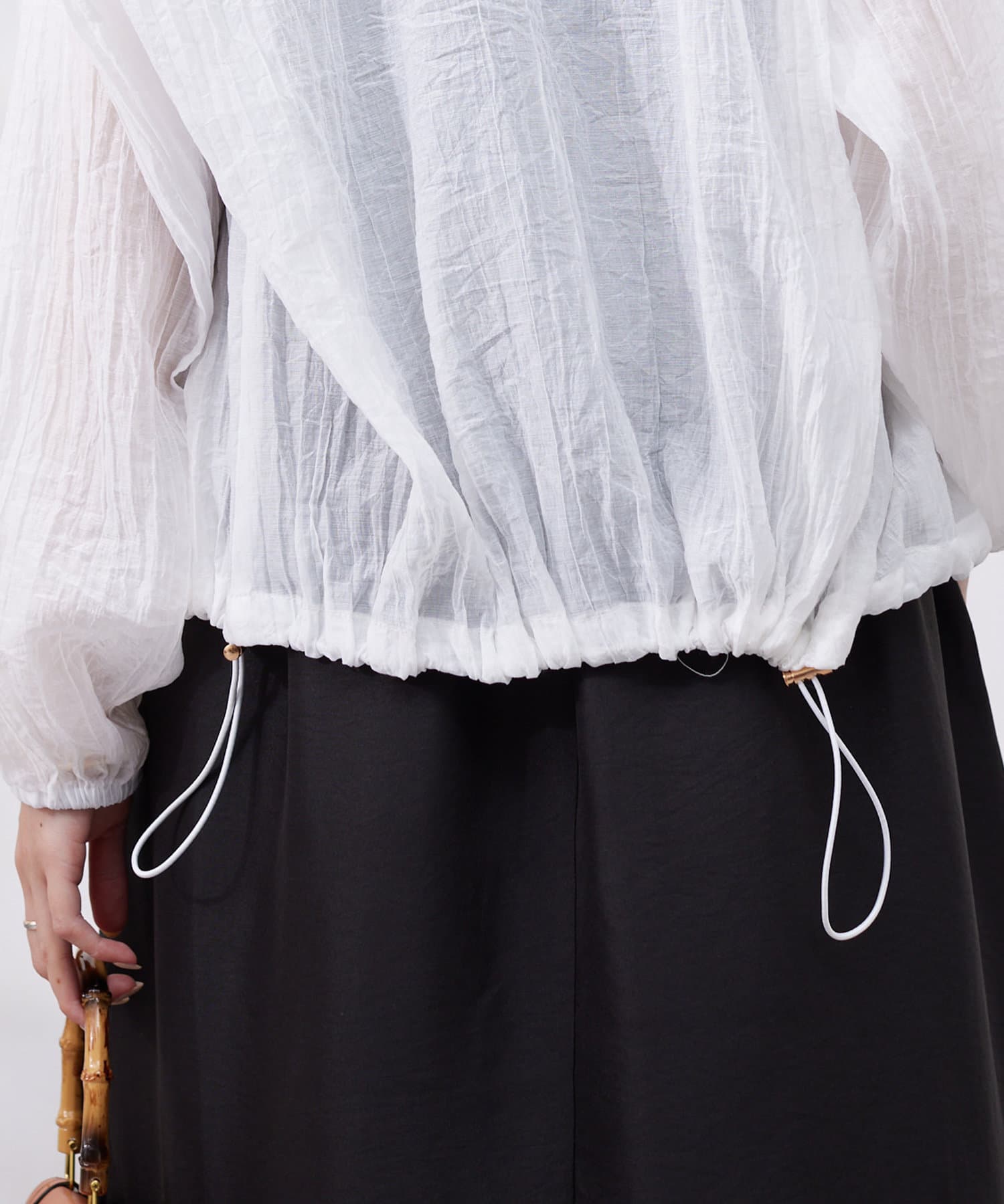 裾を絞るとギュッとブラウジングができるので、ハイウエストのパンツやフレスカートで合わせてもバランスよく合わせていただけます。