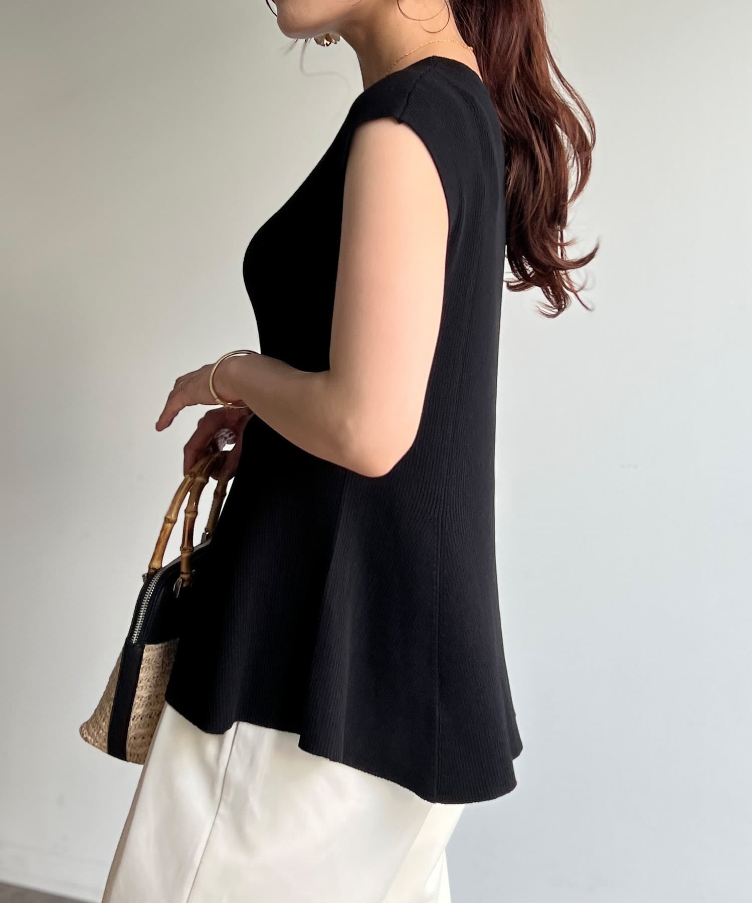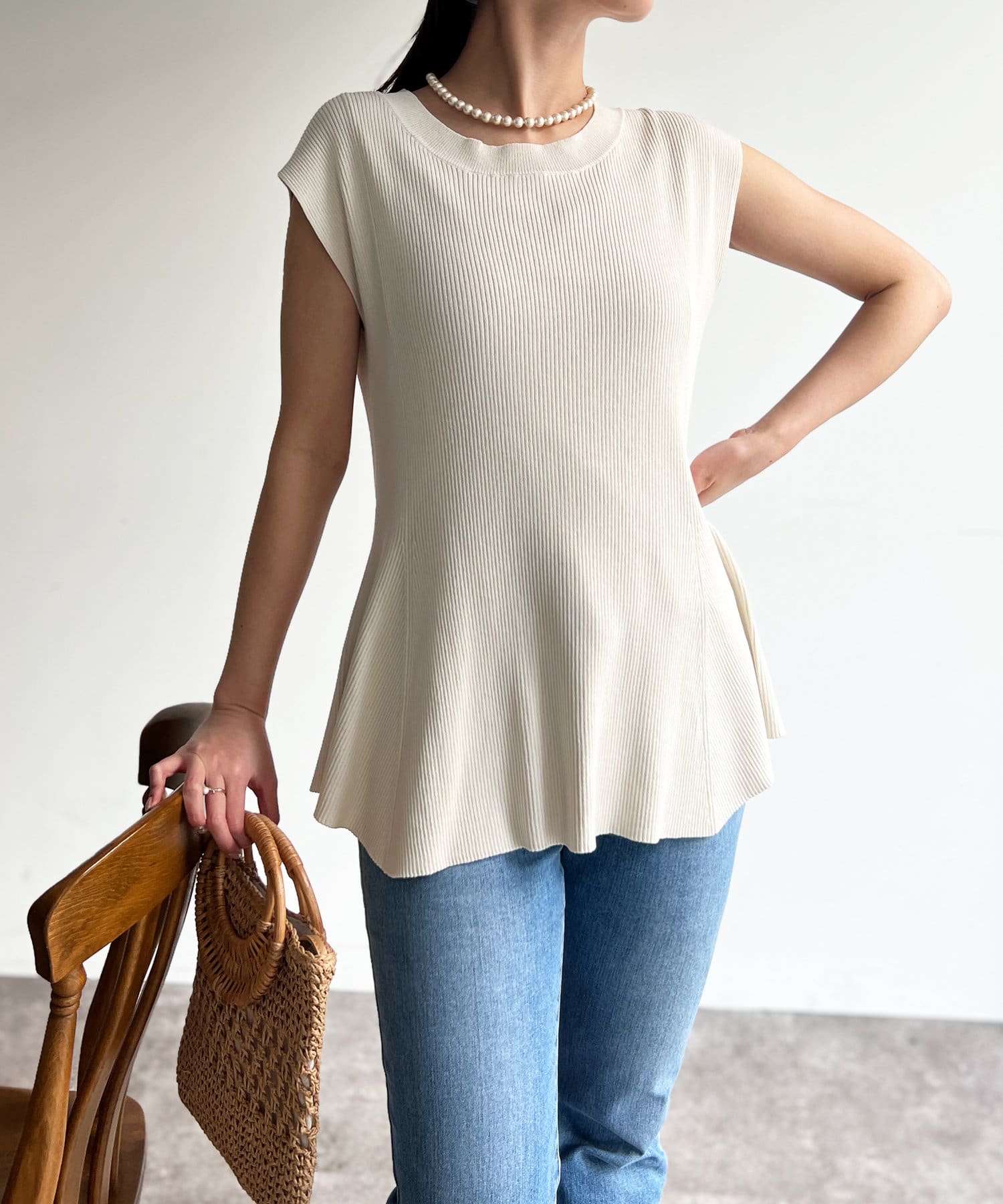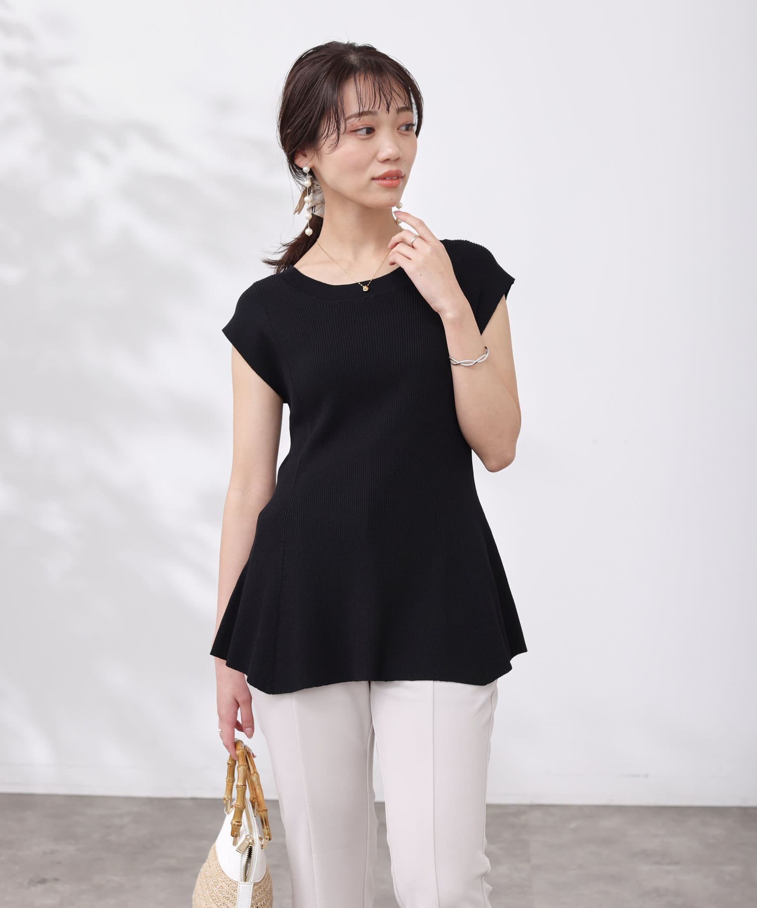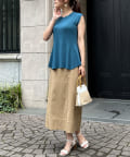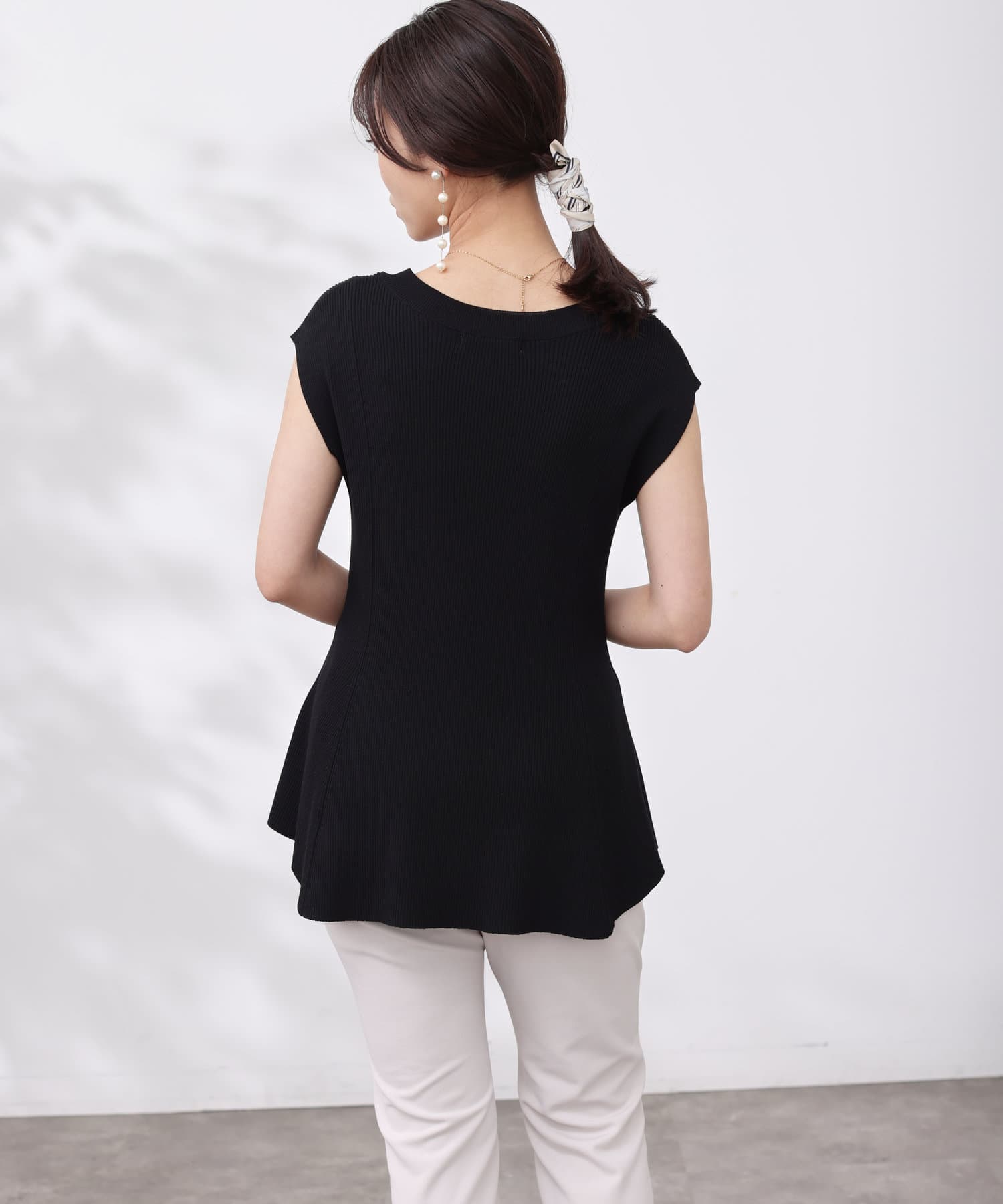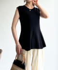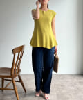 高めのウエスト位置で編地切替になったペプラムトップス。