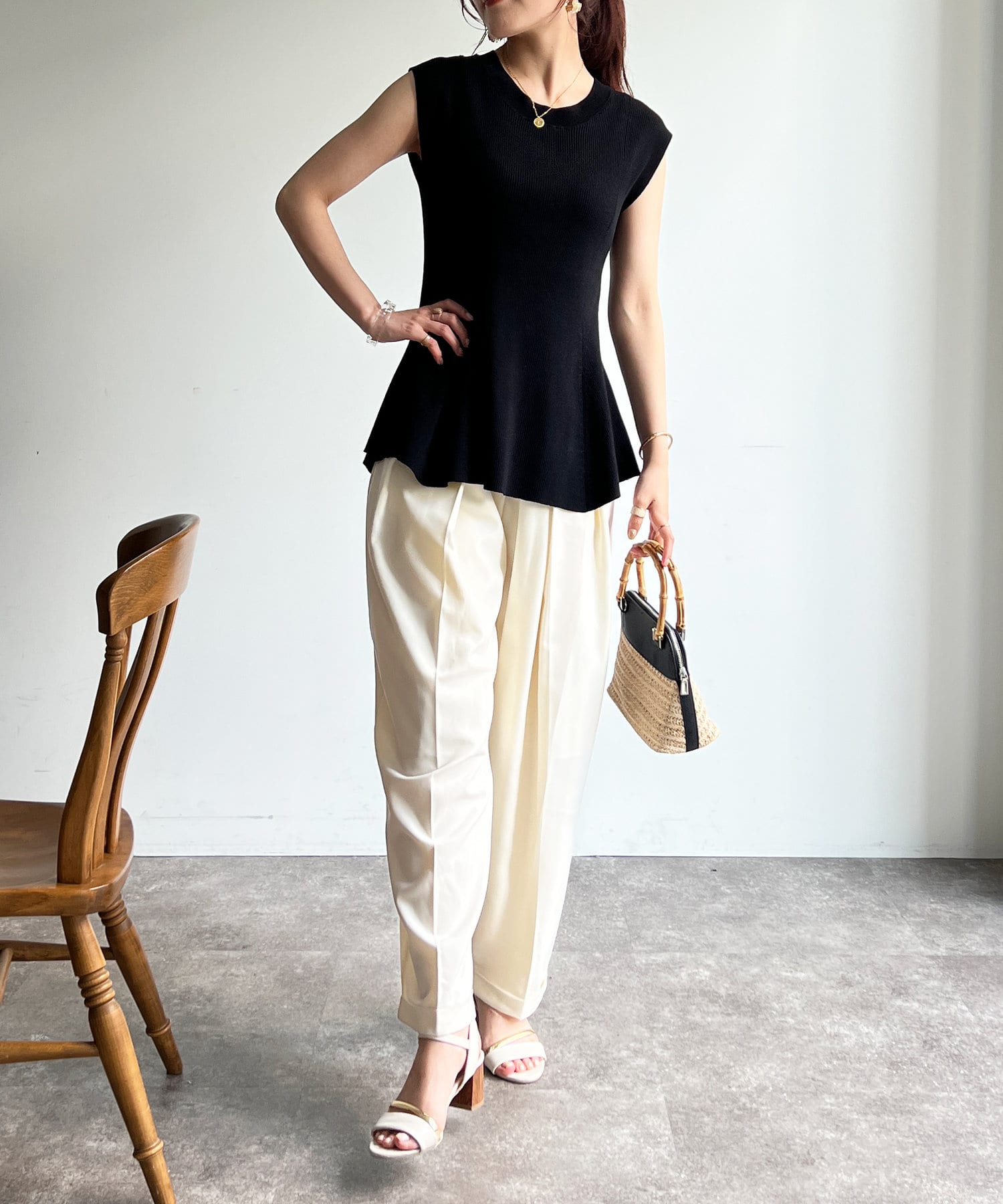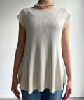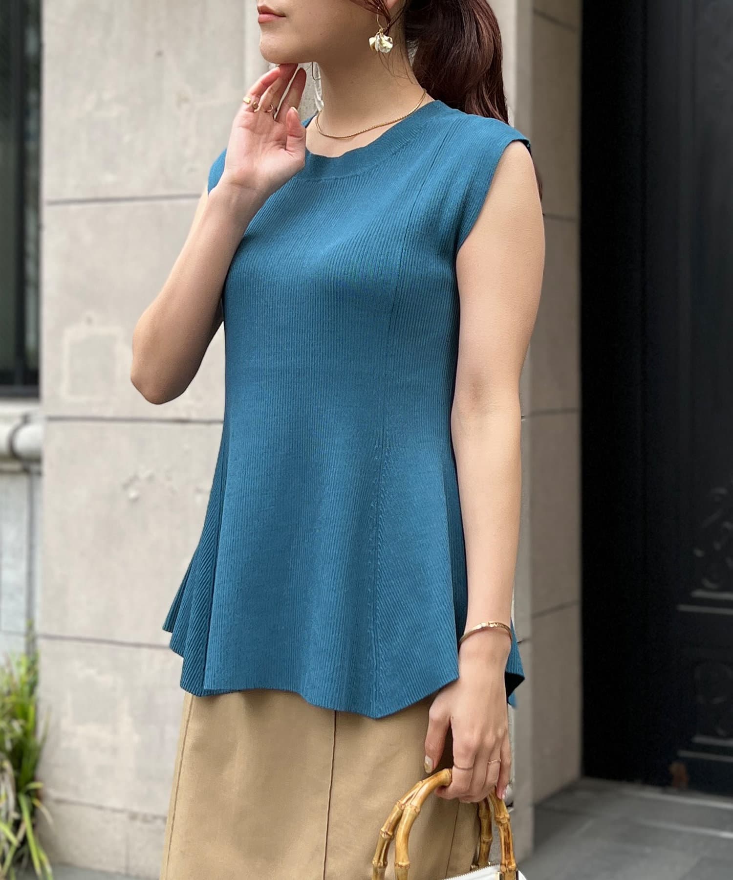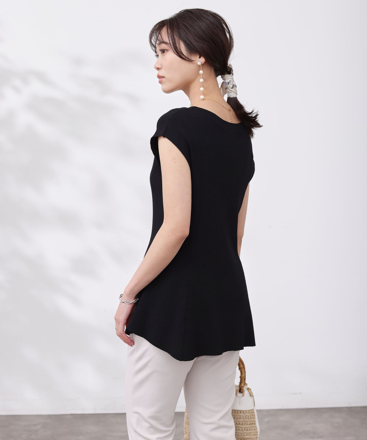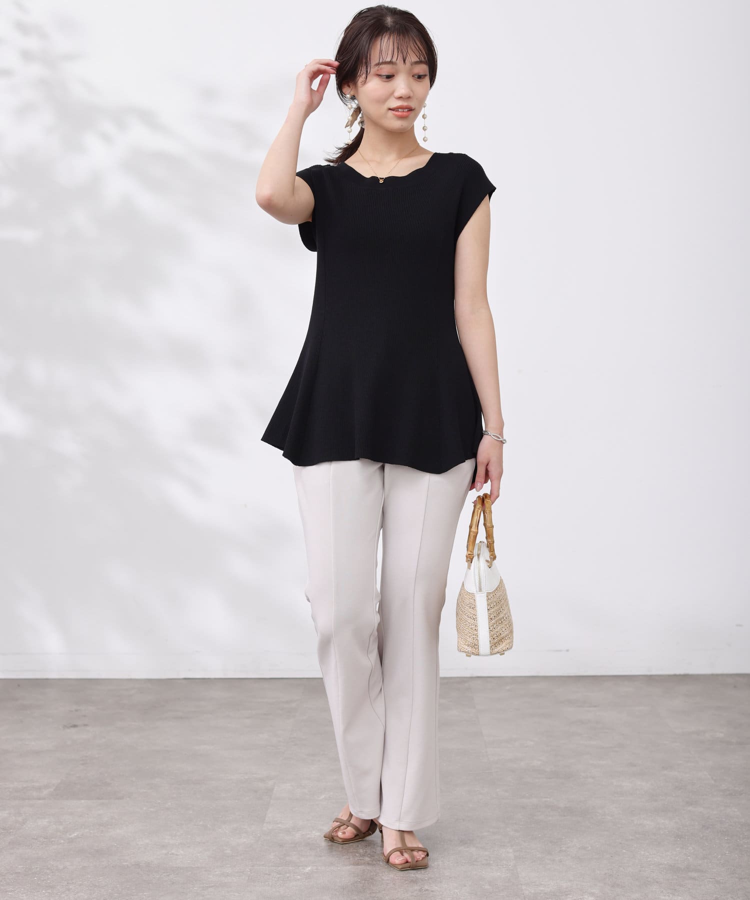 高めのウエスト位置で編地切替になったペプラムトップス。