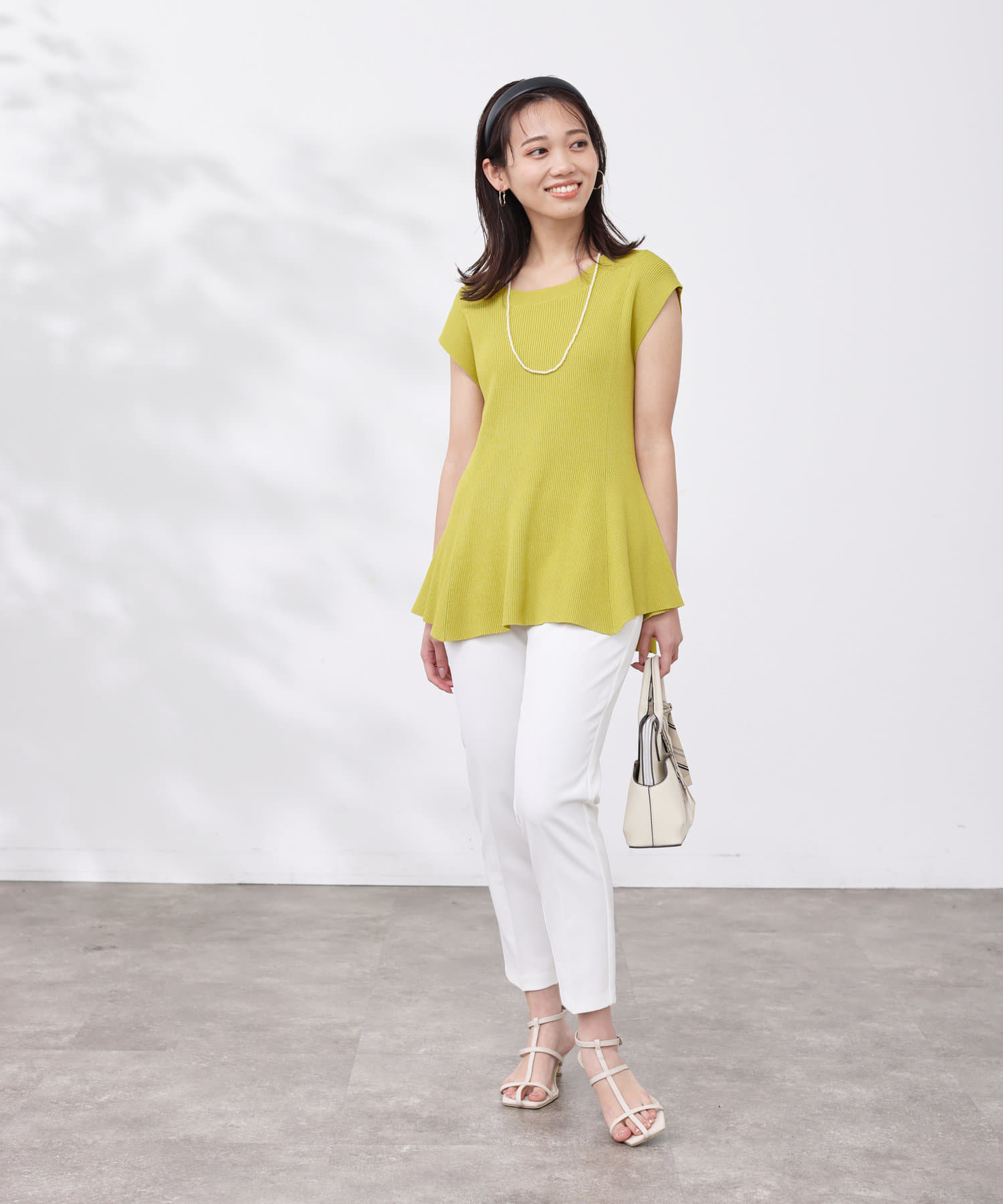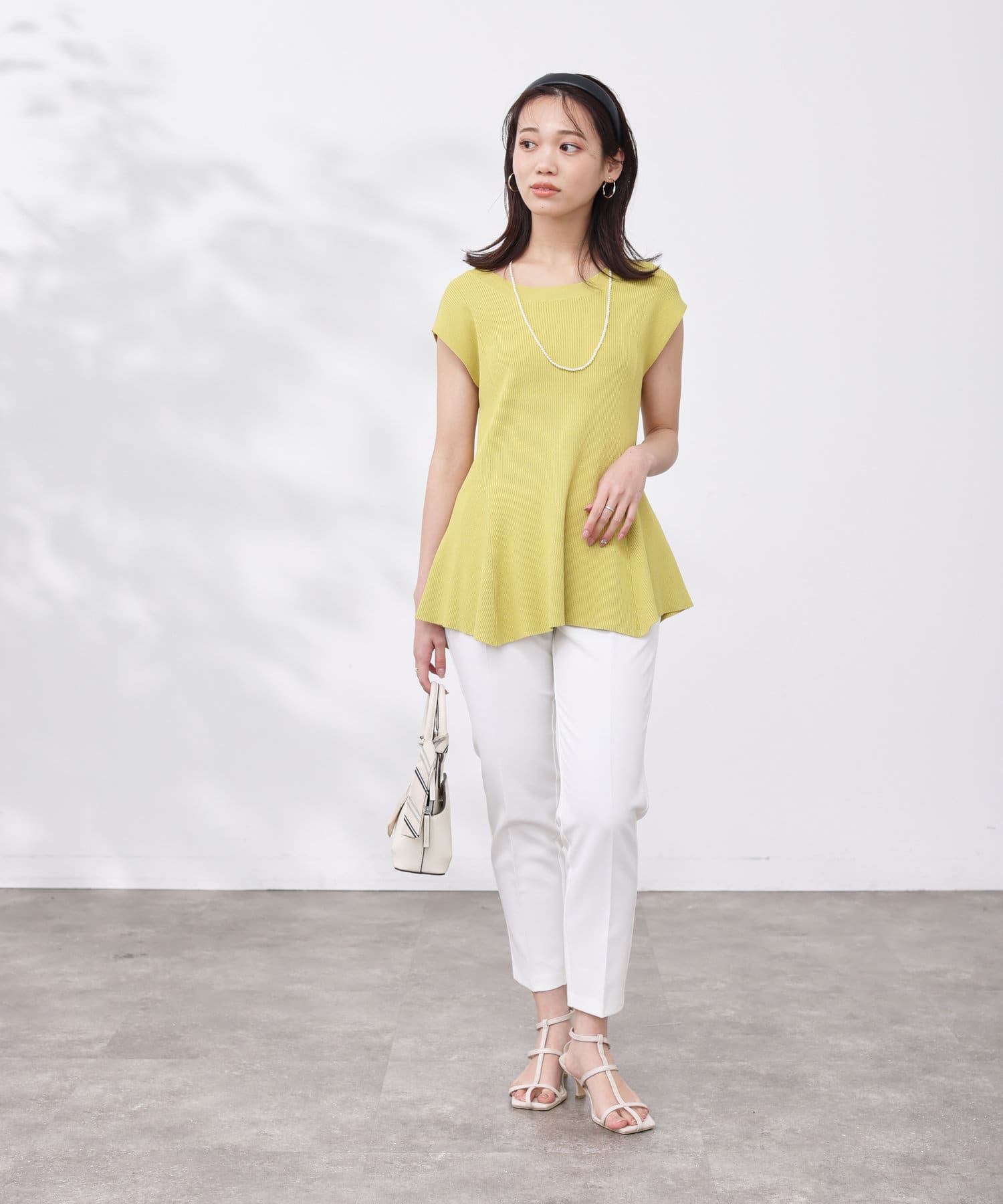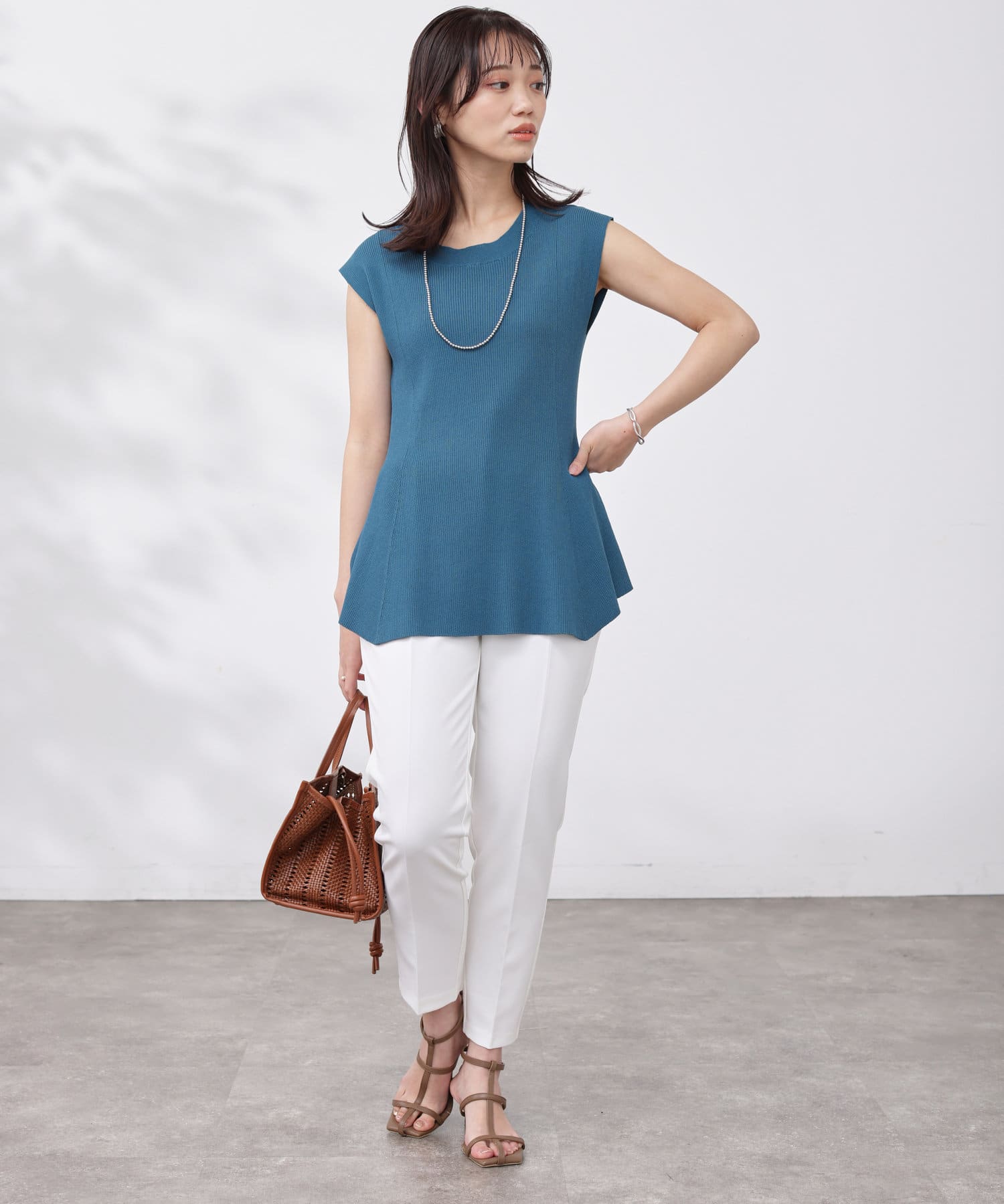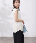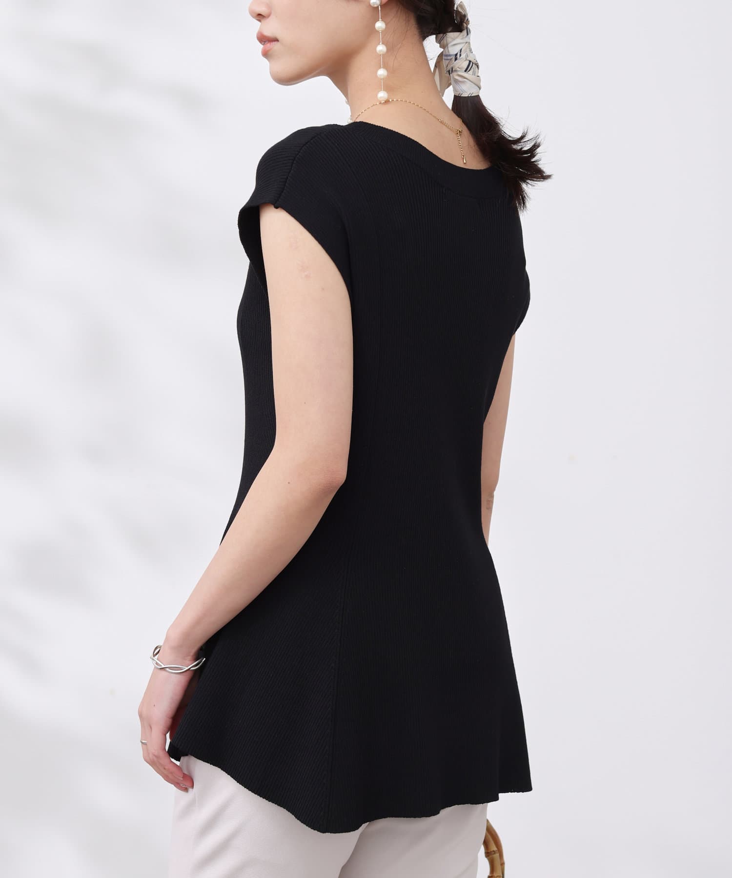 高めのウエスト位置で編地切替になったペプラムトップス。