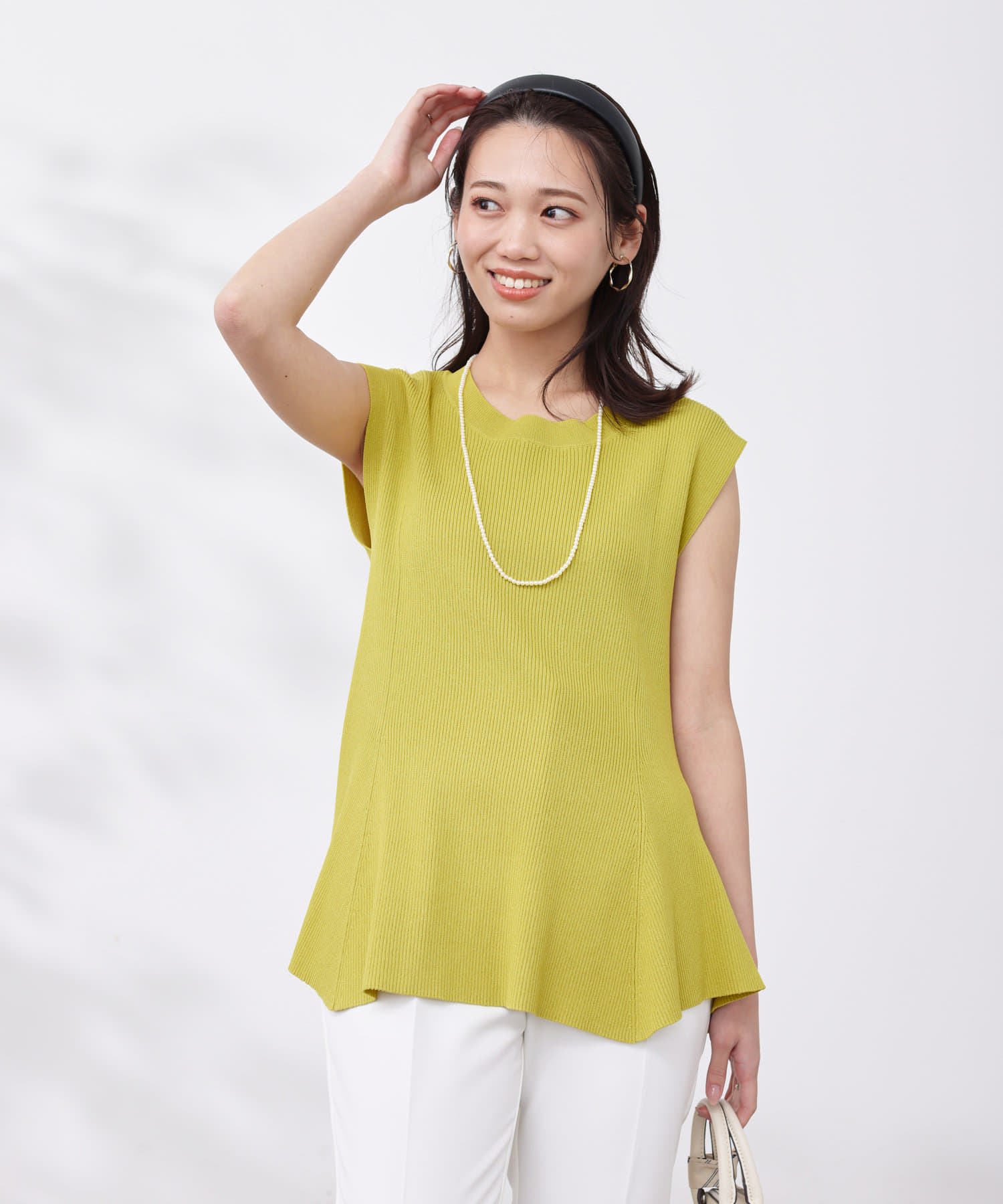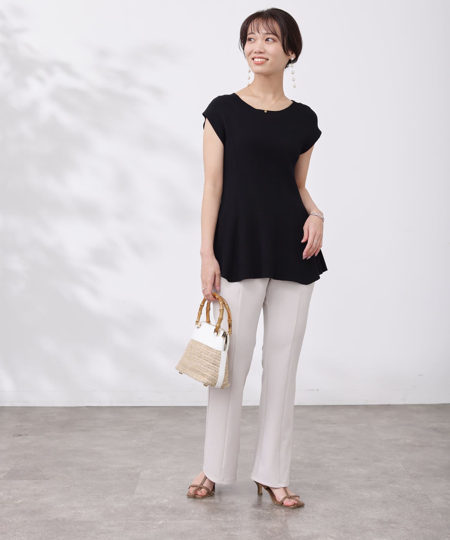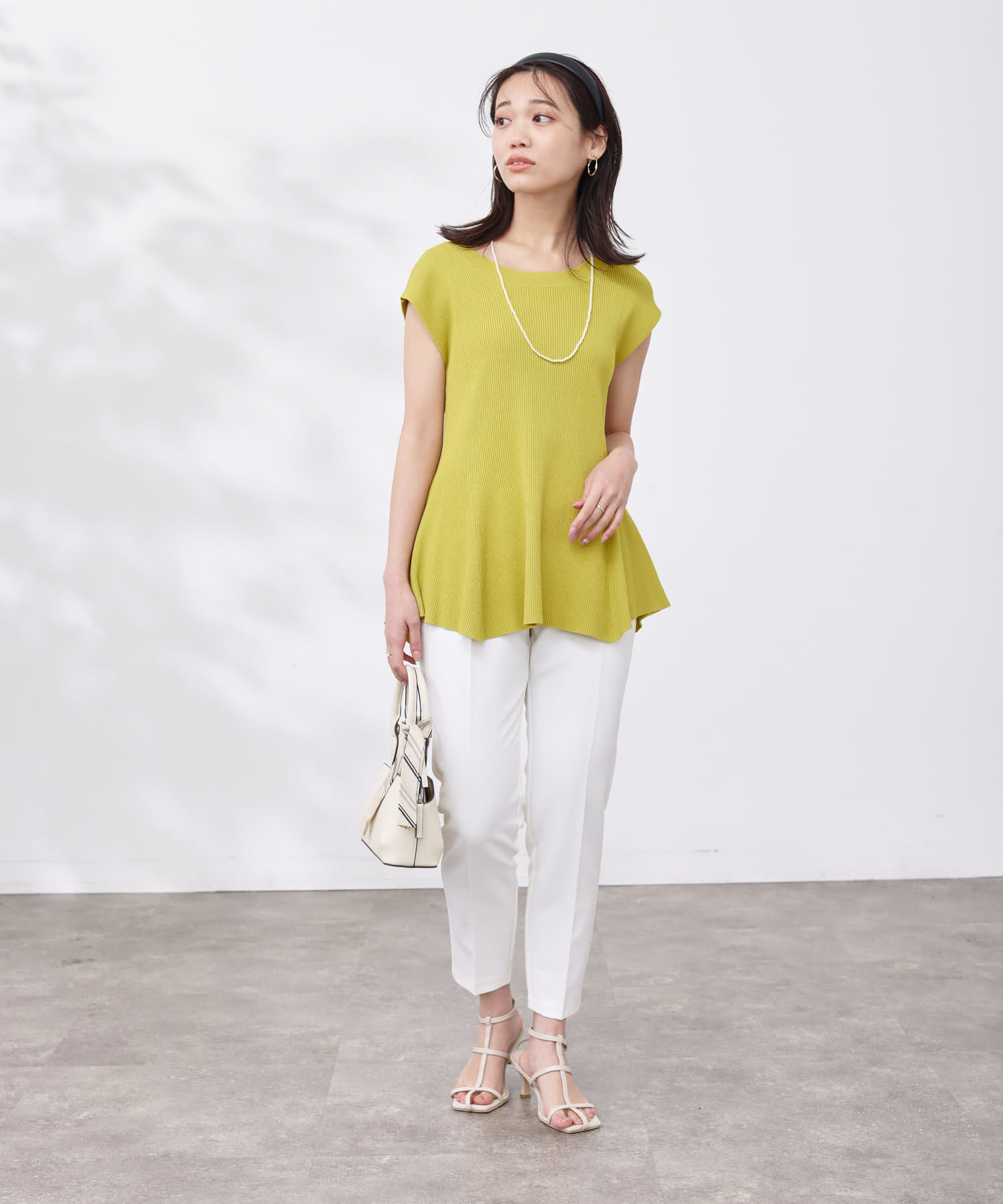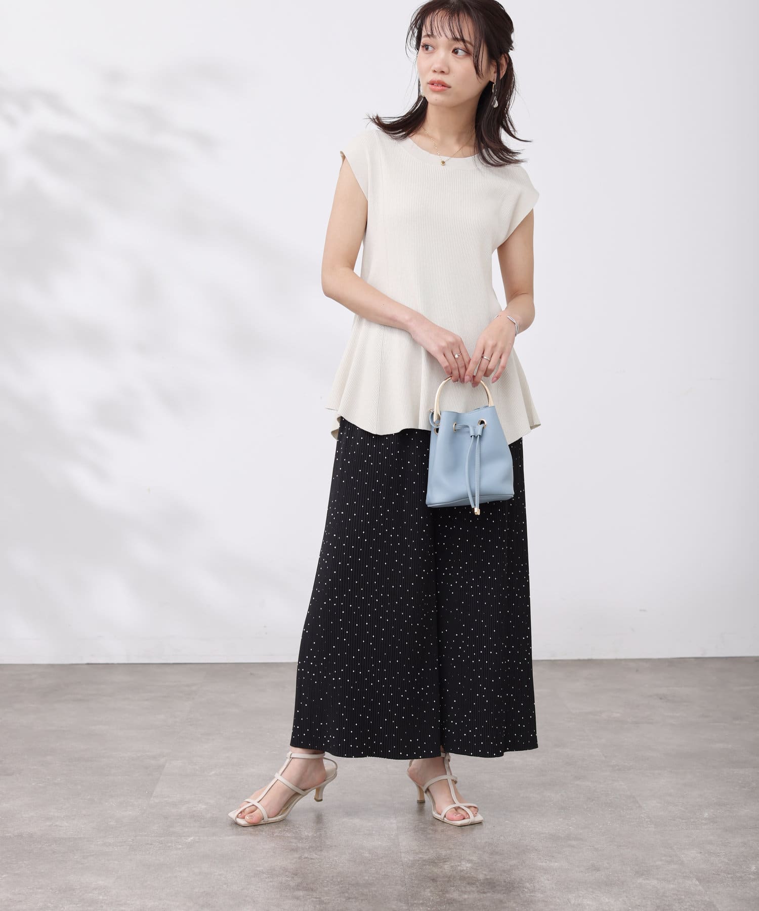 高めのウエスト位置で編地切替になったペプラムトップス。
