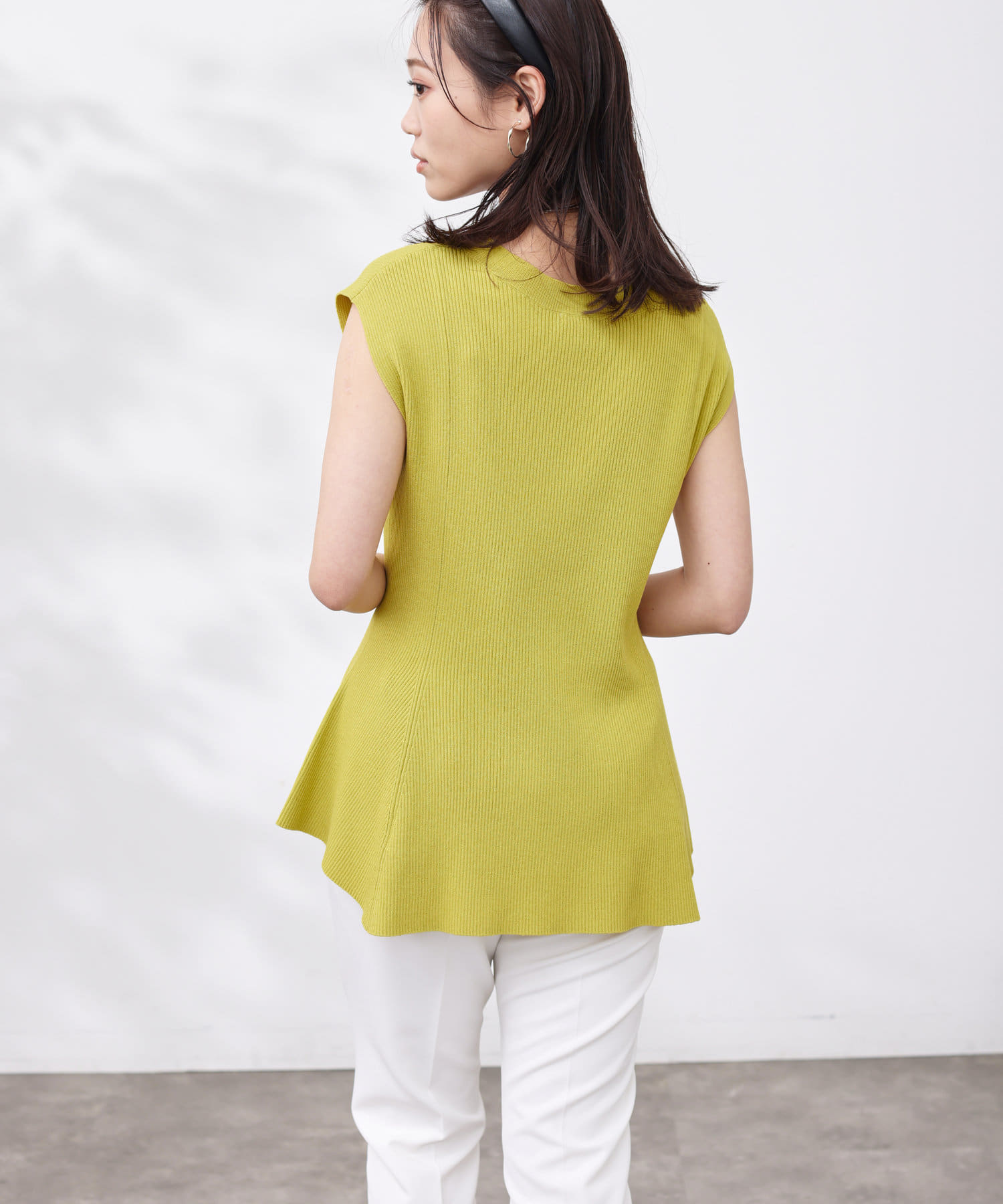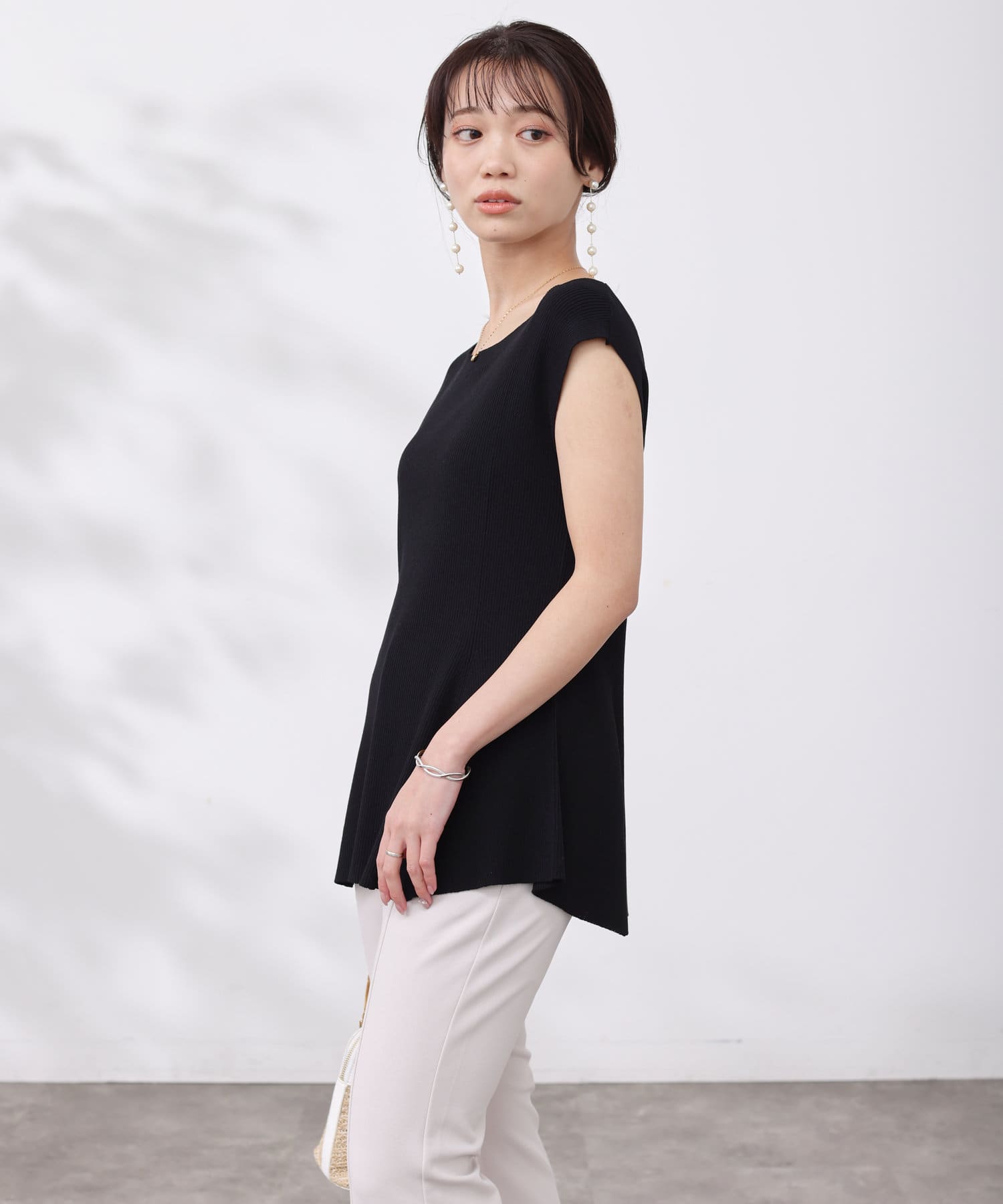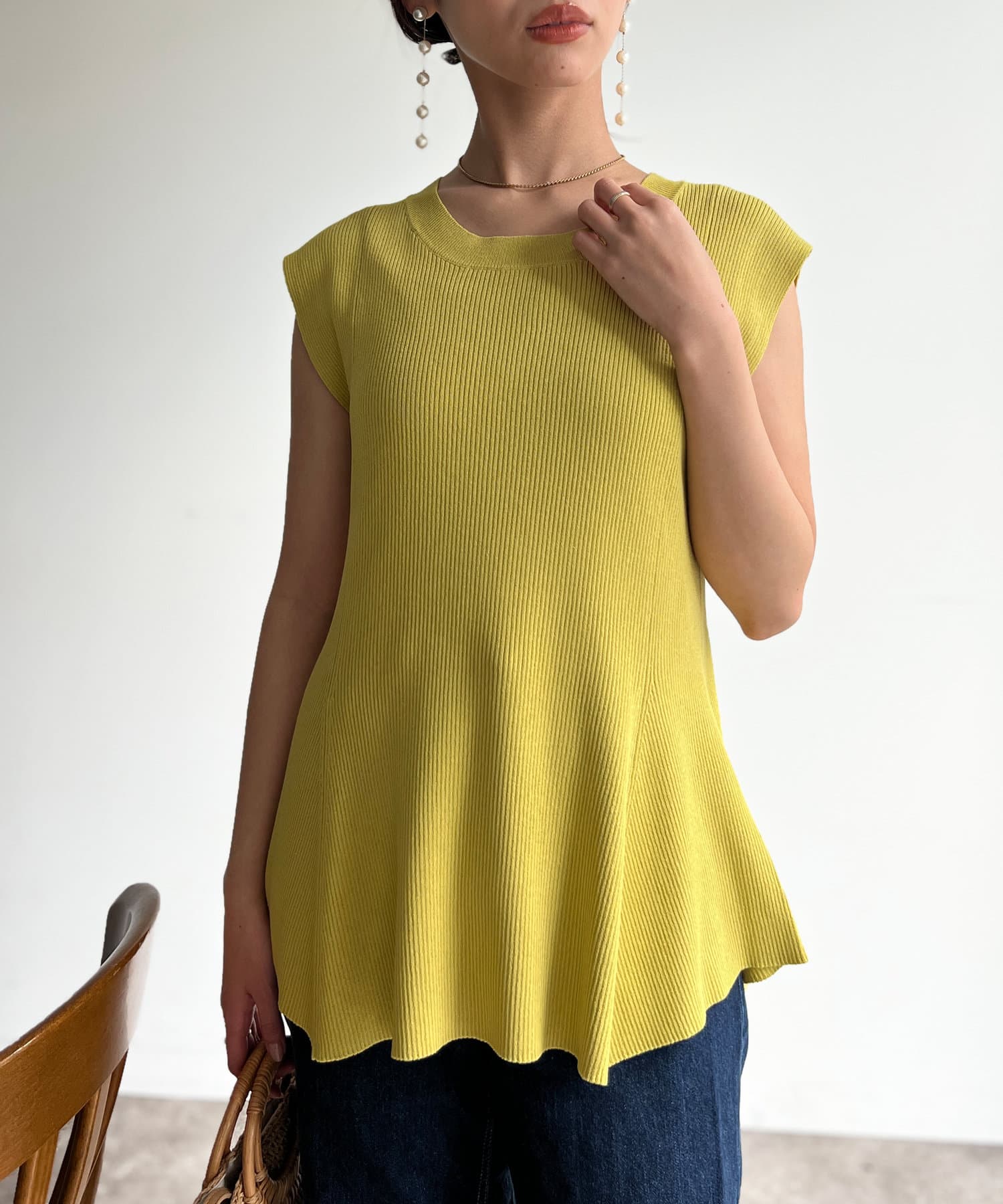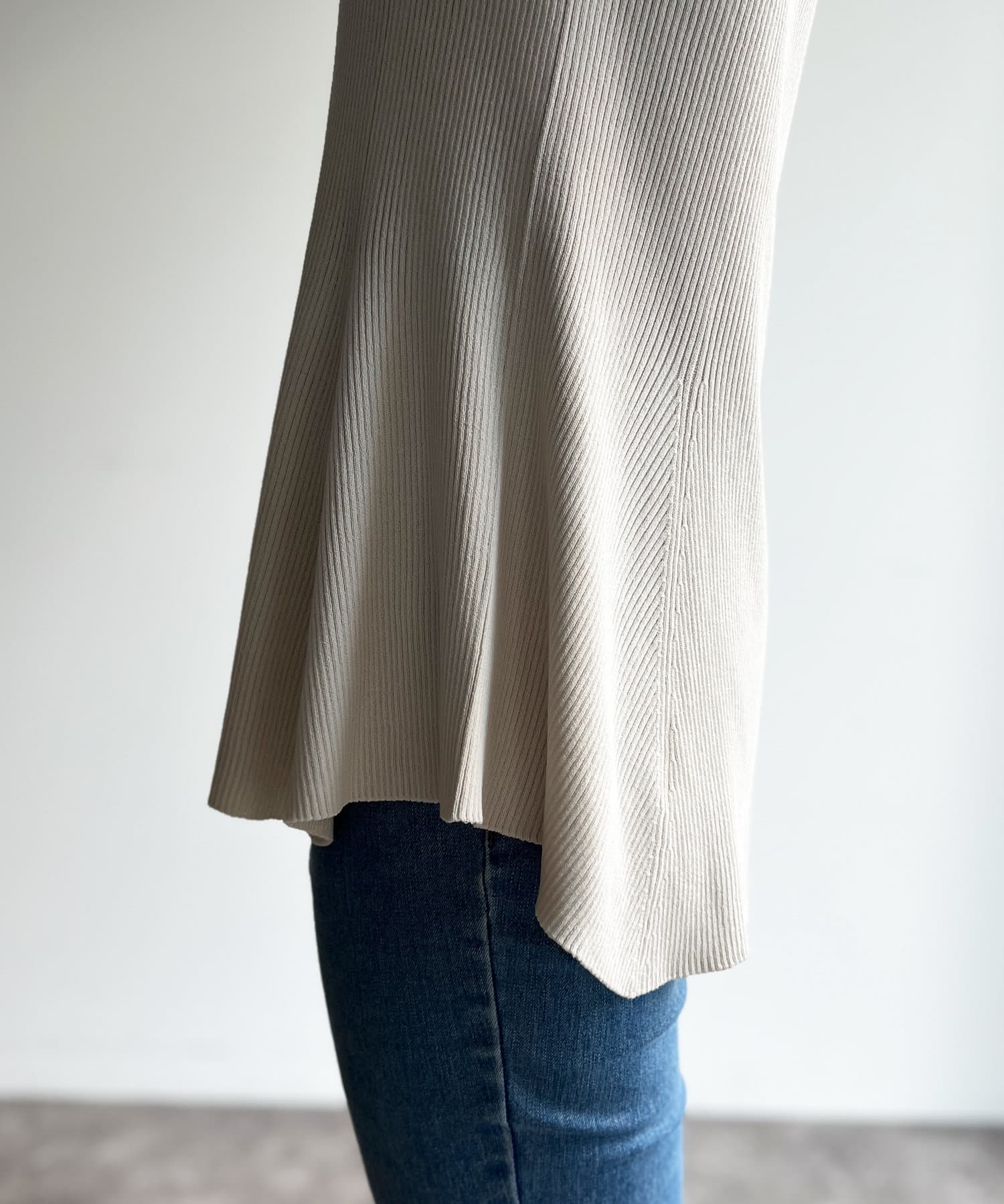 すっきりと見せてくれるリブの編立で、メリハリの着こなしに。