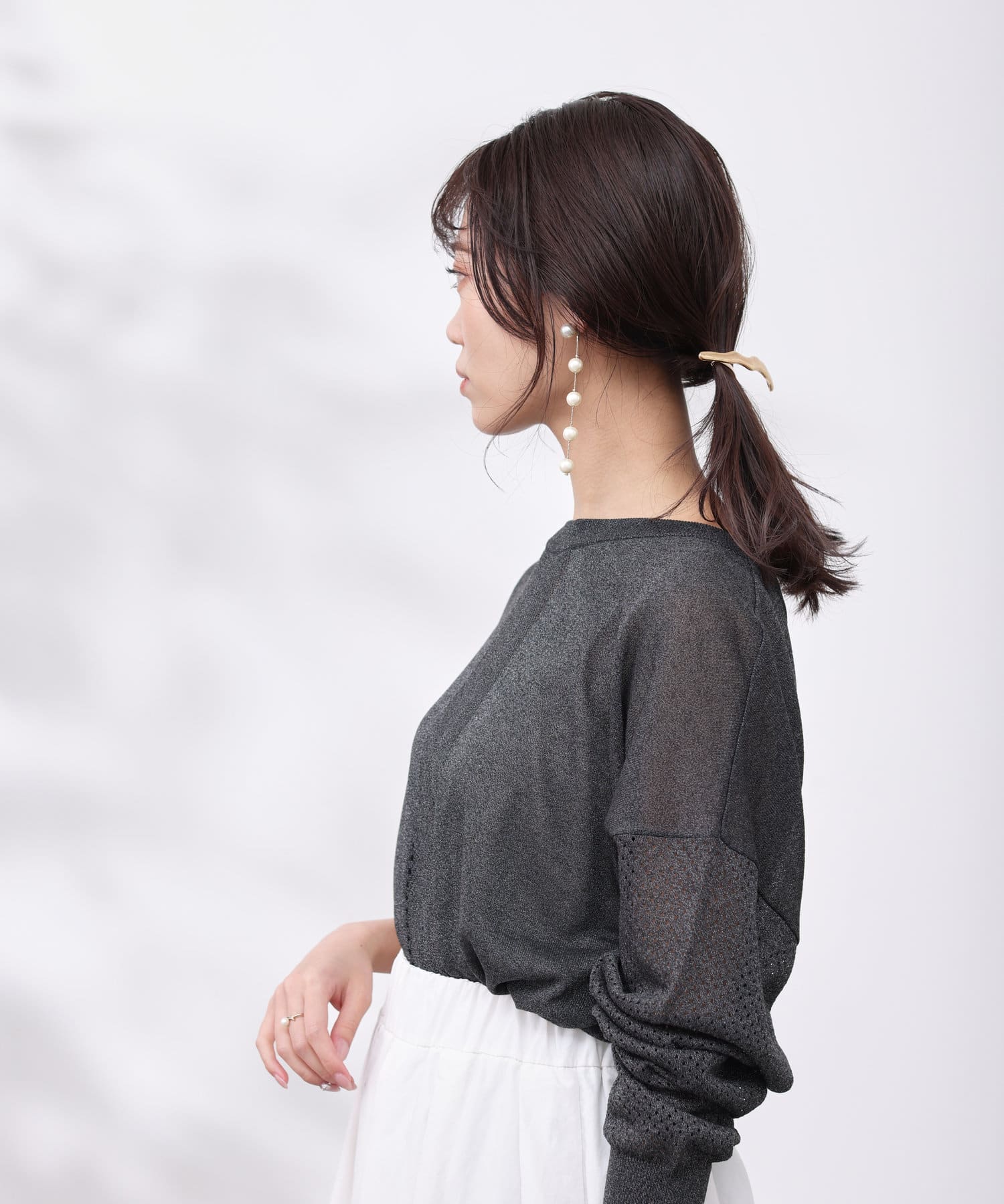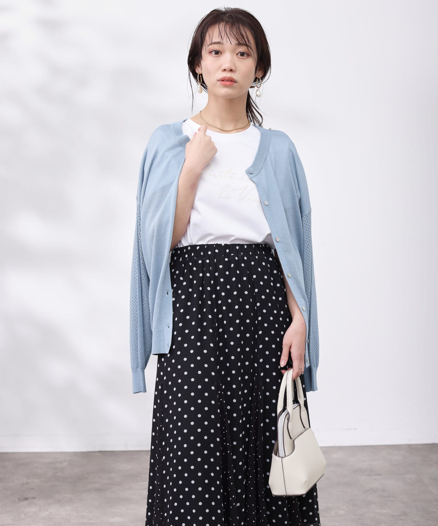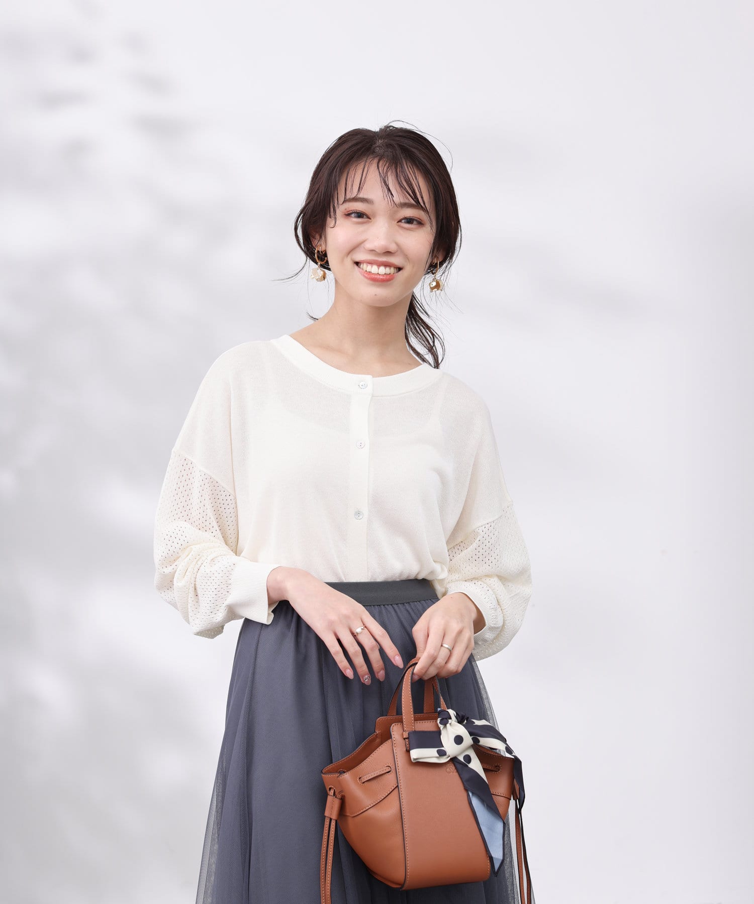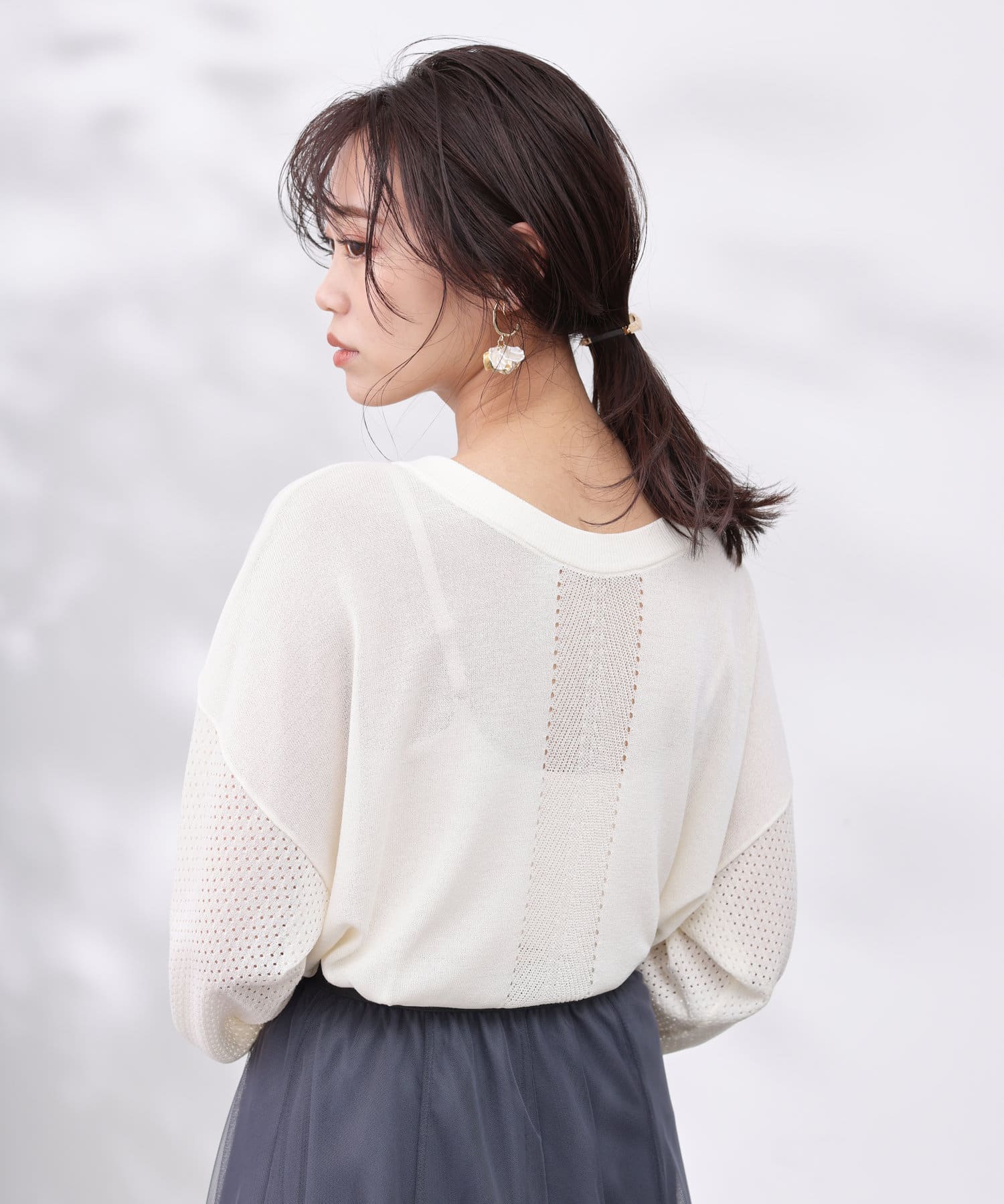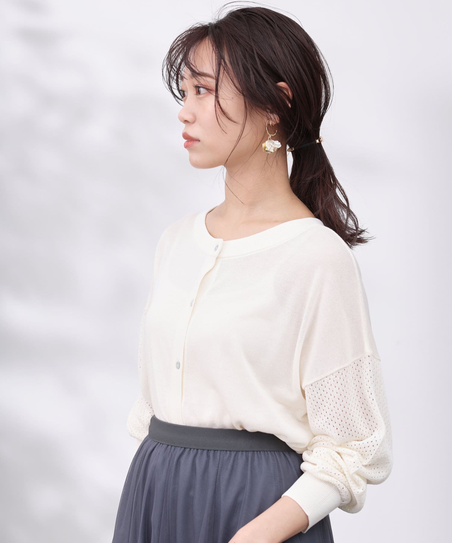 袖のアイレットデザインがポイントの薄手カーディガン。