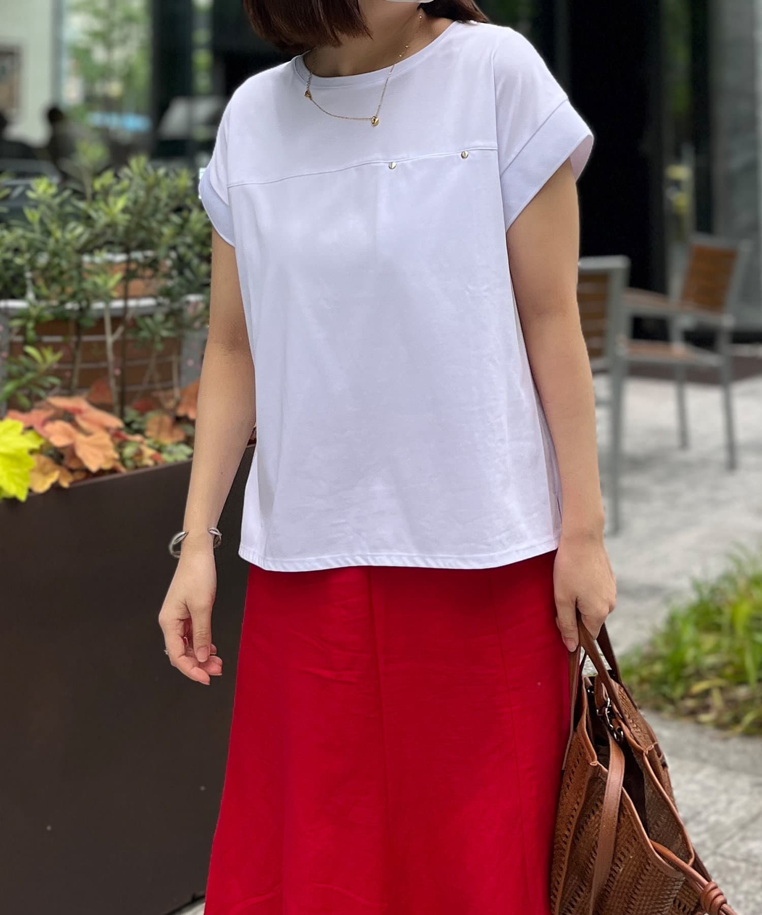 光沢のある素材でゴールドのスタッズが高級感を醸し出しているので、Tシャツでありながらオフィスでもカジュアルにならず着れます。ぽってりの体型ですがお肉を拾わず形よいです。