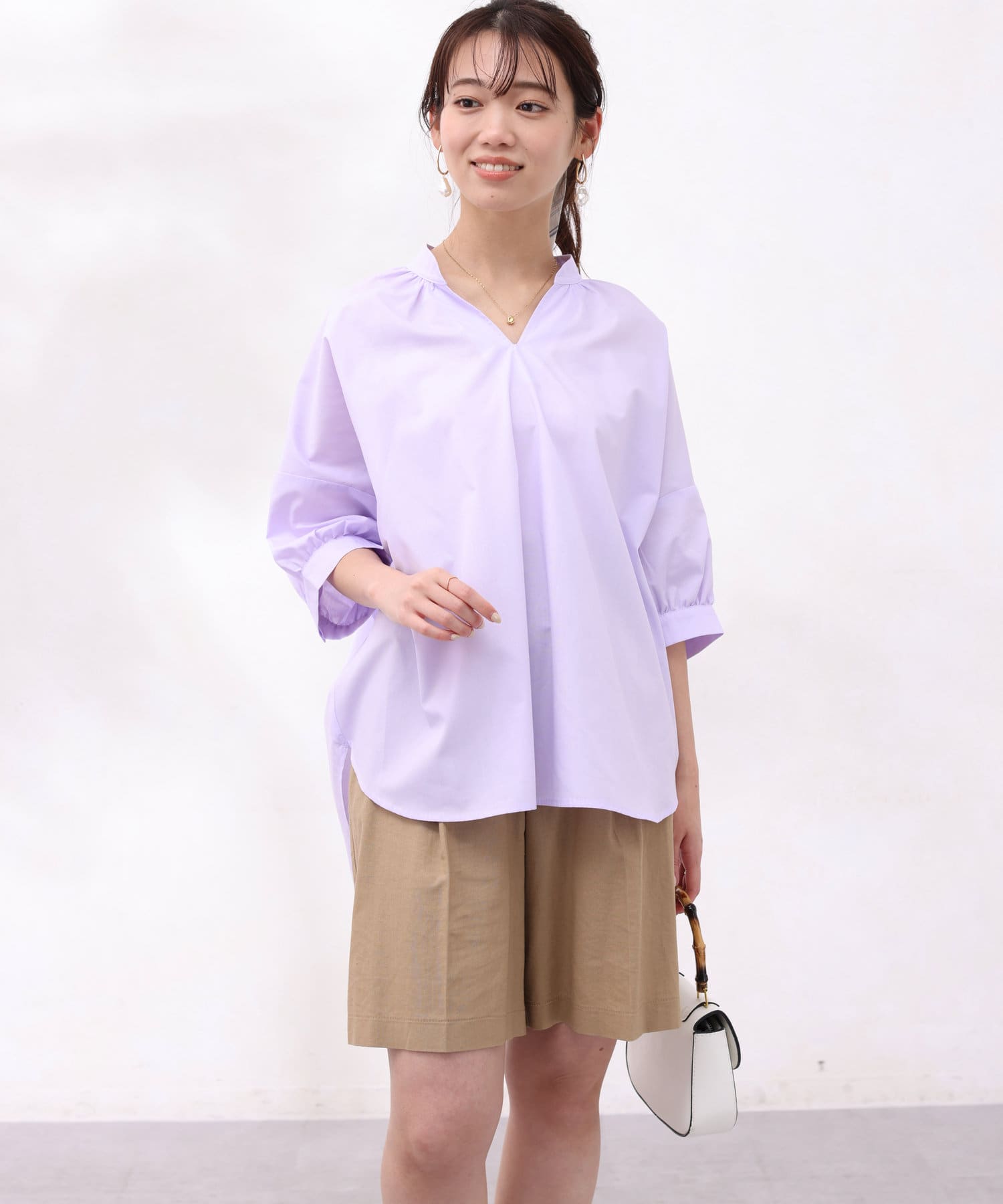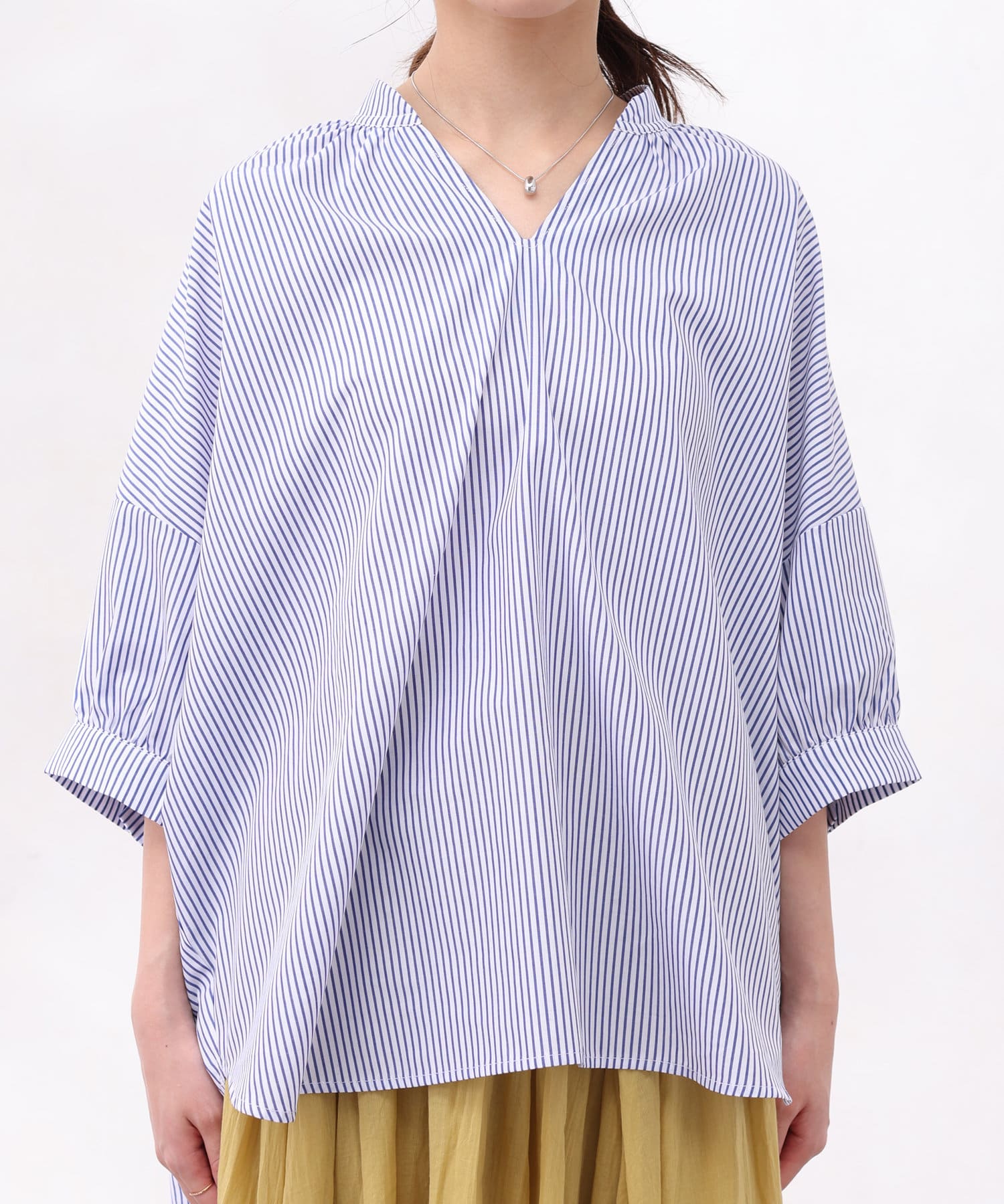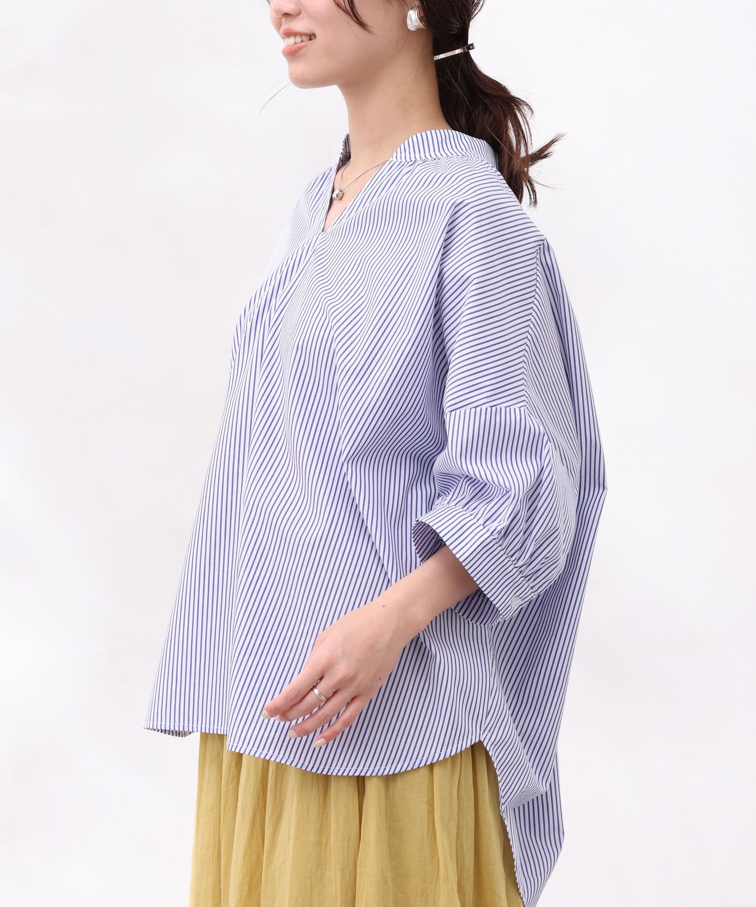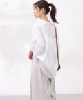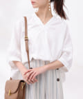 着丈に前後差をつけ、着用時に衿が抜けた感じで着られるので鎖骨回りをきれいに見せてくれ、女性らしい品のある雰囲気を出してくれます。