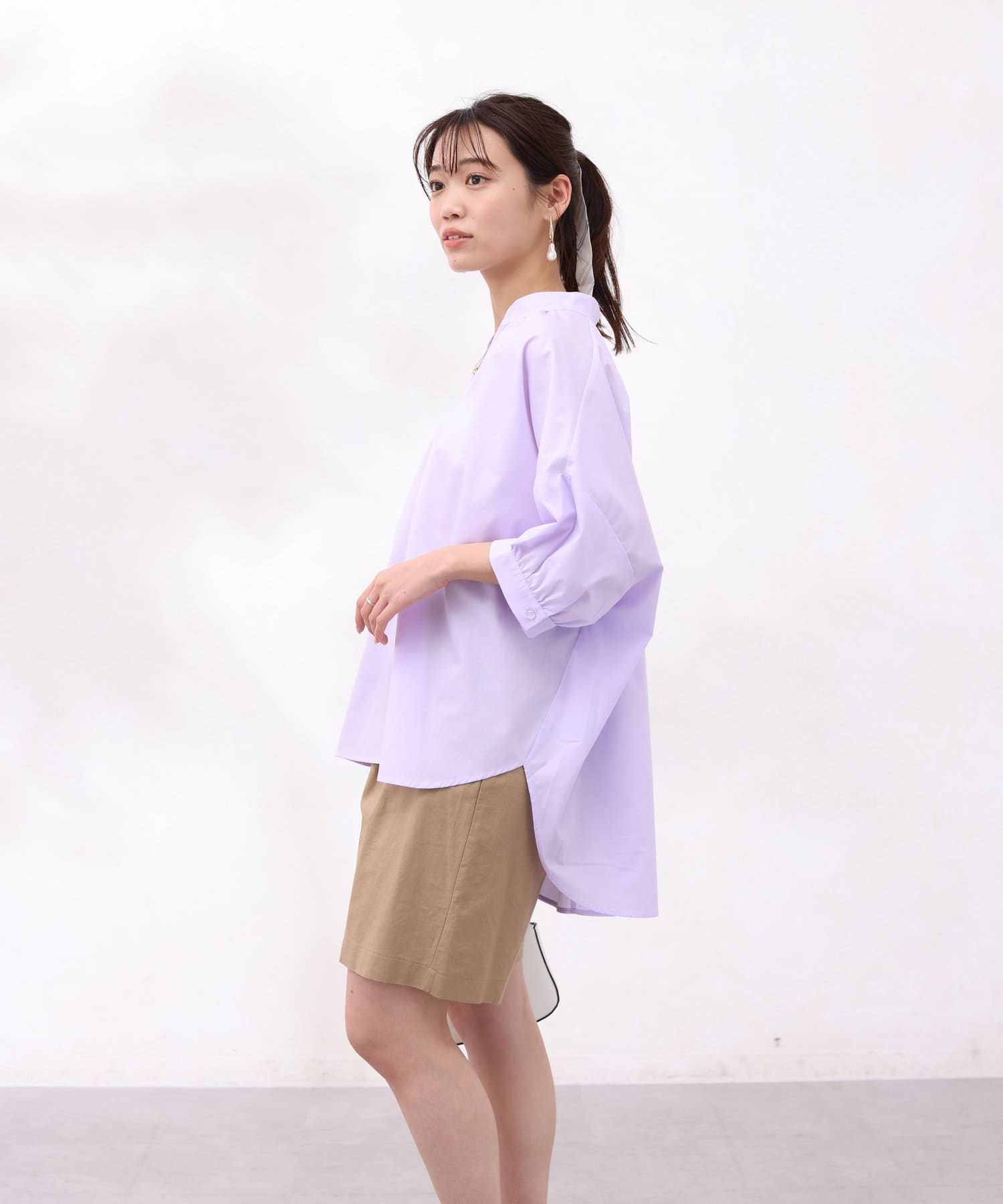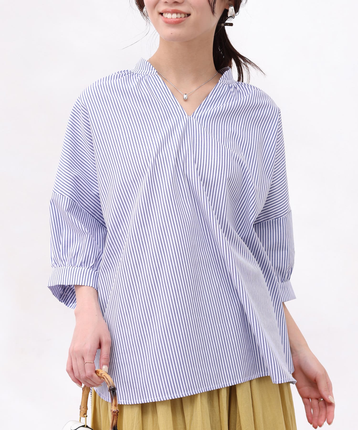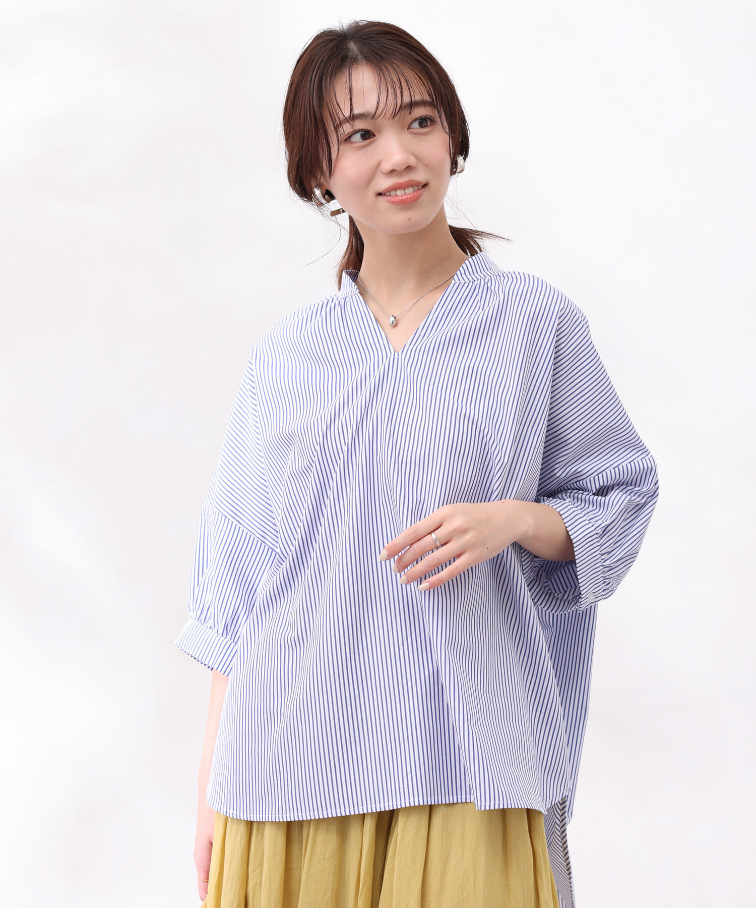 着丈に前後差をつけ、着用時に衿が抜けた感じで着られるので鎖骨回りをきれいに見せてくれ、女性らしい品のある雰囲気を出してくれます。