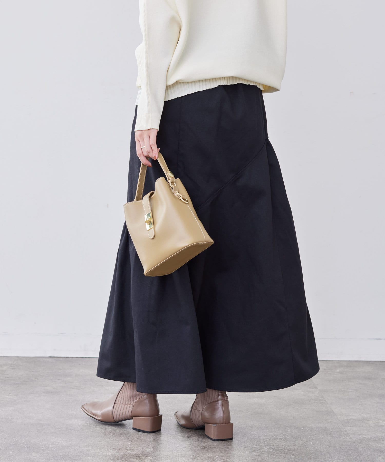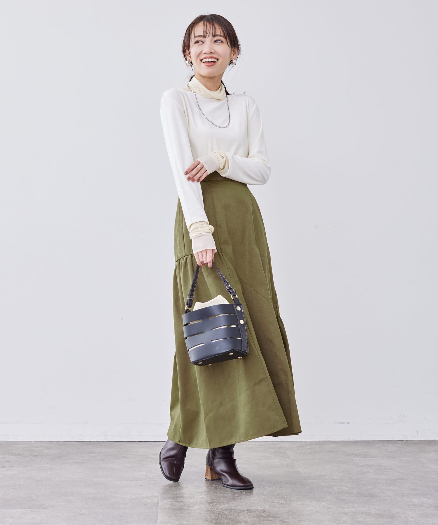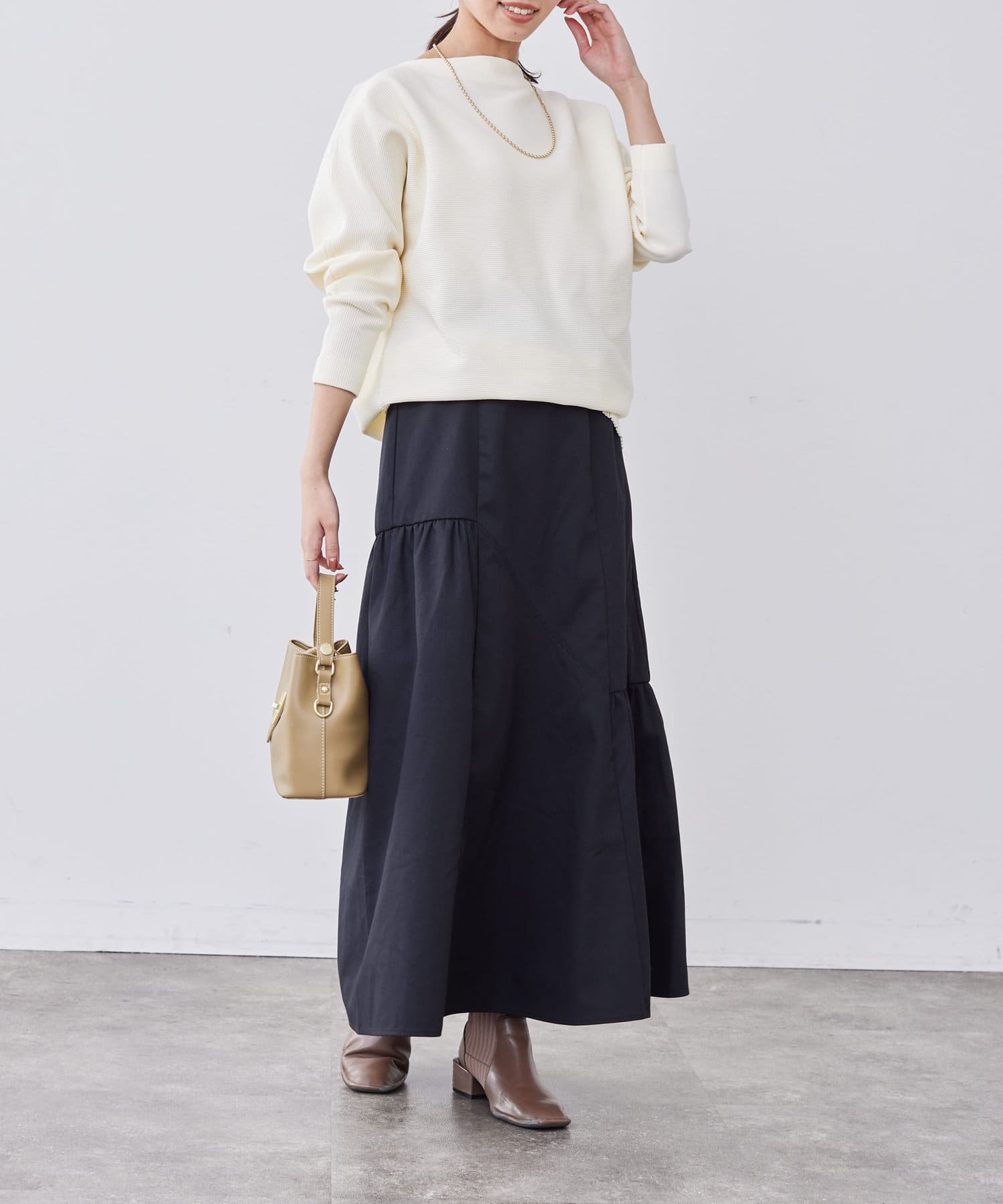 コンパクトなトップスやボリュームニットなど、どんなトップスともバランスよく合わせていただけます。