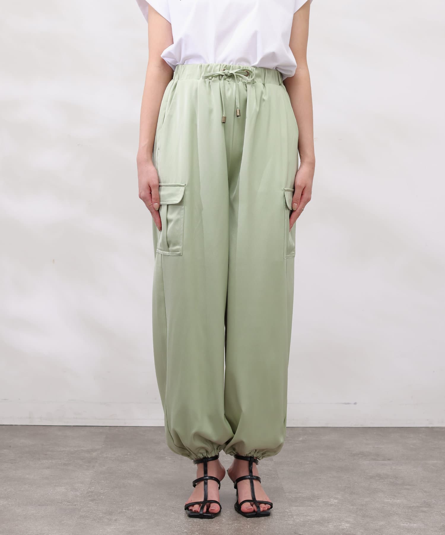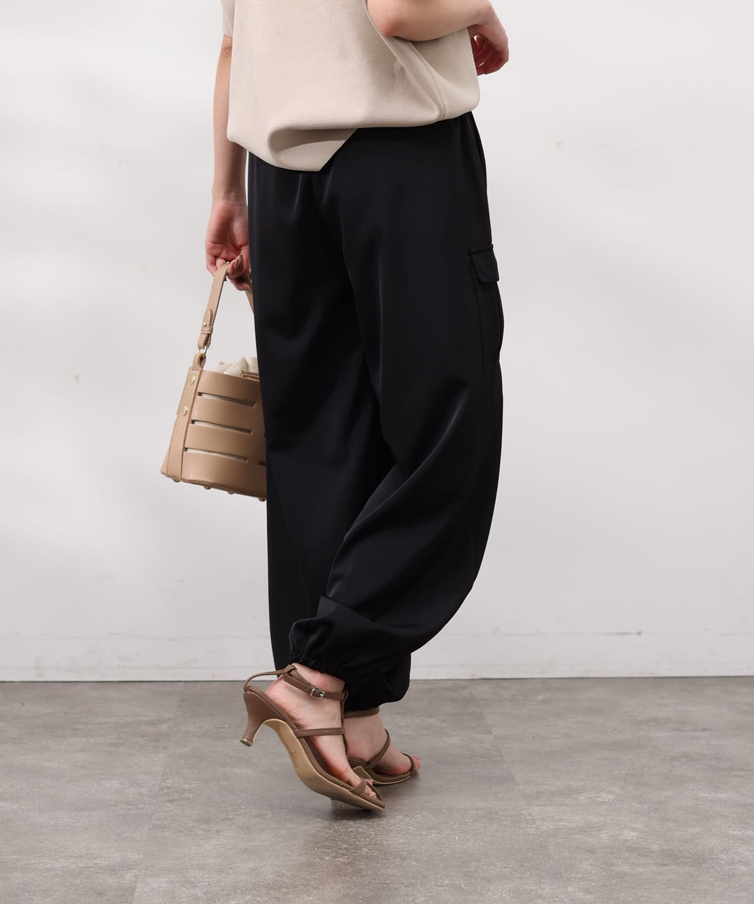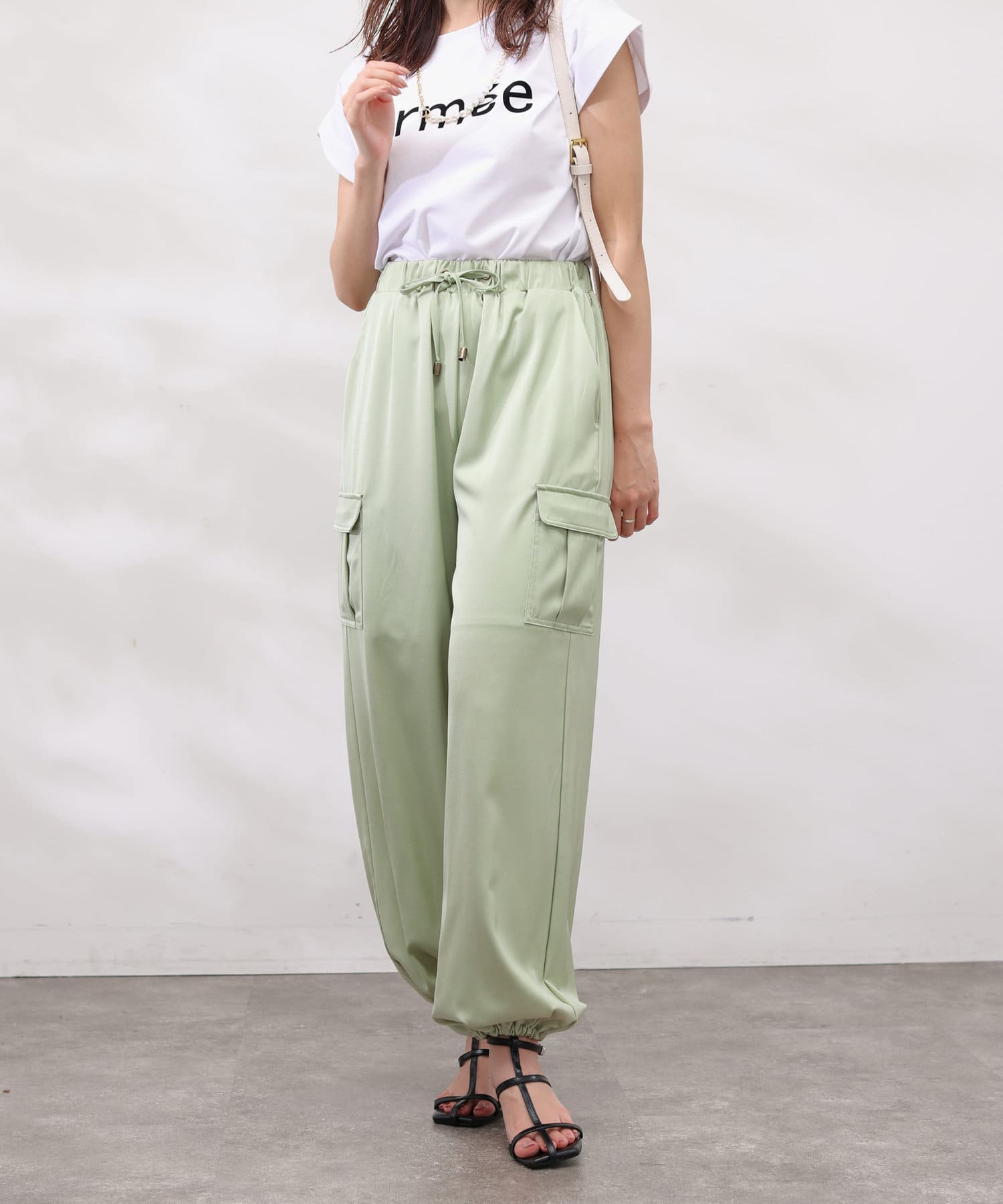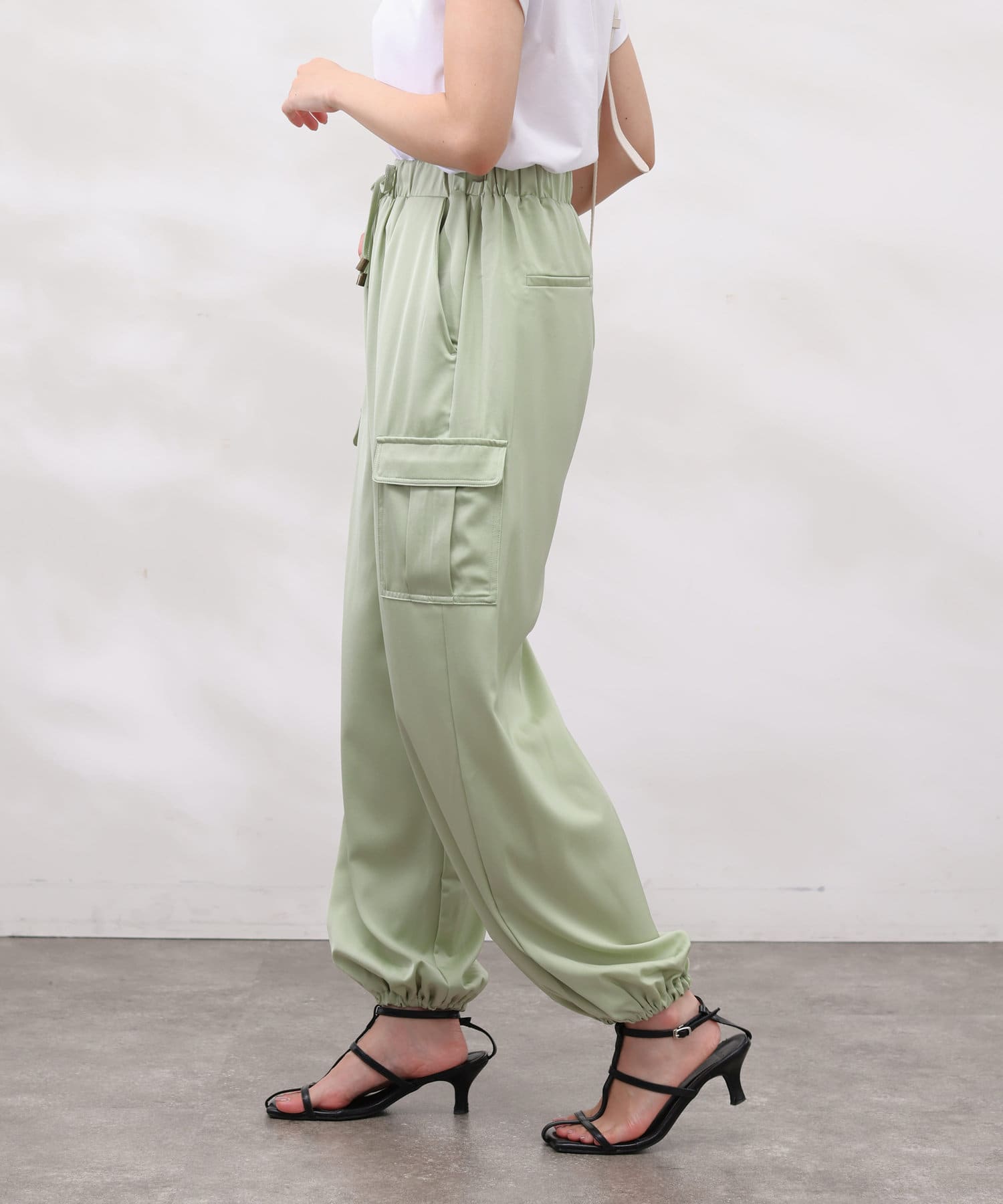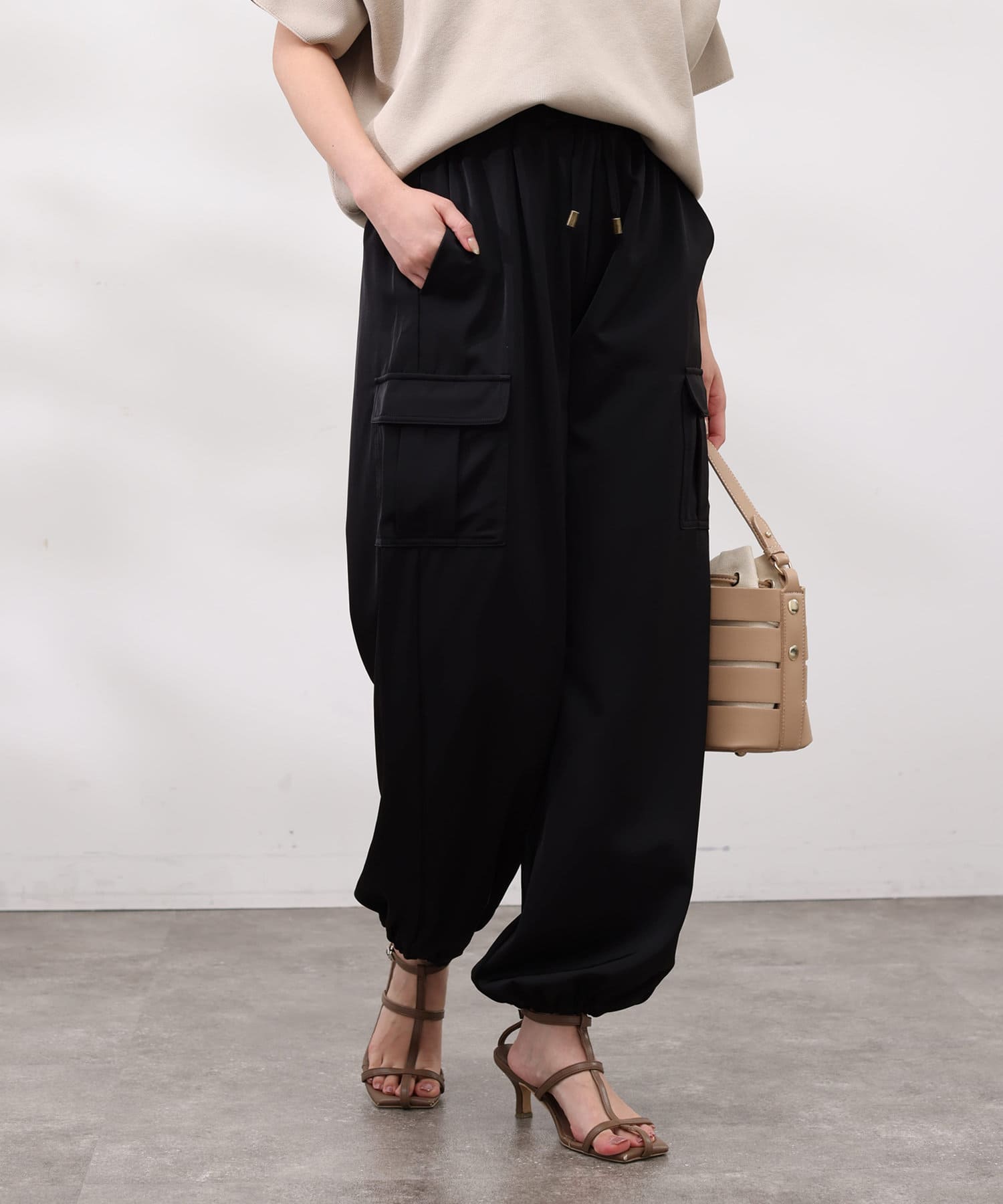 トレンドのカーゴパンツを光沢感のあるマットサテンで落ち着いた印象に。