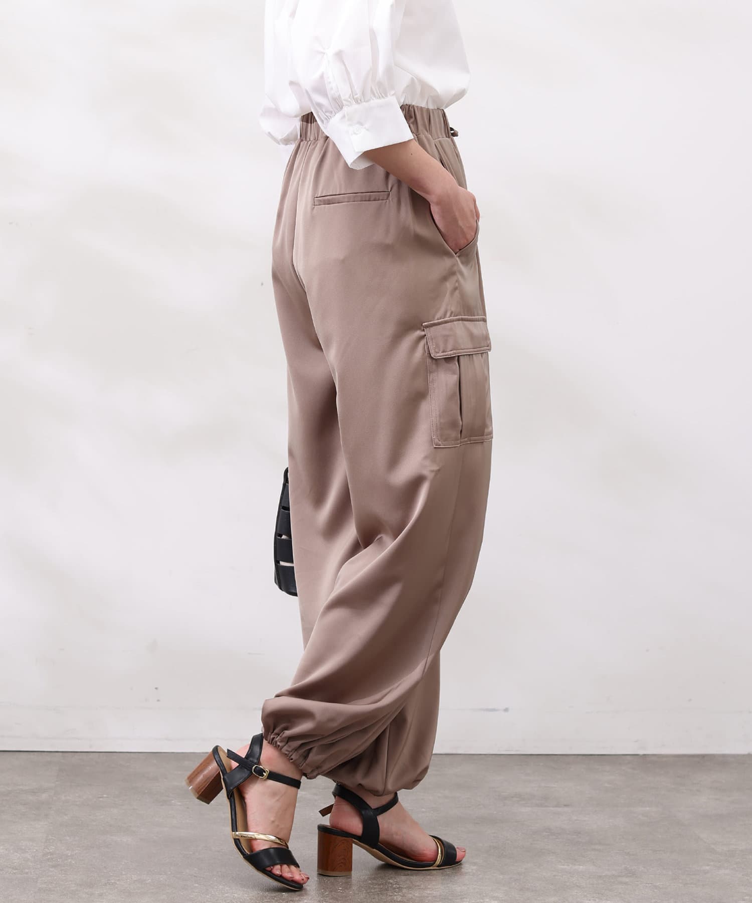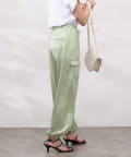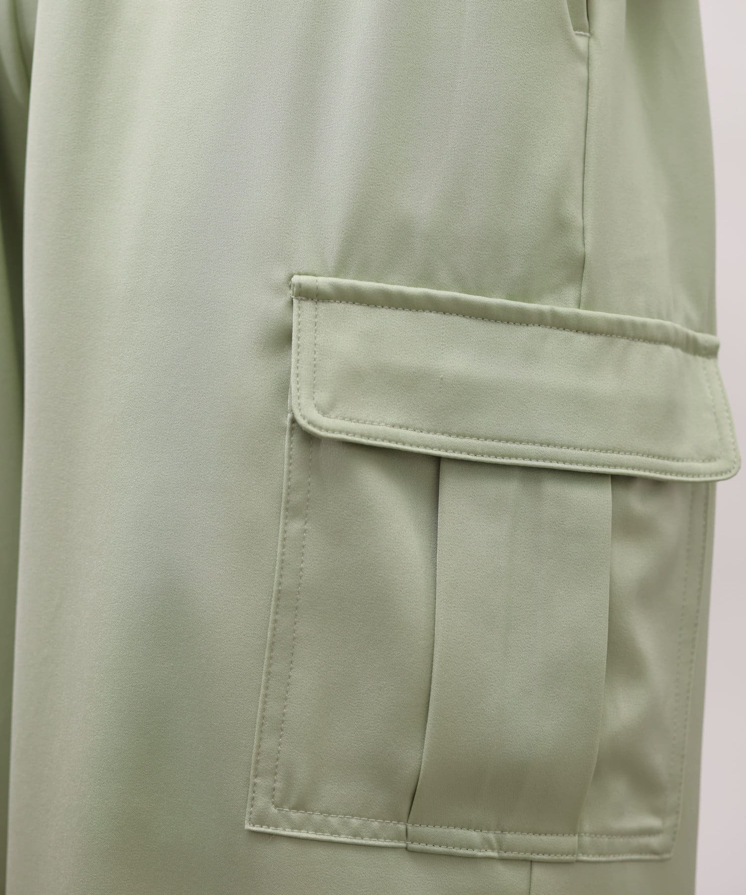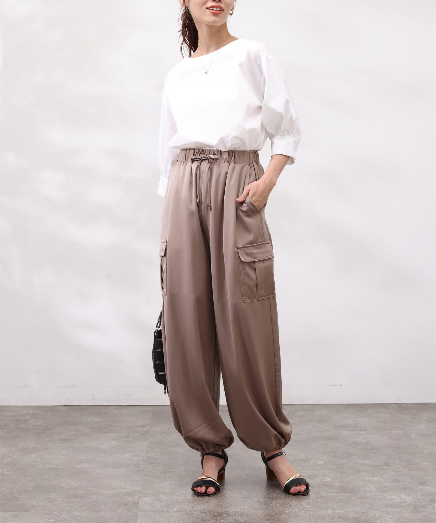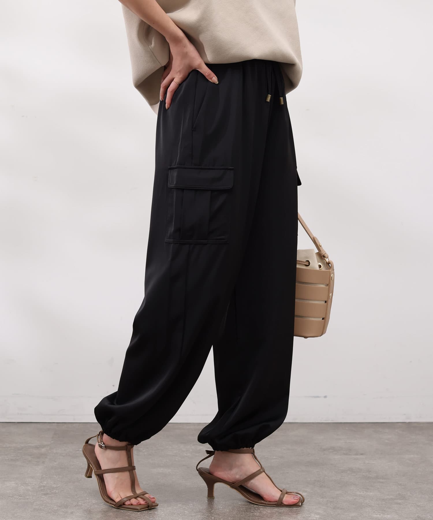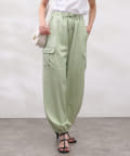 トレンドのカーゴパンツを光沢感のあるマットサテンで落ち着いた印象に。