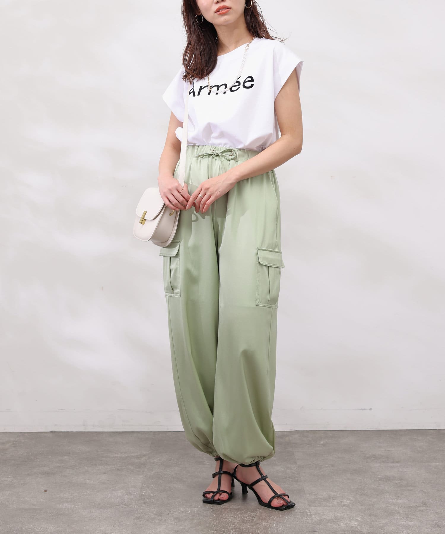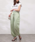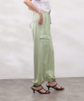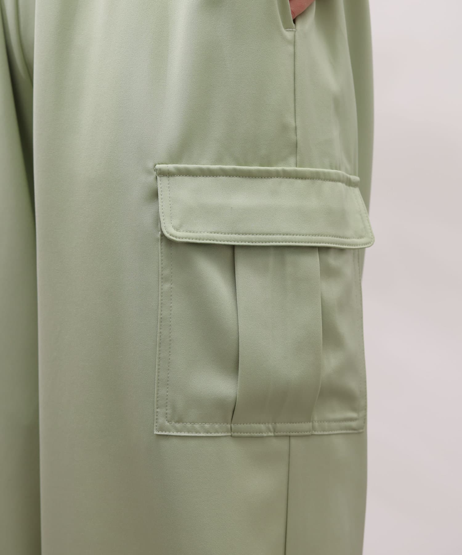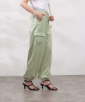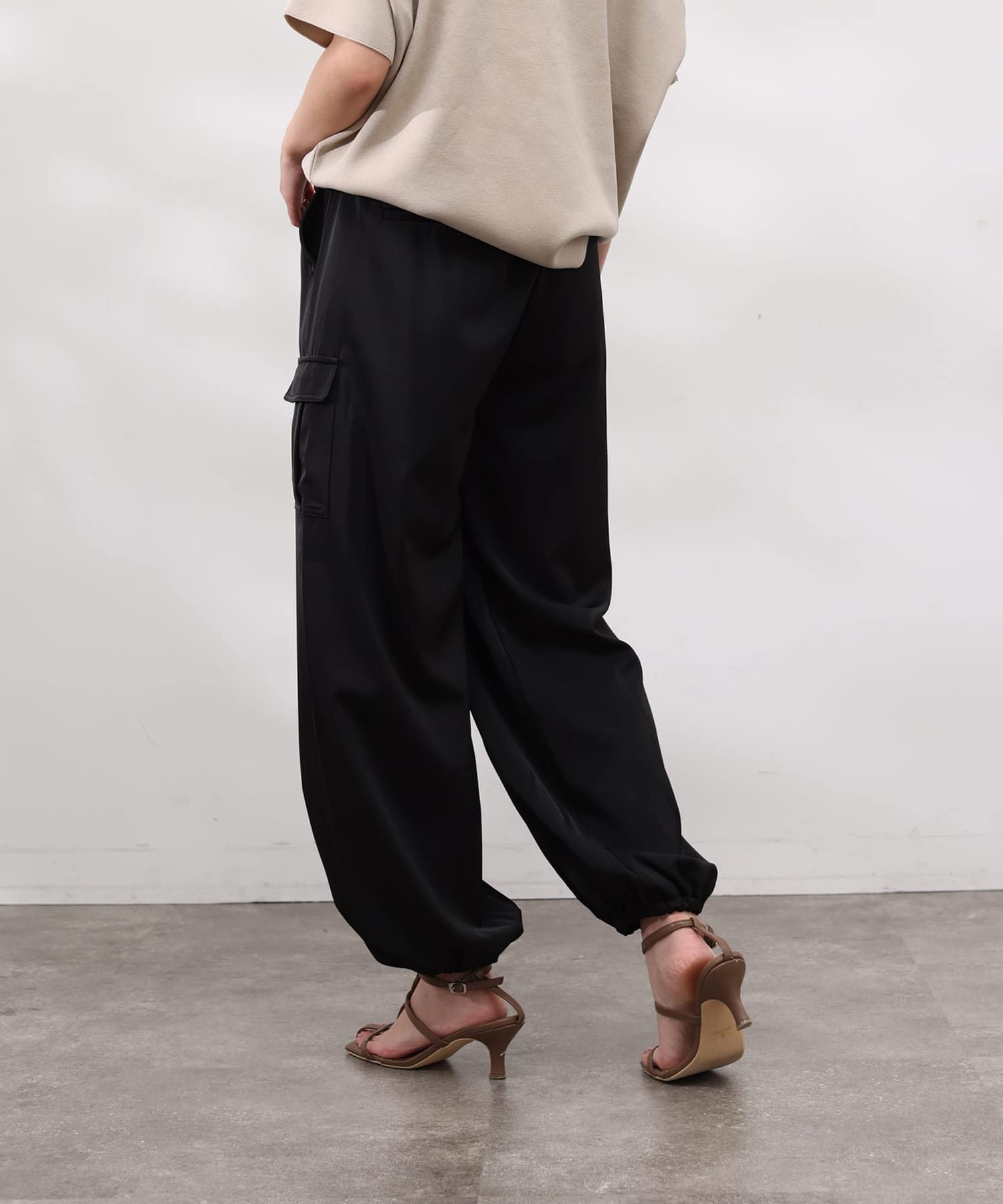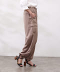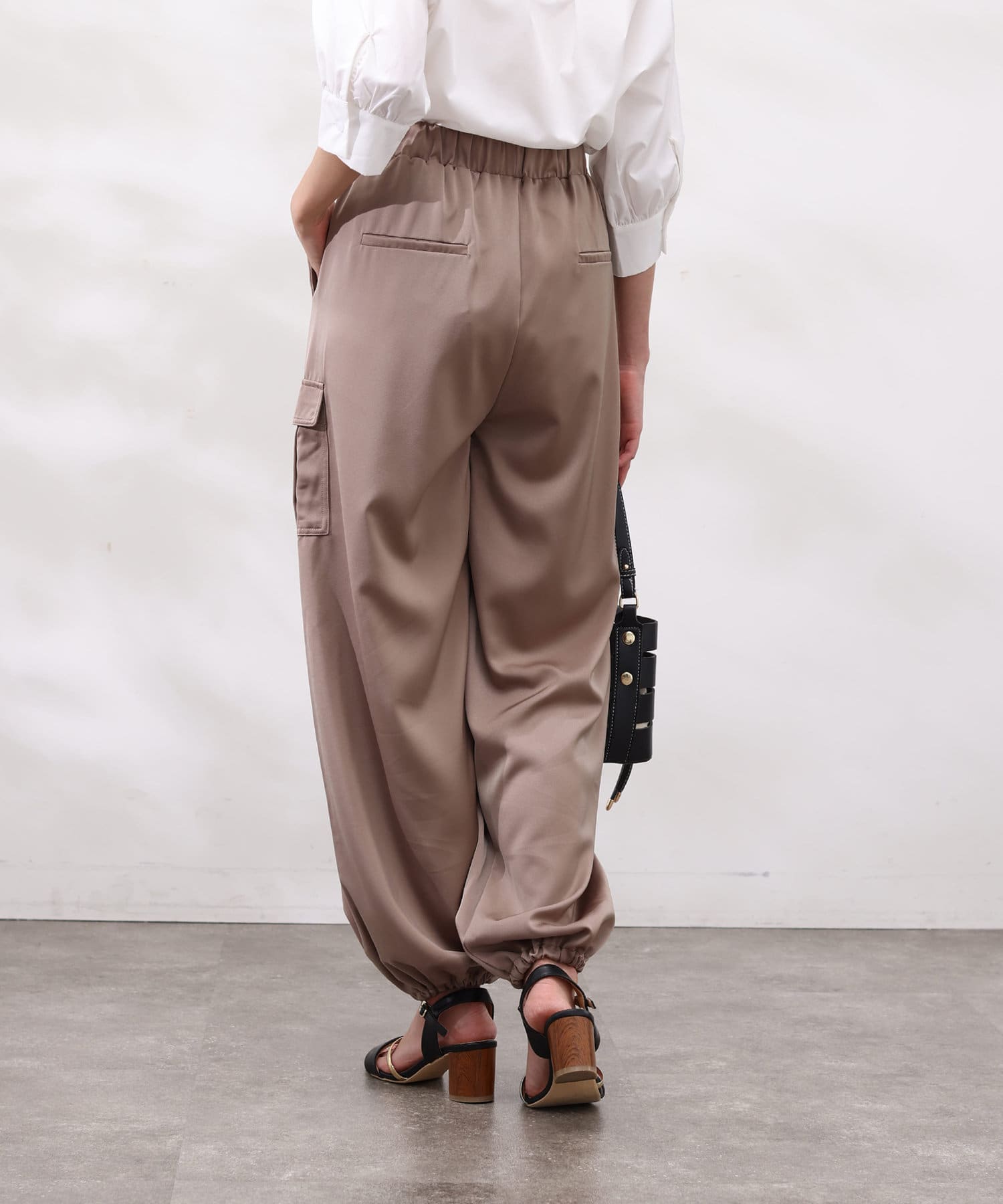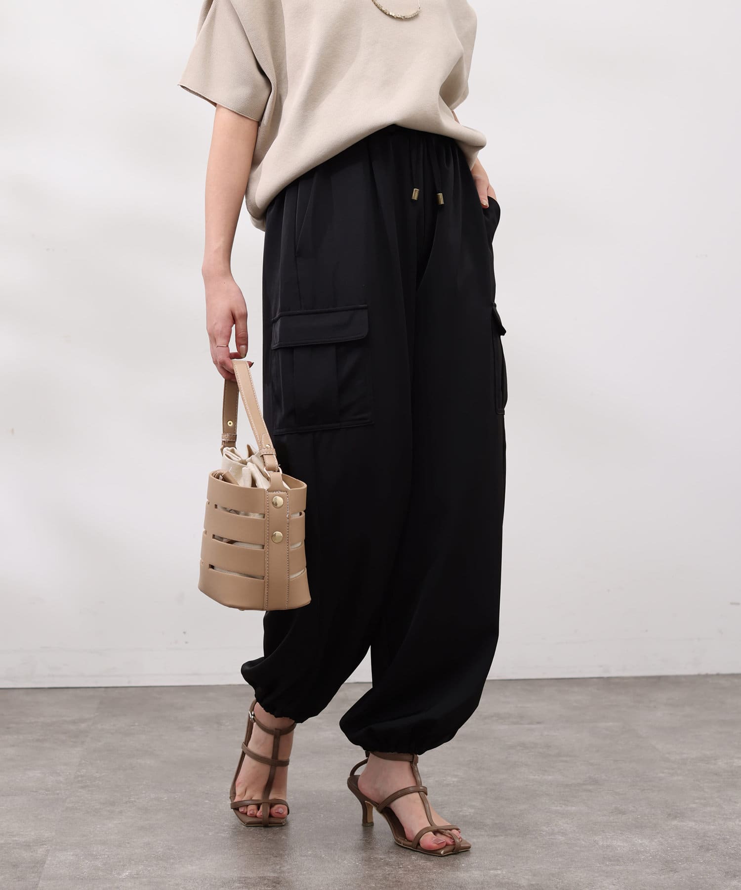 トレンドのカーゴパンツを光沢感のあるマットサテンで落ち着いた印象に。