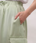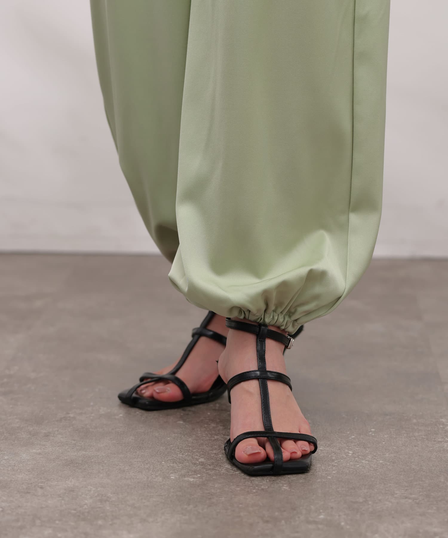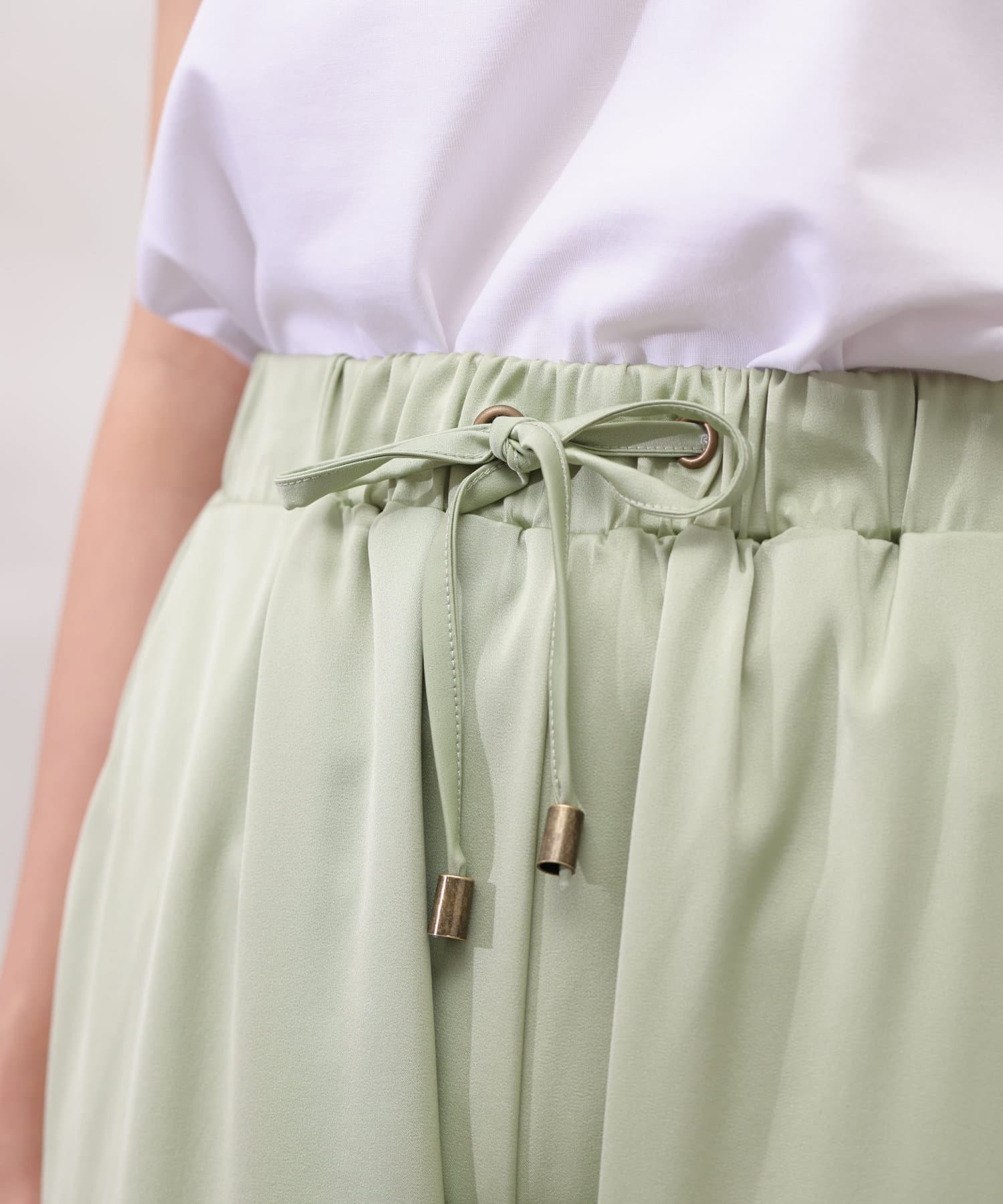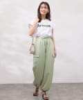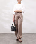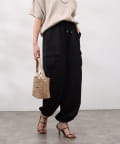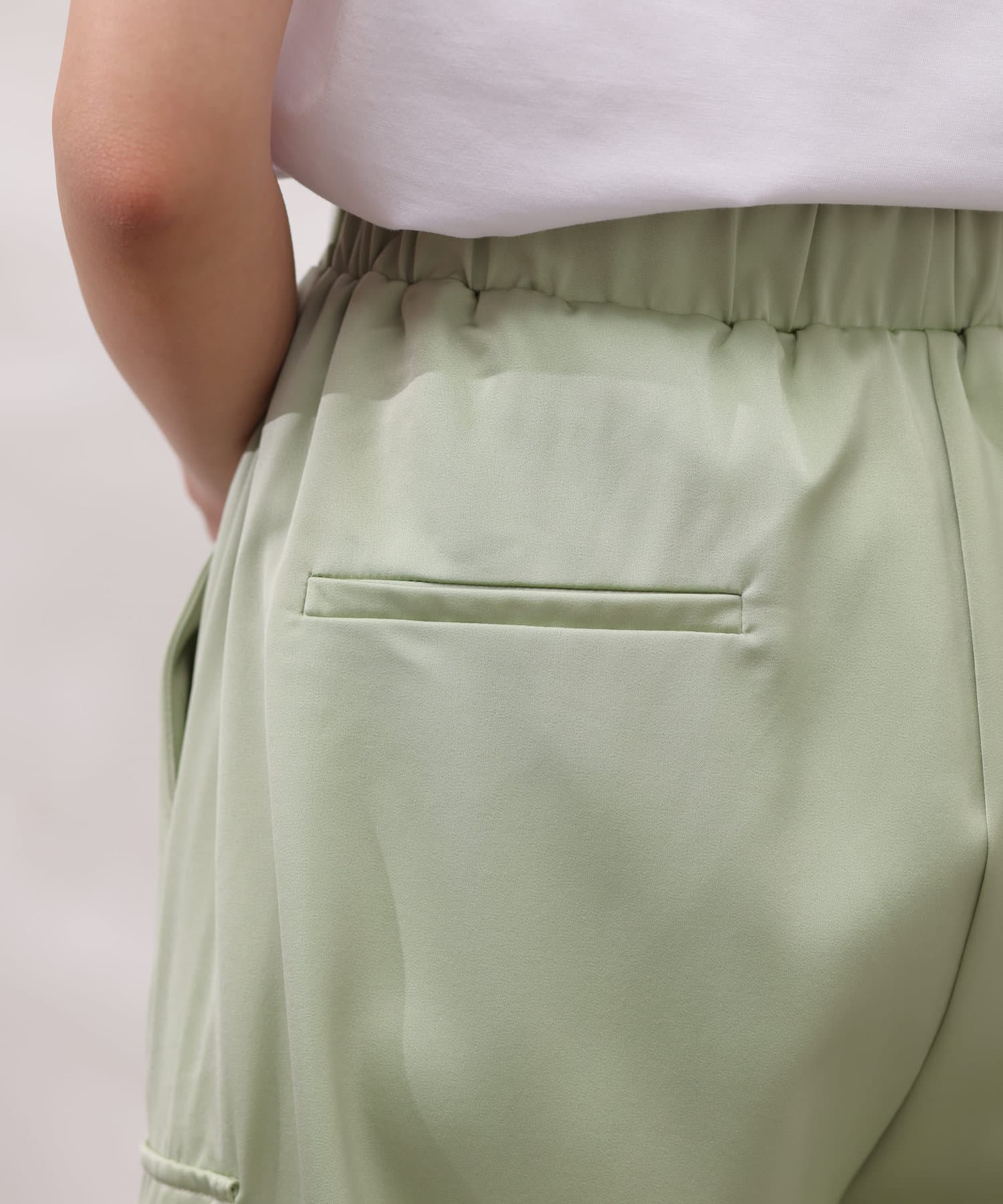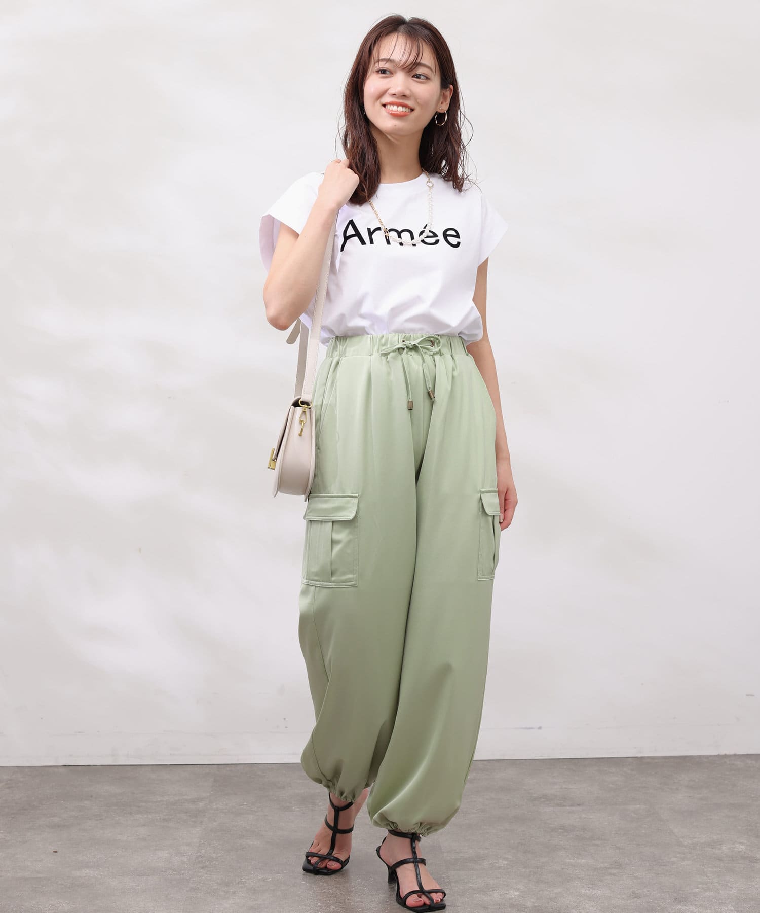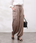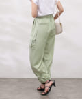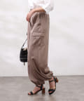 トレンドのカーゴパンツを光沢感のあるマットサテンで落ち着いた印象に。
