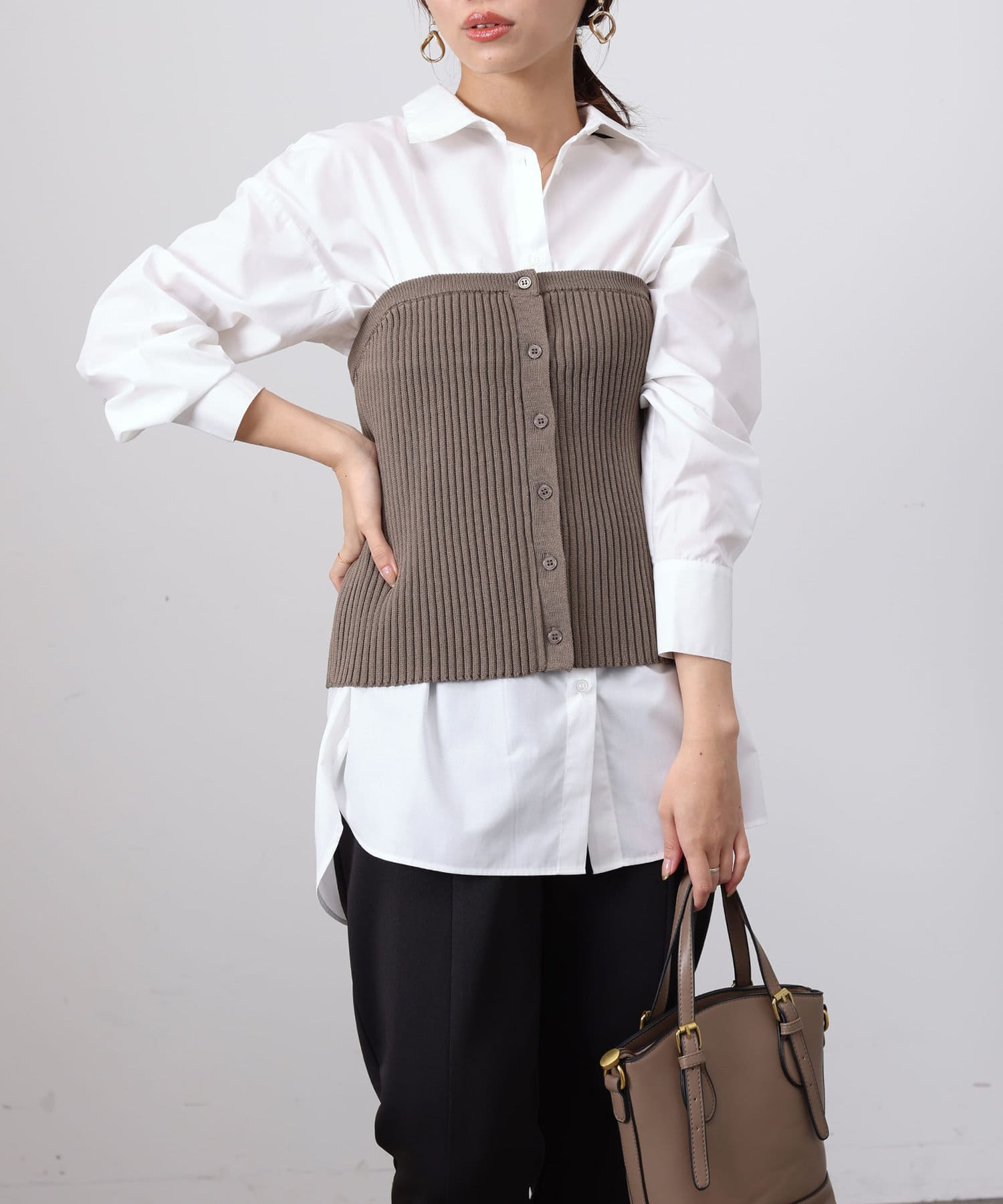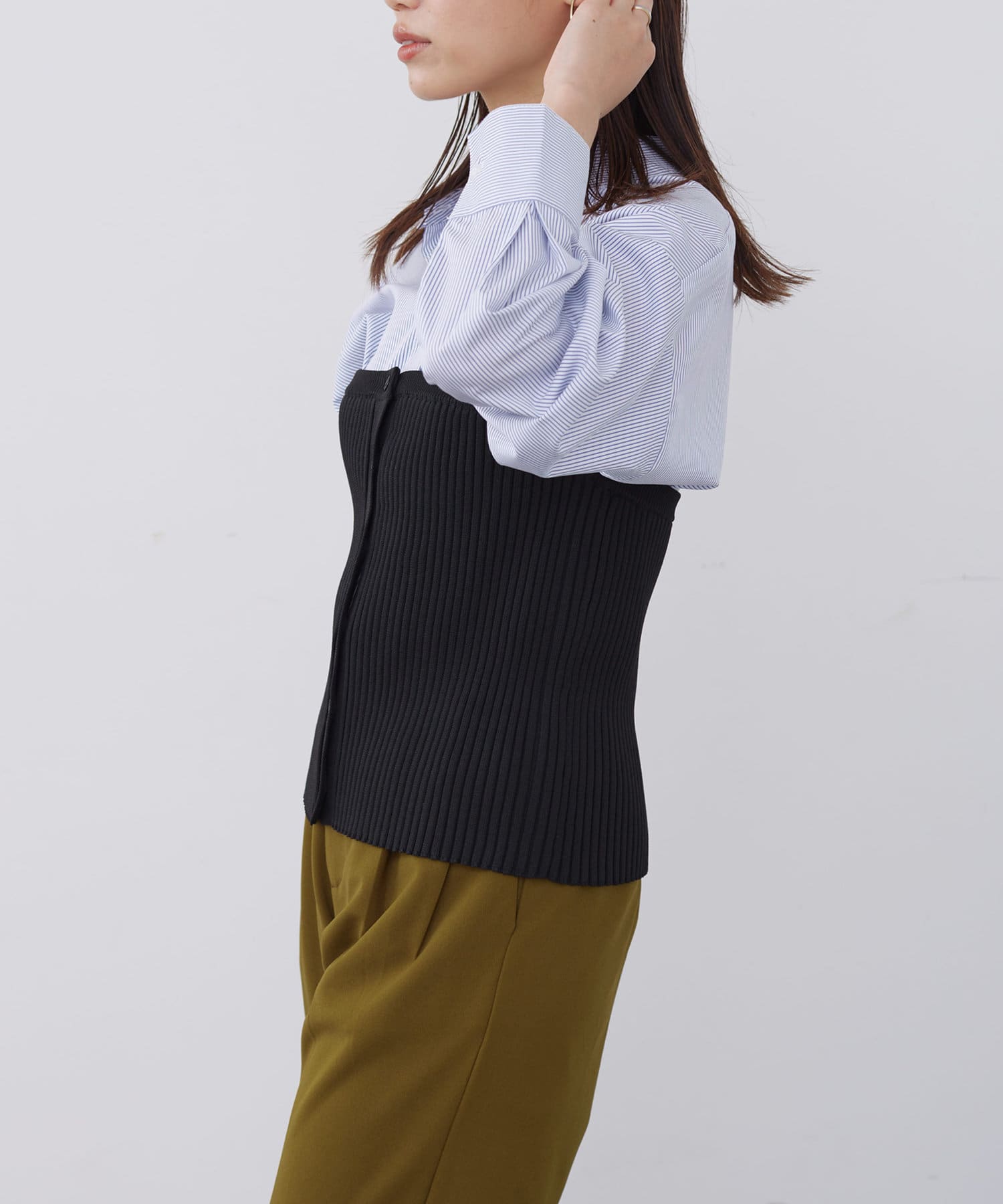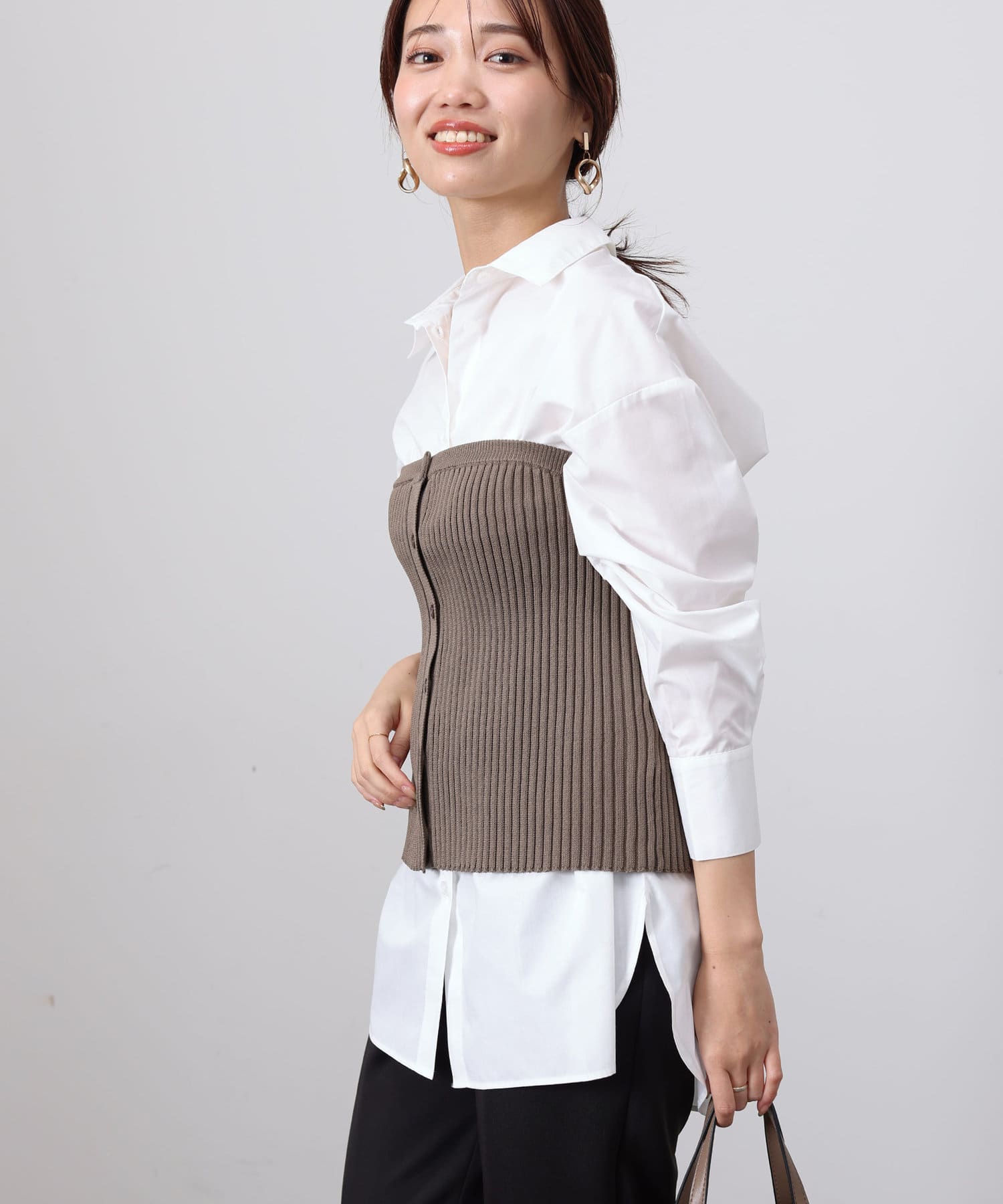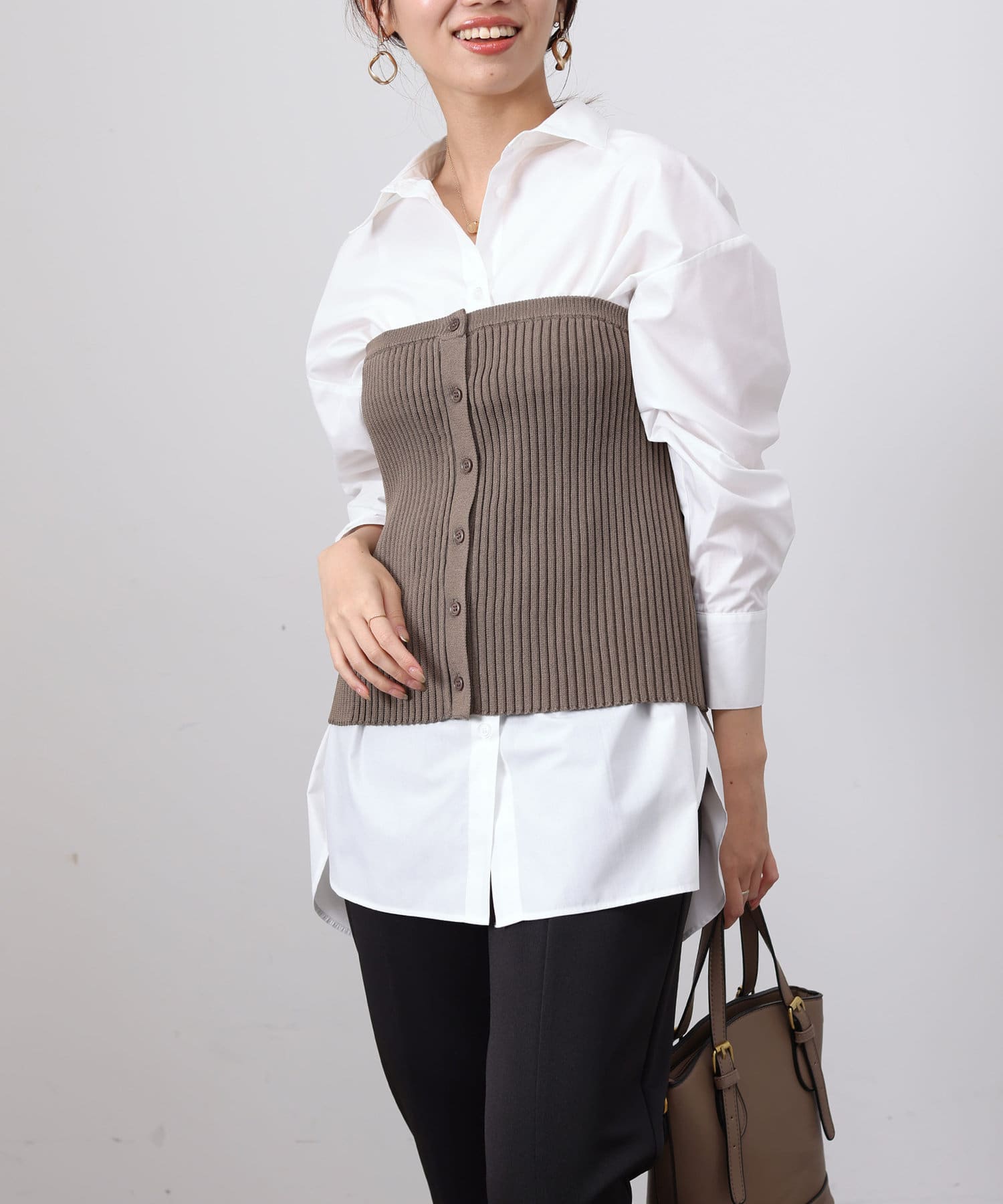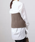 ベーシックなシャツにニットビスチシャツを合わせた