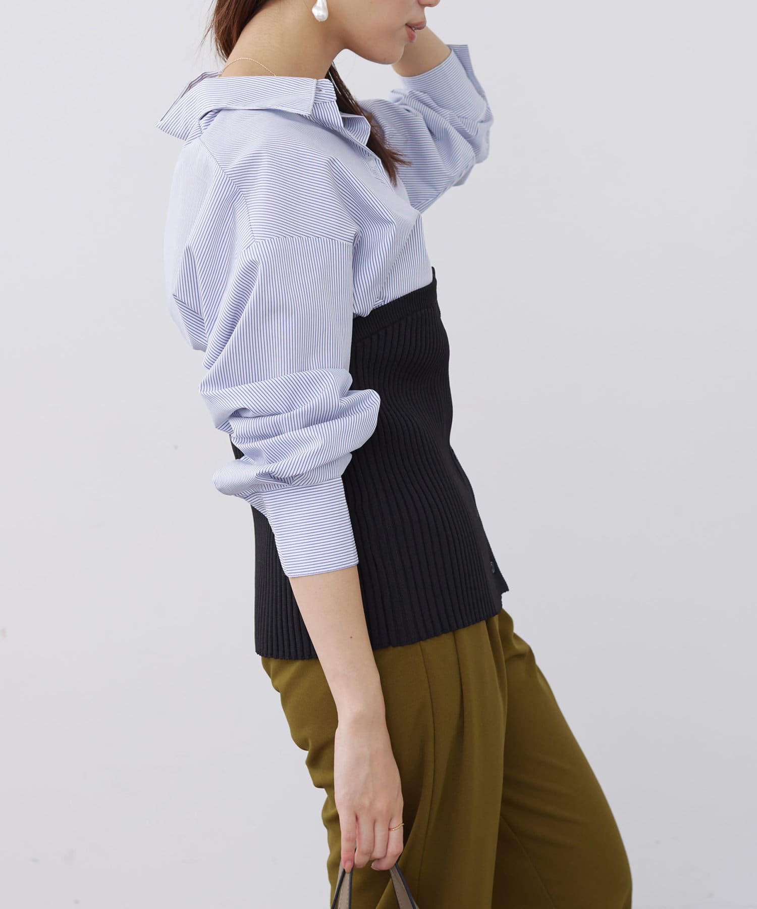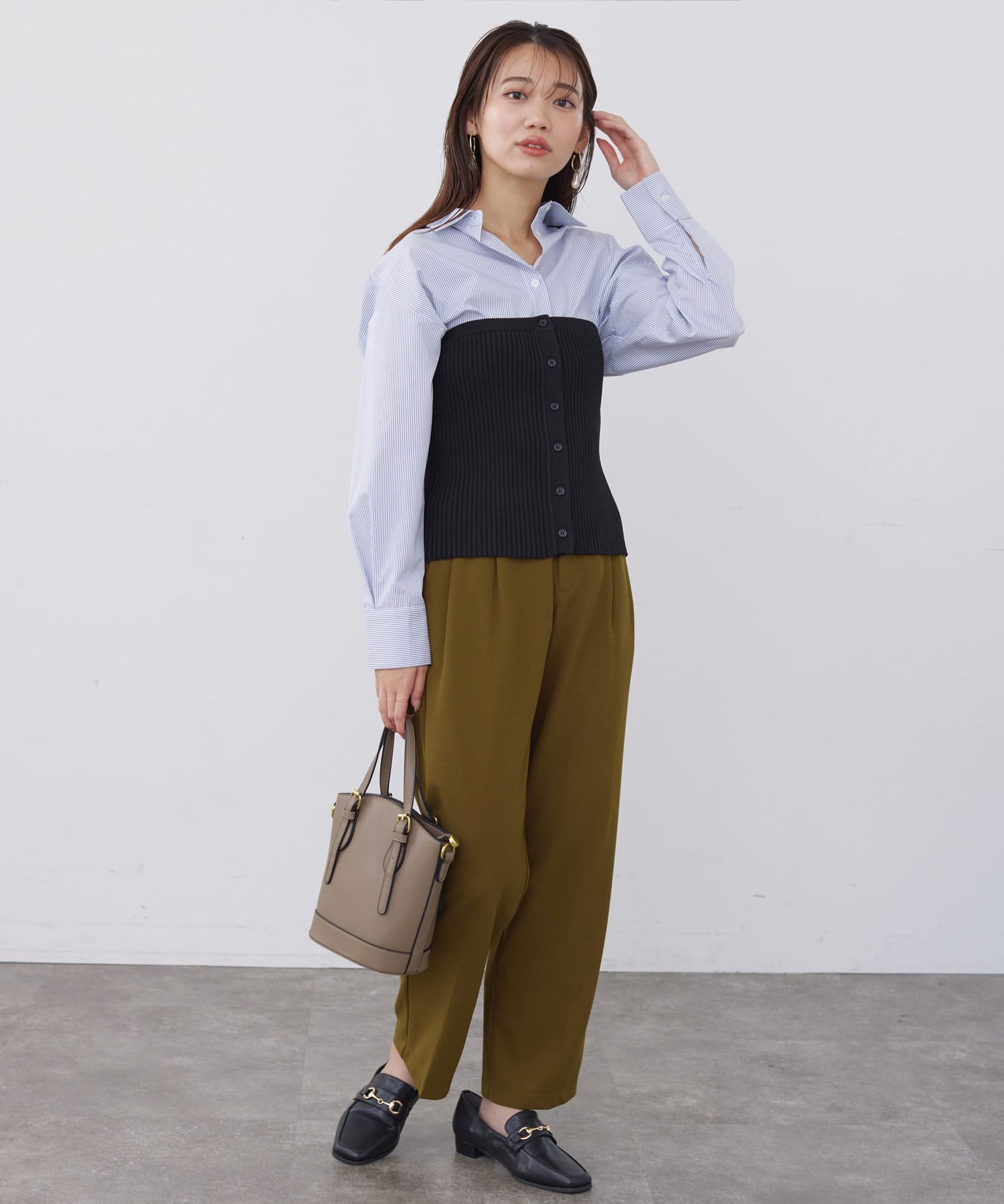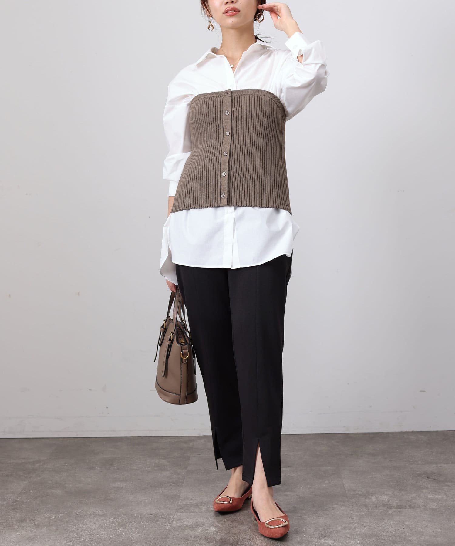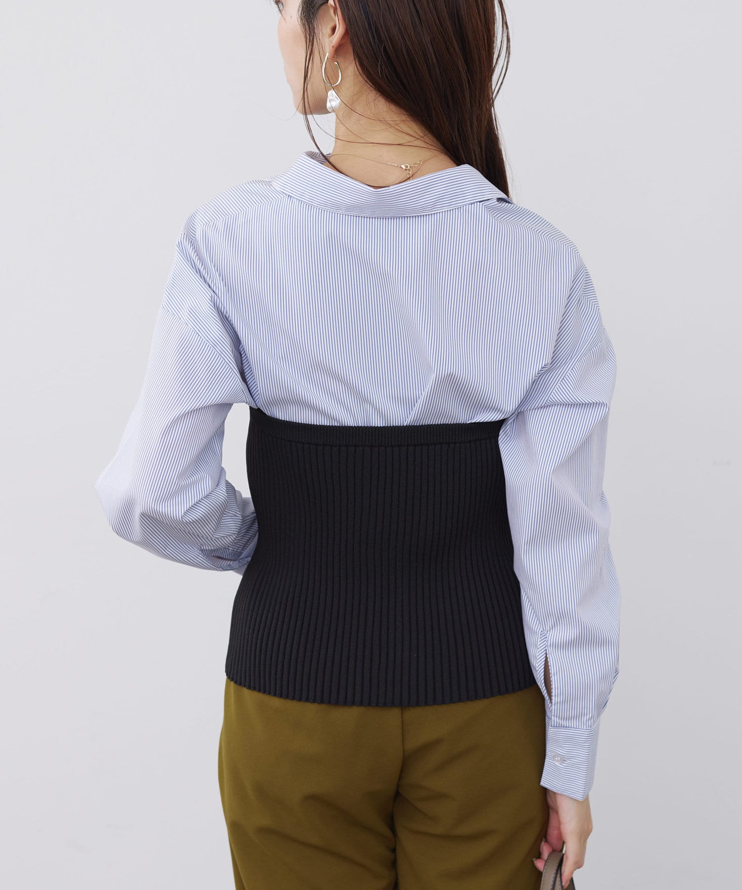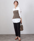 ベーシックなシャツにニットビスチシャツを合わせた
