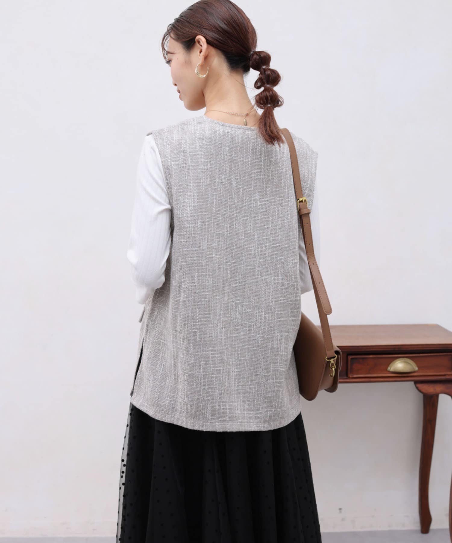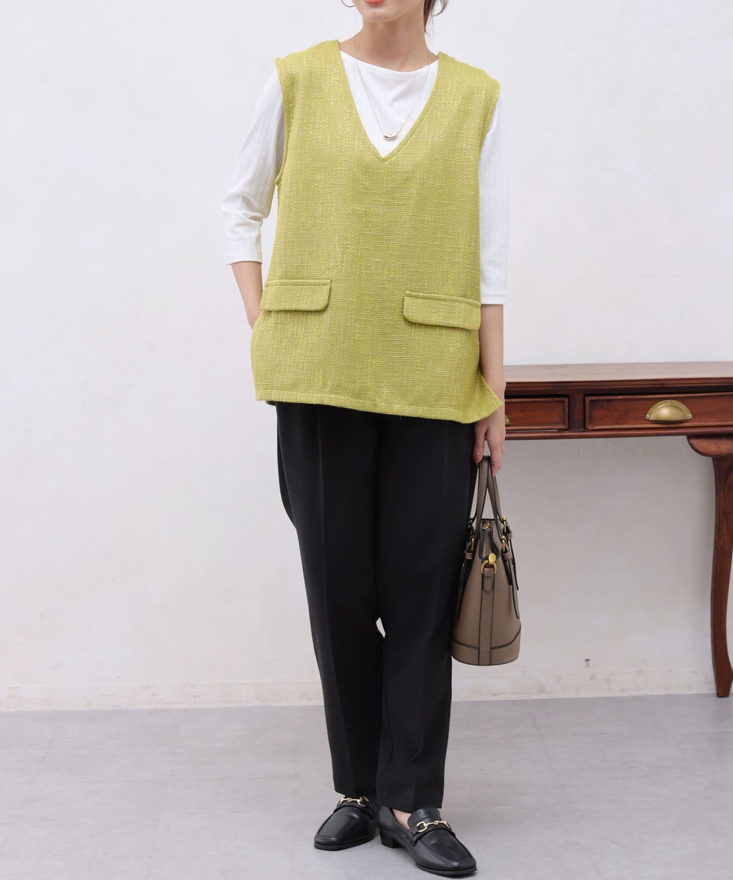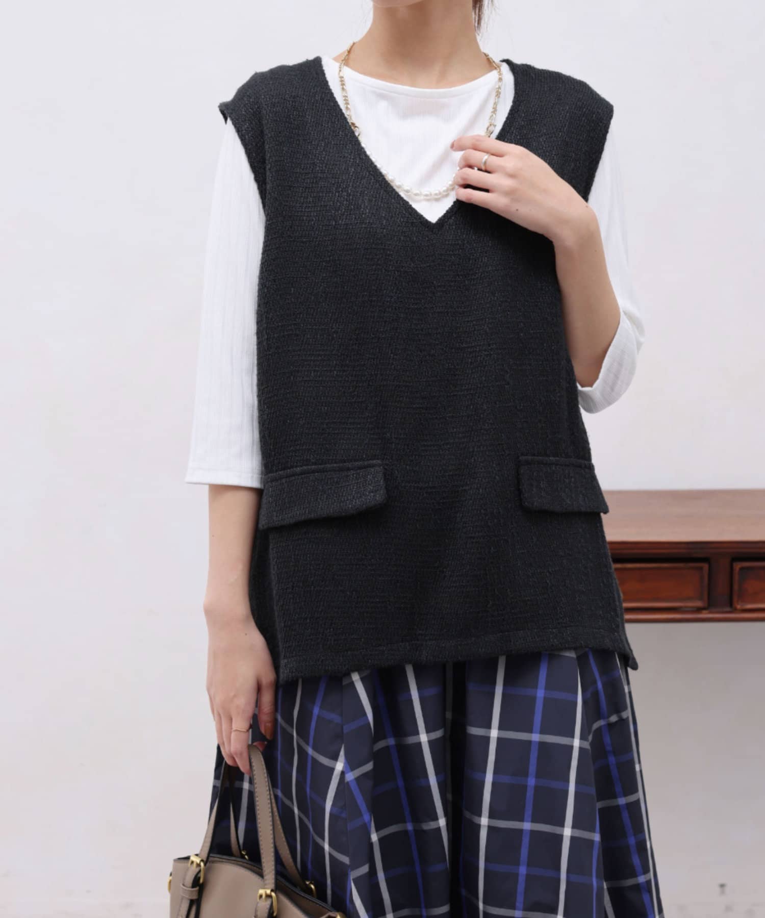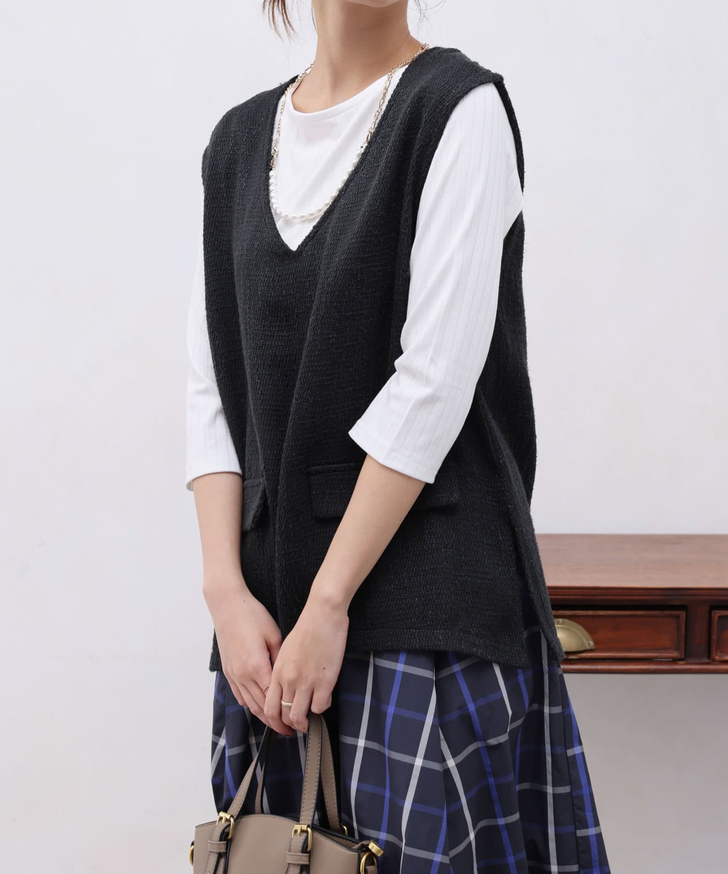 深めのVネックがポイントのベストは季節らしさを感じるツイード素材。