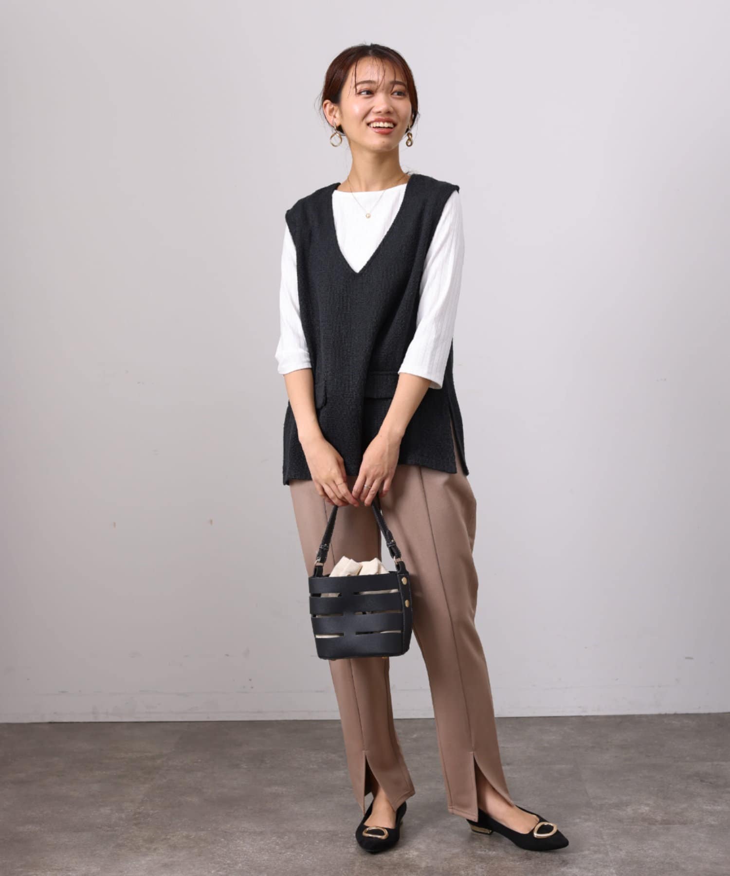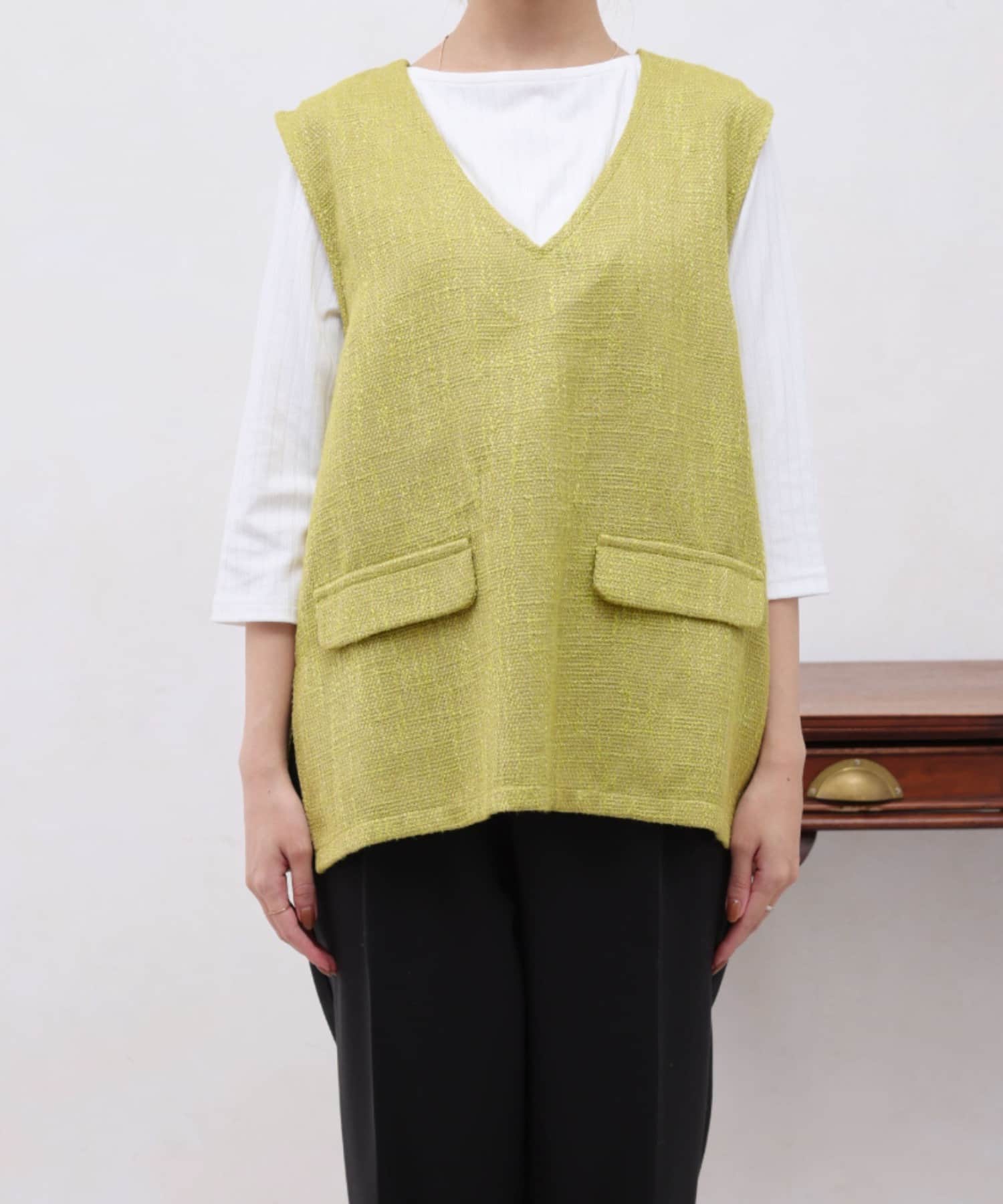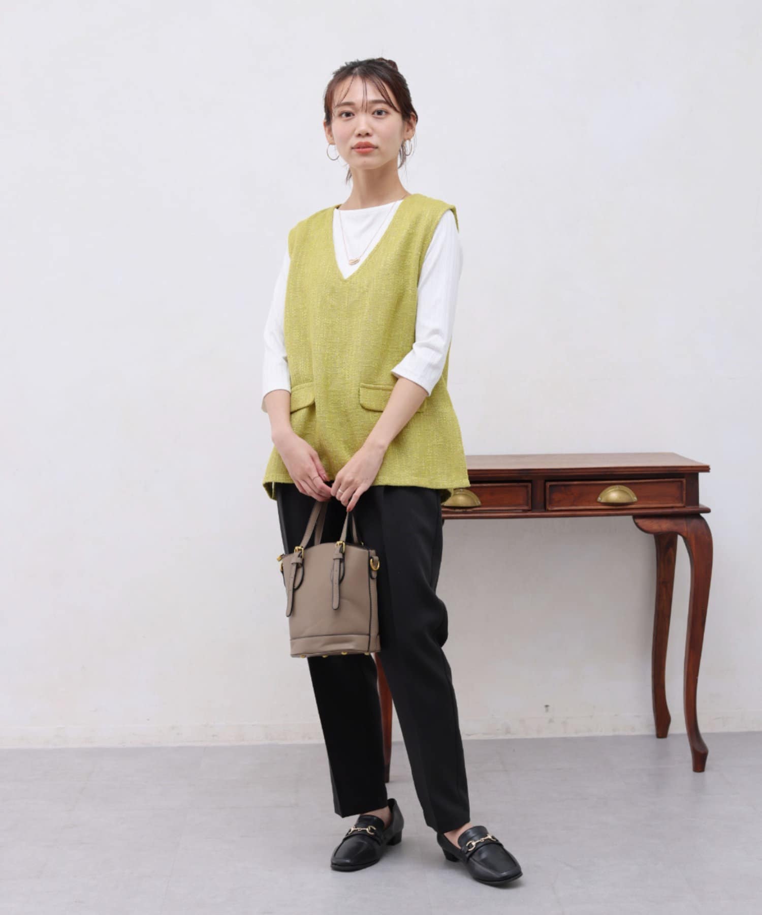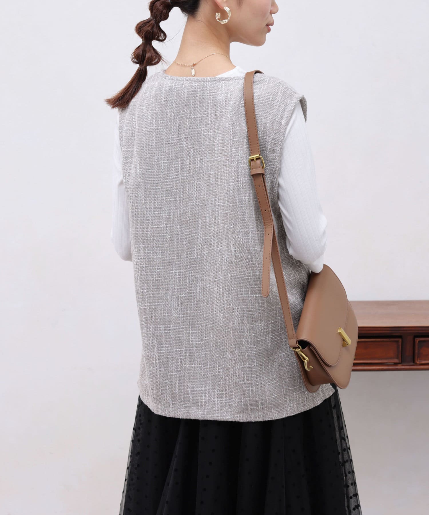 深めのVネックがポイントのベストは季節らしさを感じるツイード素材。