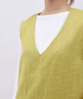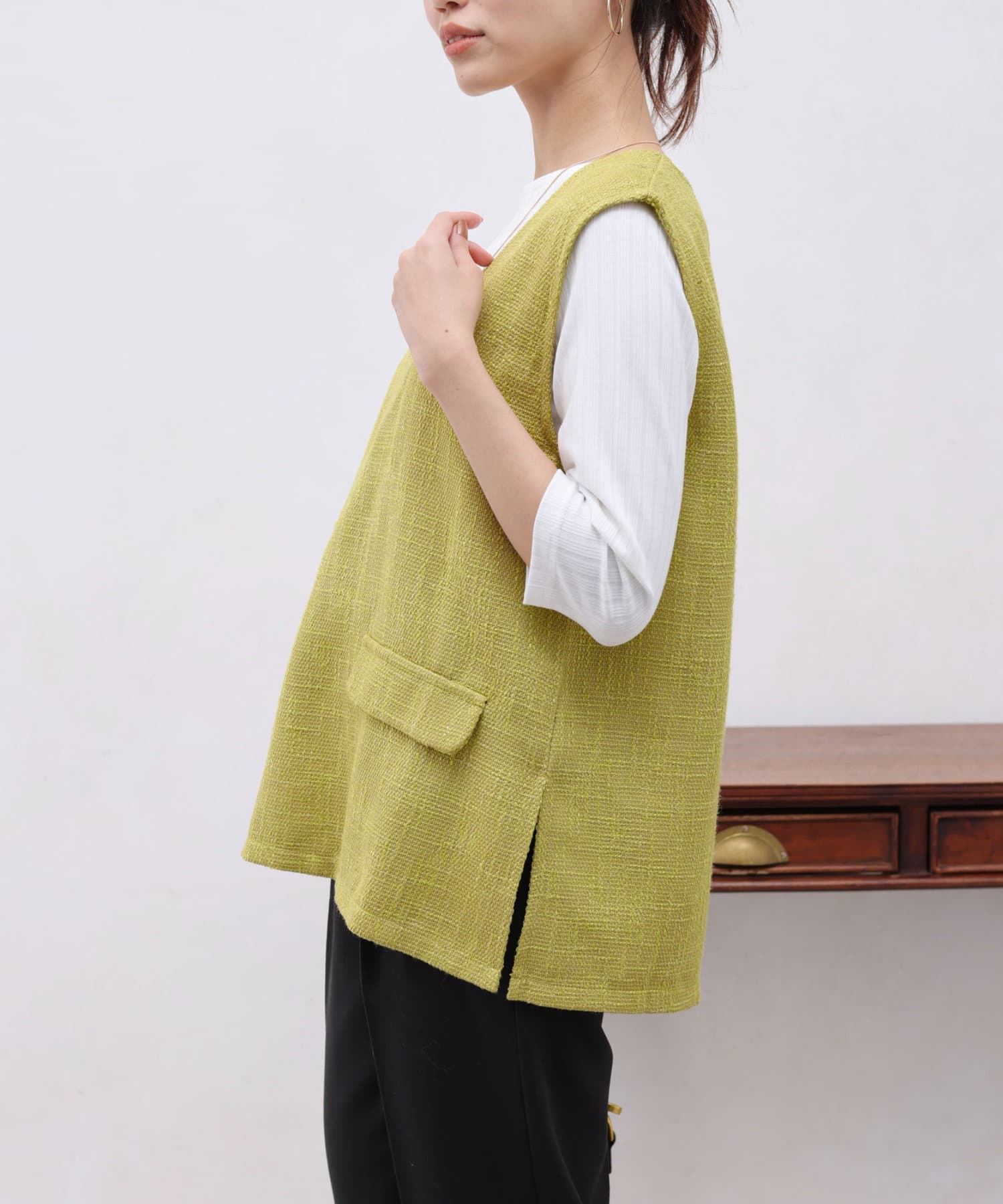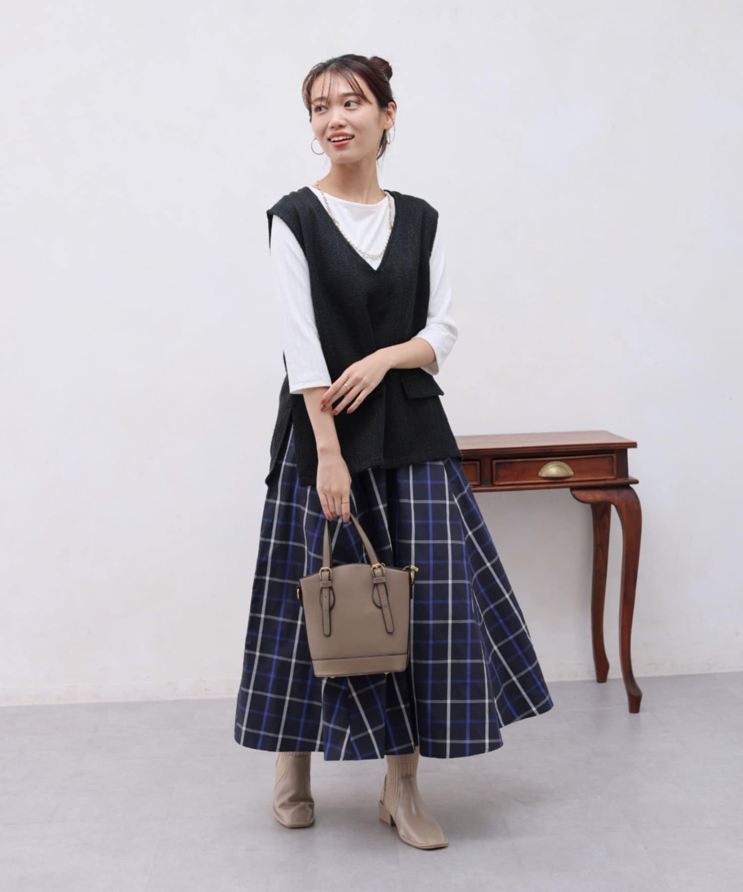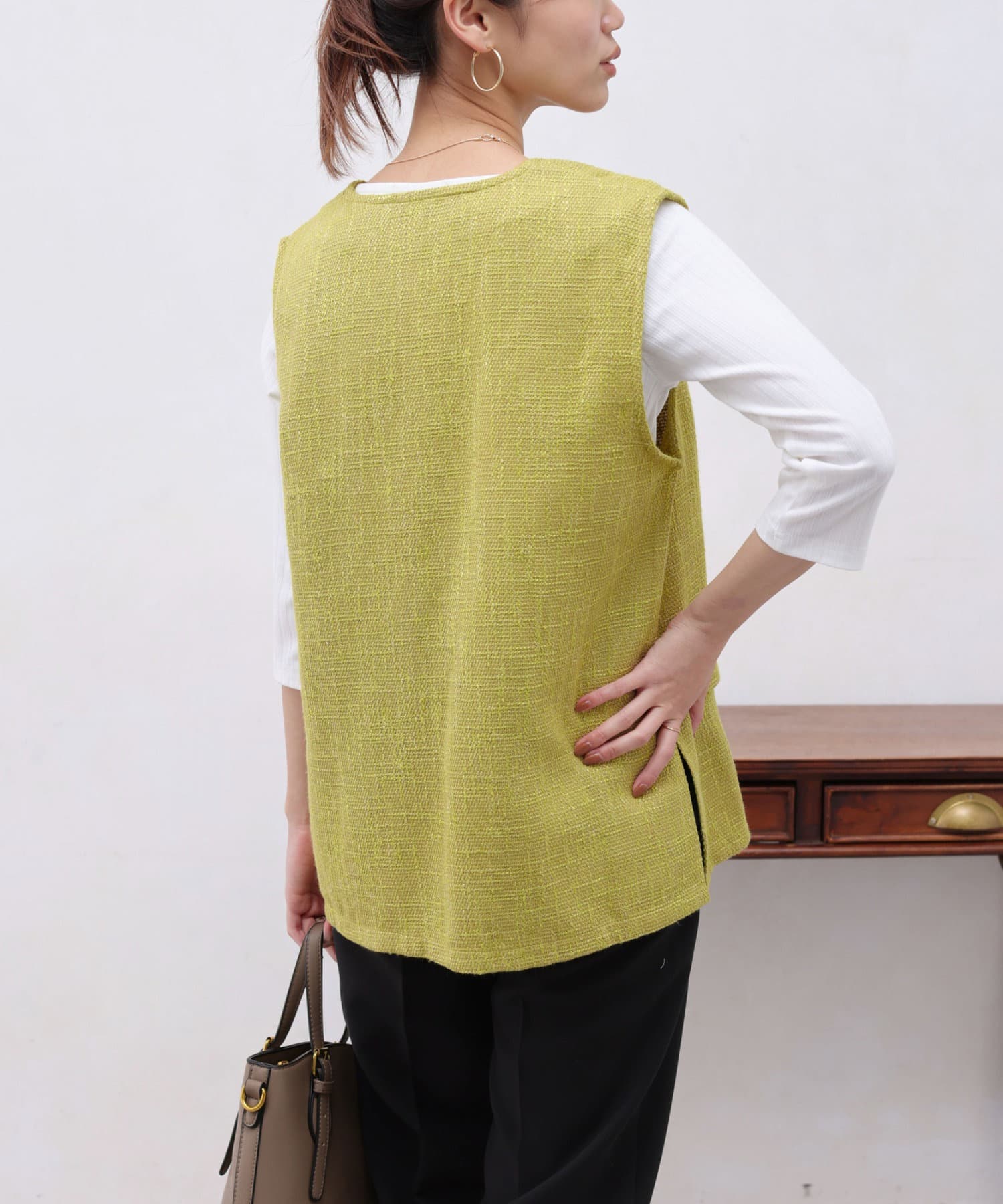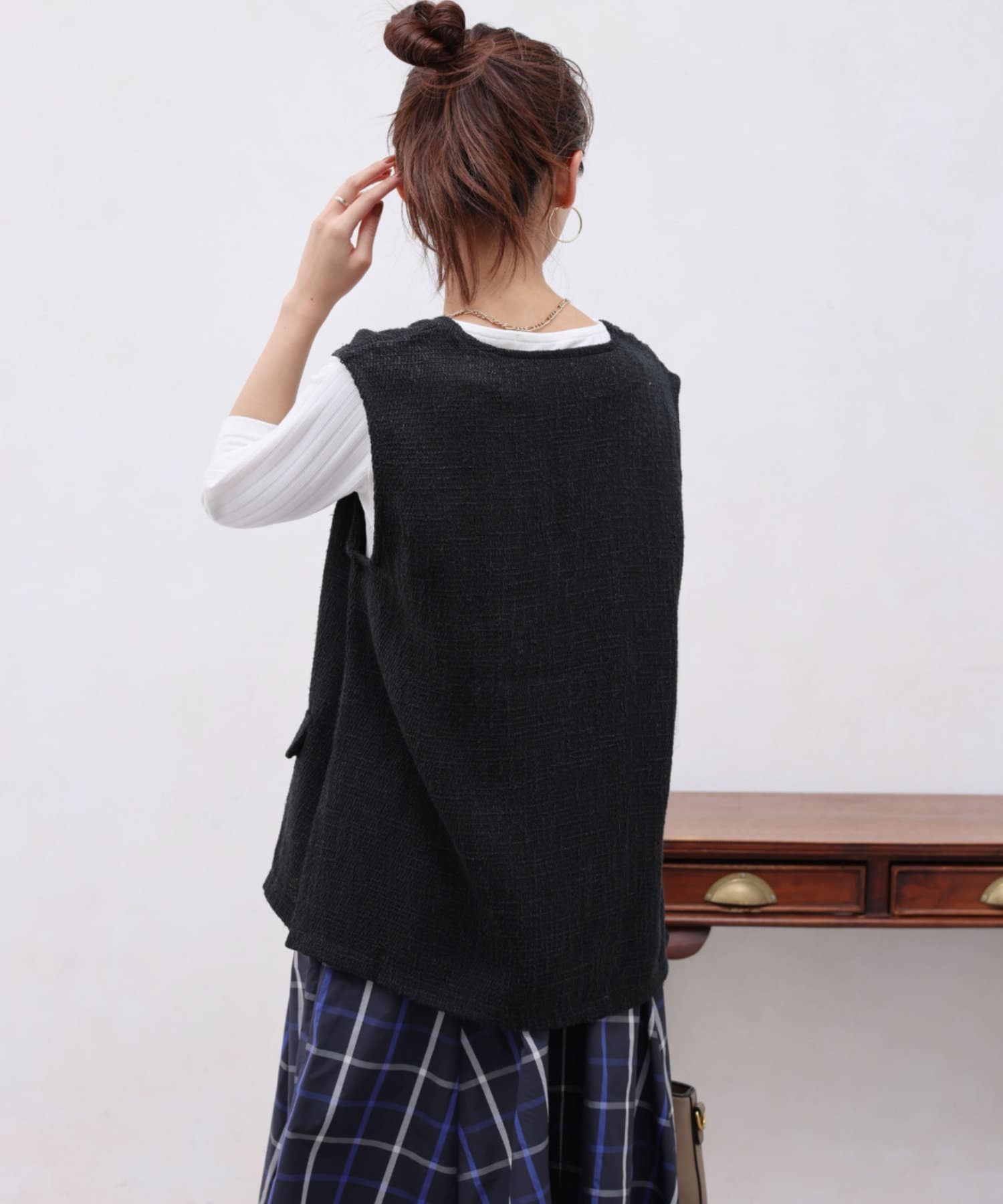 深めのVネックがポイントのベストは季節らしさを感じるツイード素材。