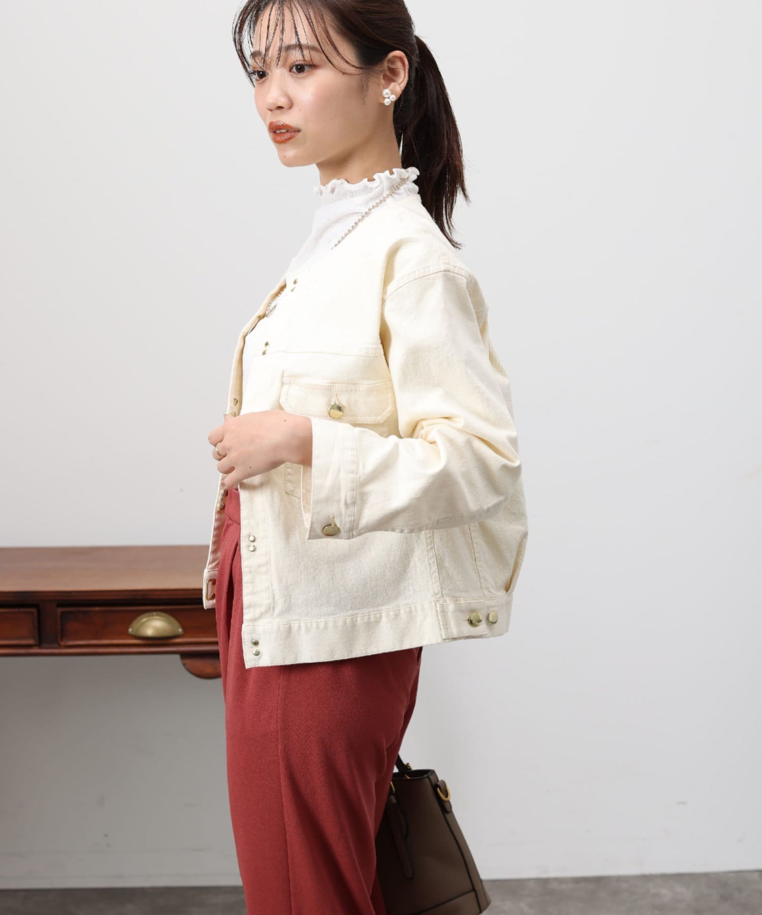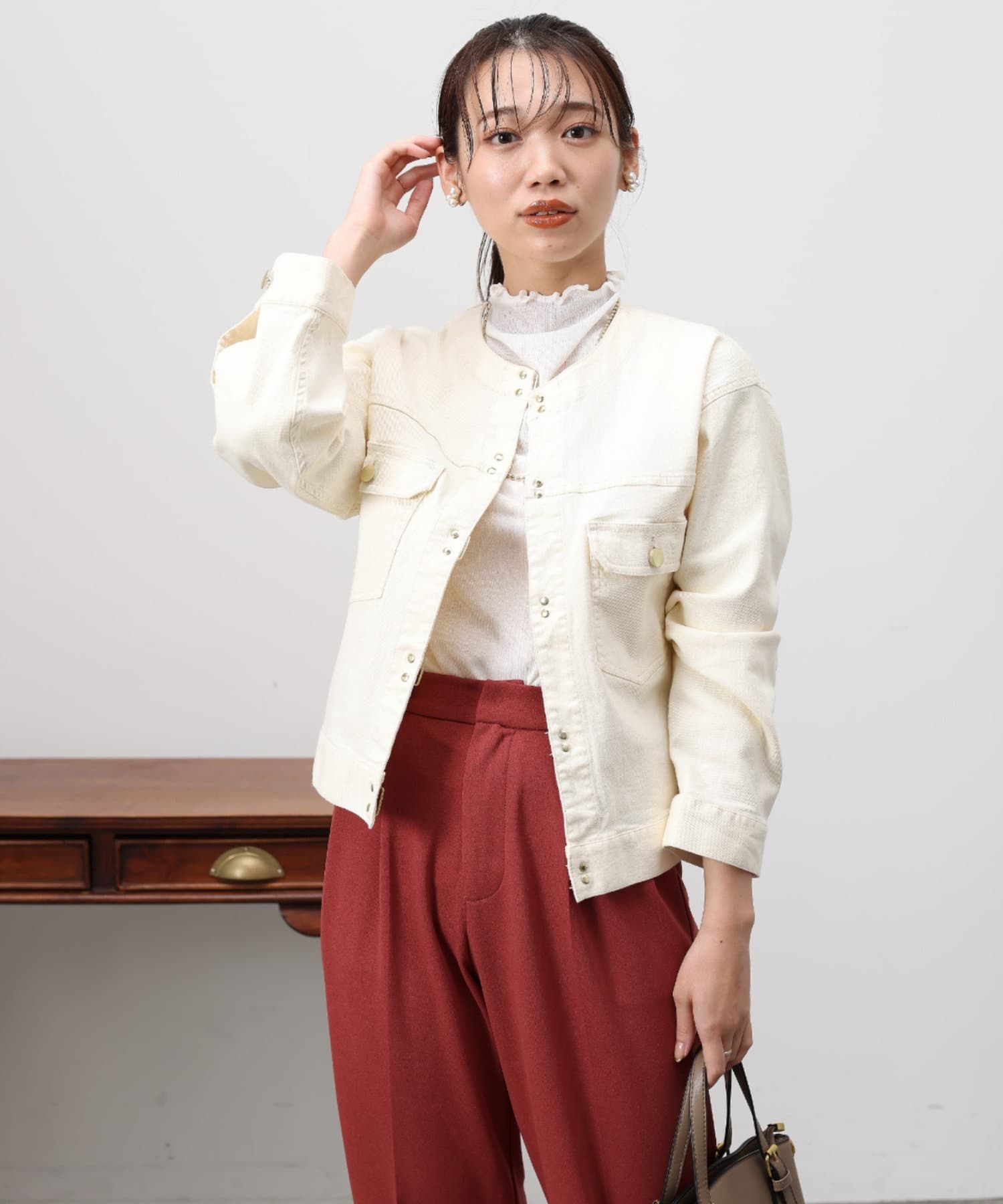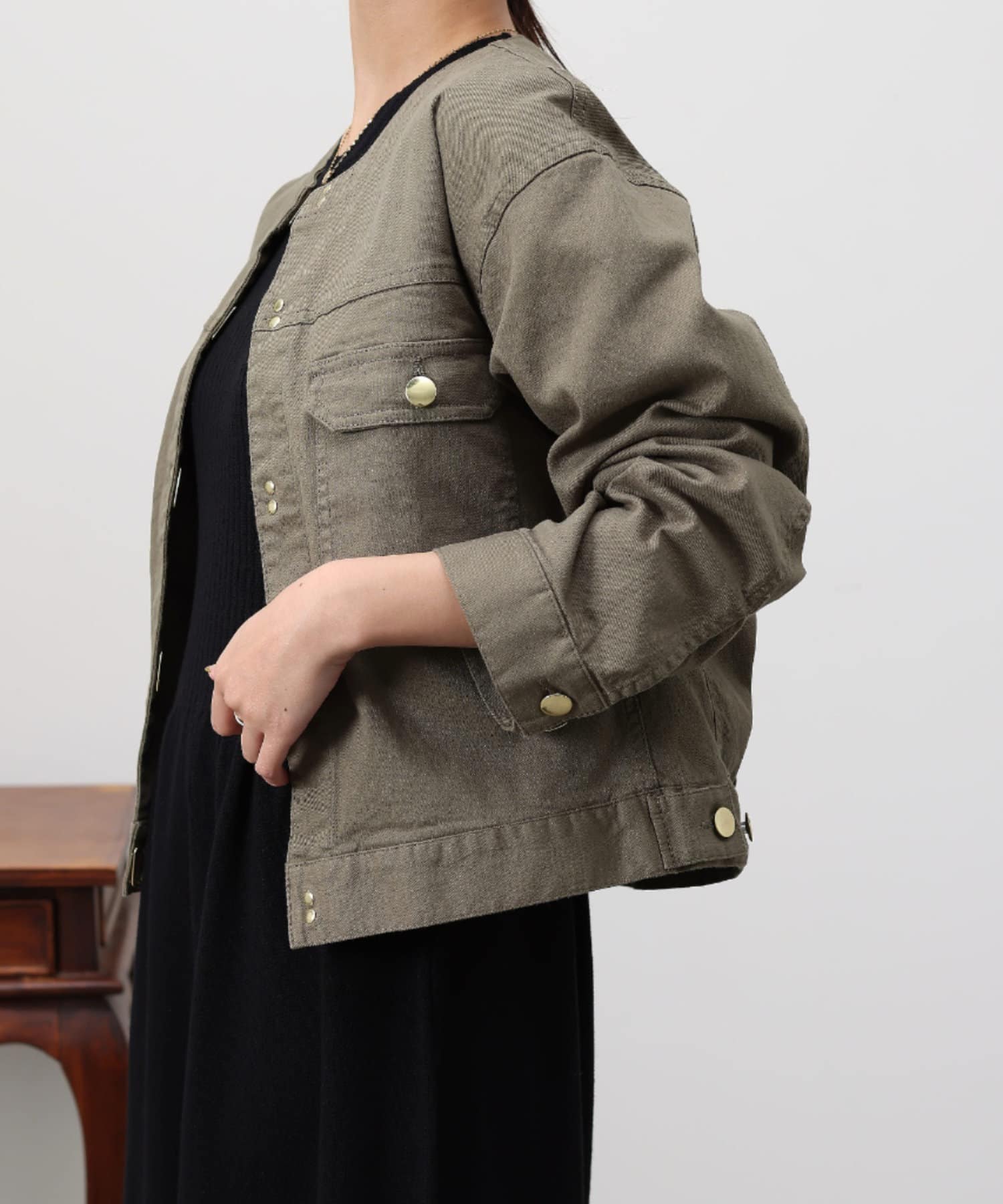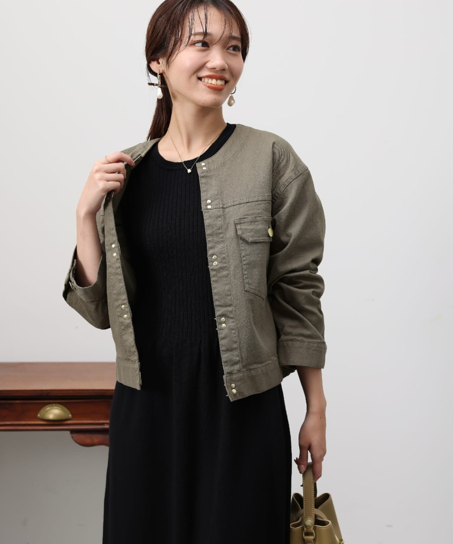 ノーカラーなのできれいめな印象を与えつつ、ジャケットほどかっちりしていないのでラフな着こなしにもばっちり!