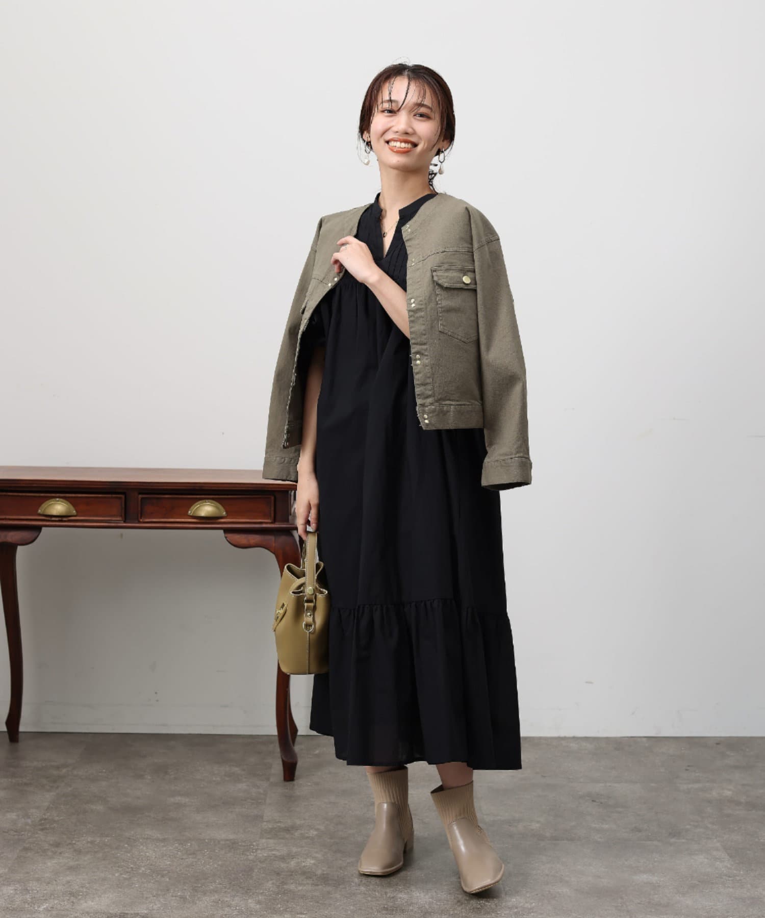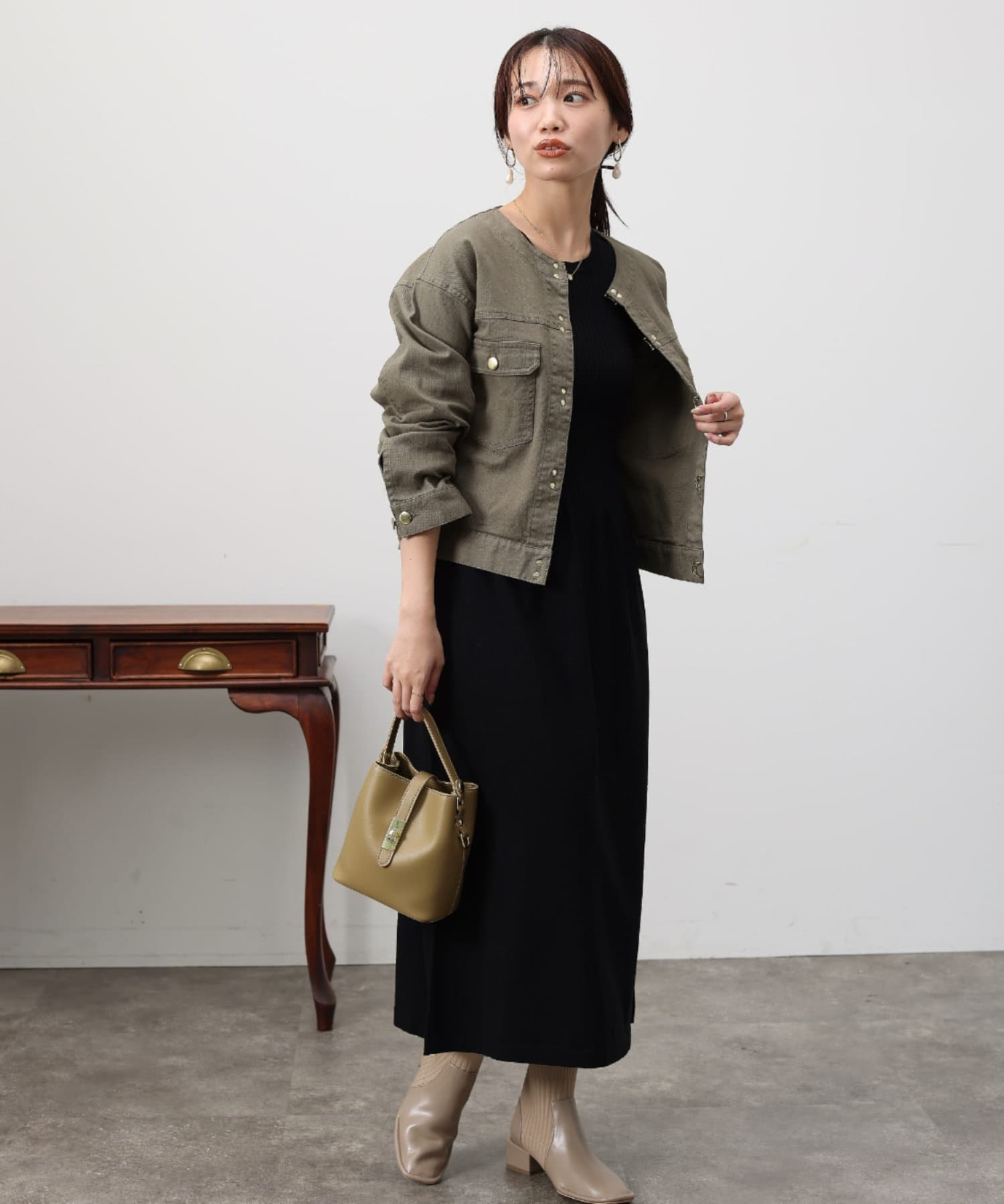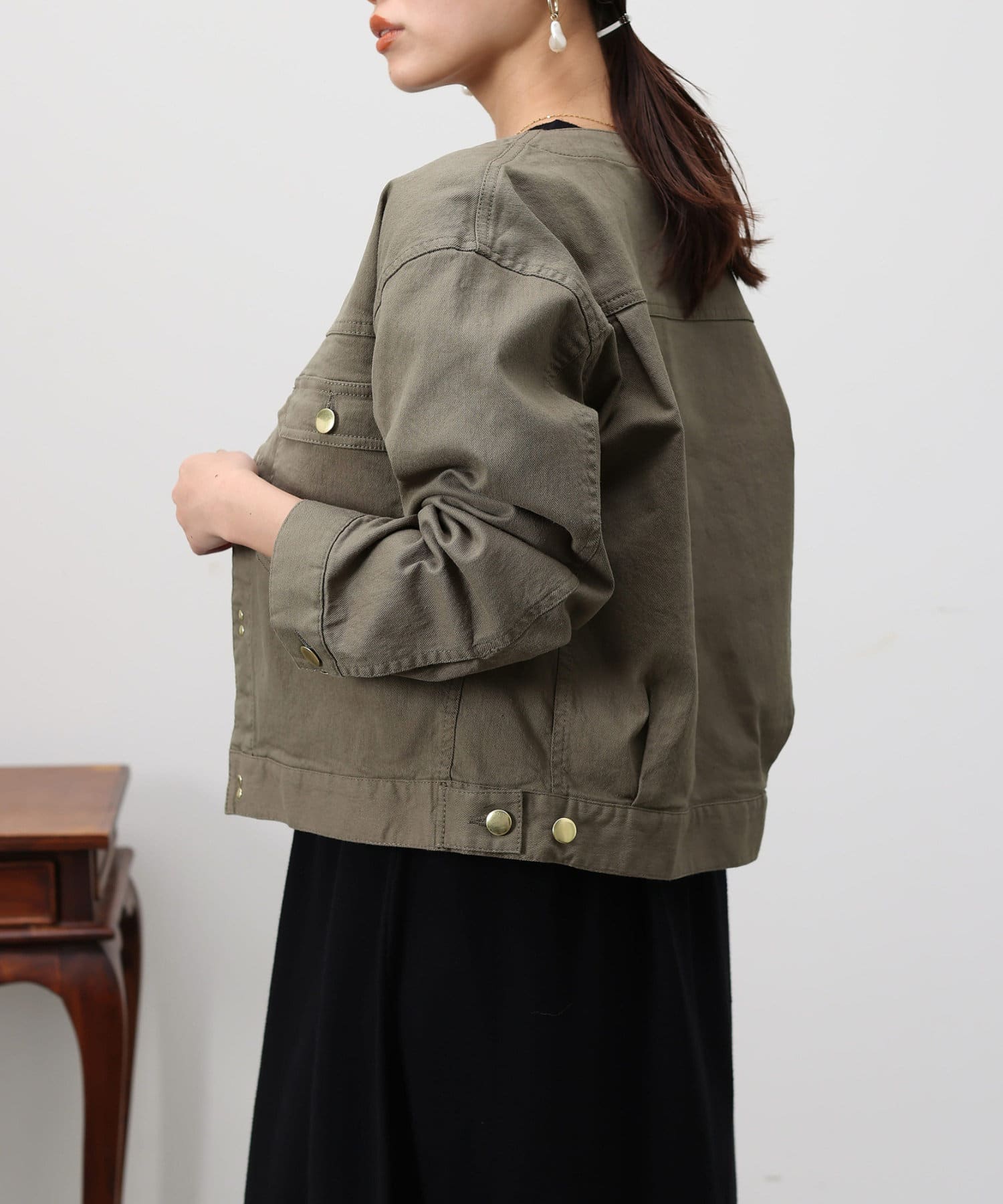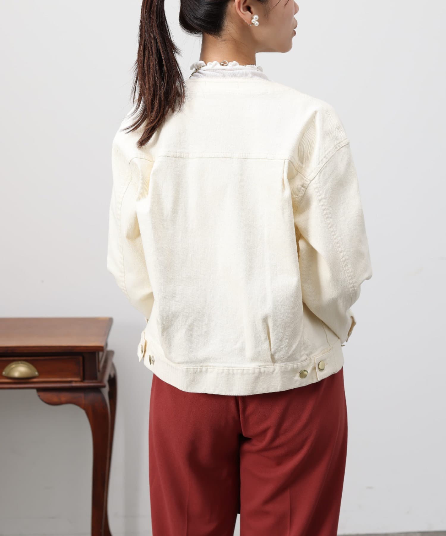 ノーカラーなのできれいめな印象を与えつつ、ジャケットほどかっちりしていないのでラフな着こなしにもばっちり!