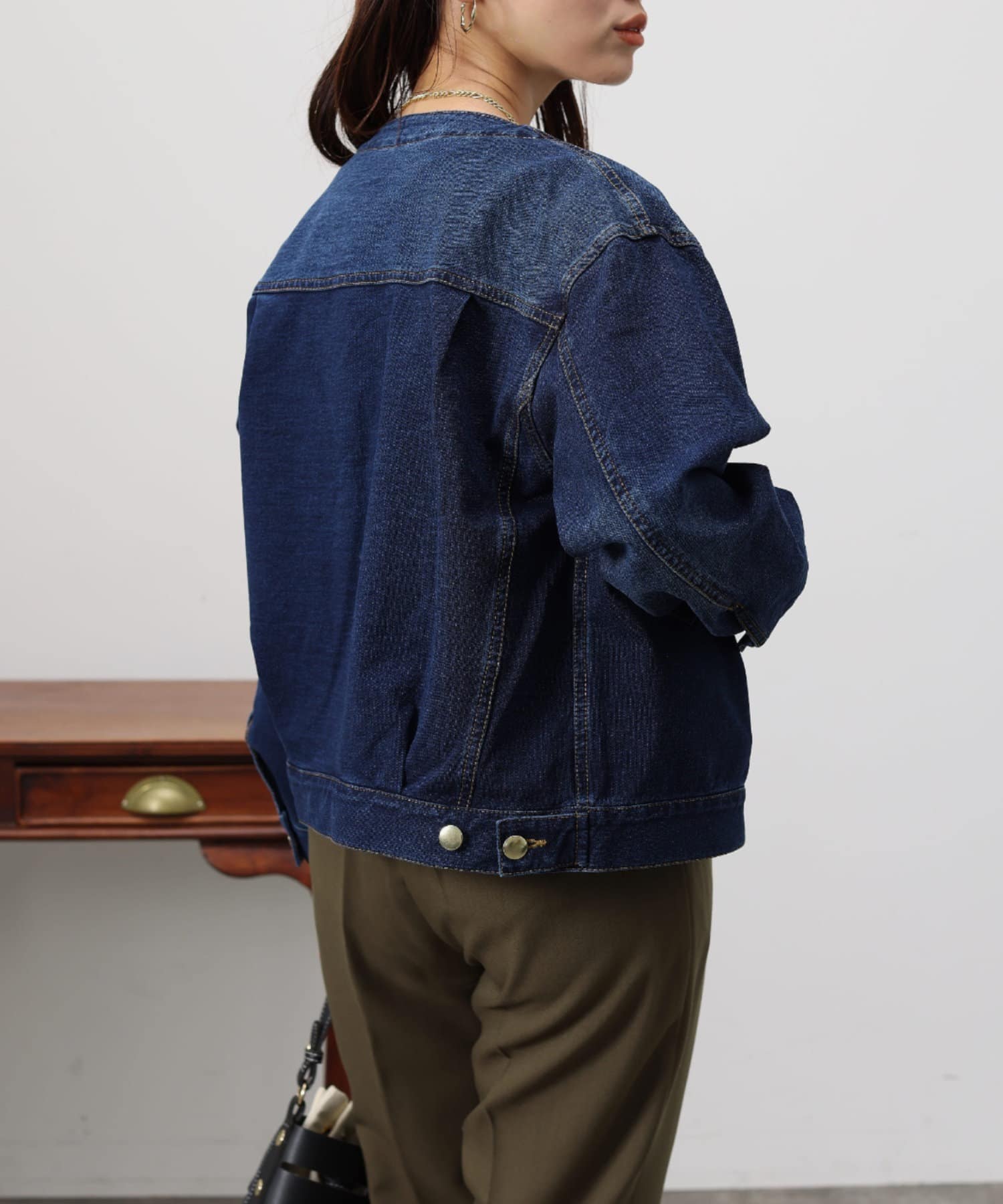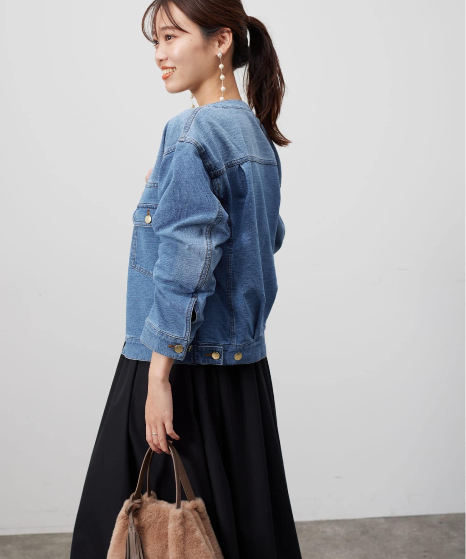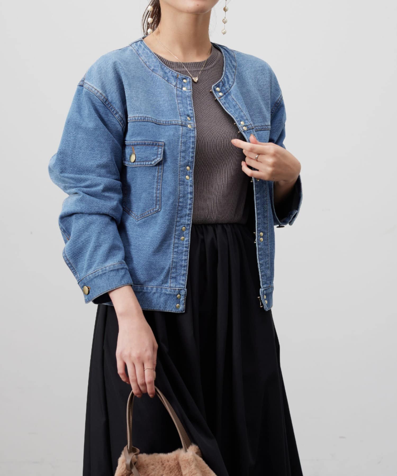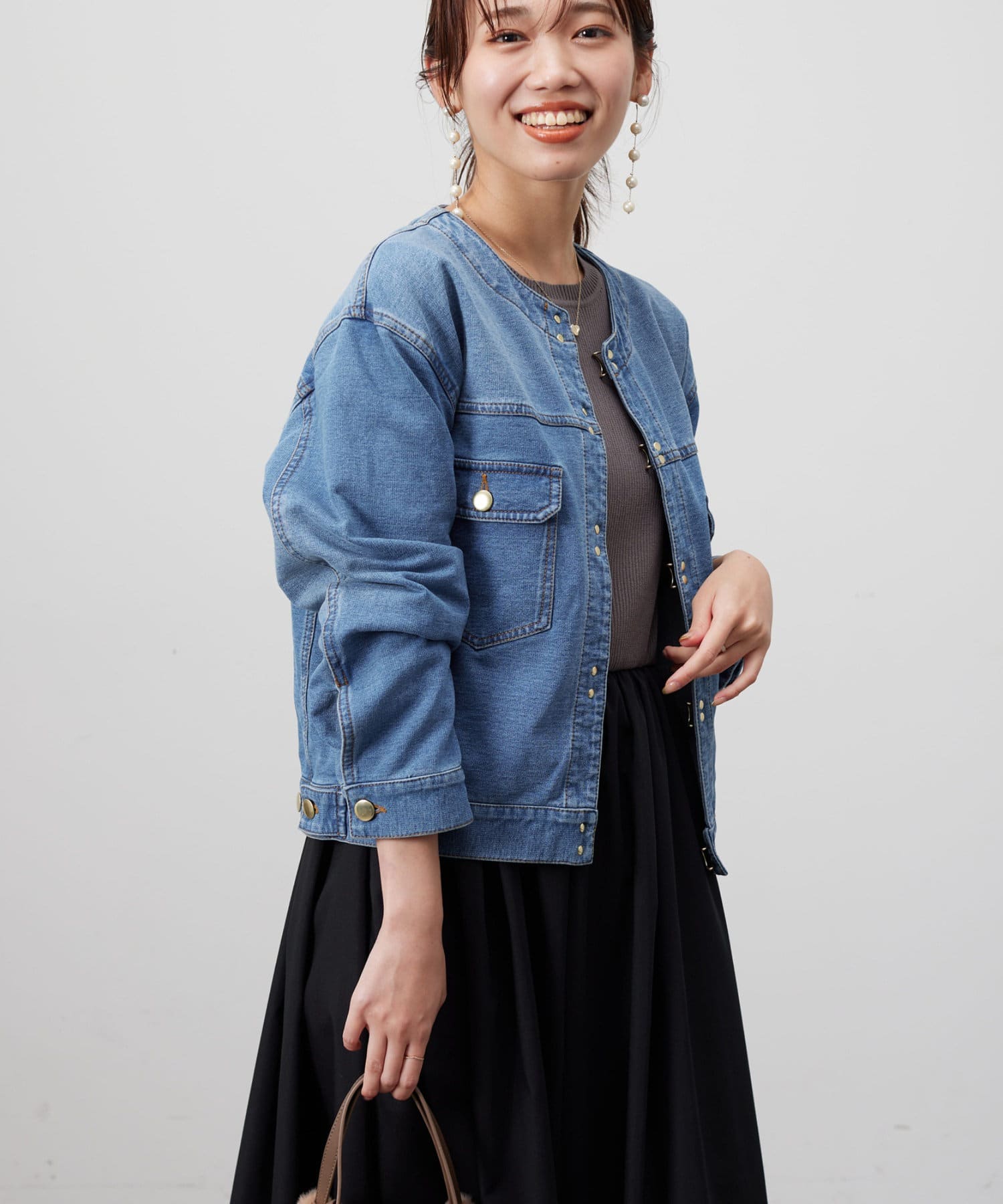 冬コートのインナーに入れてもかさばらないので、1枚あれば着こなしの幅が広がるデニムジャケットです。