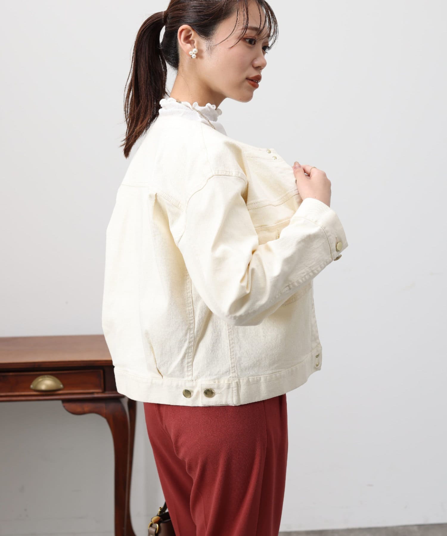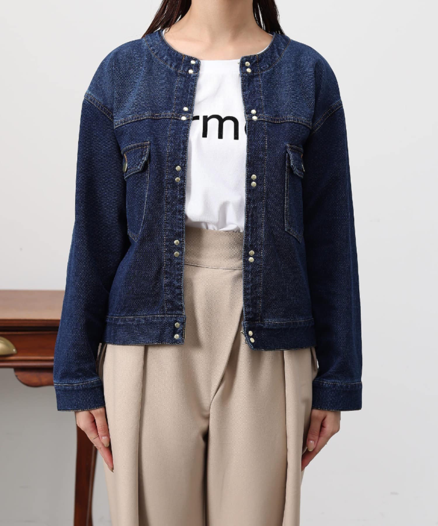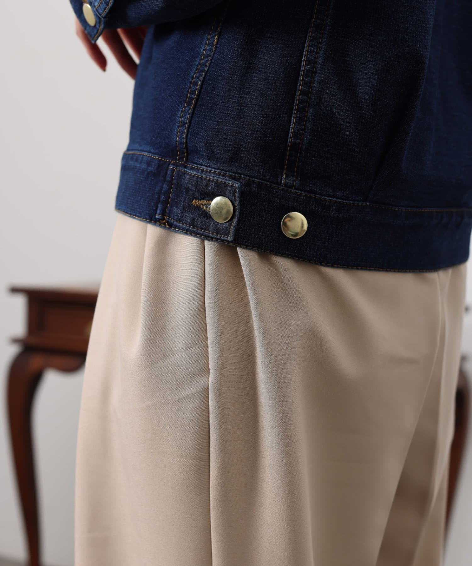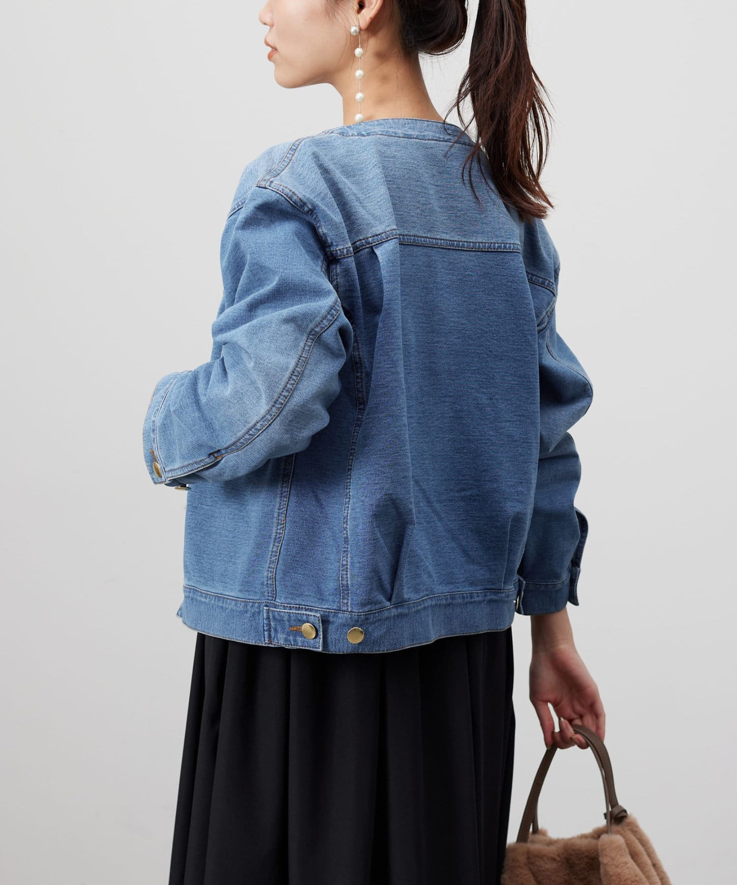 冬コートのインナーに入れてもかさばらないので、1枚あれば着こなしの幅が広がるデニムジャケットです。