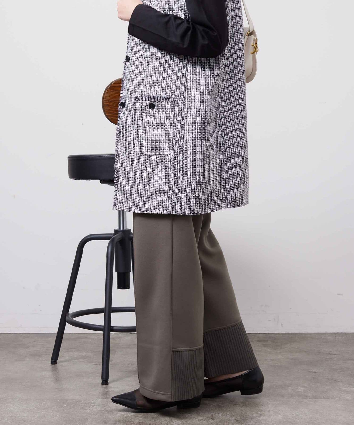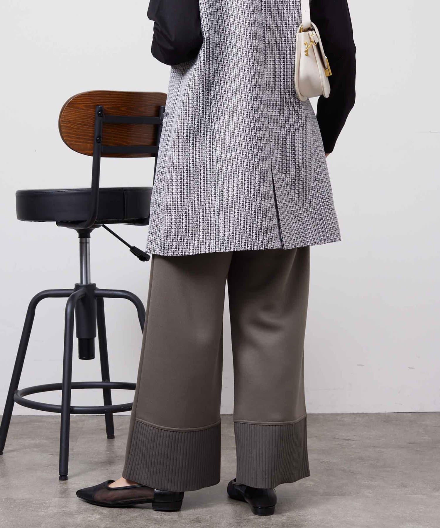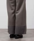 ウエスト部分と前裾部分にはニットリブを使用した異素材ドッキングのデザイン。