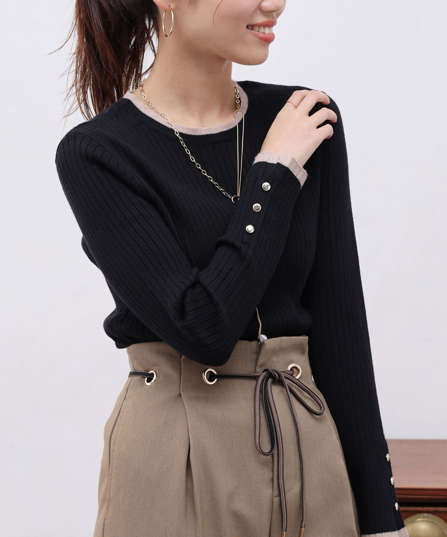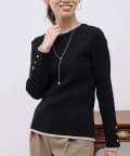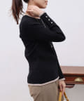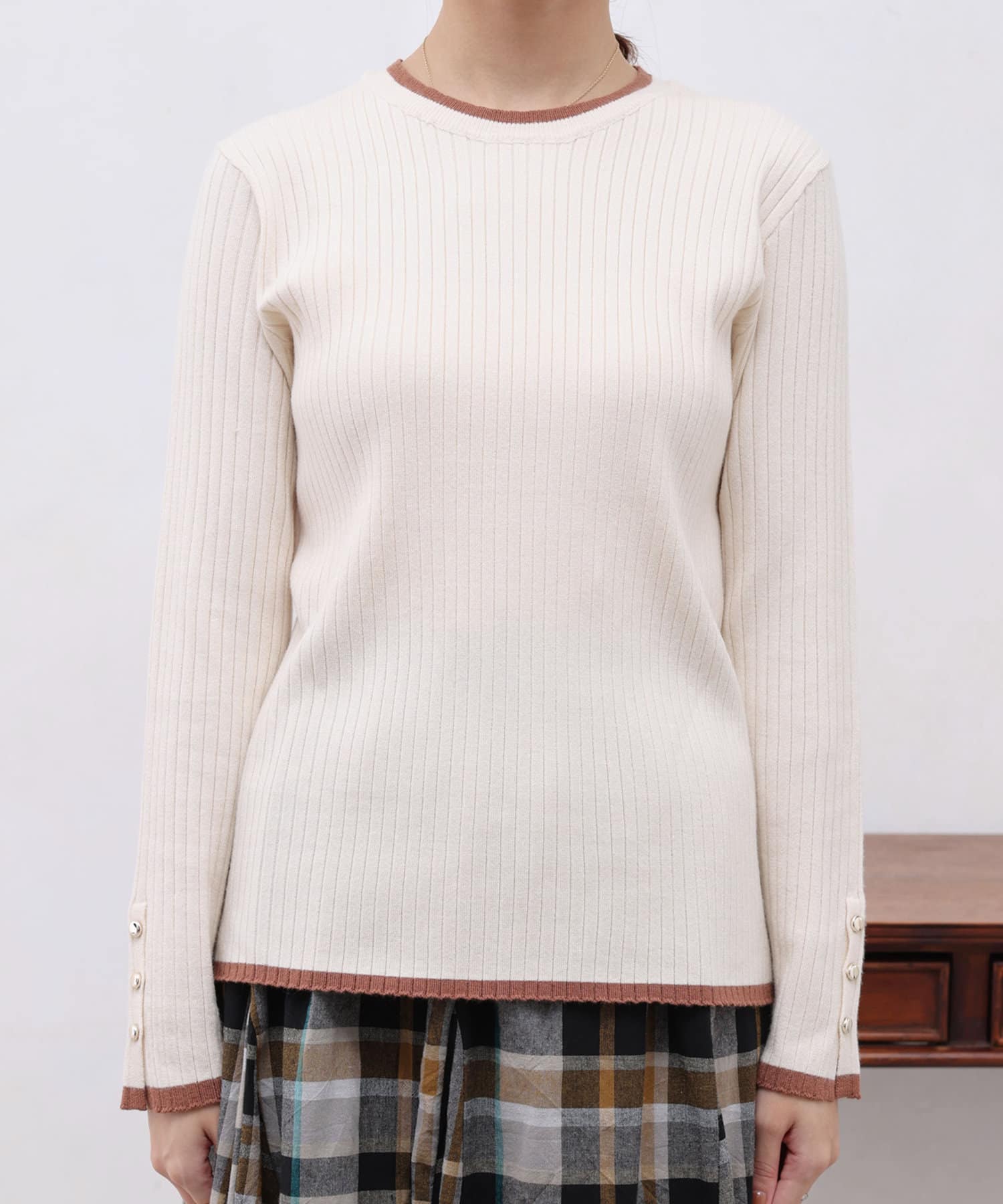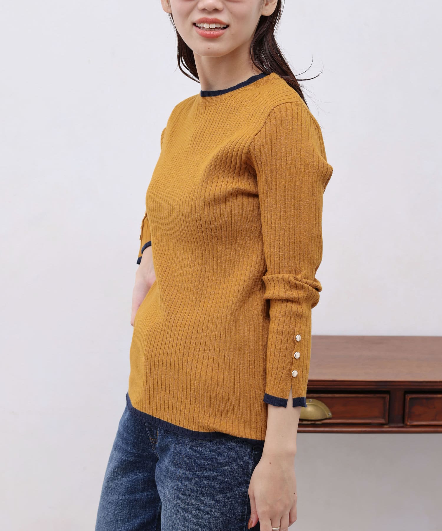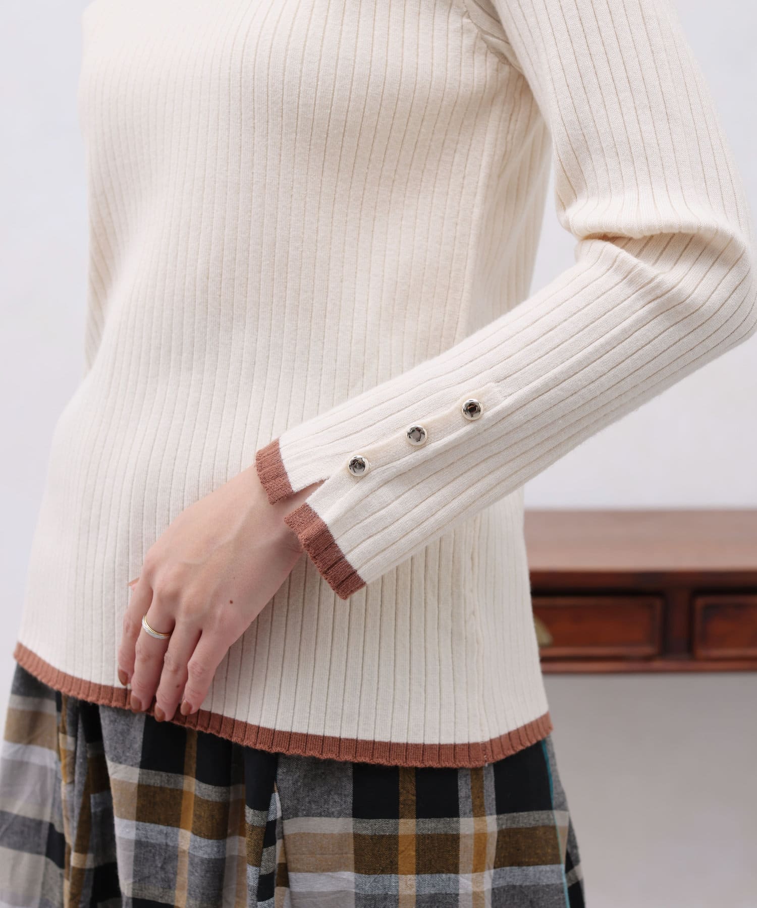 襟元と裾を配色にし、袖口にゴールドボタンをあしらったシェトワ定番のリブプルオーバーです。