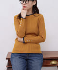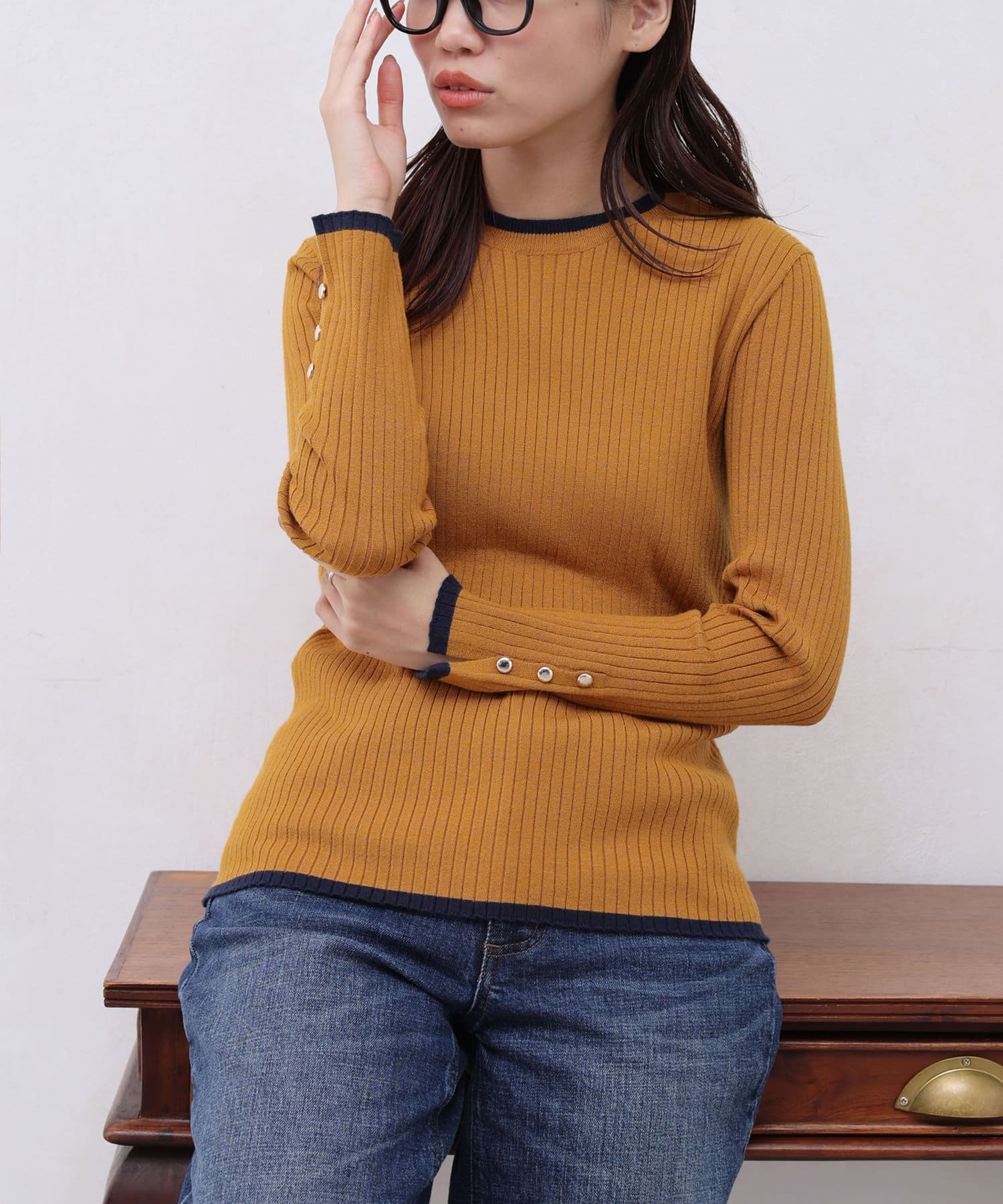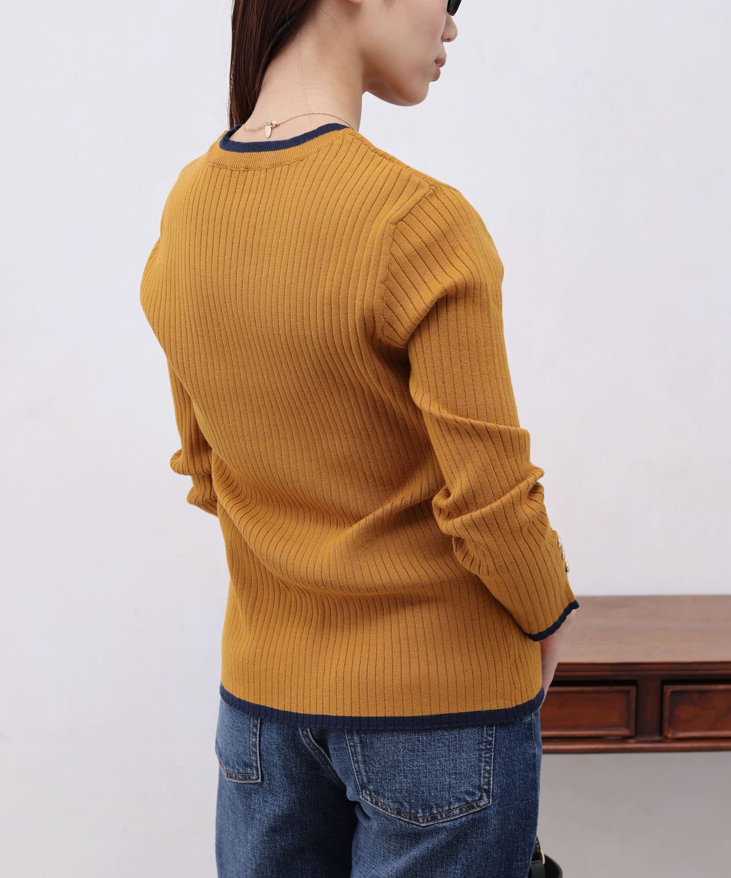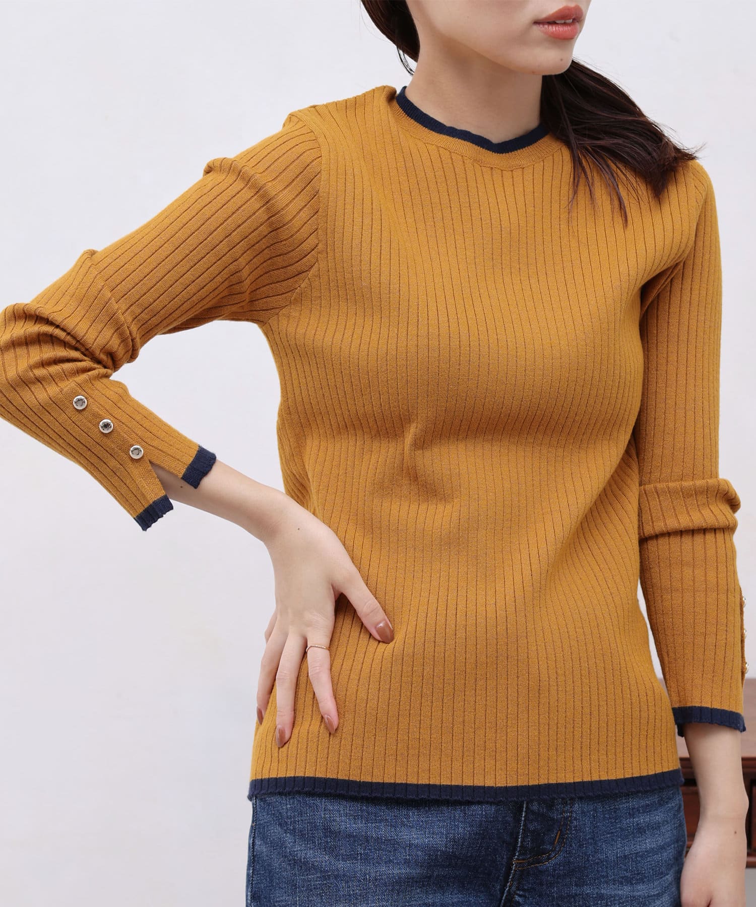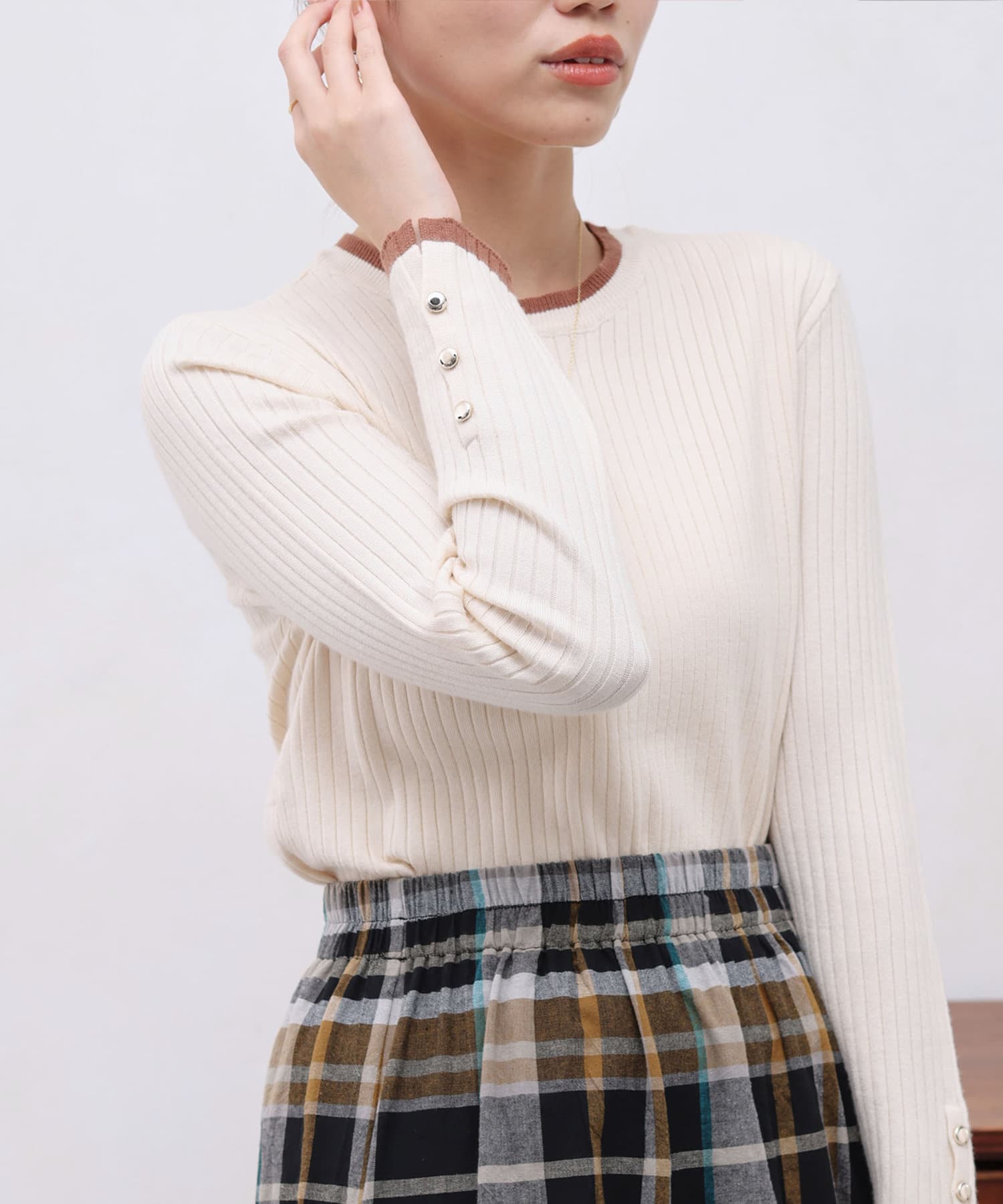 襟元と裾を配色にし、袖口にゴールドボタンをあしらったシェトワ定番のリブプルオーバーです。