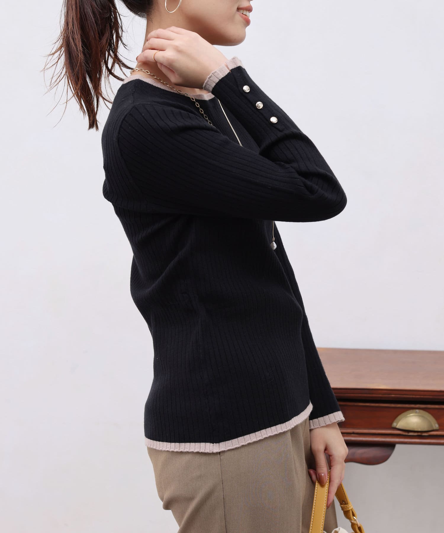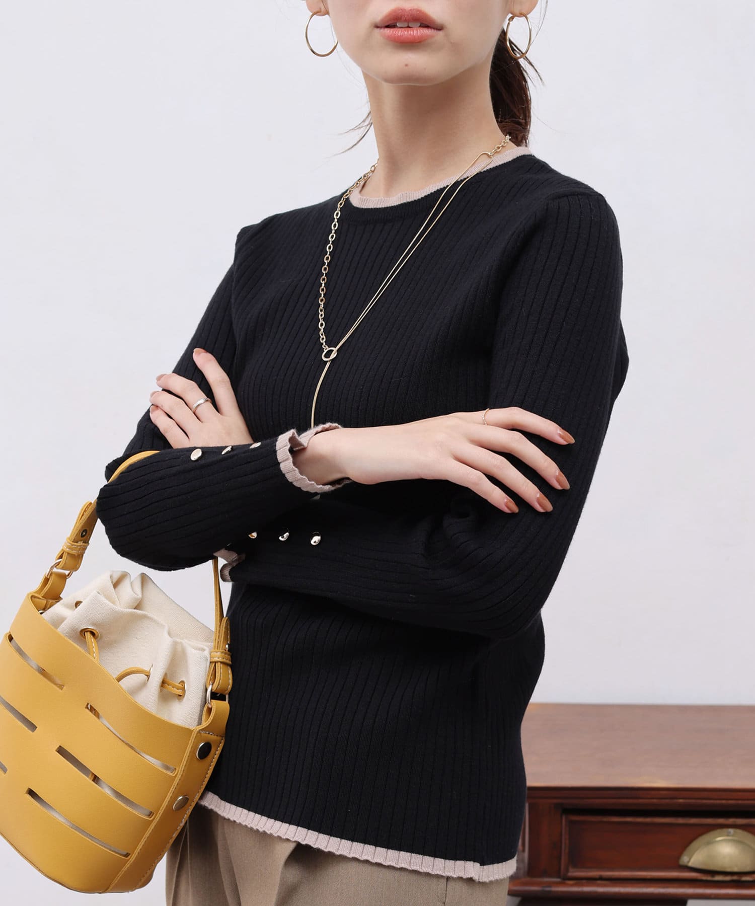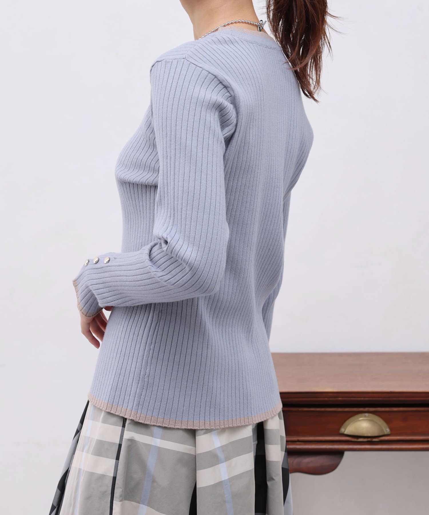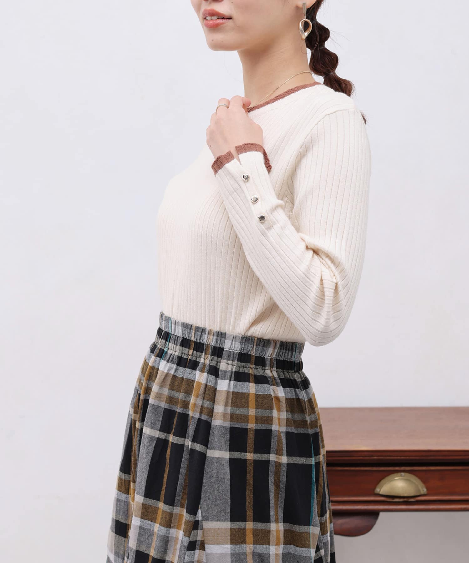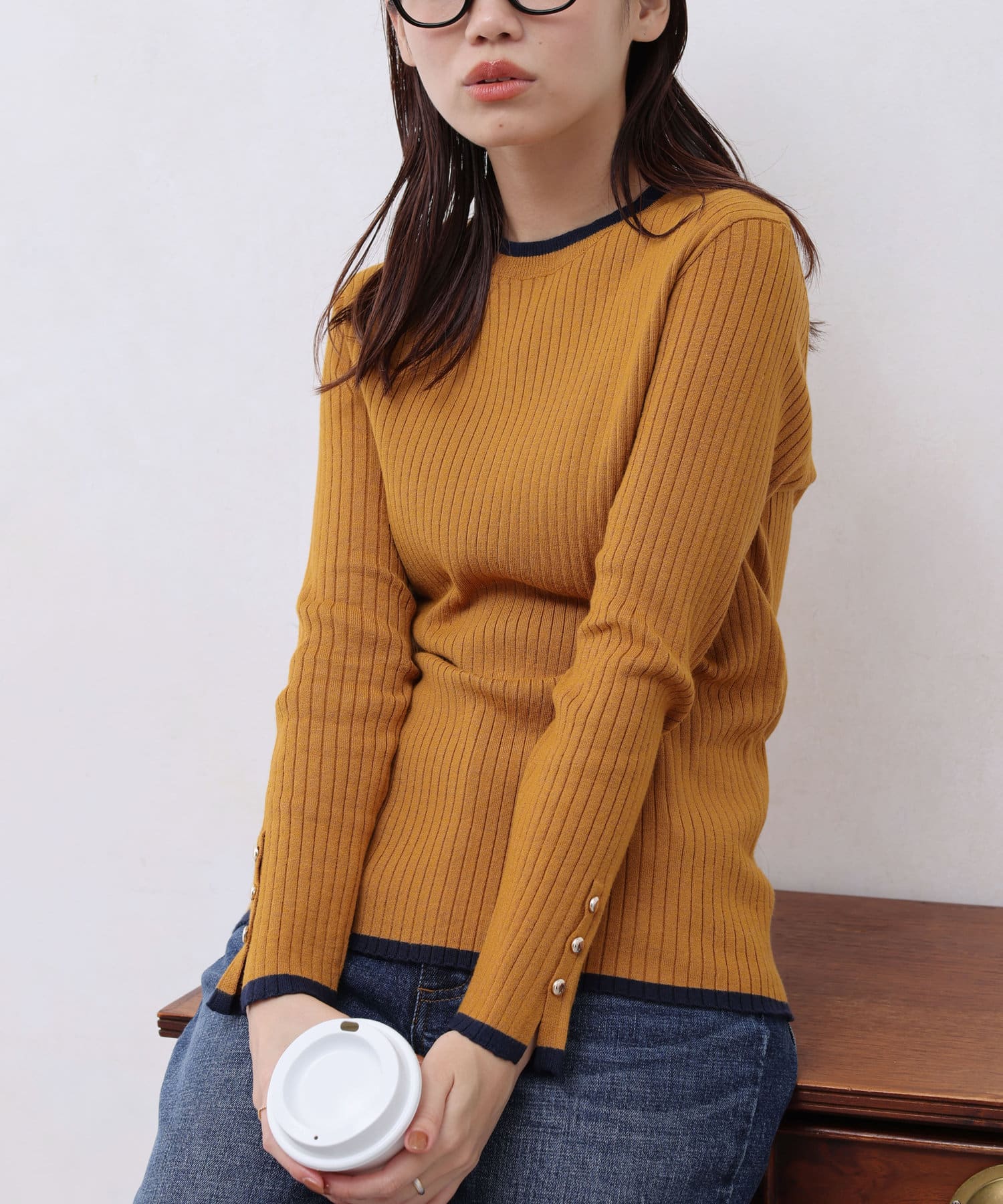 襟元と裾を配色にし、袖口にゴールドボタンをあしらったシェトワ定番のリブプルオーバーです。