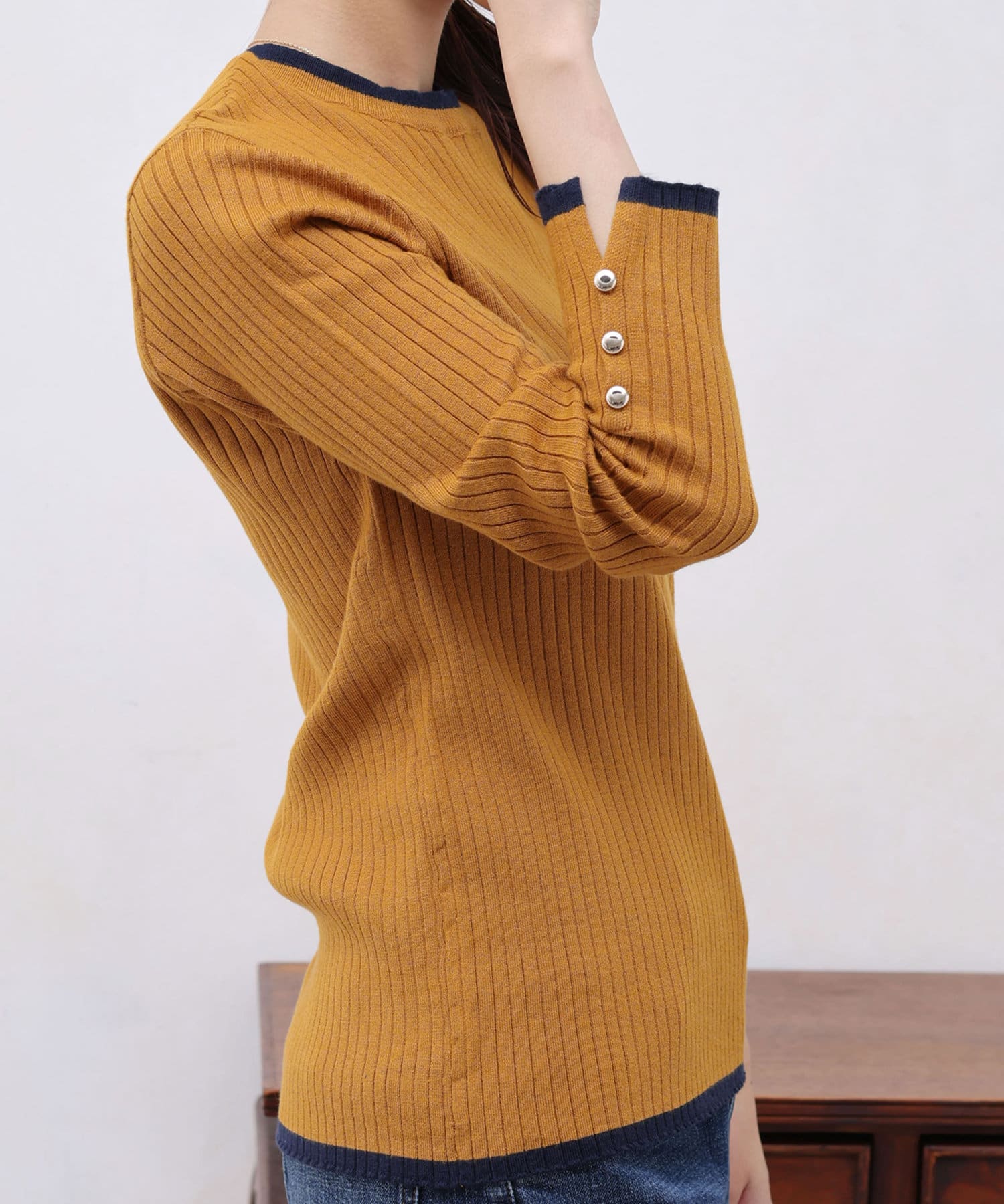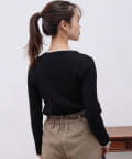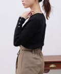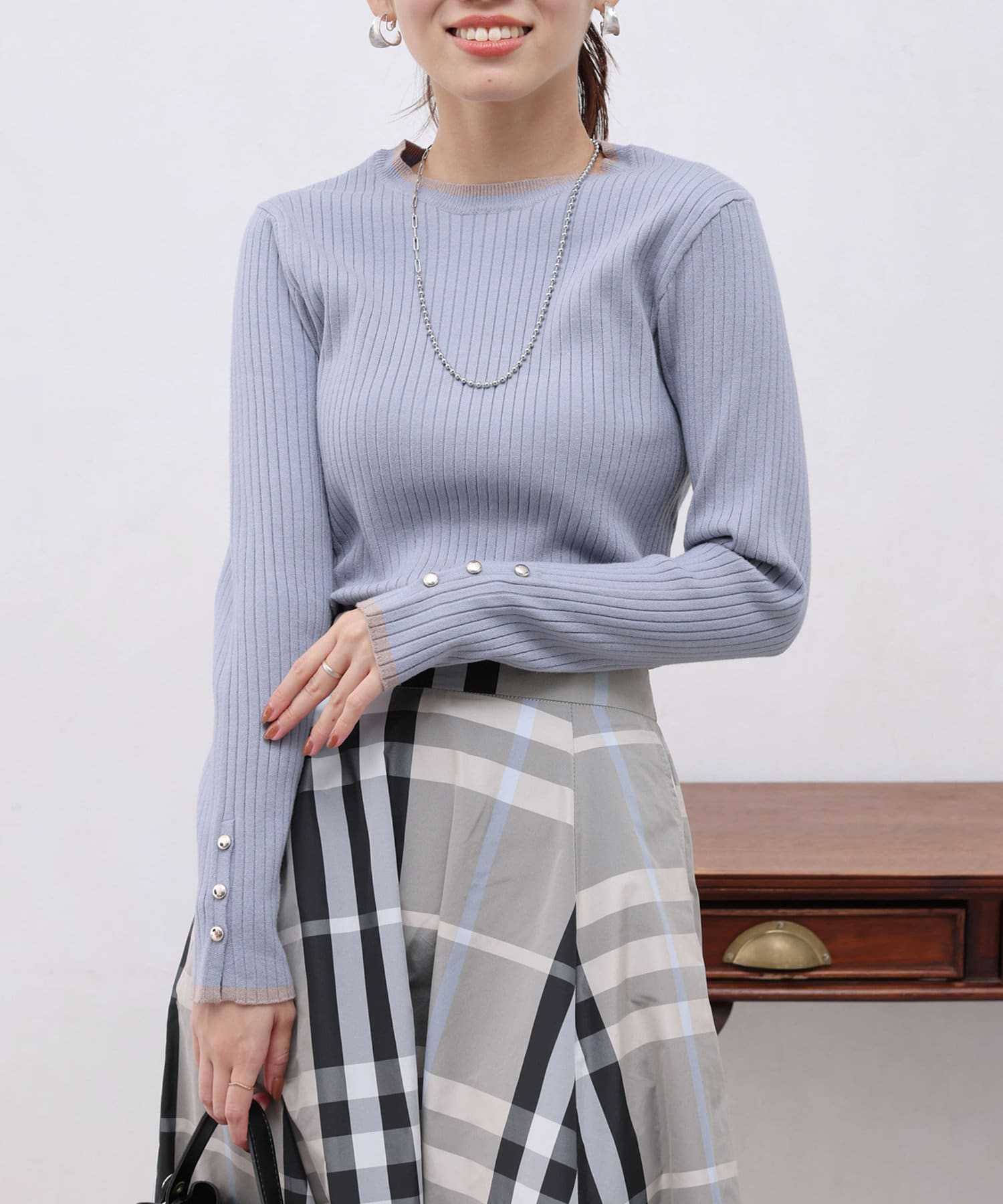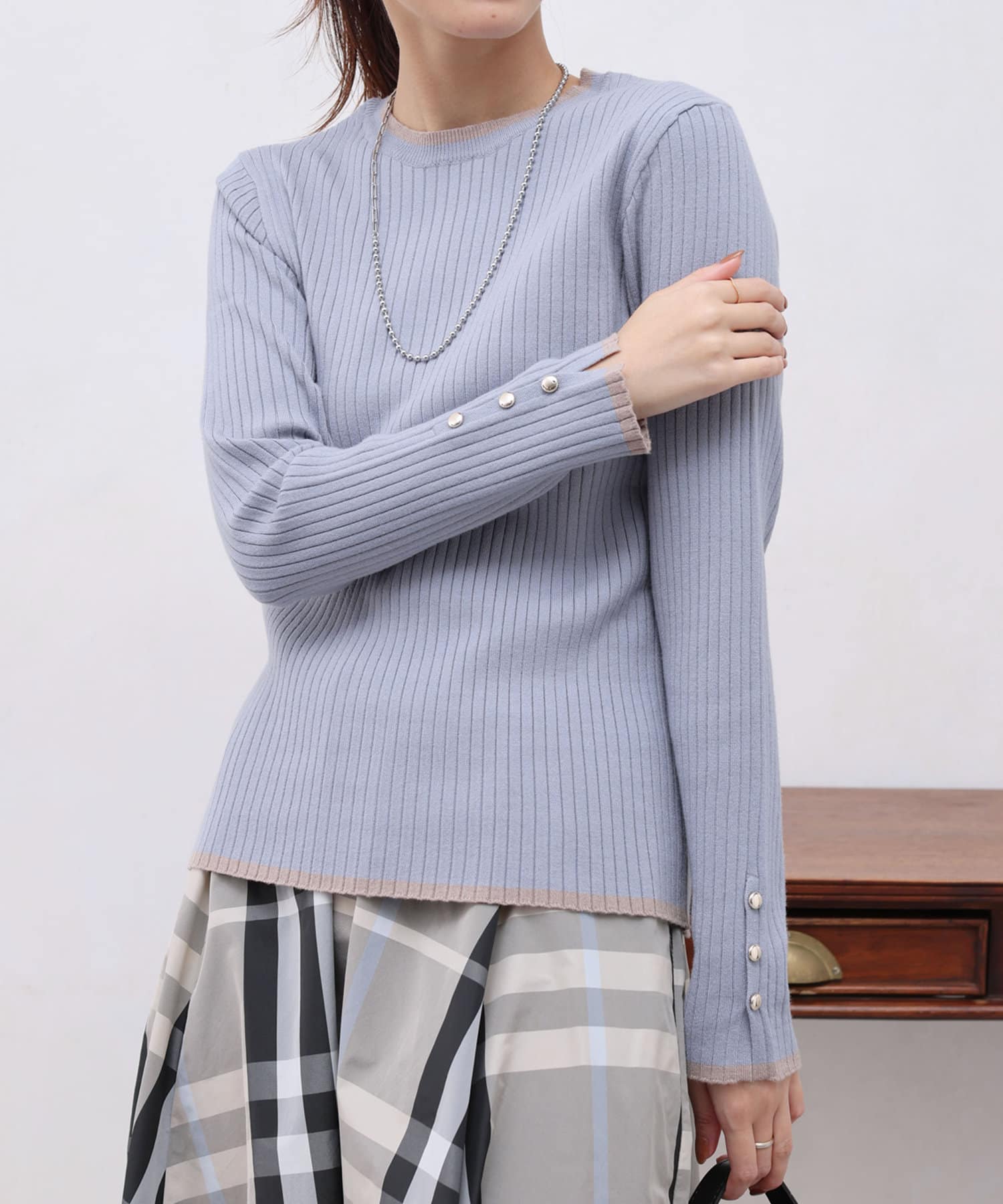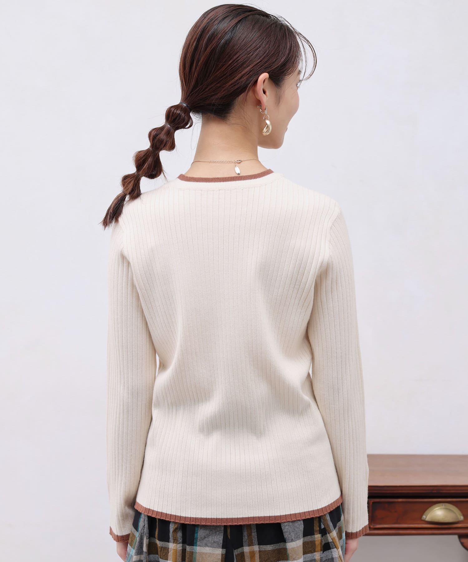 襟元と裾を配色にし、袖口にゴールドボタンをあしらったシェトワ定番のリブプルオーバーです。