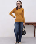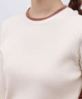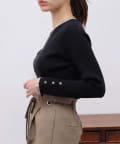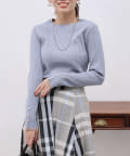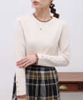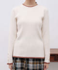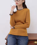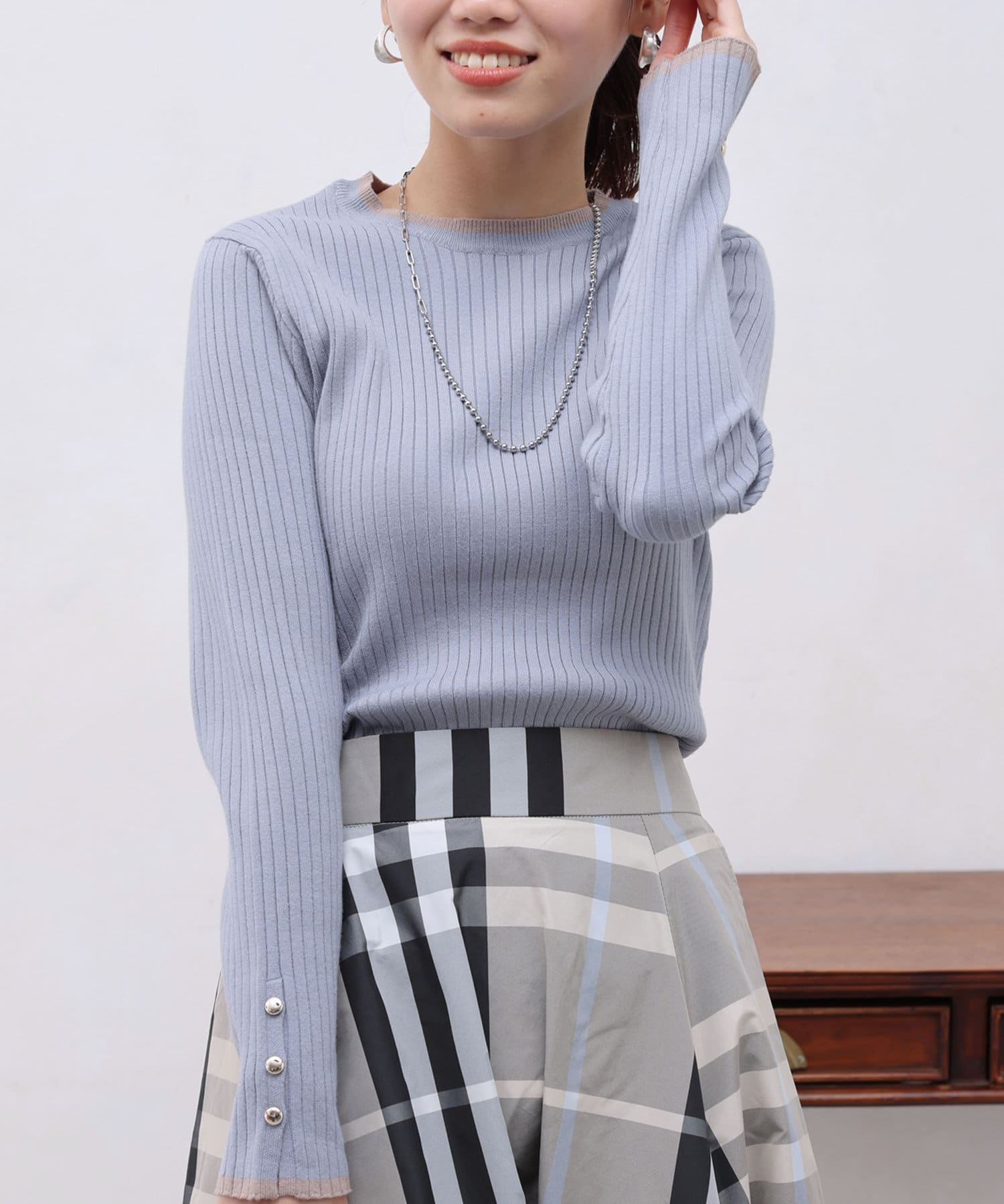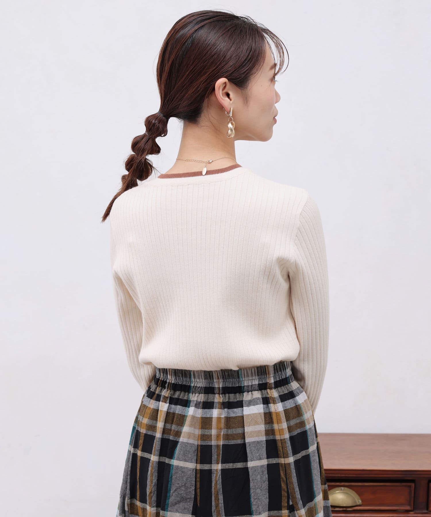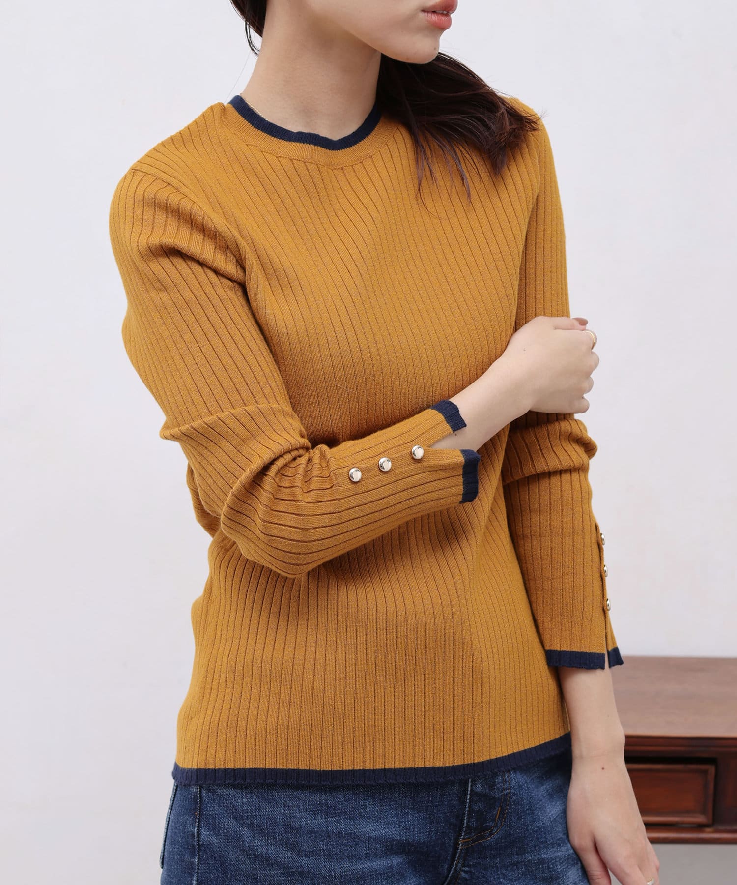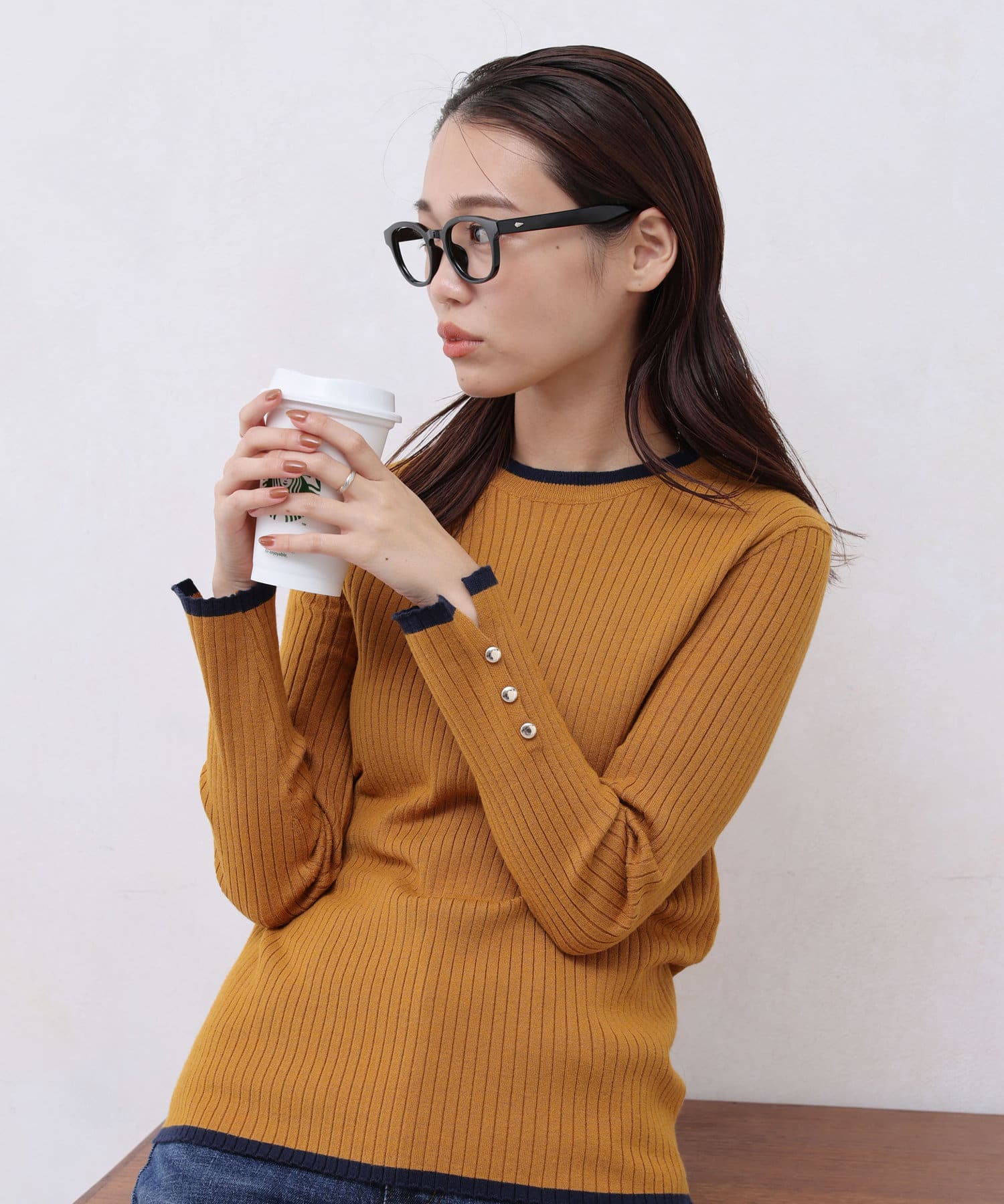 襟元と裾を配色にし、袖口にゴールドボタンをあしらったシェトワ定番のリブプルオーバーです。