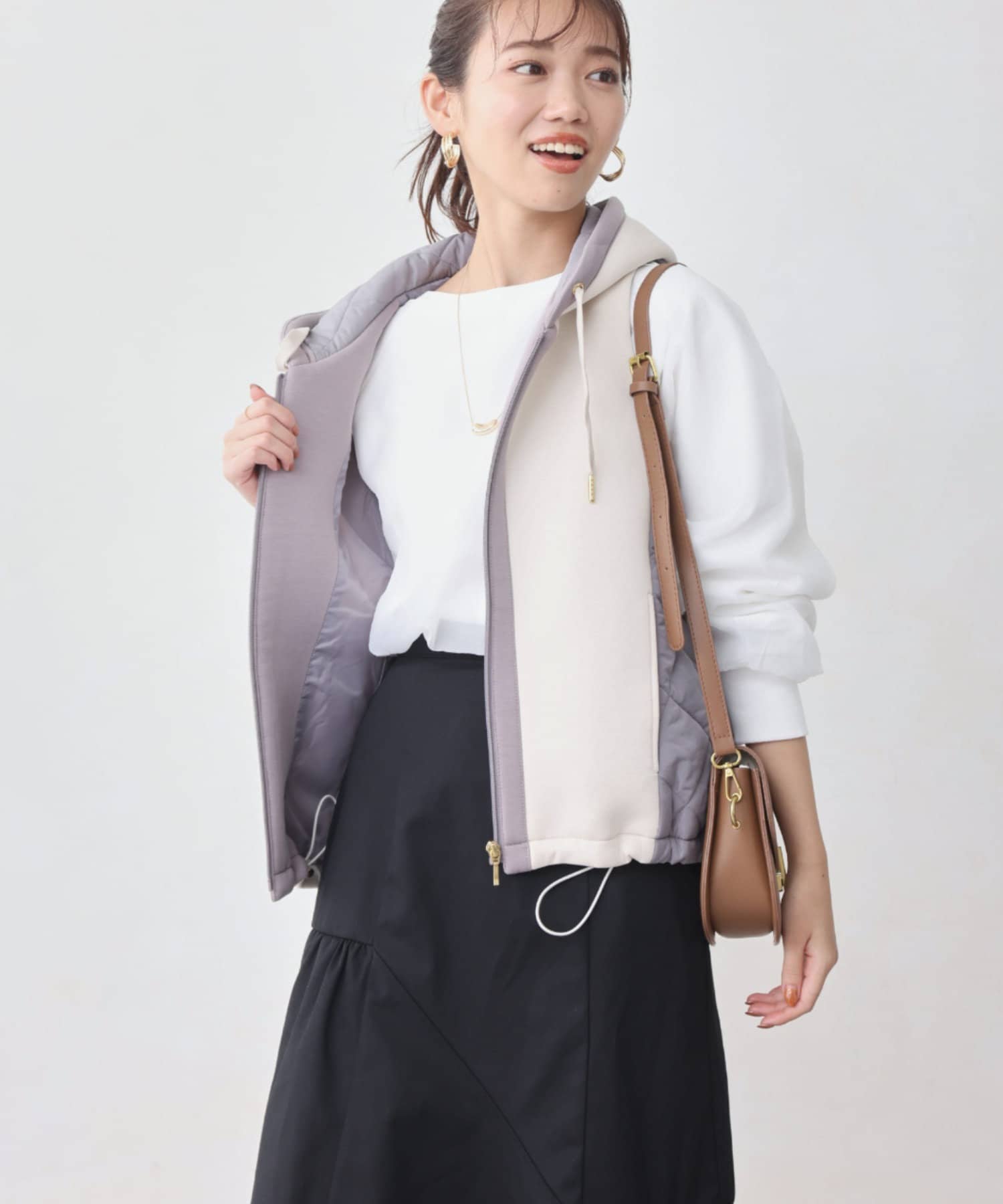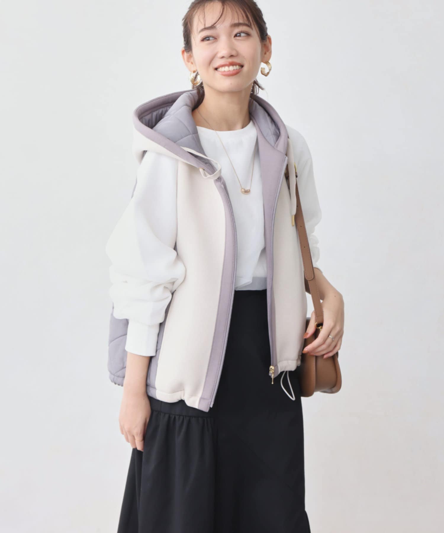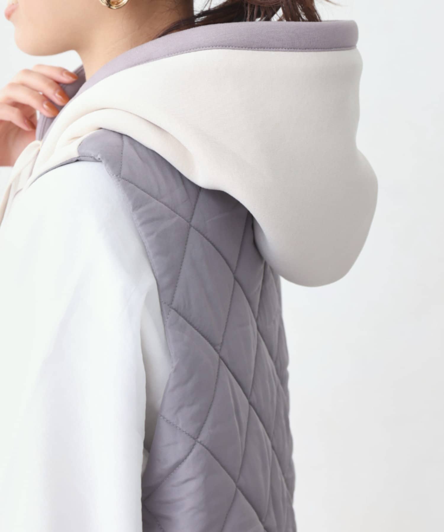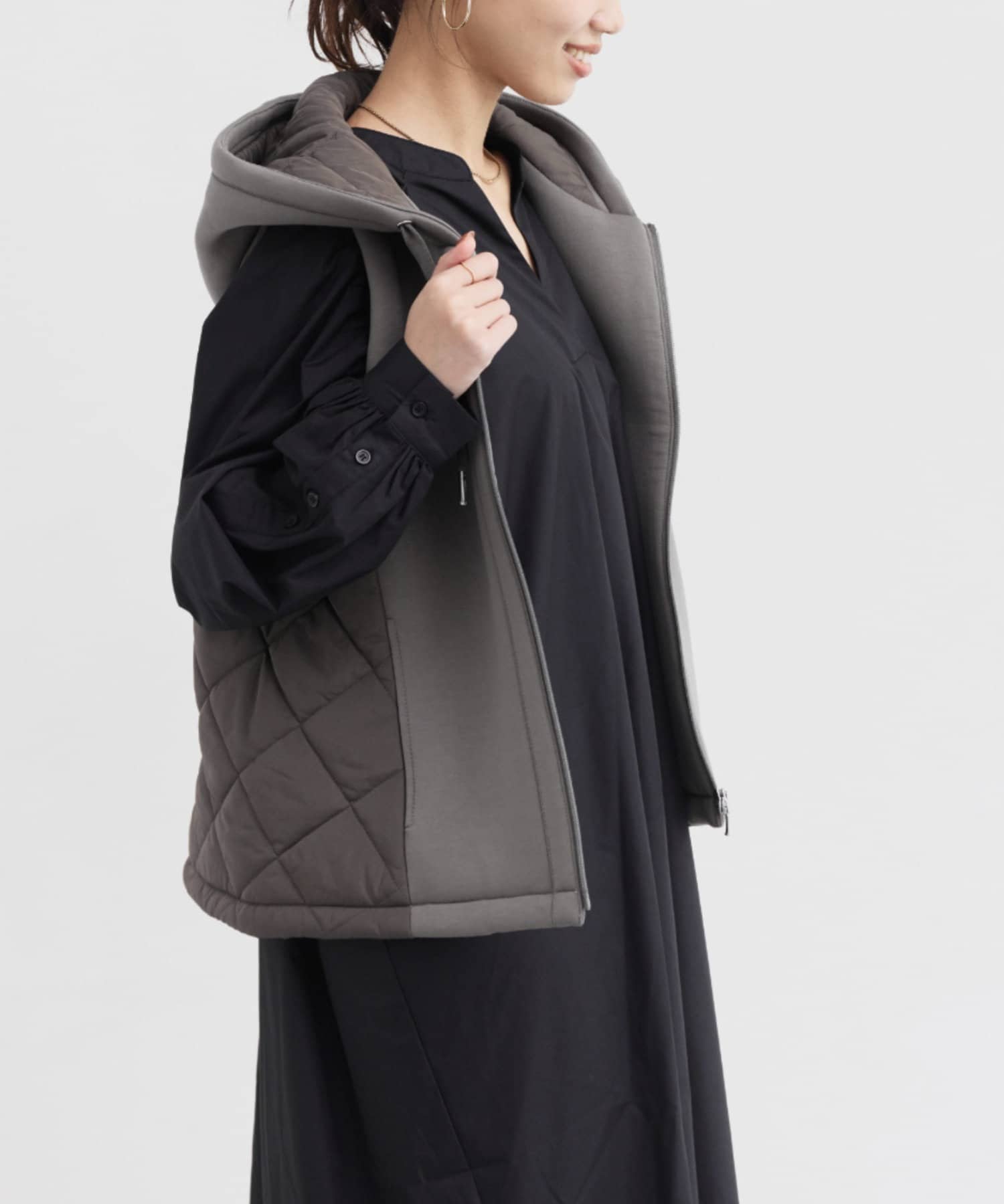 裾にはドロストがついており、格子柄風のキルティング切替とこだわりポイントも。