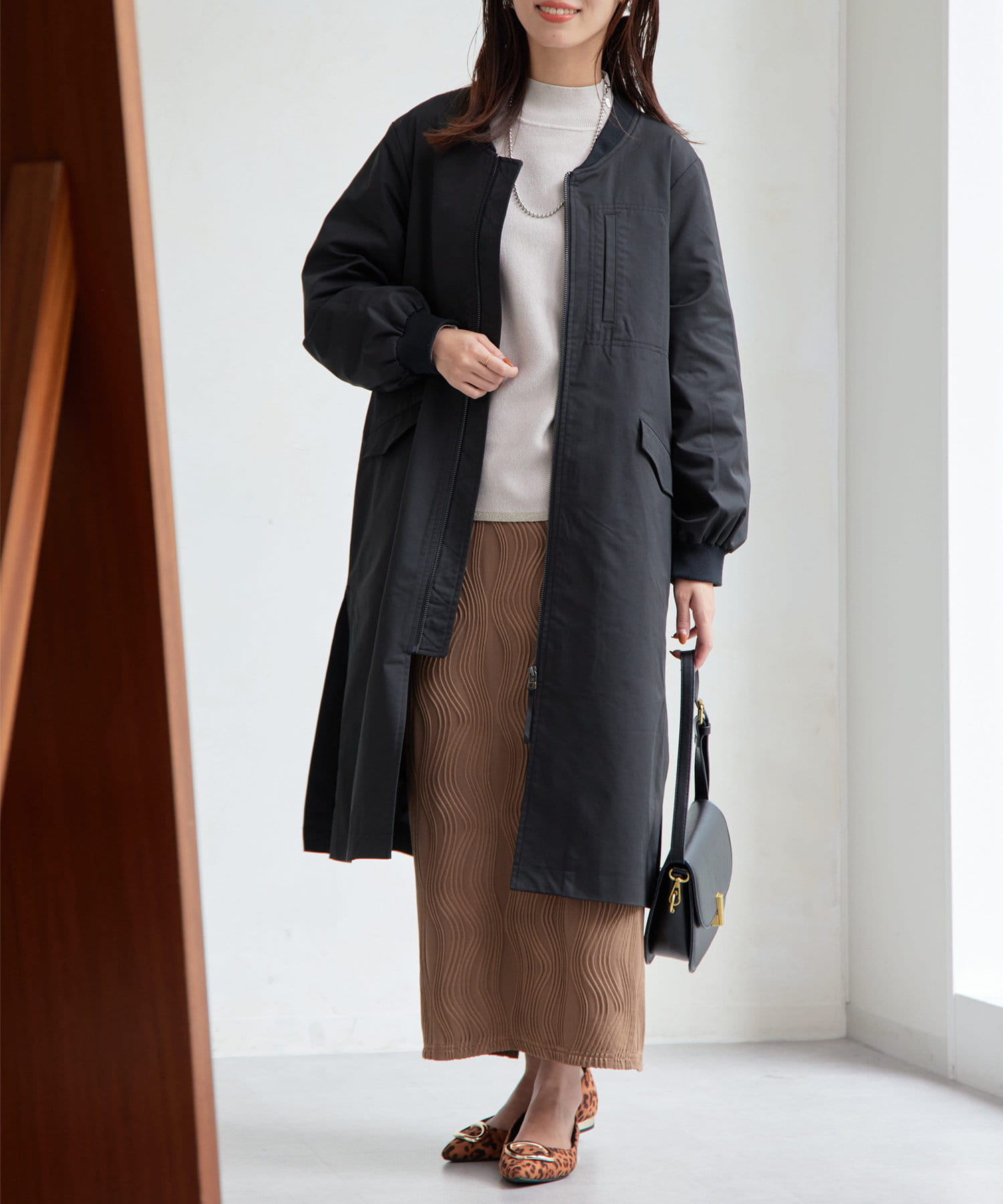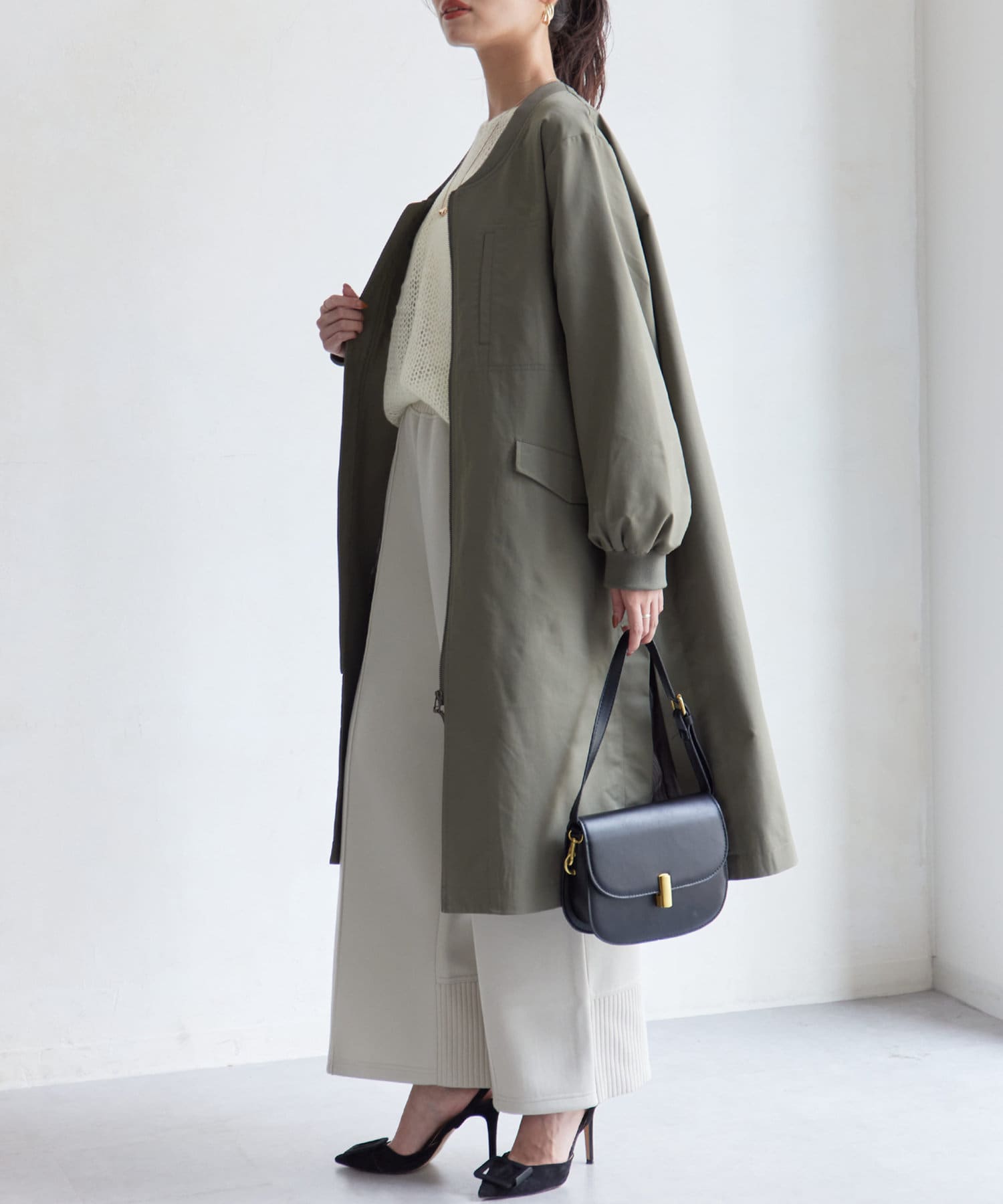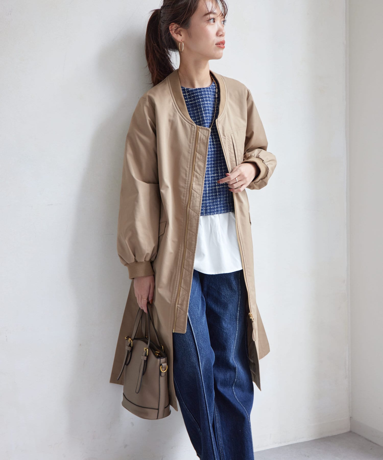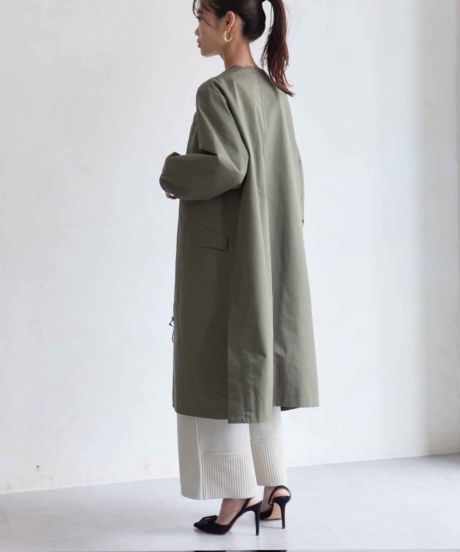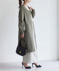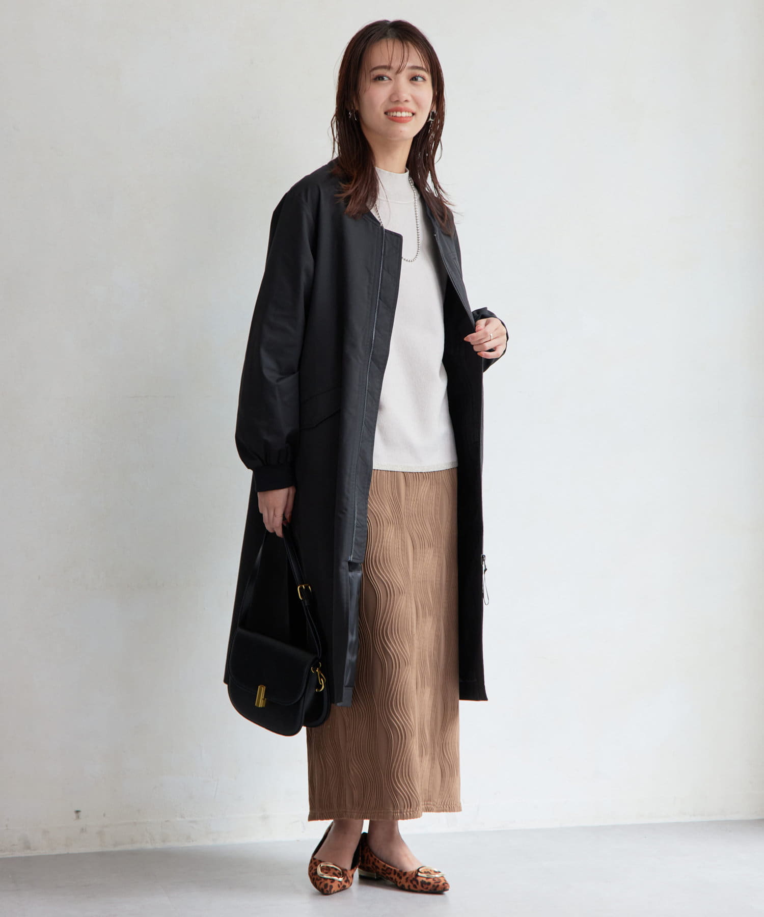 自分にまっすぐでそしてしなやかに生きる女性に向けたブランドです。ベーシックフードコートにパンチングフェイクレザーの切り替えがポイント