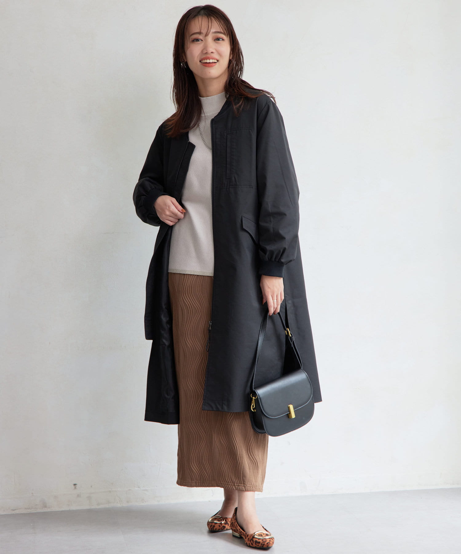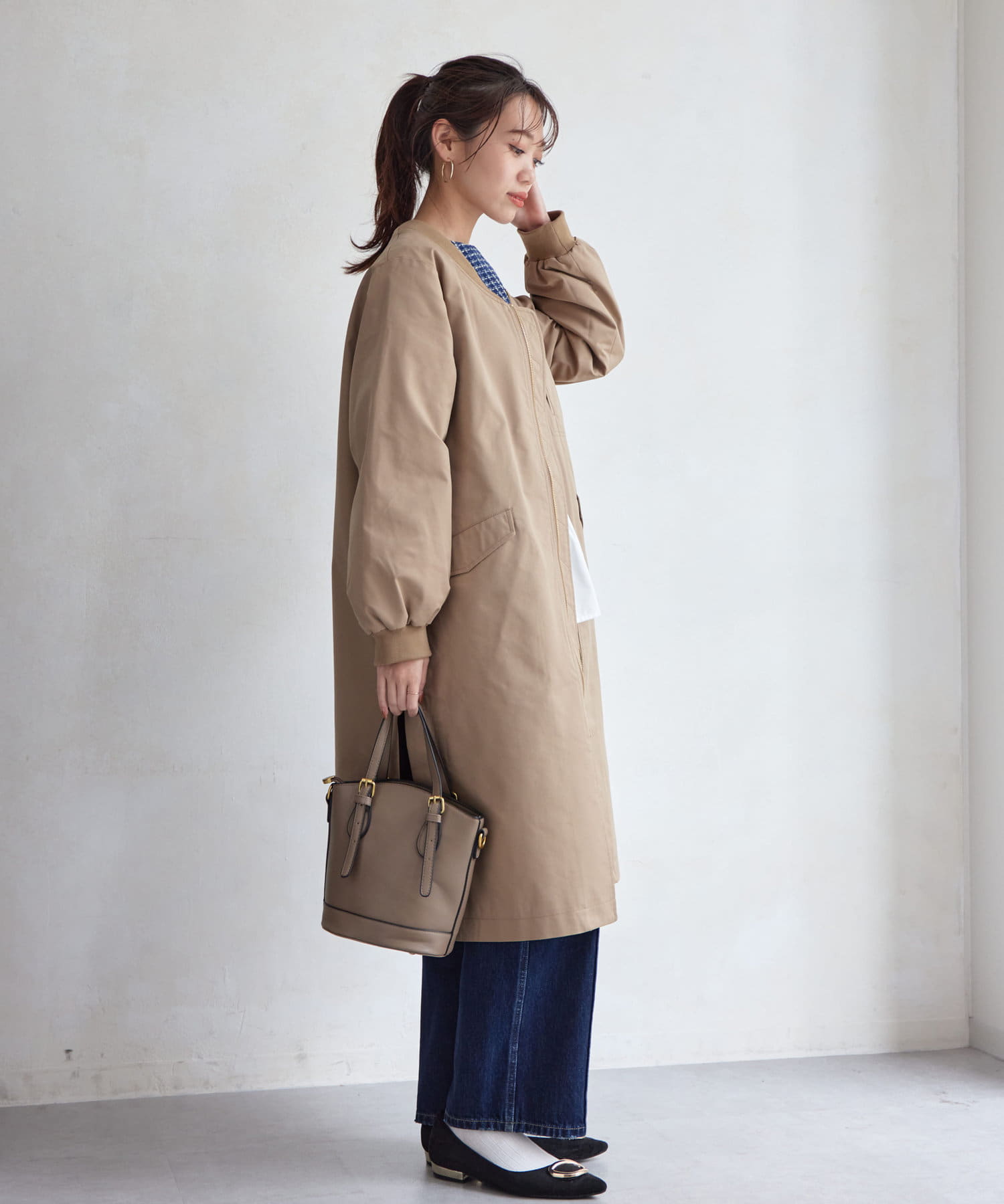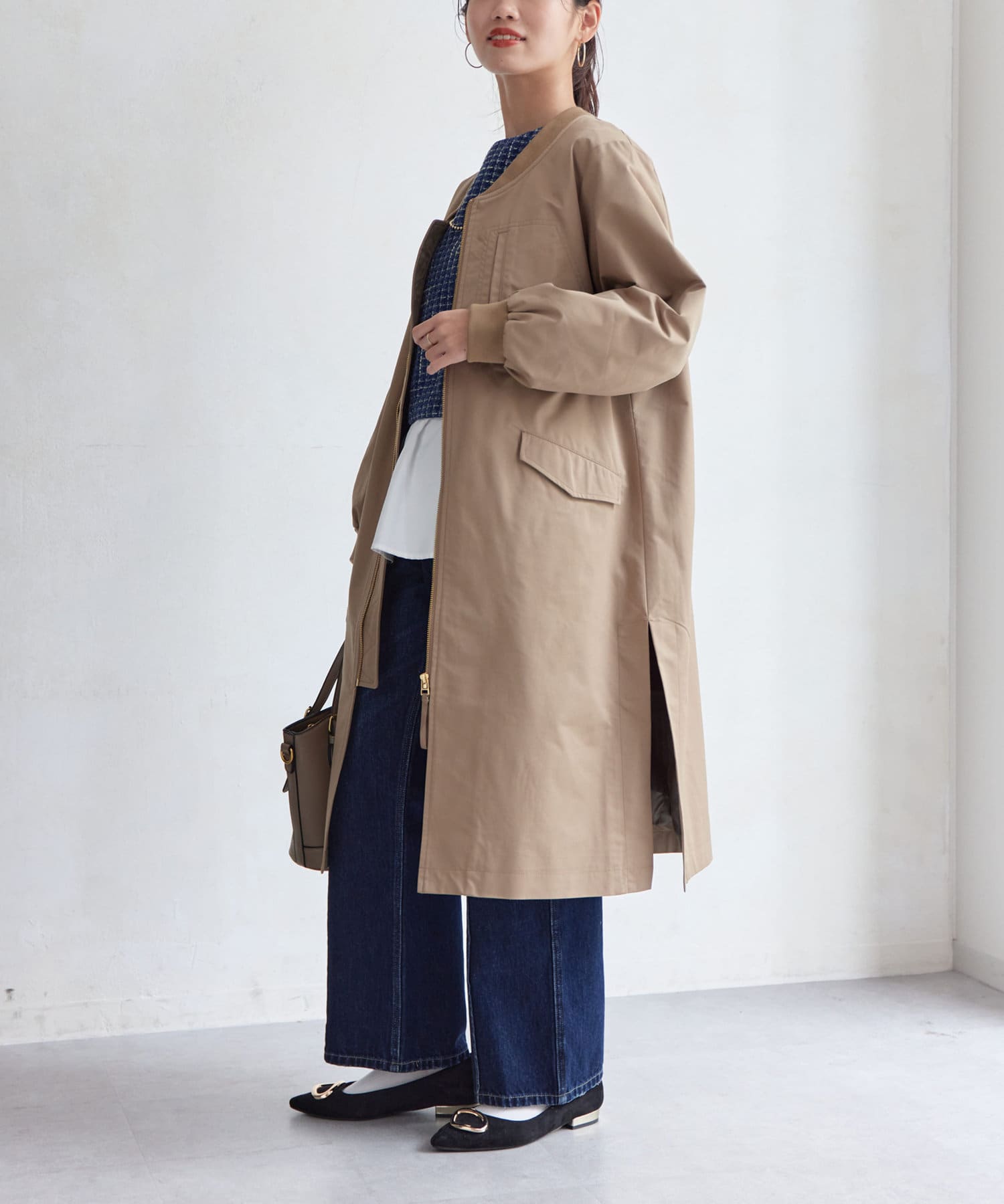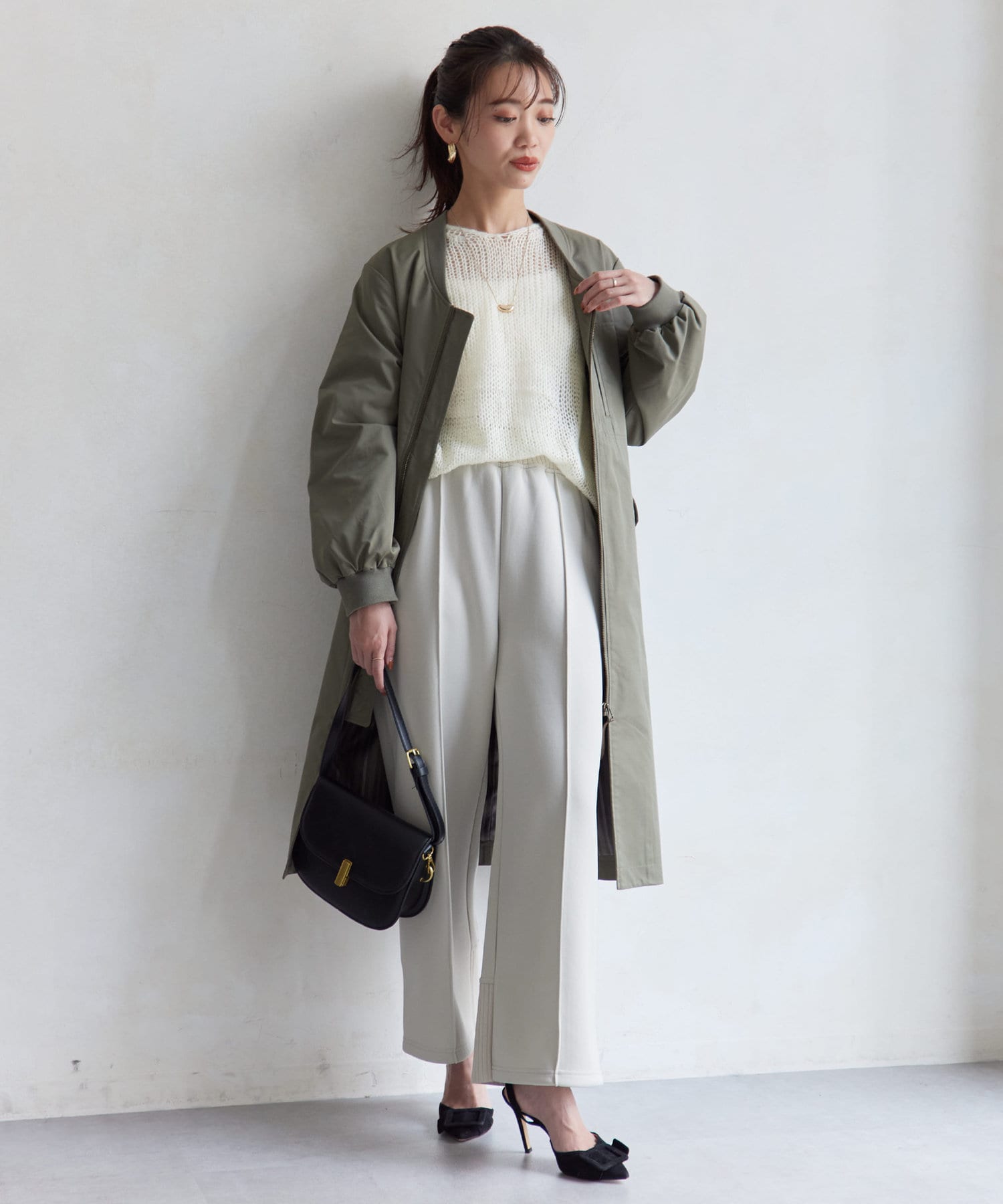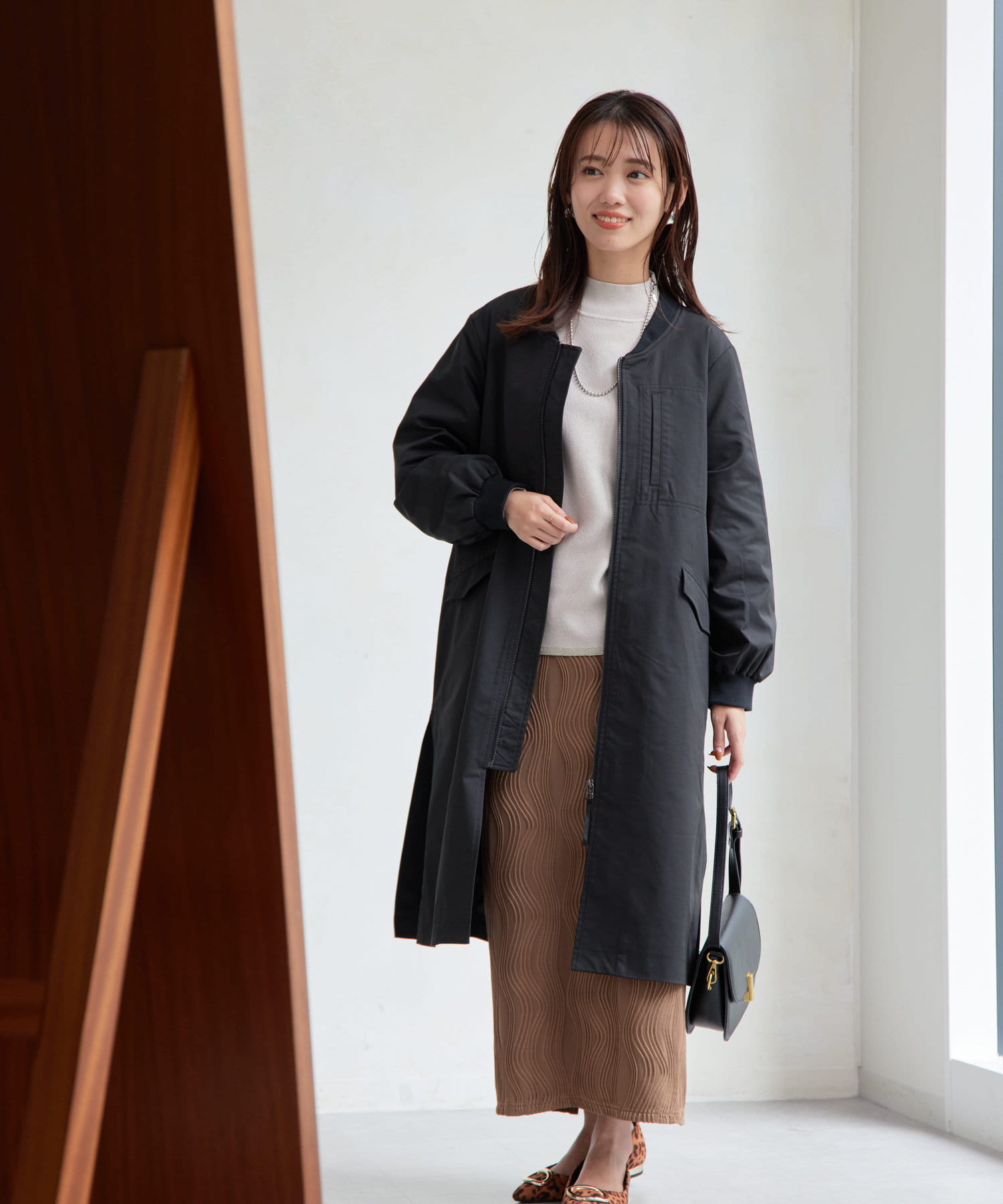 自分にまっすぐでそしてしなやかに生きる女性に向けたブランドです。ベーシックフードコートにパンチングフェイクレザーの切り替えがポイント