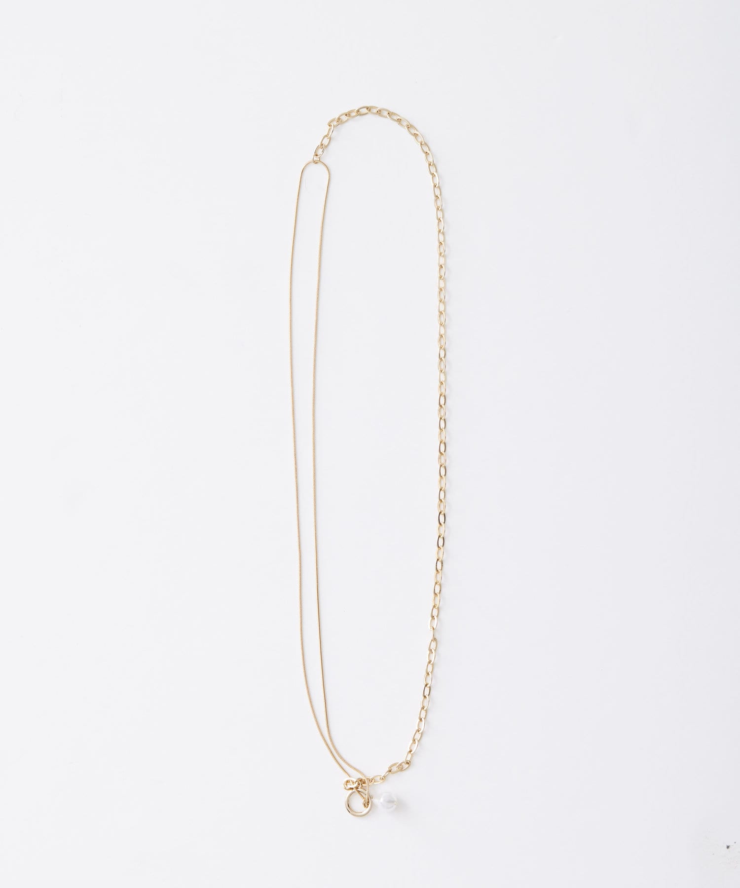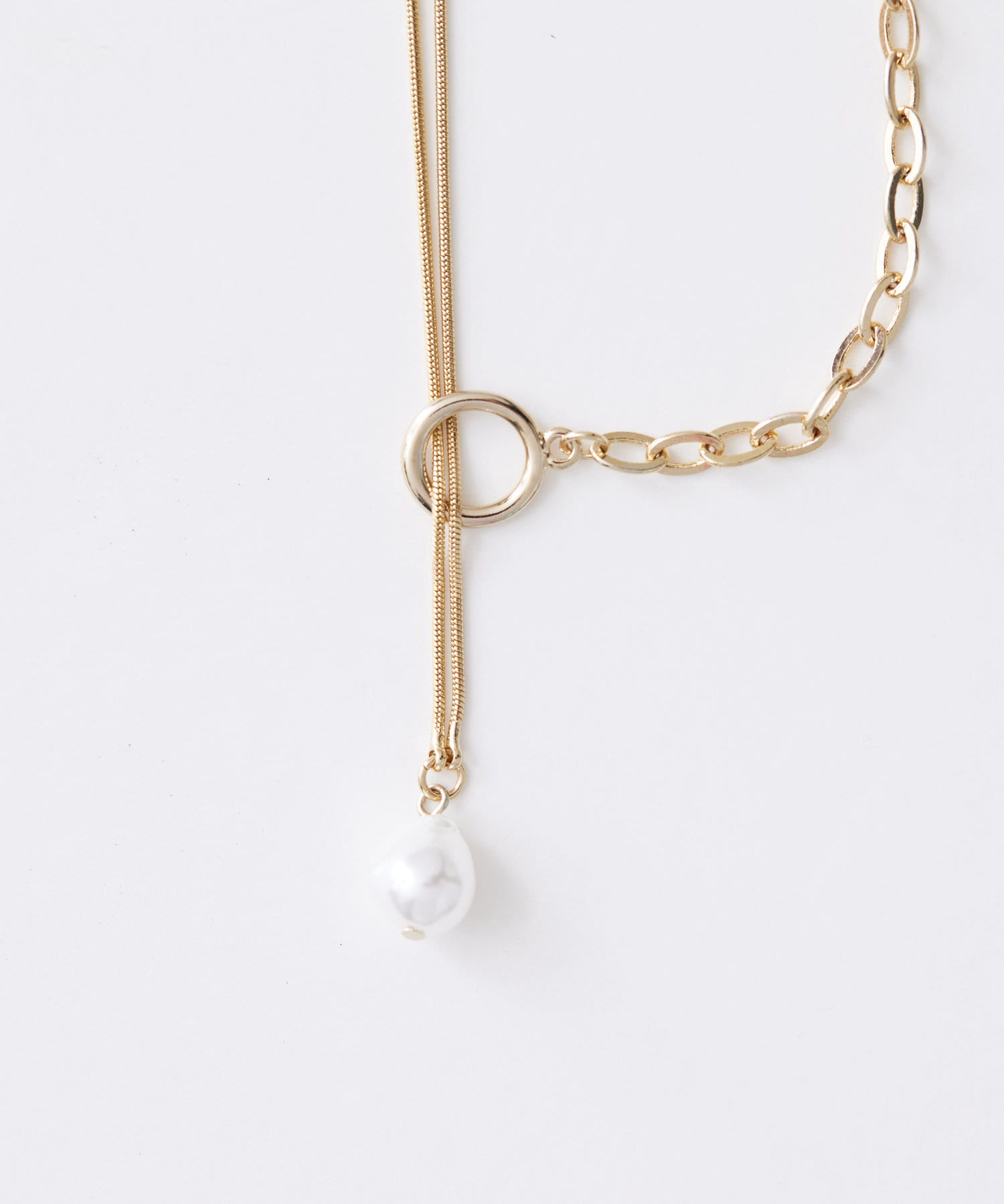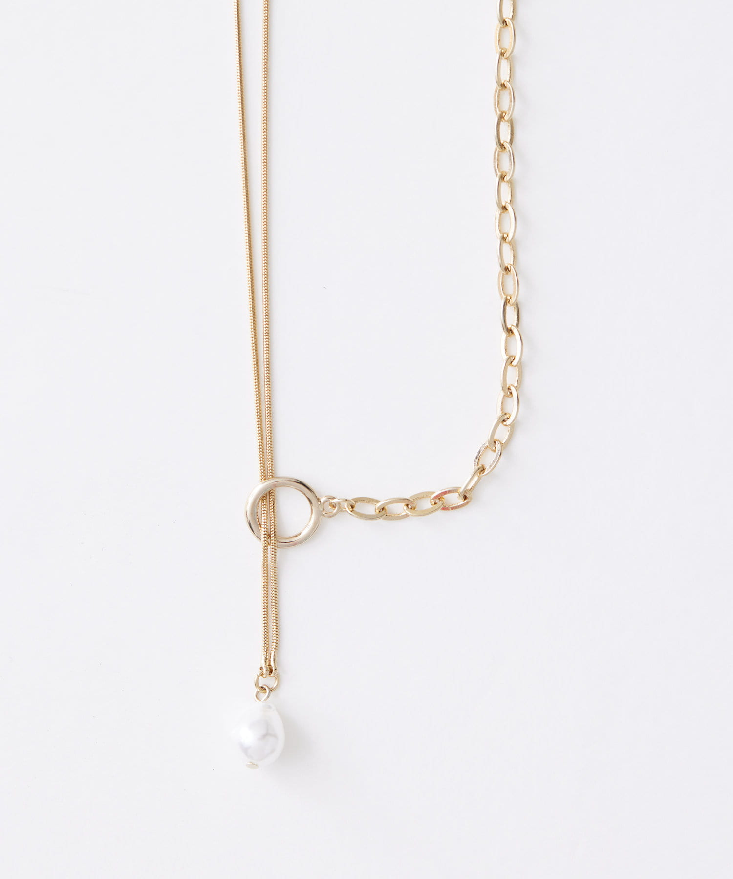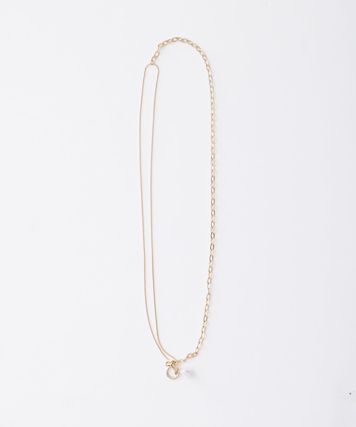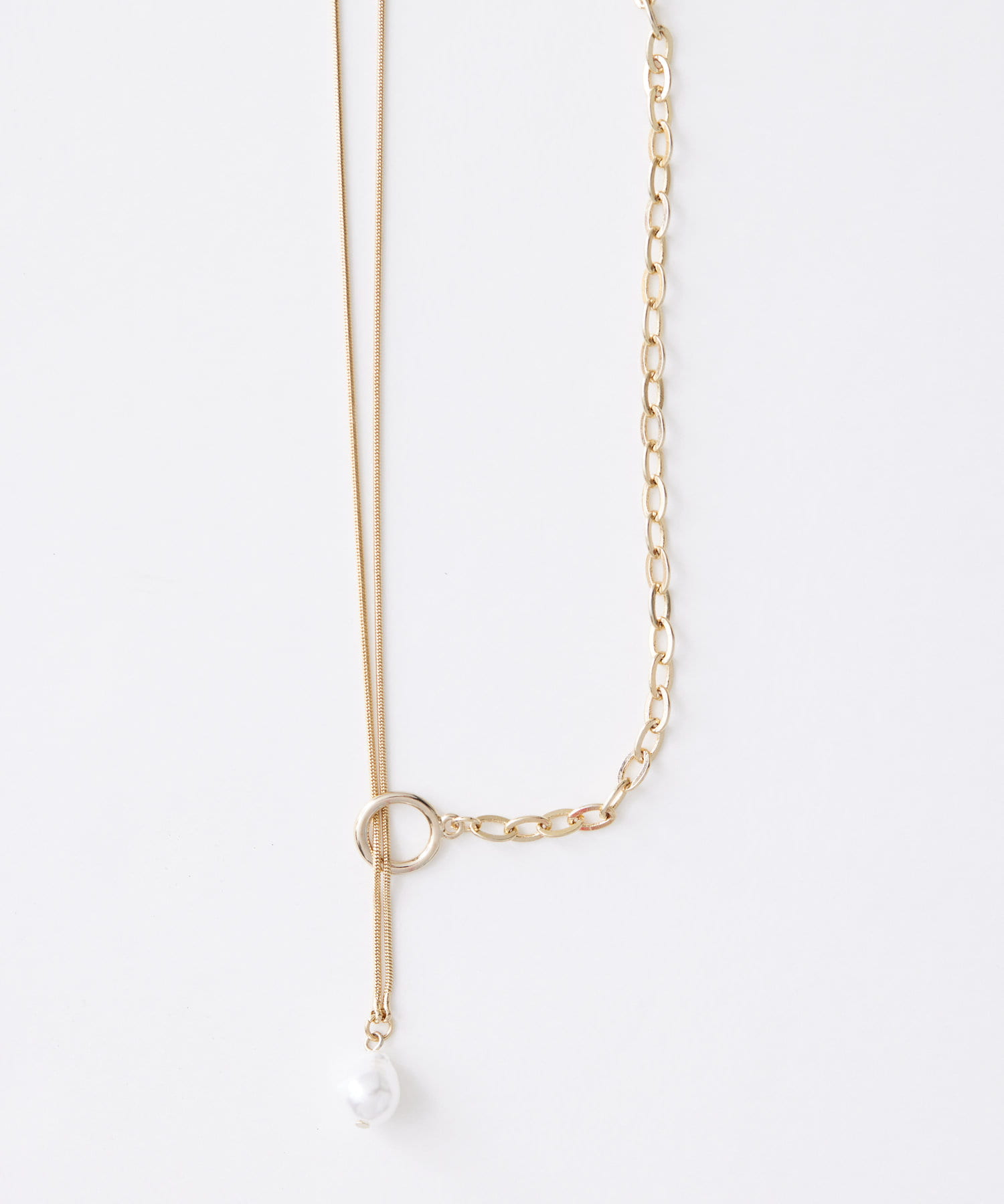 ワンポイントのパールとデザイン違いのチェーンがアクセントになるロングネックレス
