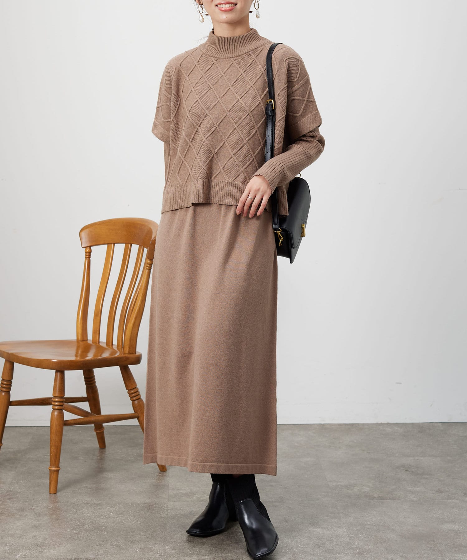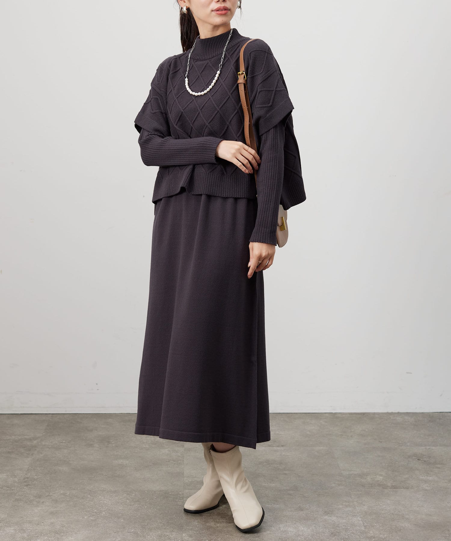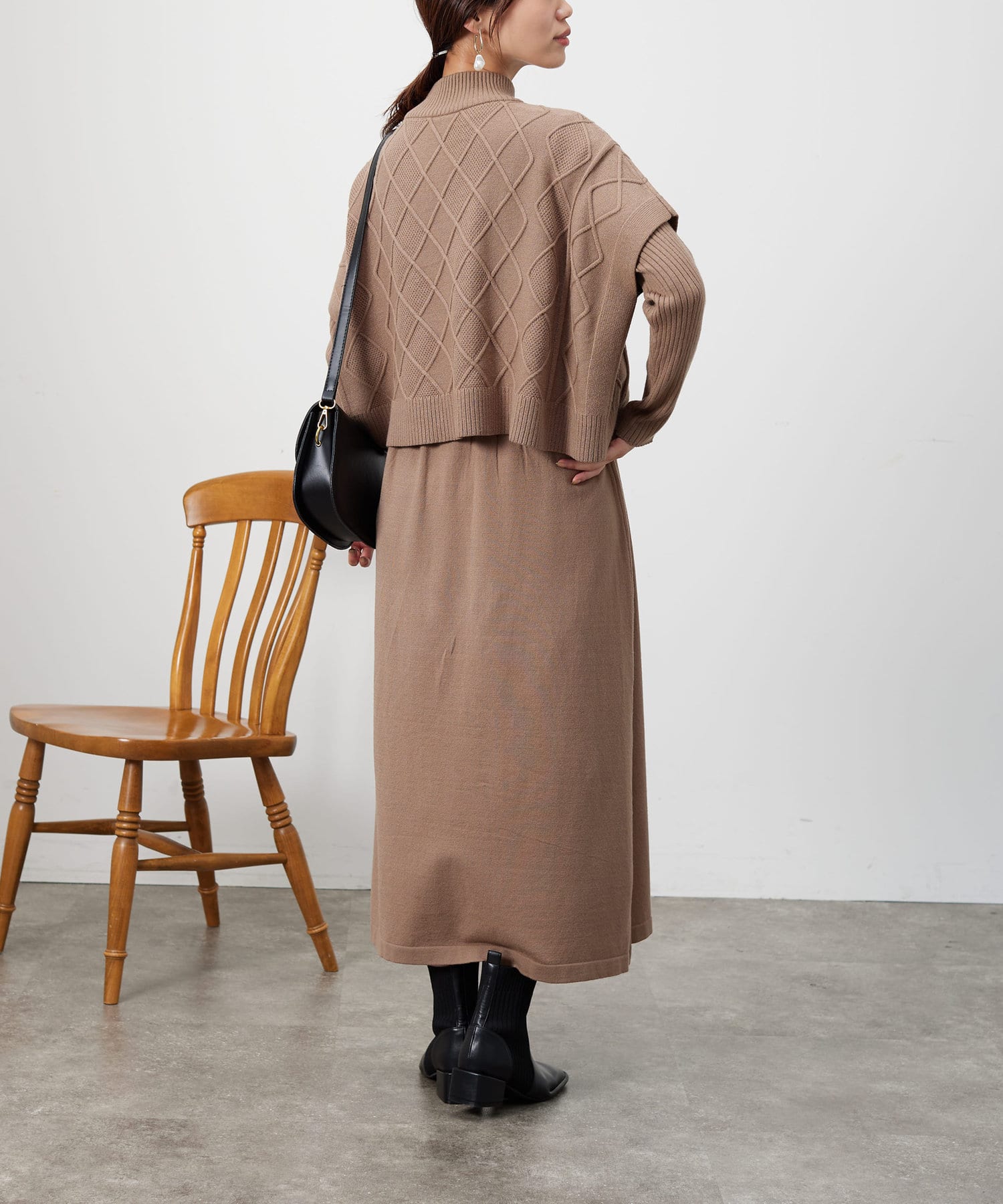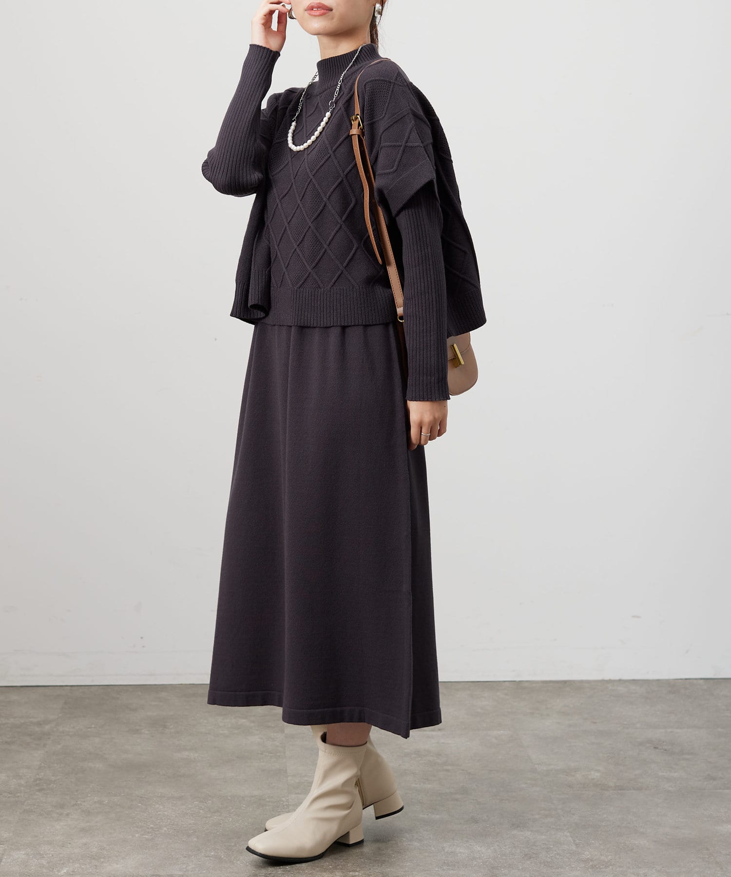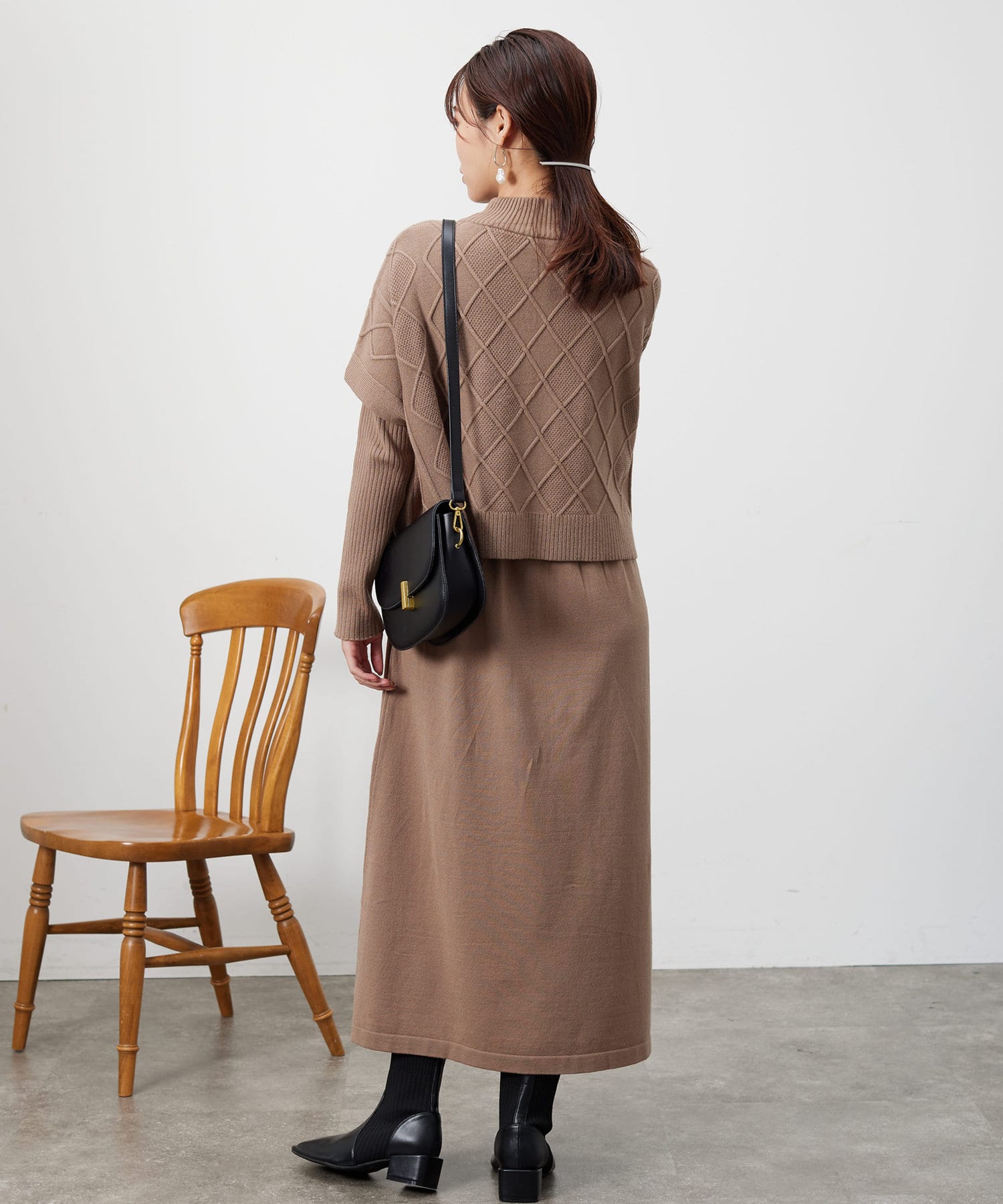 ケーブルのニットトップスとワンピースのセットアイテム。