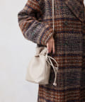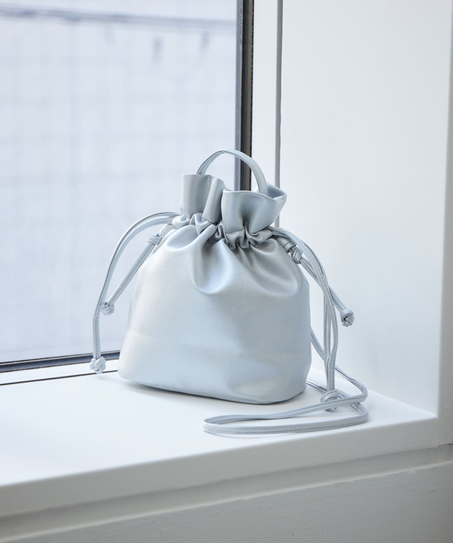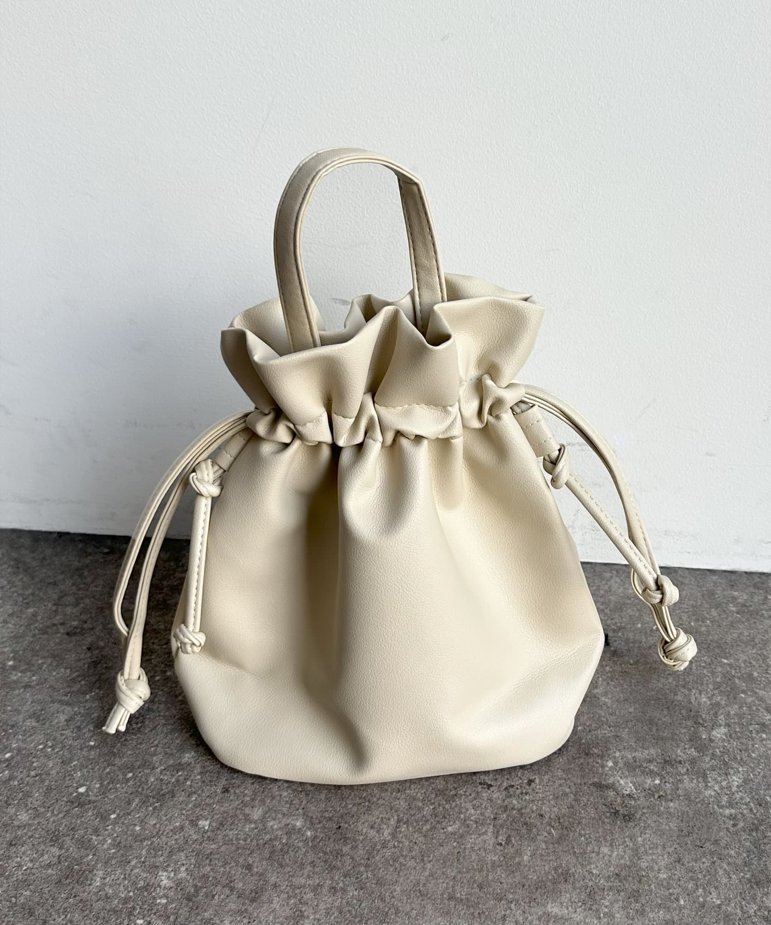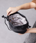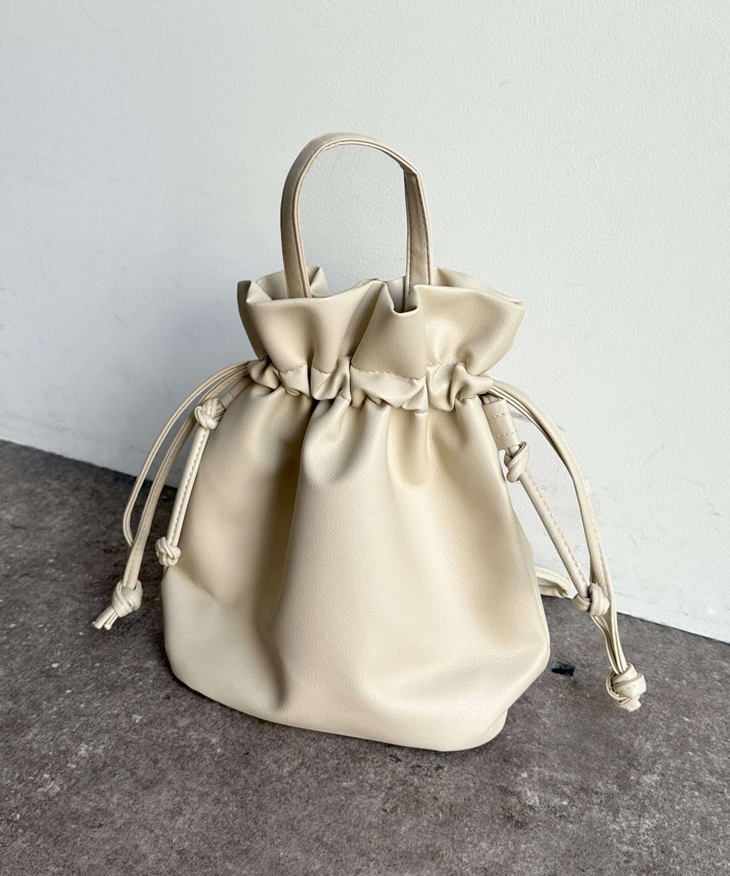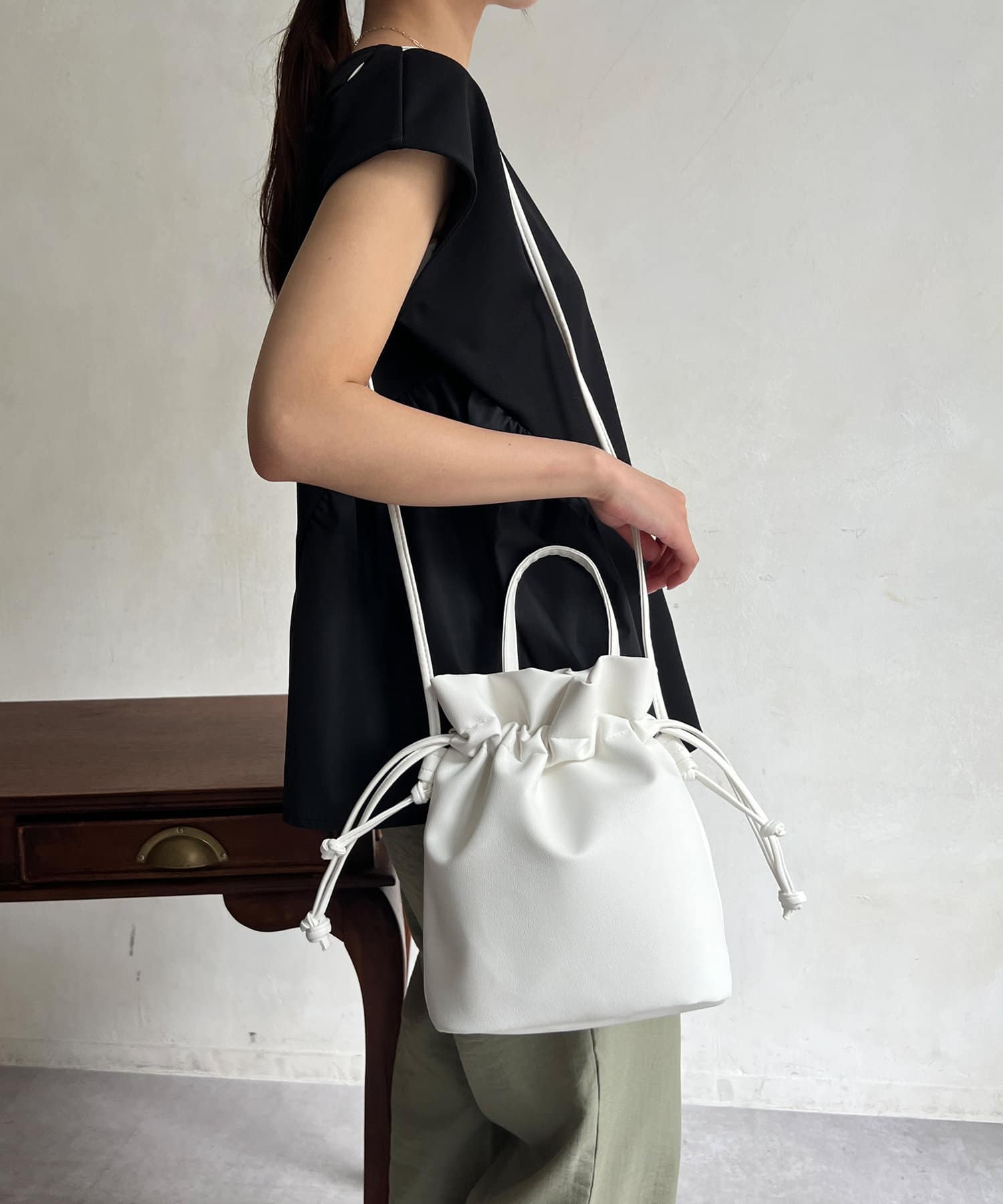 巾着の丸みのあるデザインが女性らしい印象に。