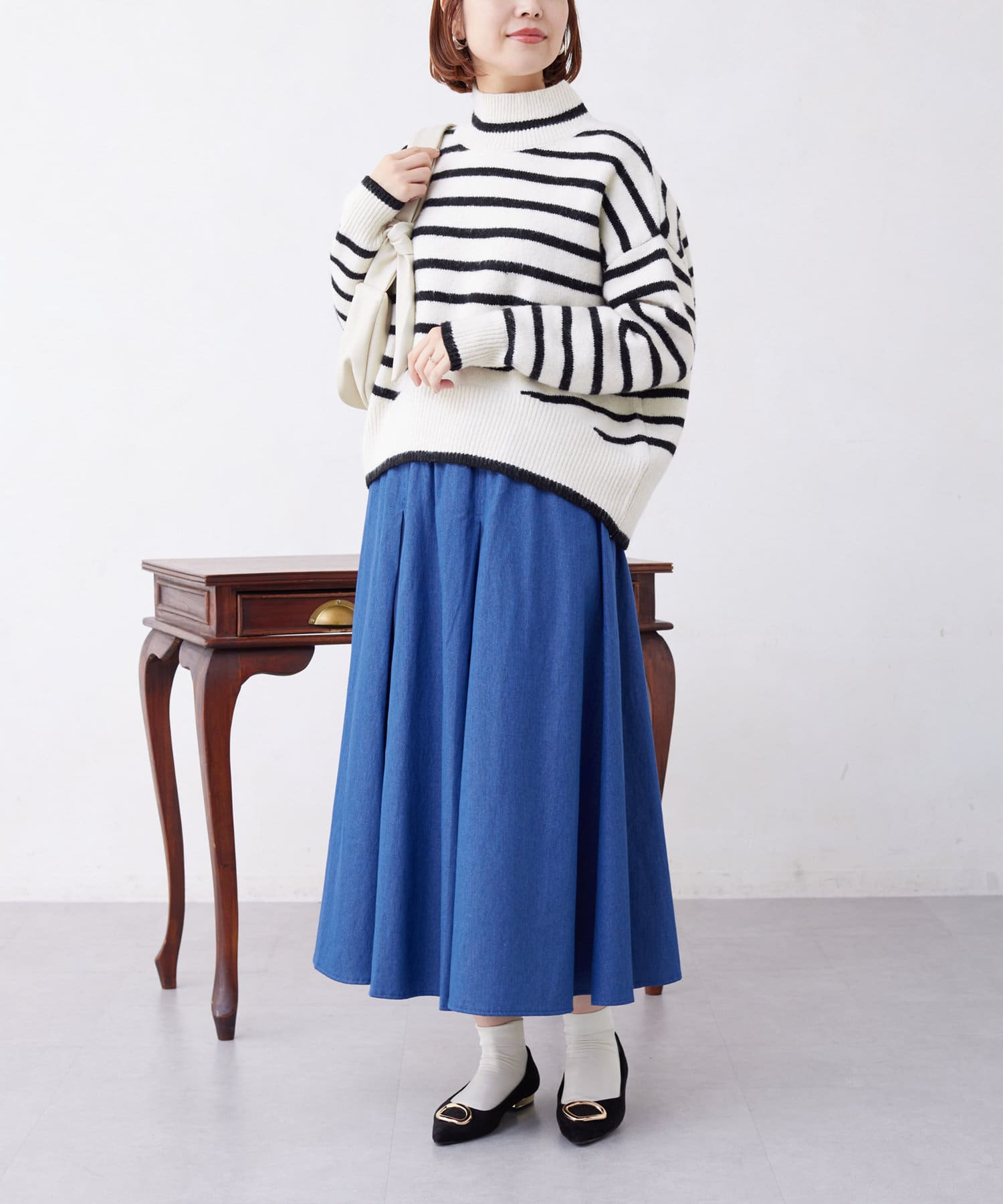 光沢感のある上品なアイテムなのできれいめニットやカーディガンや、