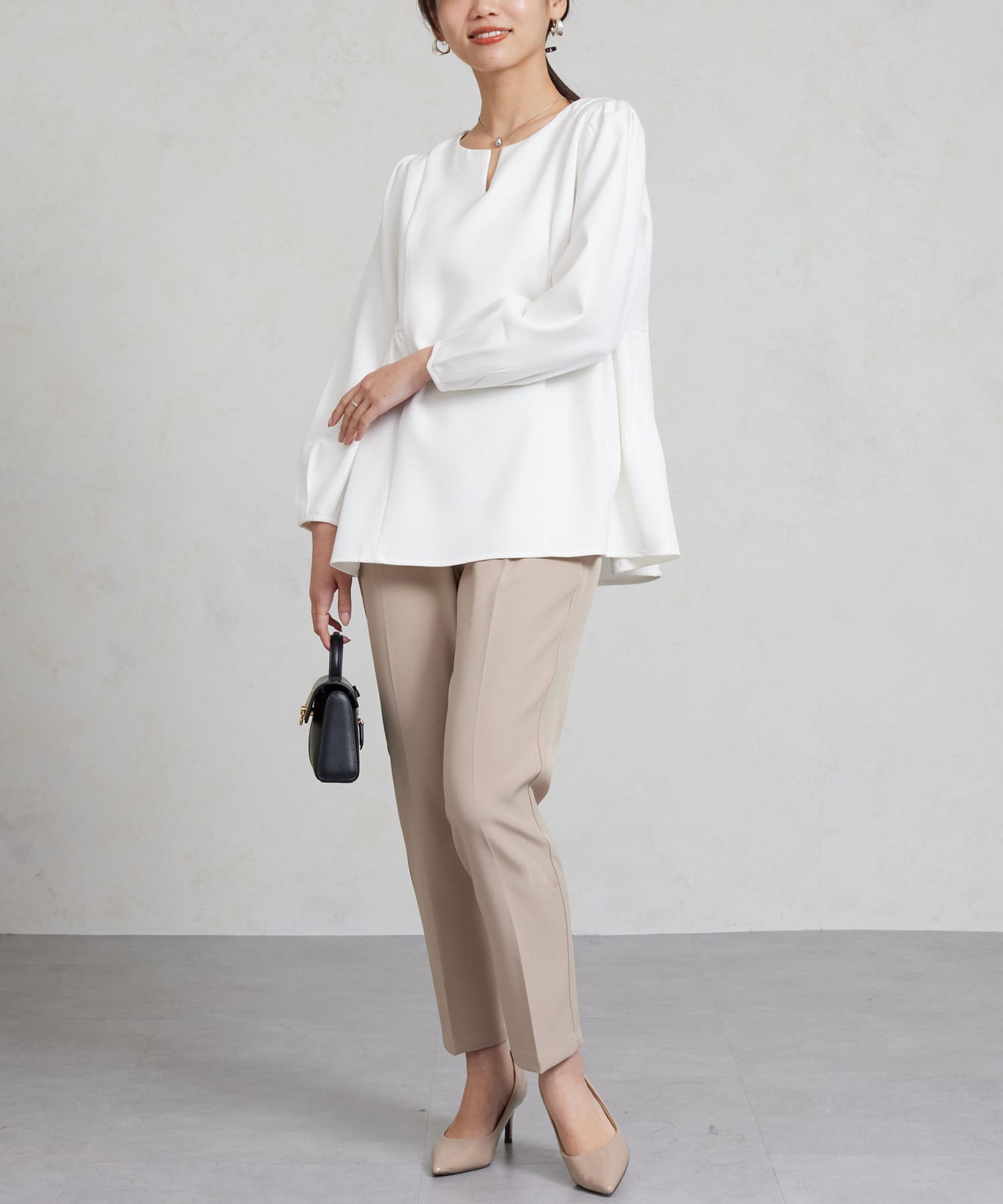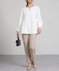 タックの入ったシルエットは嬉しい着痩せ効果も。