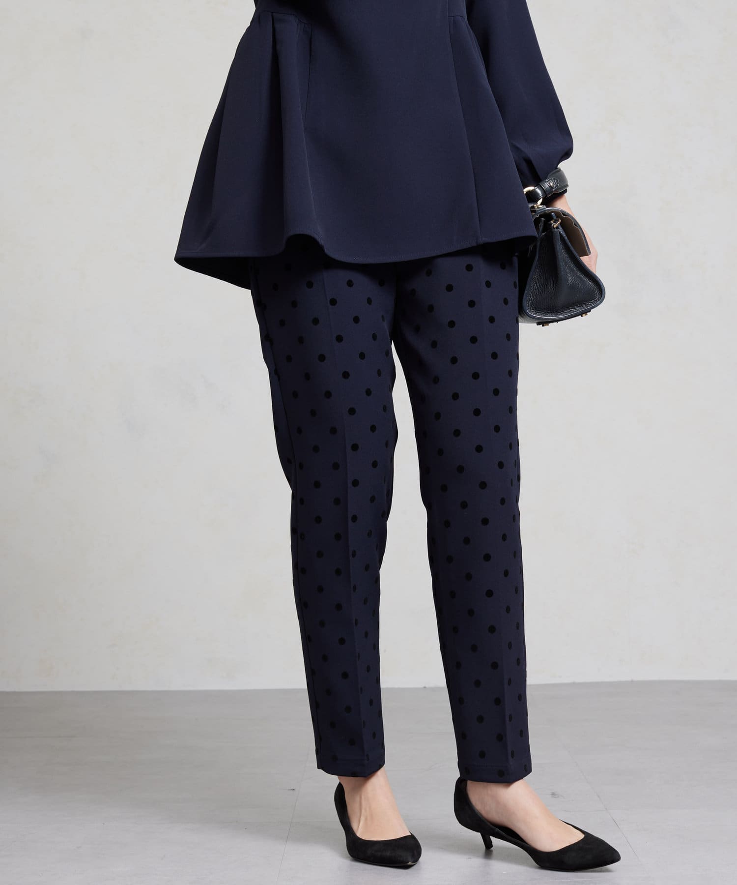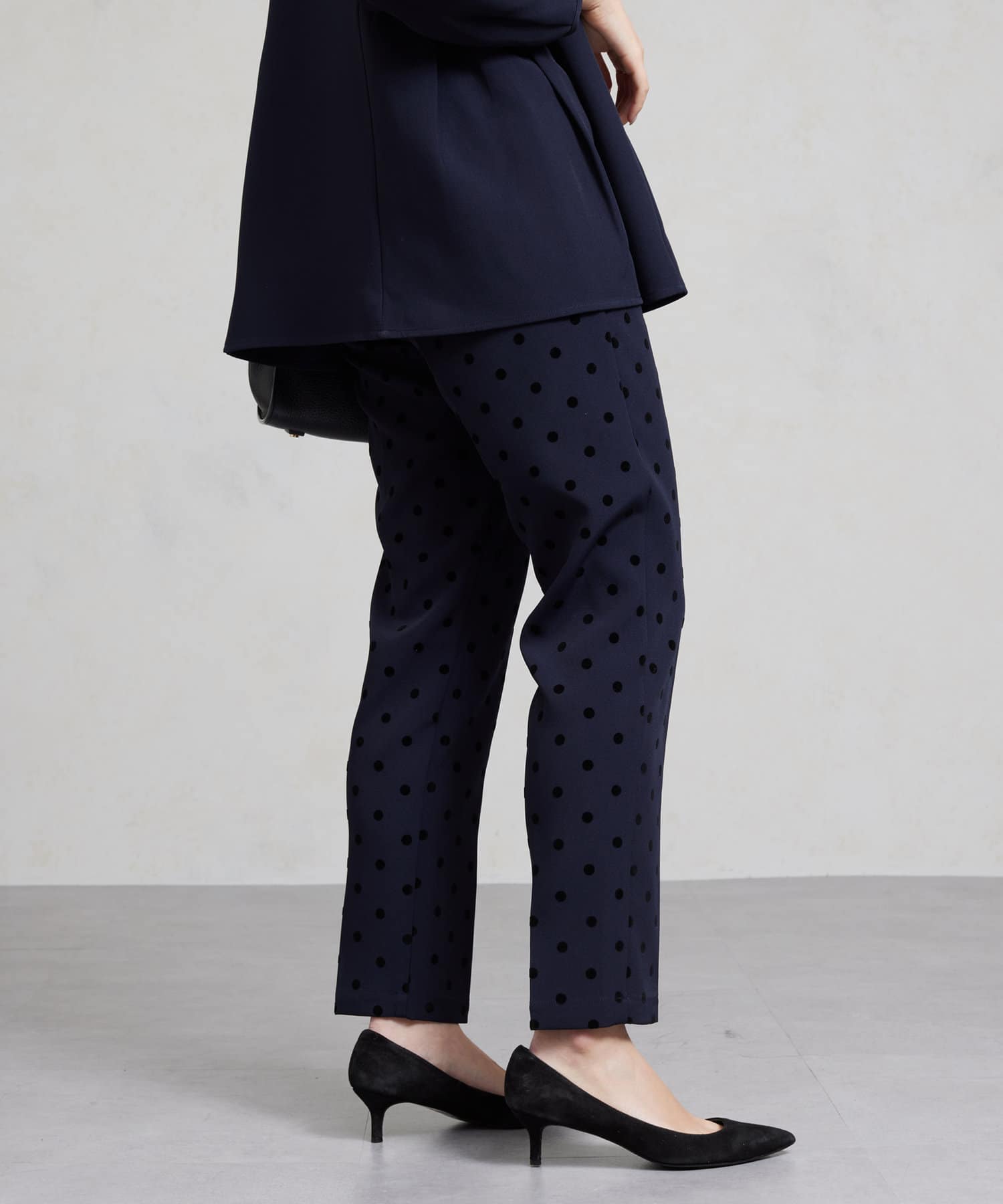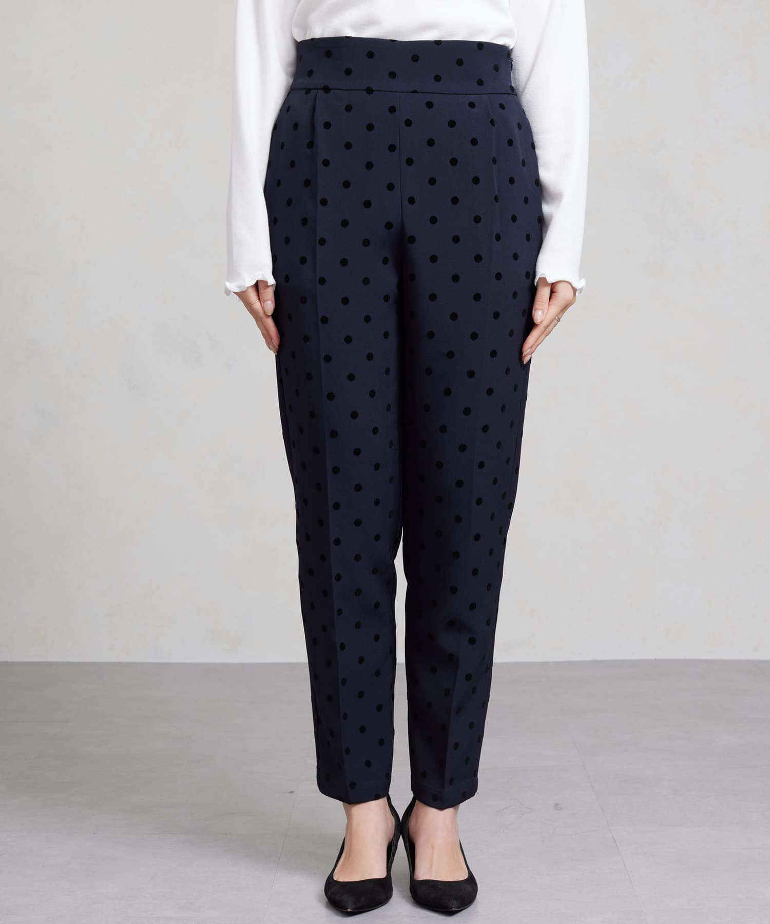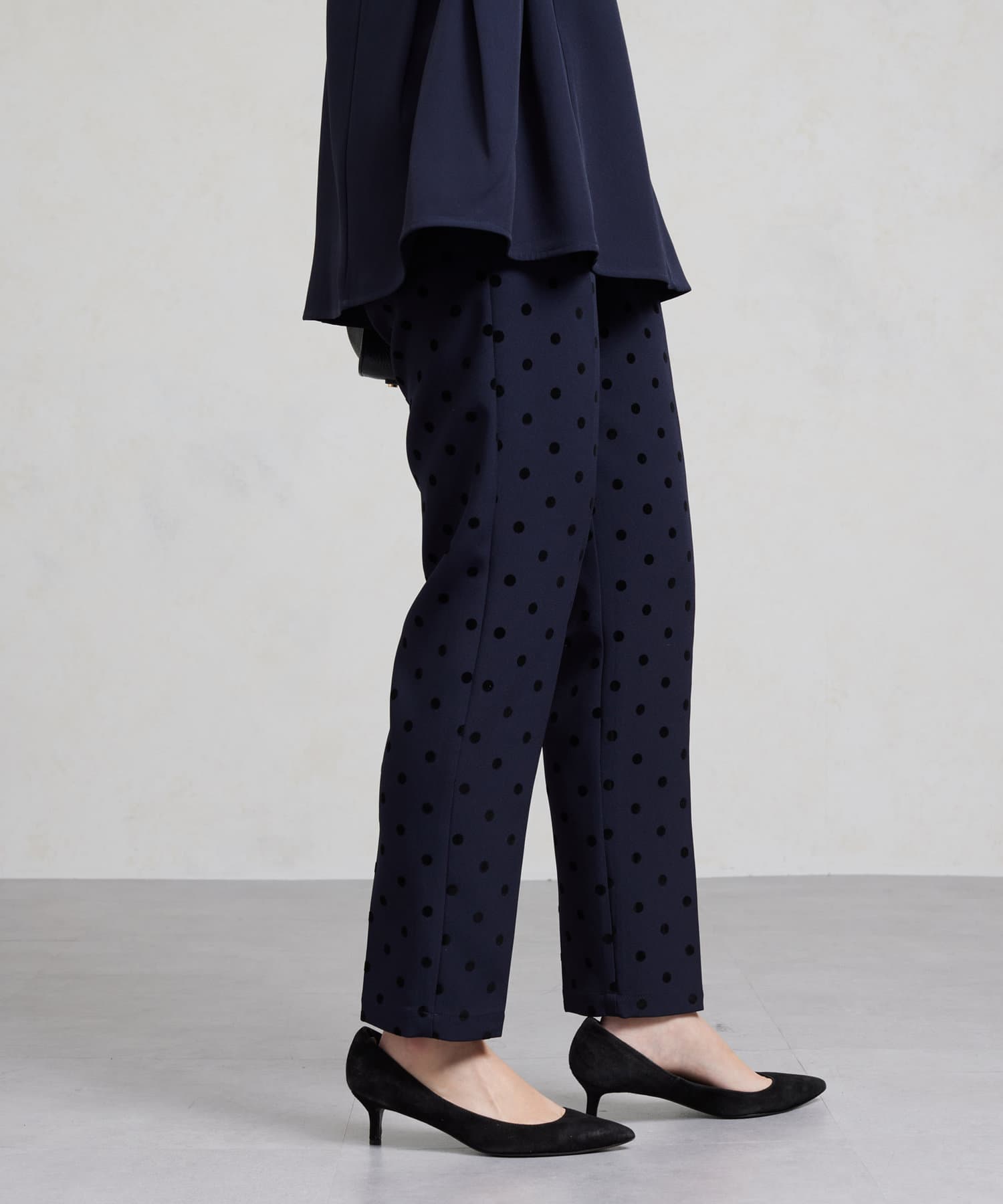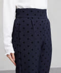 セレモニーにもおすすめ!無地とフロッキードットの上品テーパードパンツ