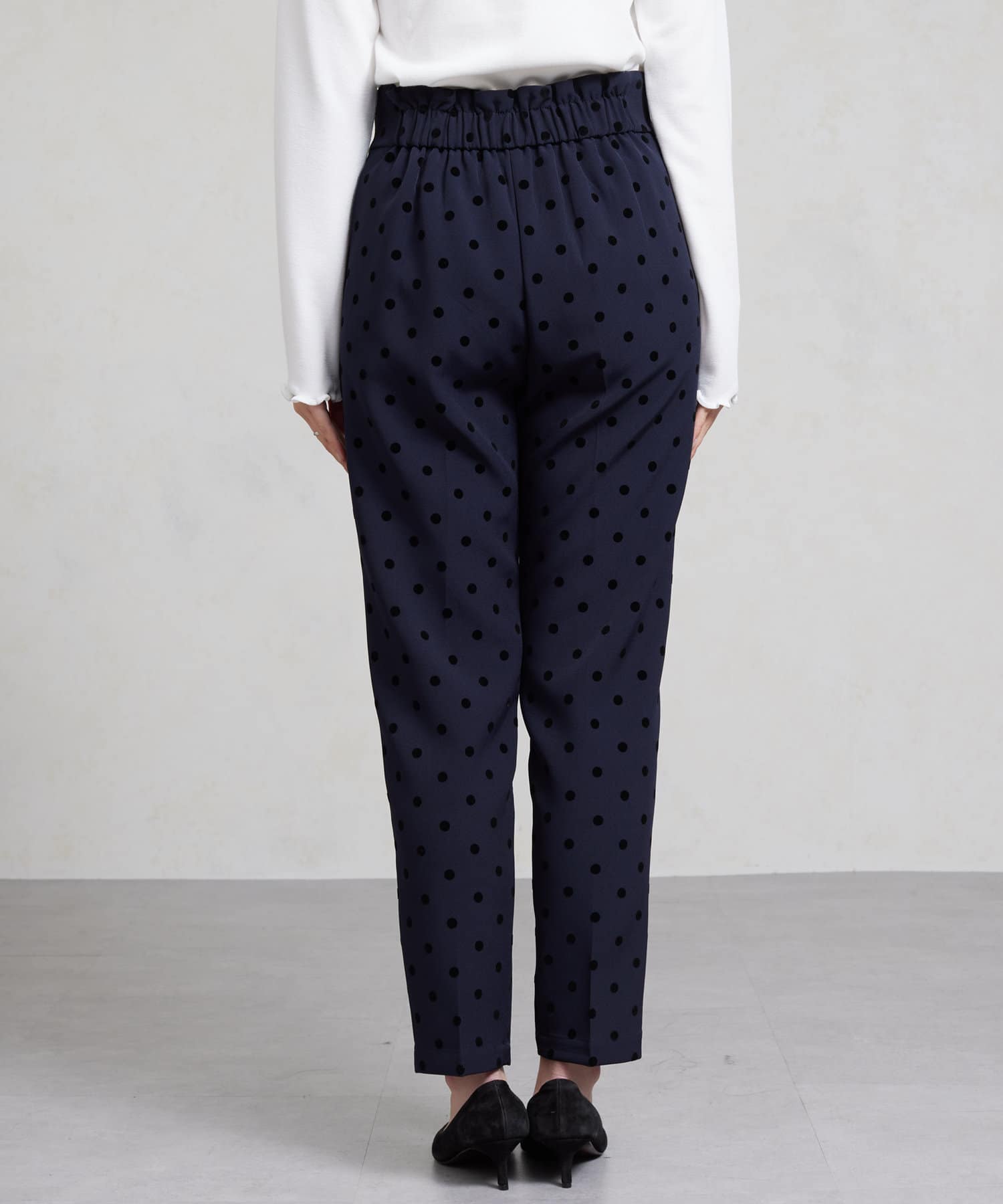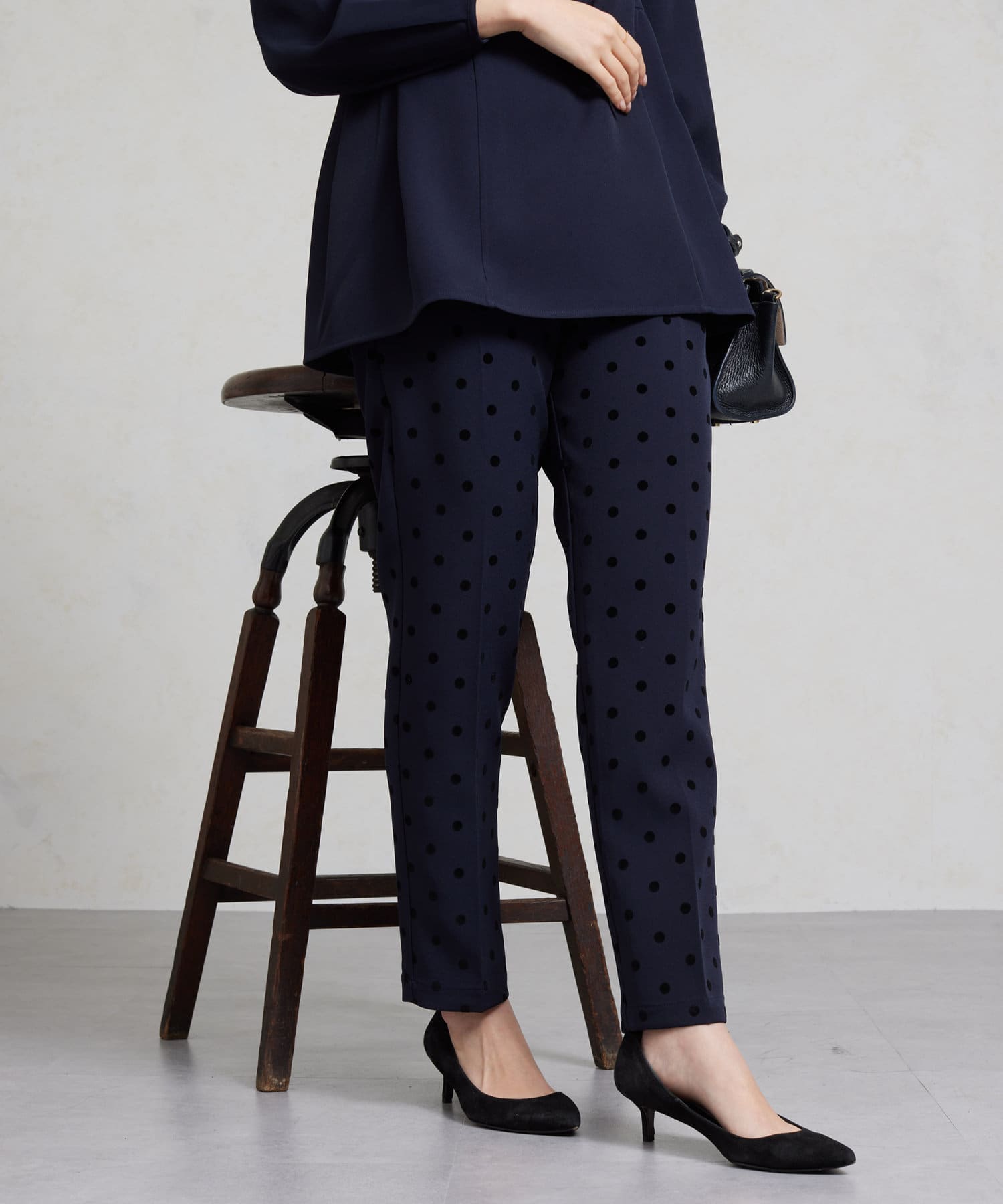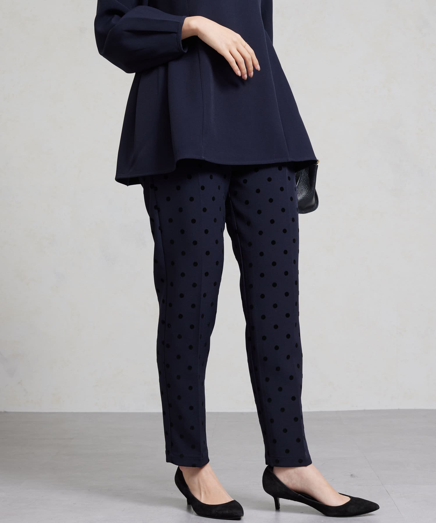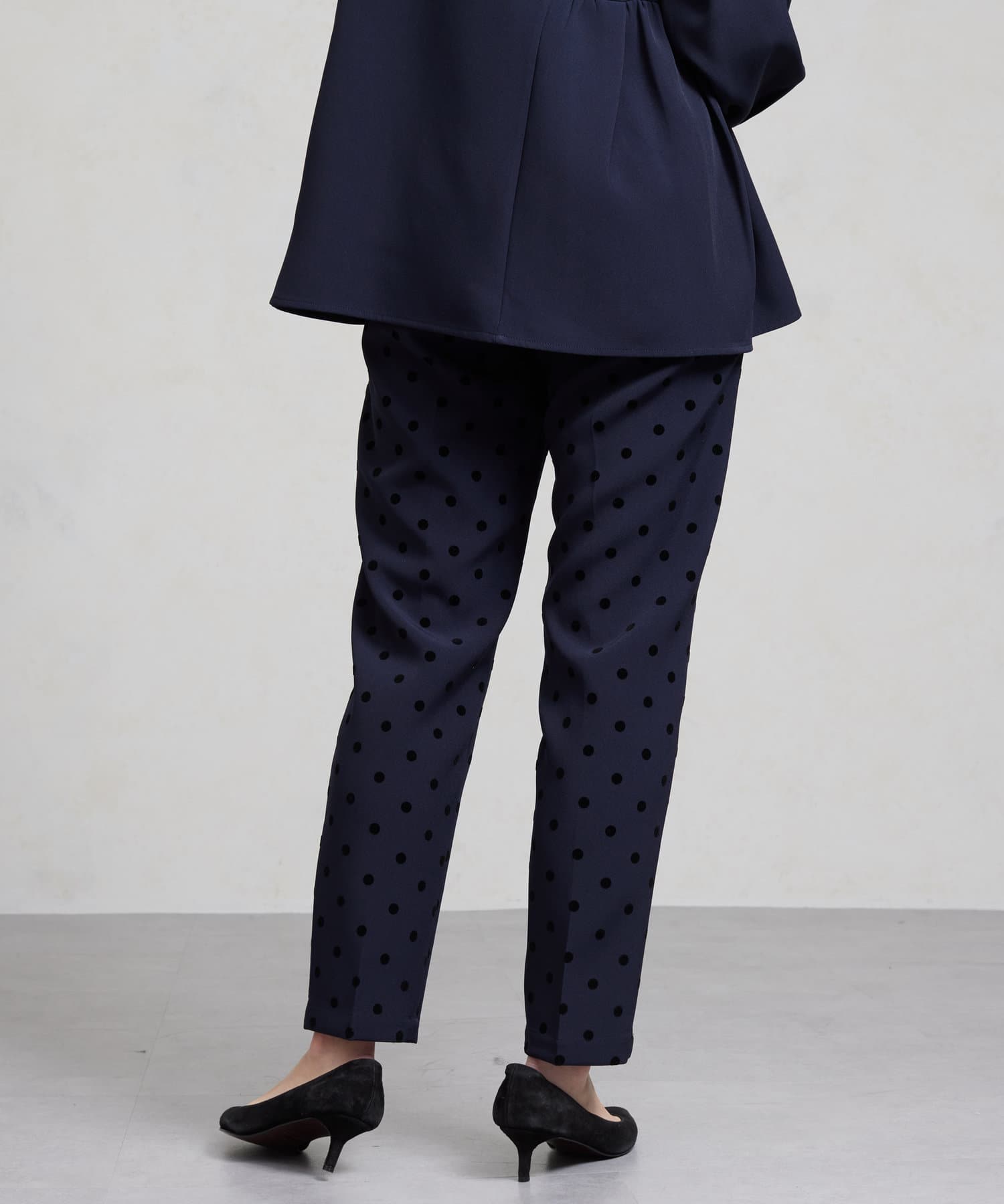 セレモニーにもおすすめ!無地とフロッキードットの上品テーパードパンツ