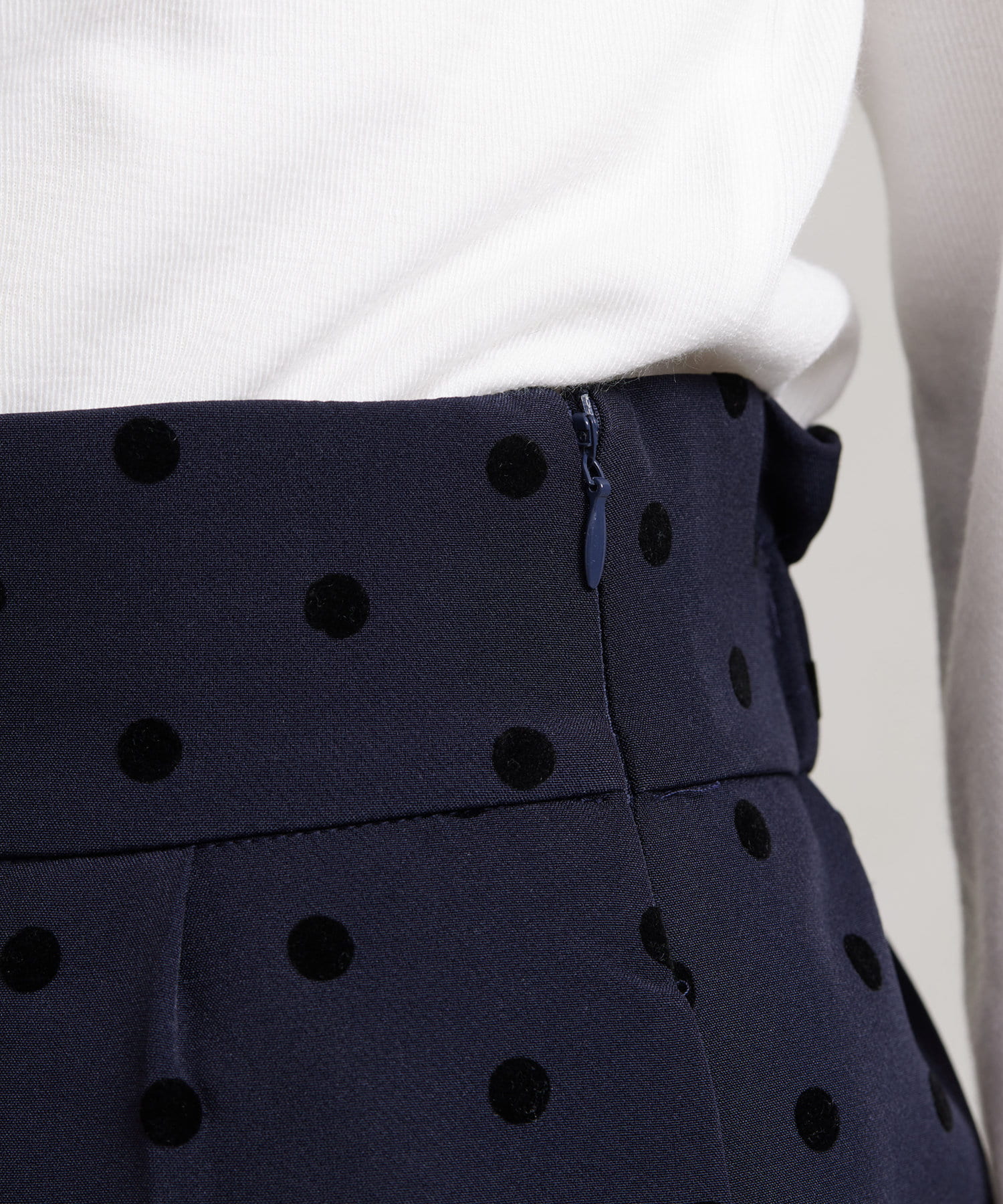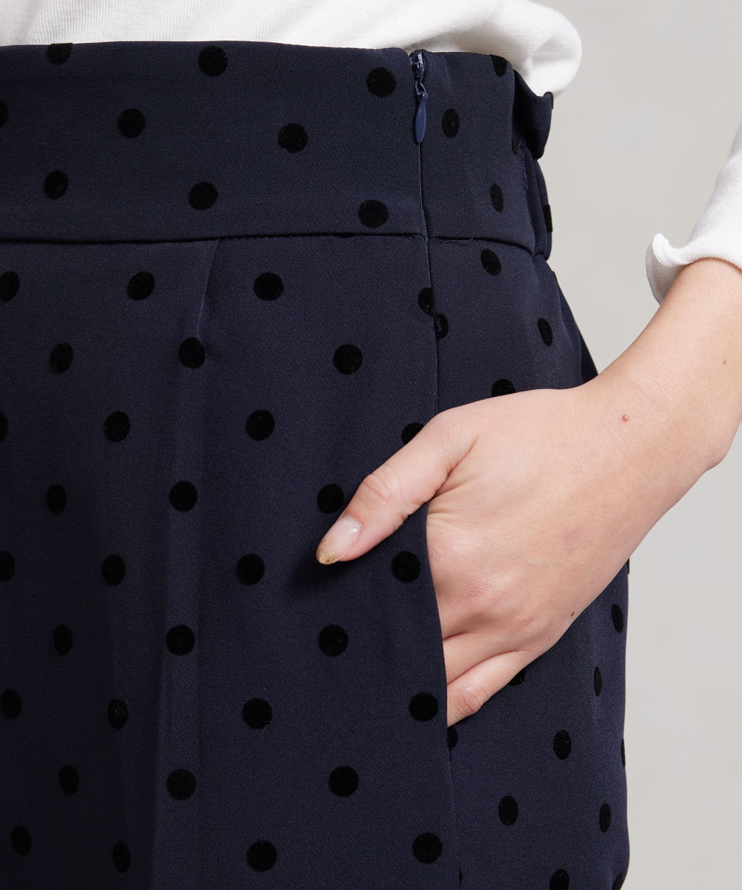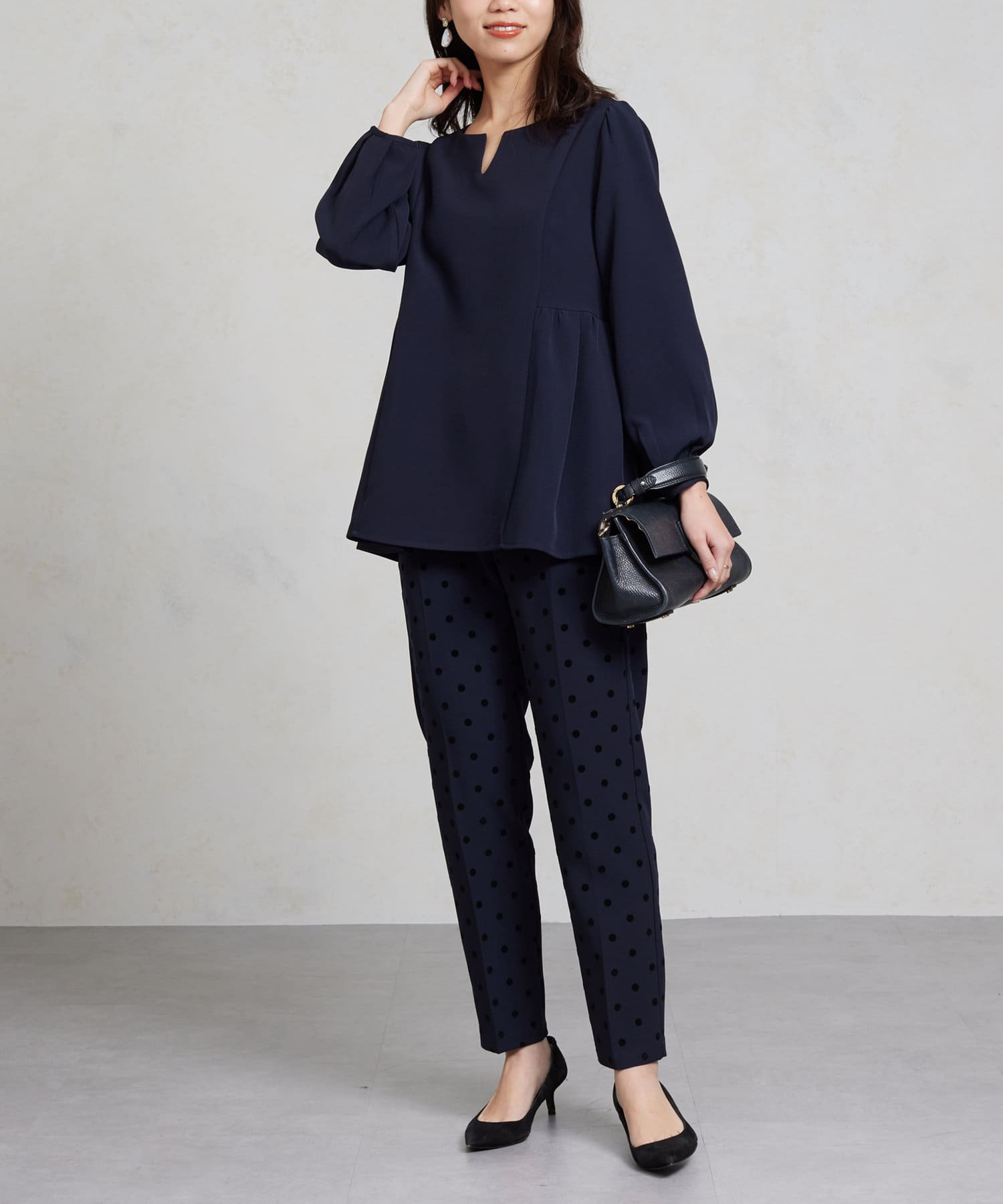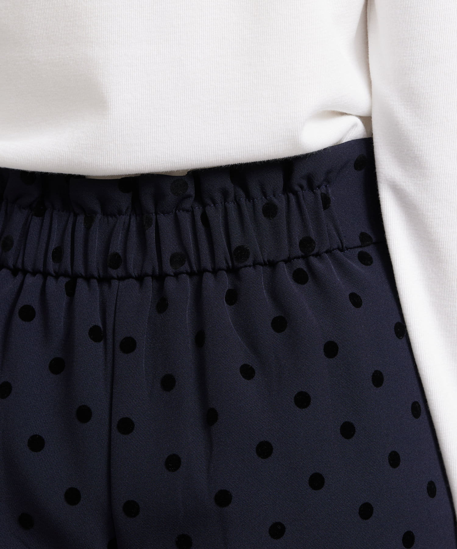 セレモニーにもおすすめ!無地とフロッキードットの上品テーパードパンツ