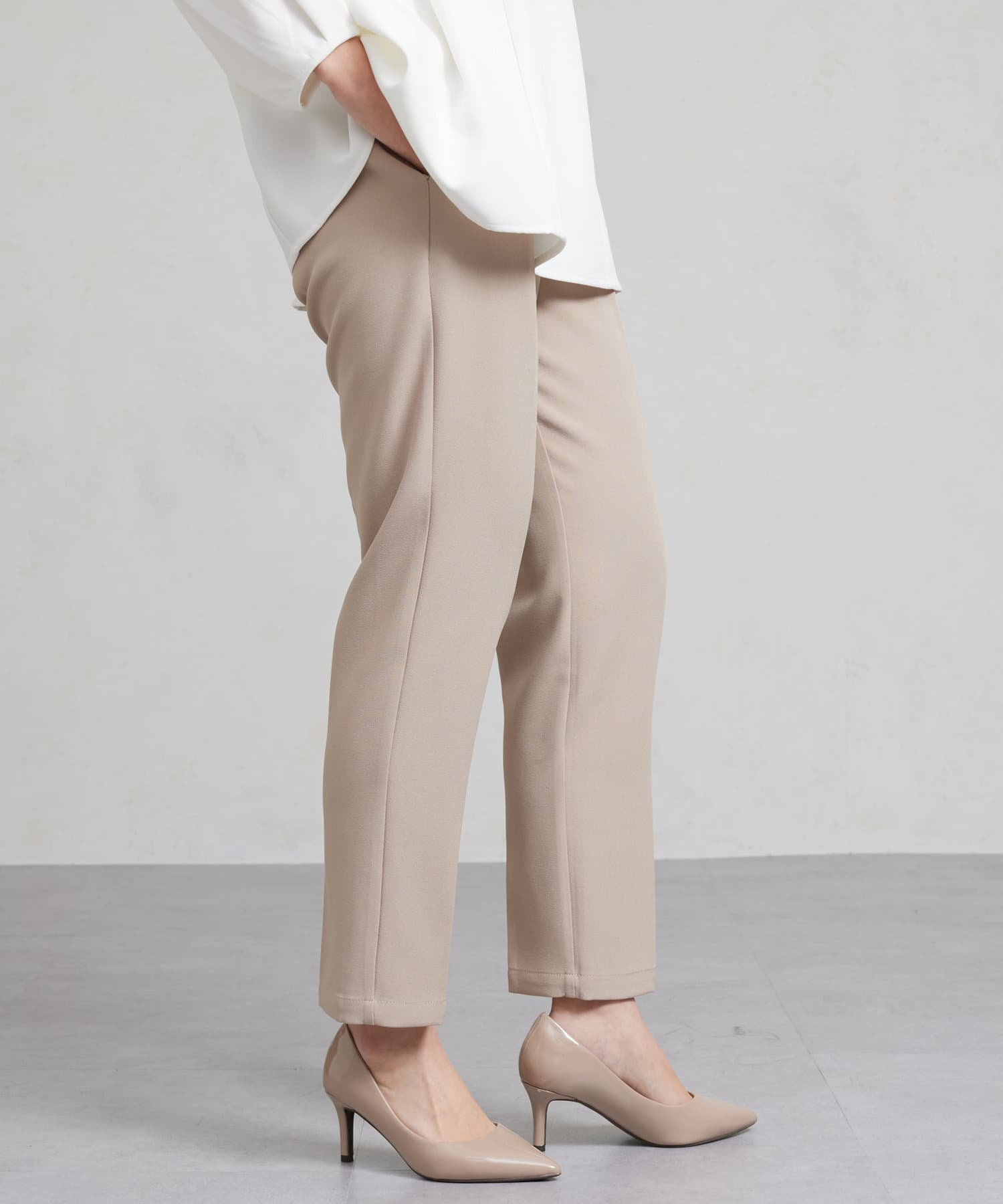 伸縮性のある生地感なので、細身ながら履き心地も◎