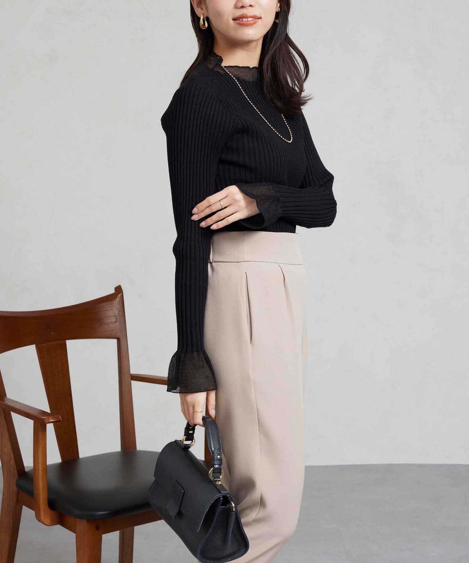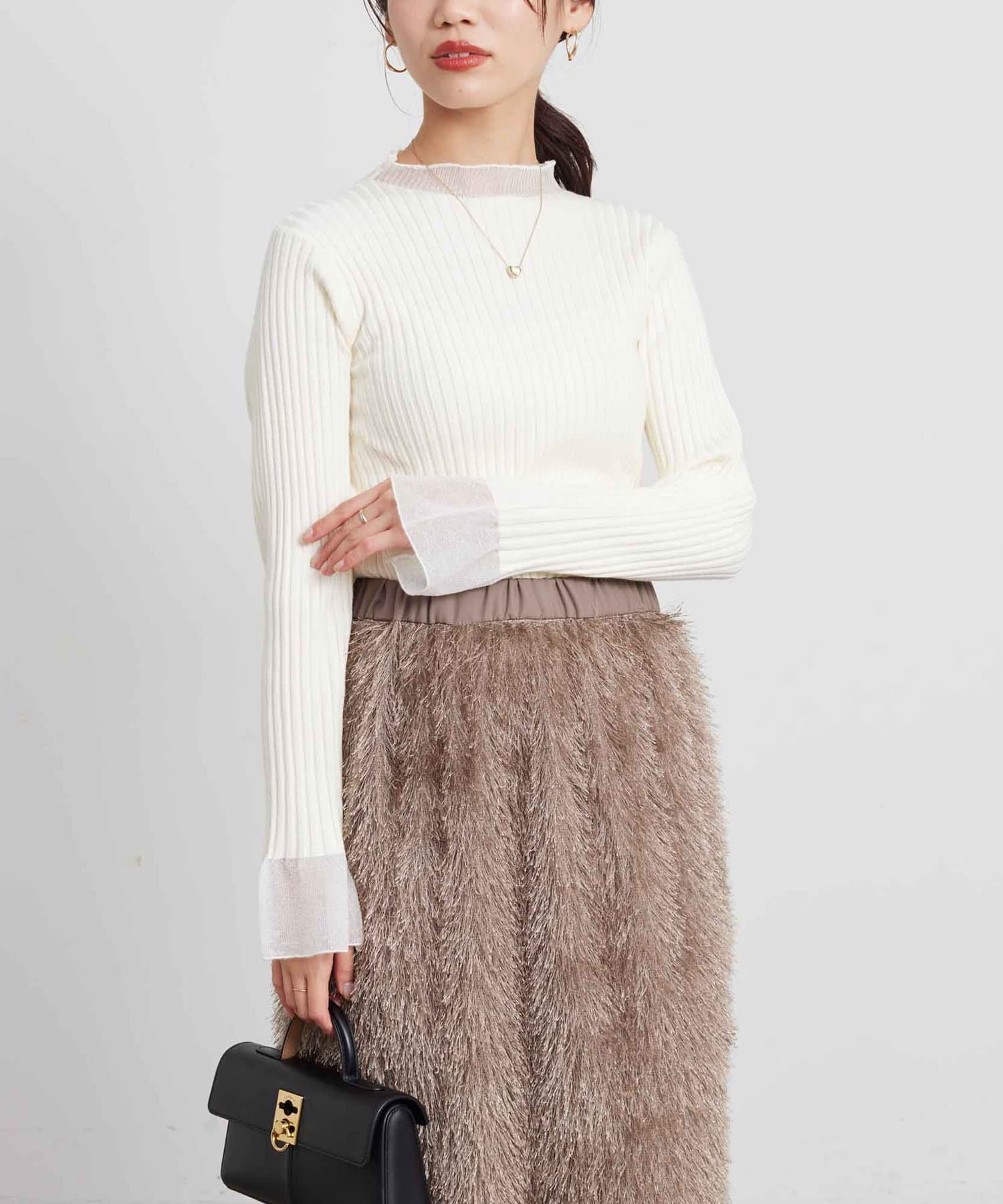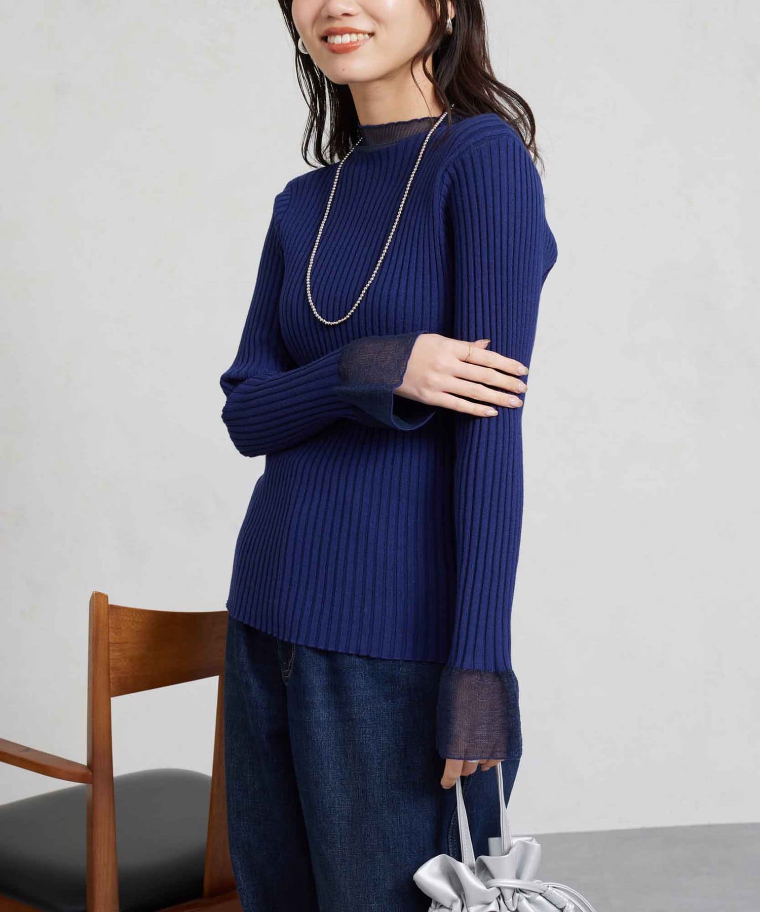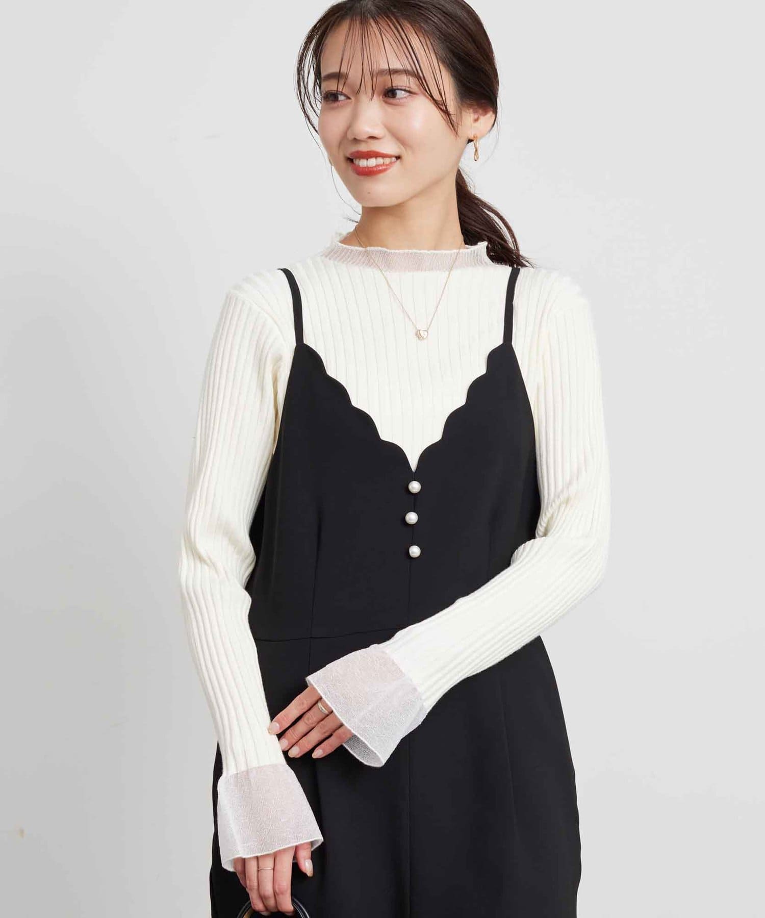 オフホワイトのリブニットなので、キャミワンピのインナーにも、カーディガン との重ね着にも、一枚でも、と万能ですが、袖口と襟元のシアー生地が可愛く、ワンポイントになっておしゃれです。