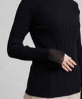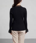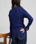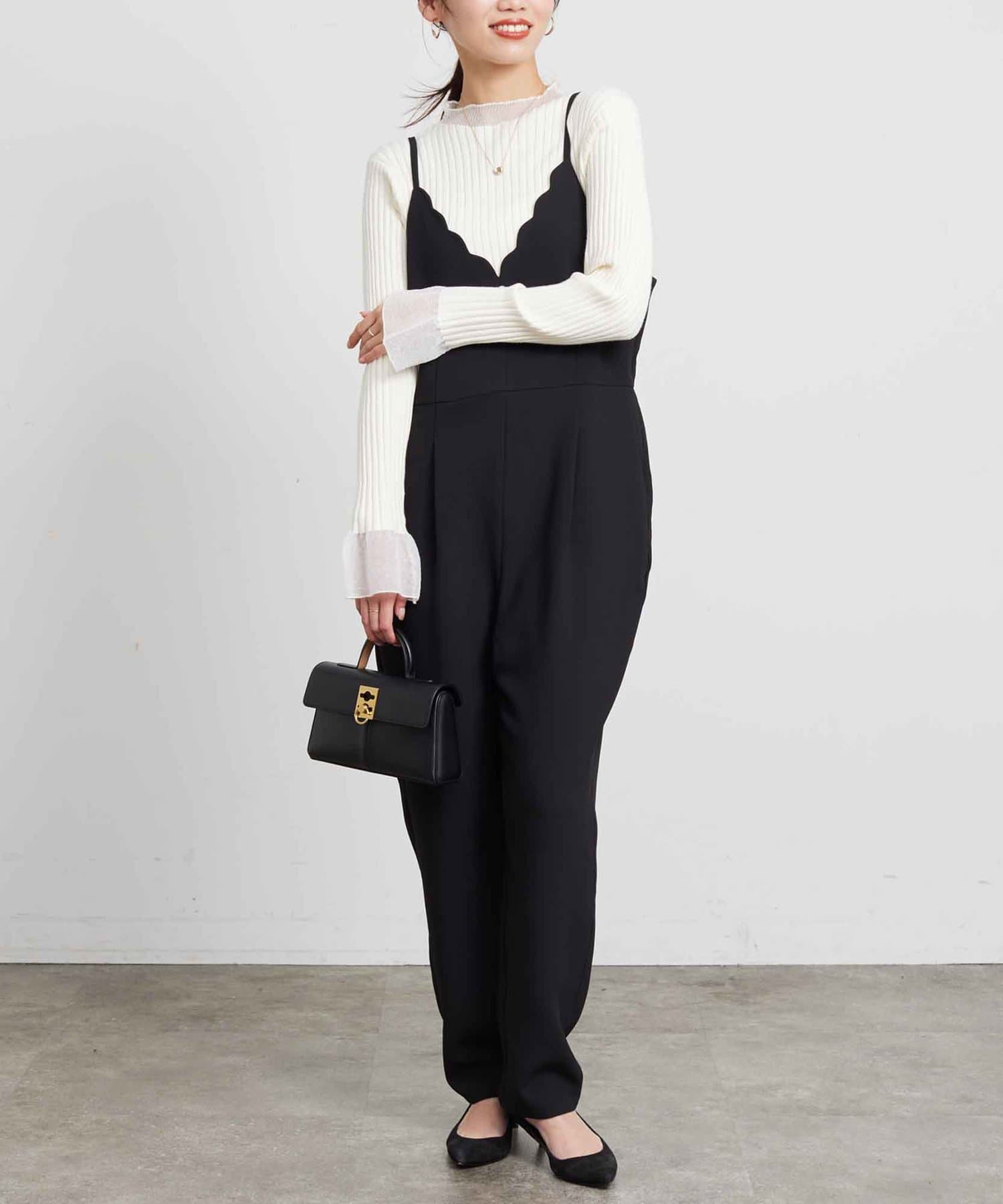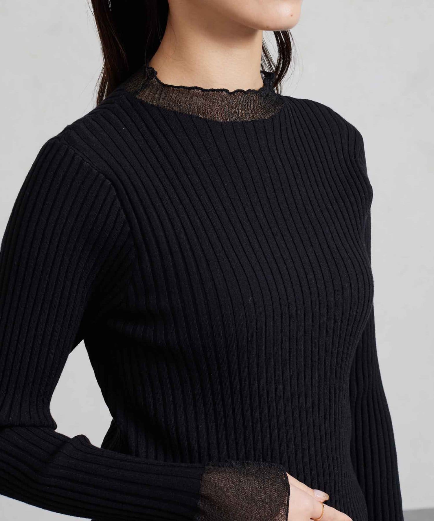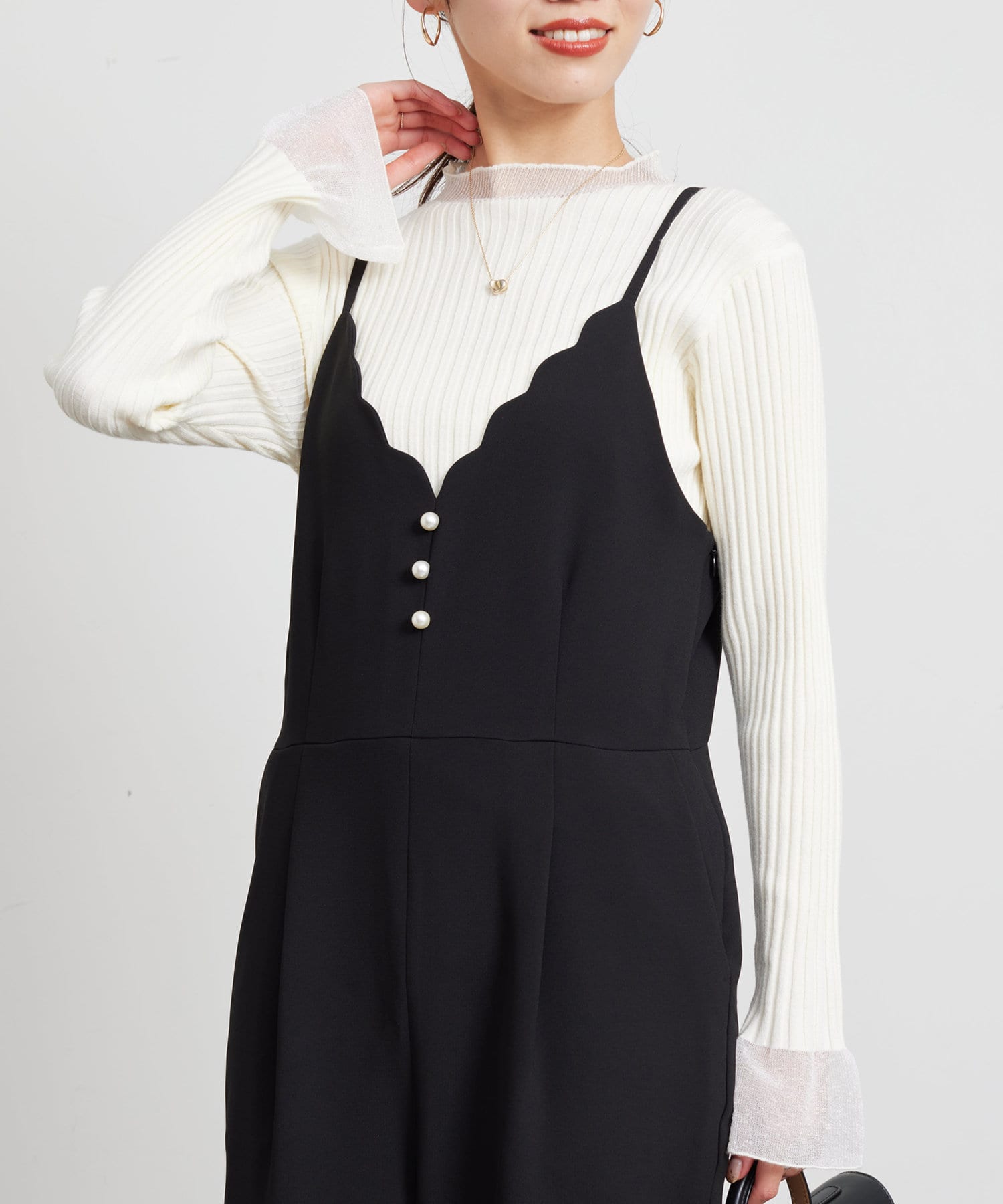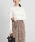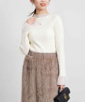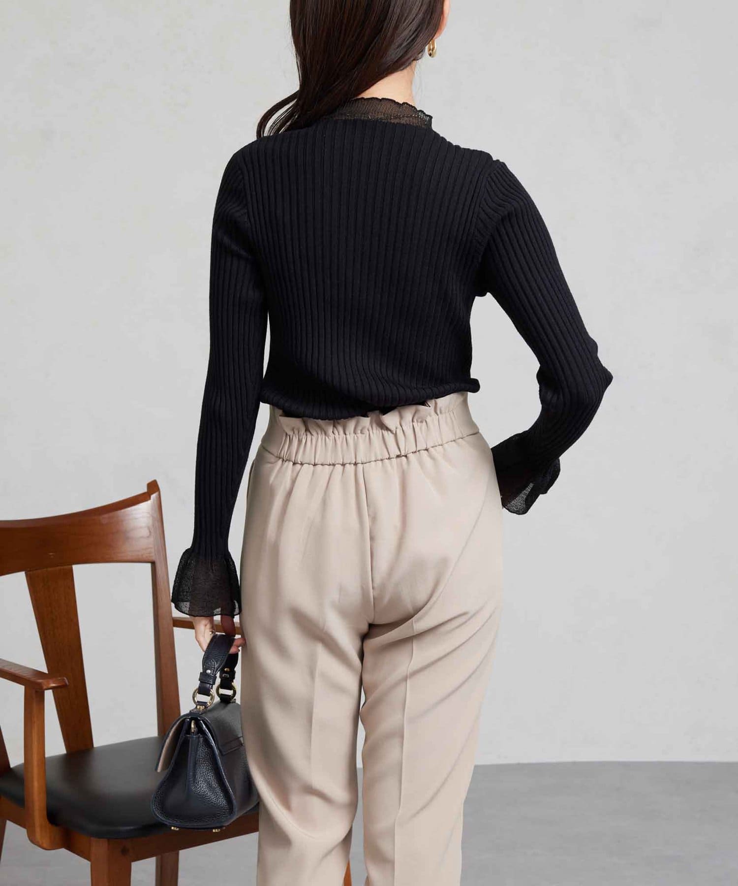 オフホワイトのリブニットなので、キャミワンピのインナーにも、カーディガン との重ね着にも、一枚でも、と万能ですが、袖口と襟元のシアー生地が可愛く、ワンポイントになっておしゃれです。